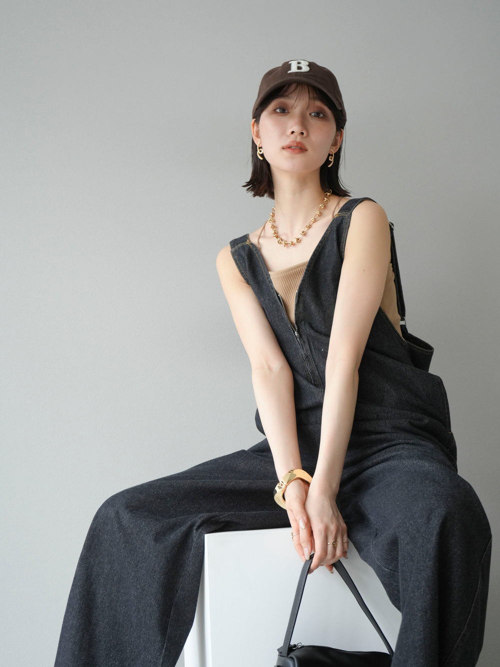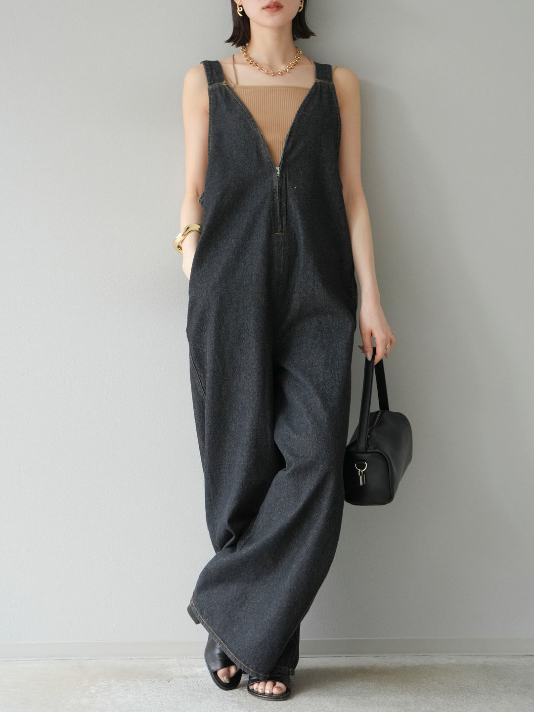 [予約]フロントZIP Vネックデニムサロペット/ブラック