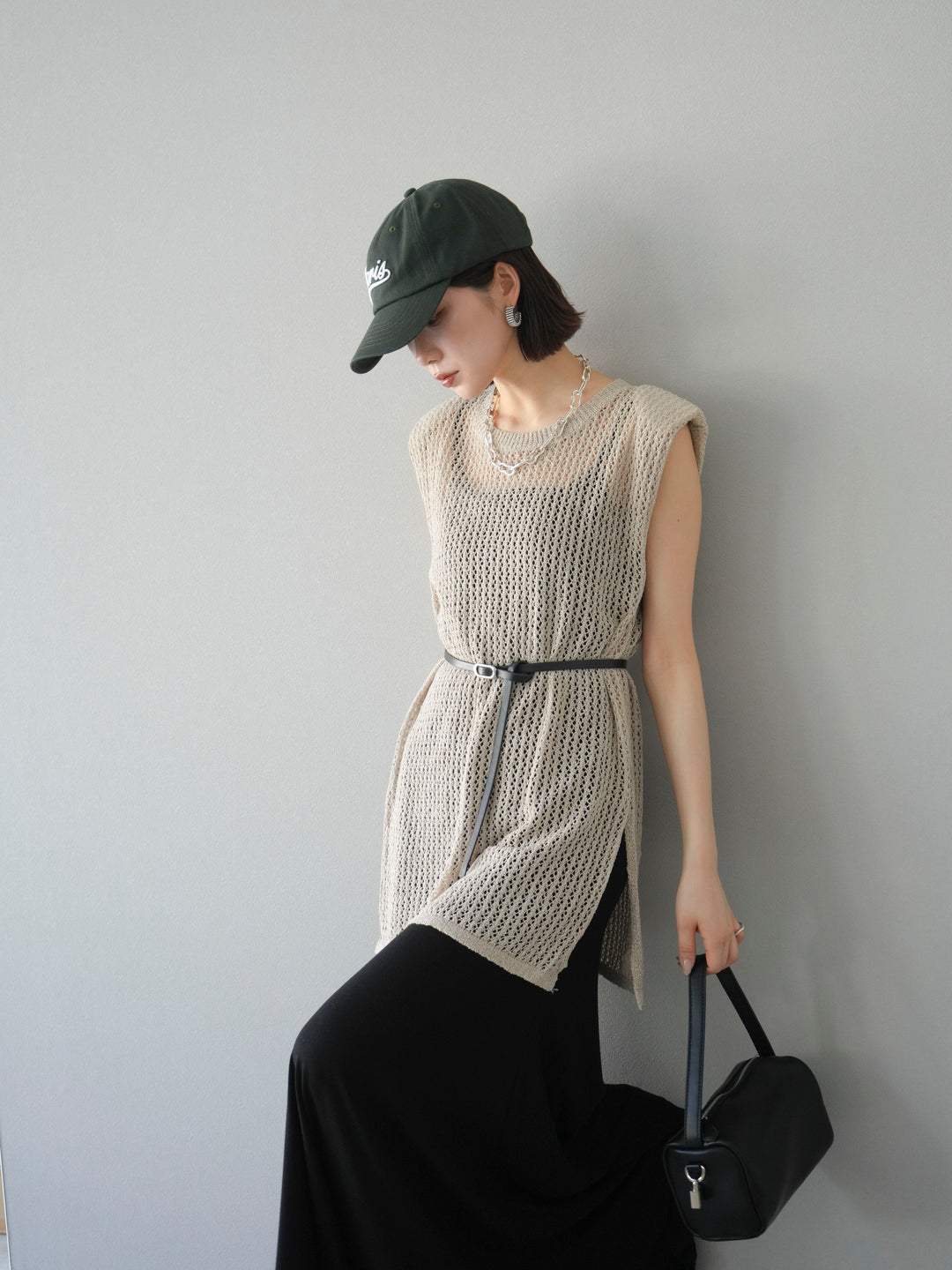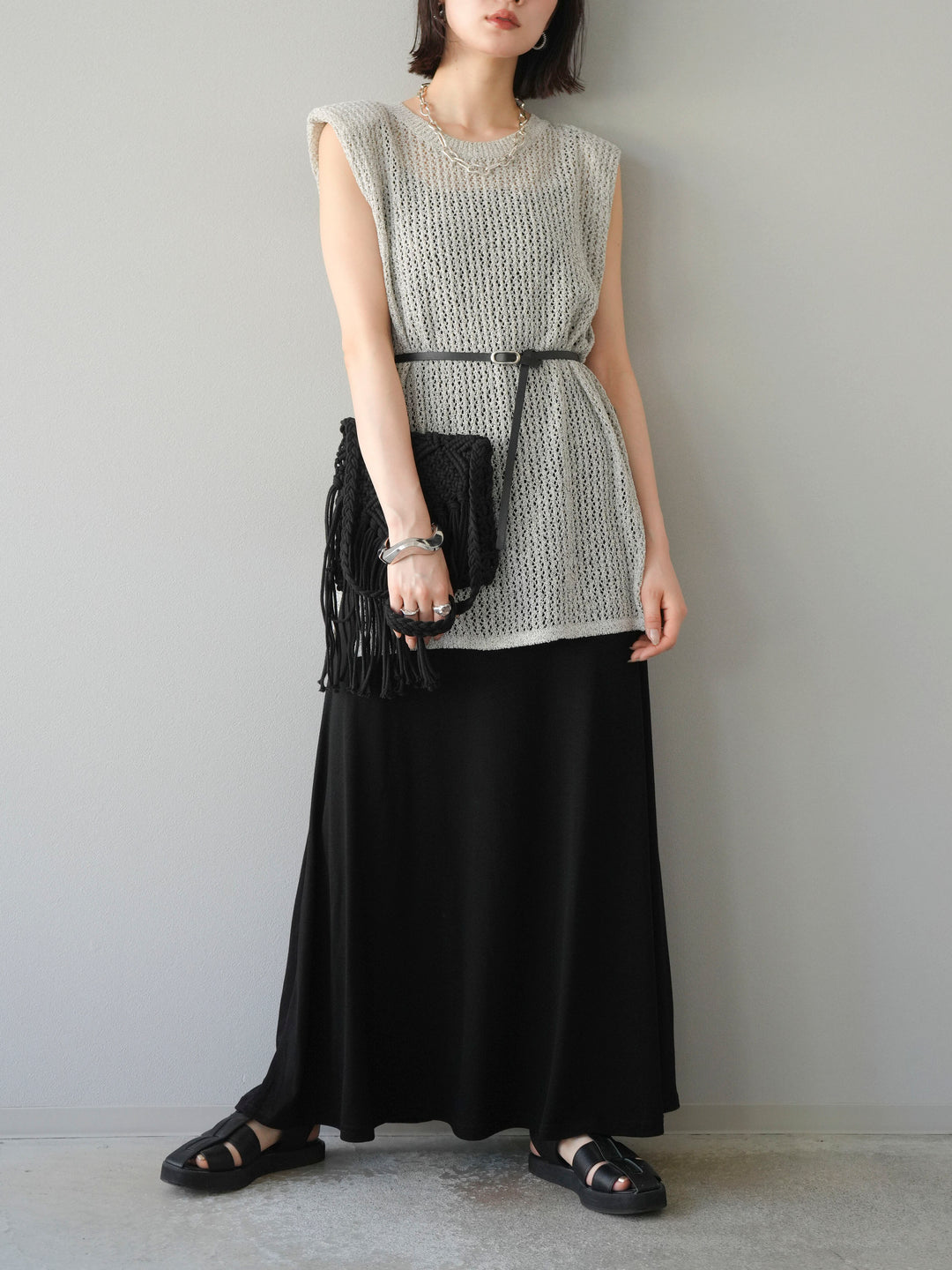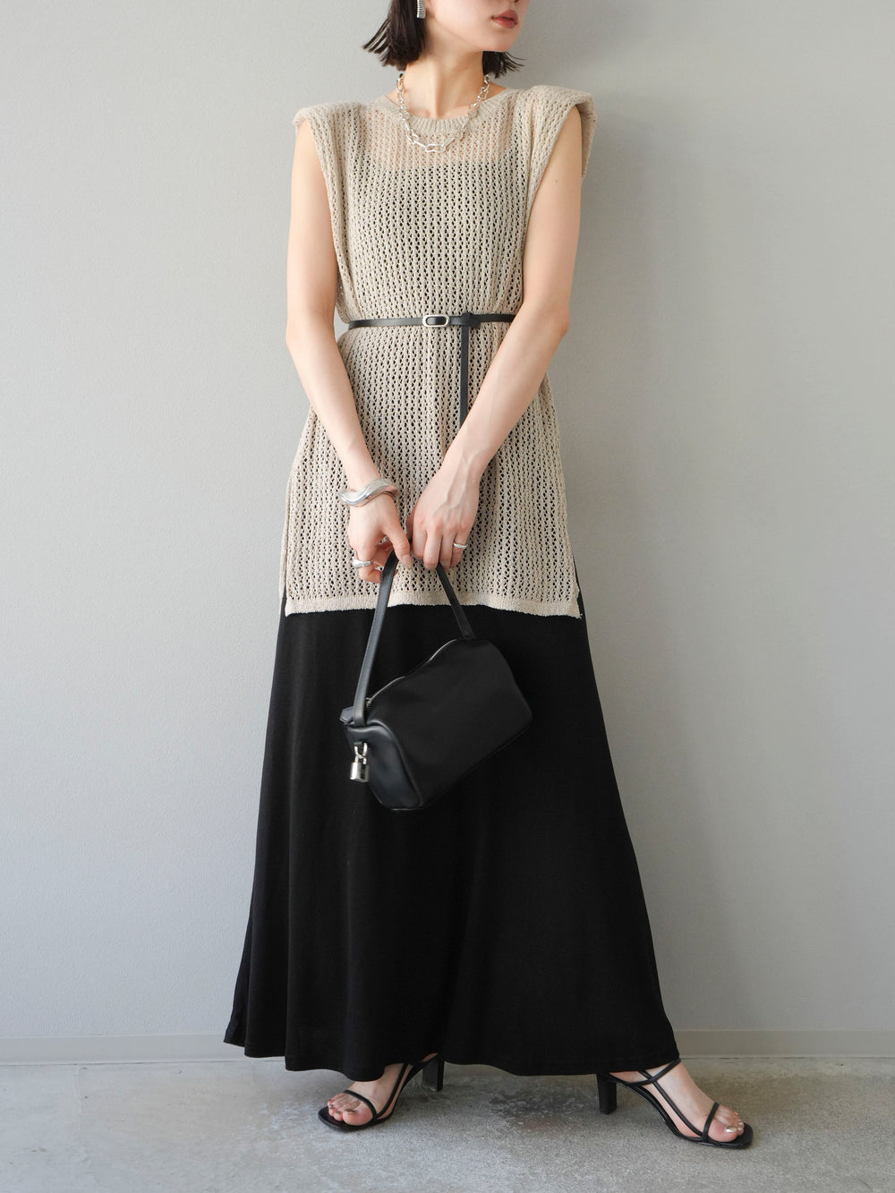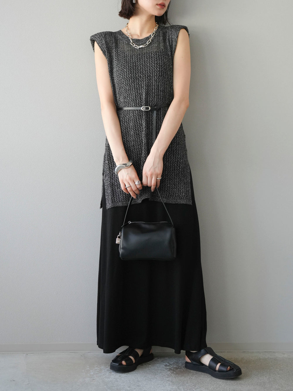 [予約]ベルト付メッシュニットアンサンブルワンピース/ブラック