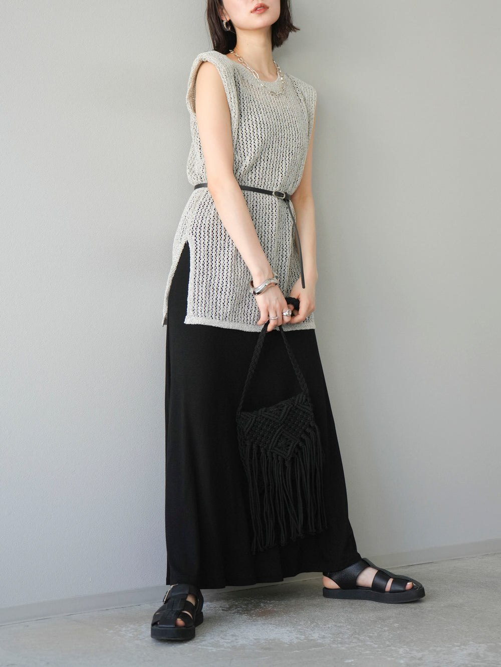 [予約]ベルト付メッシュニットアンサンブルワンピース/グレー