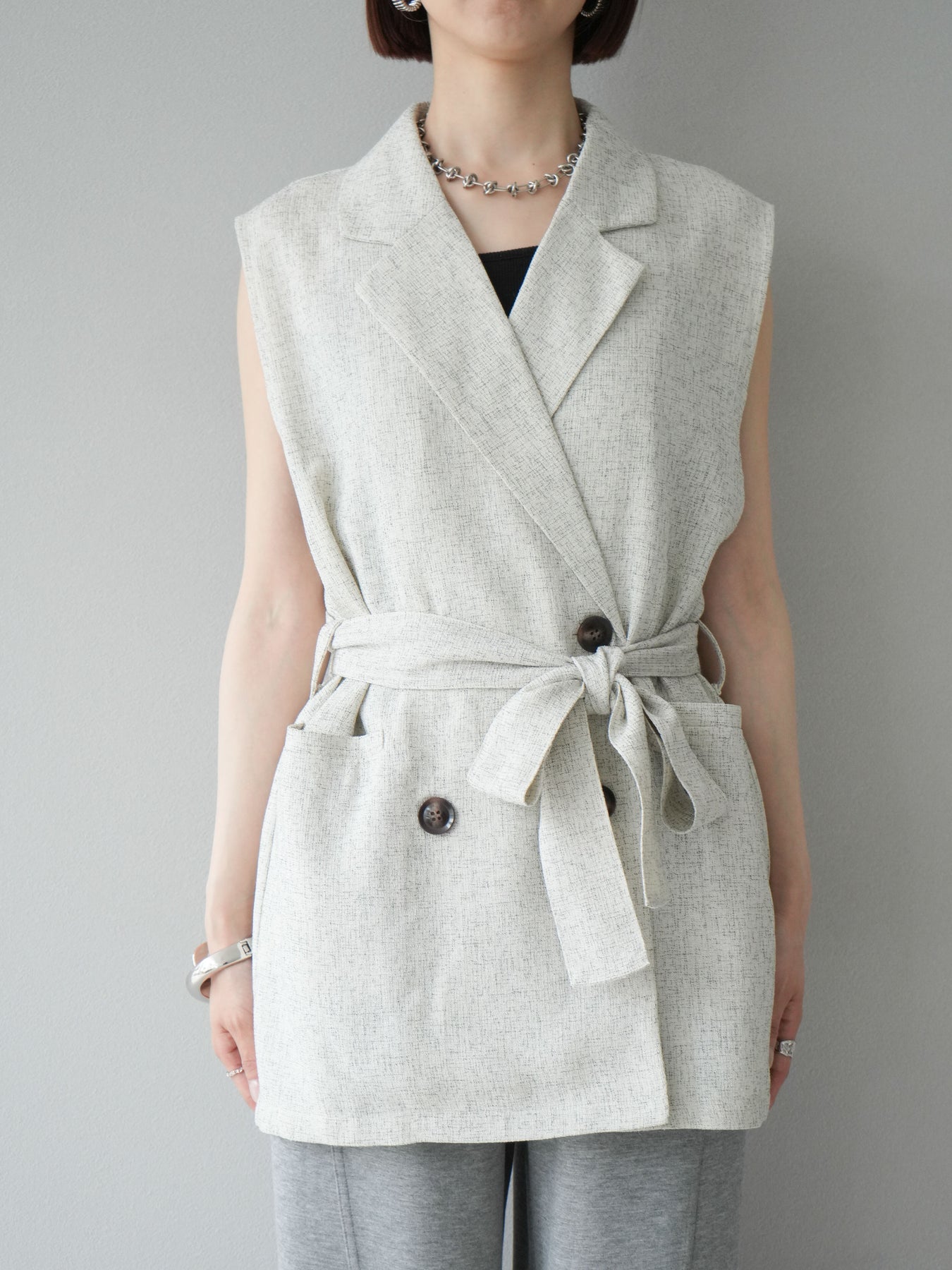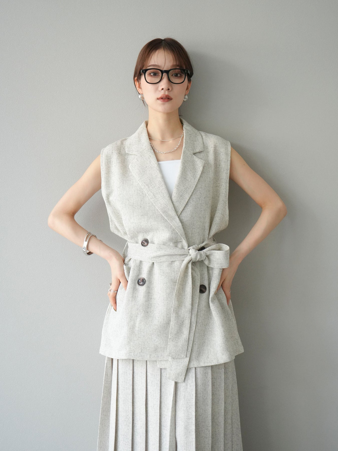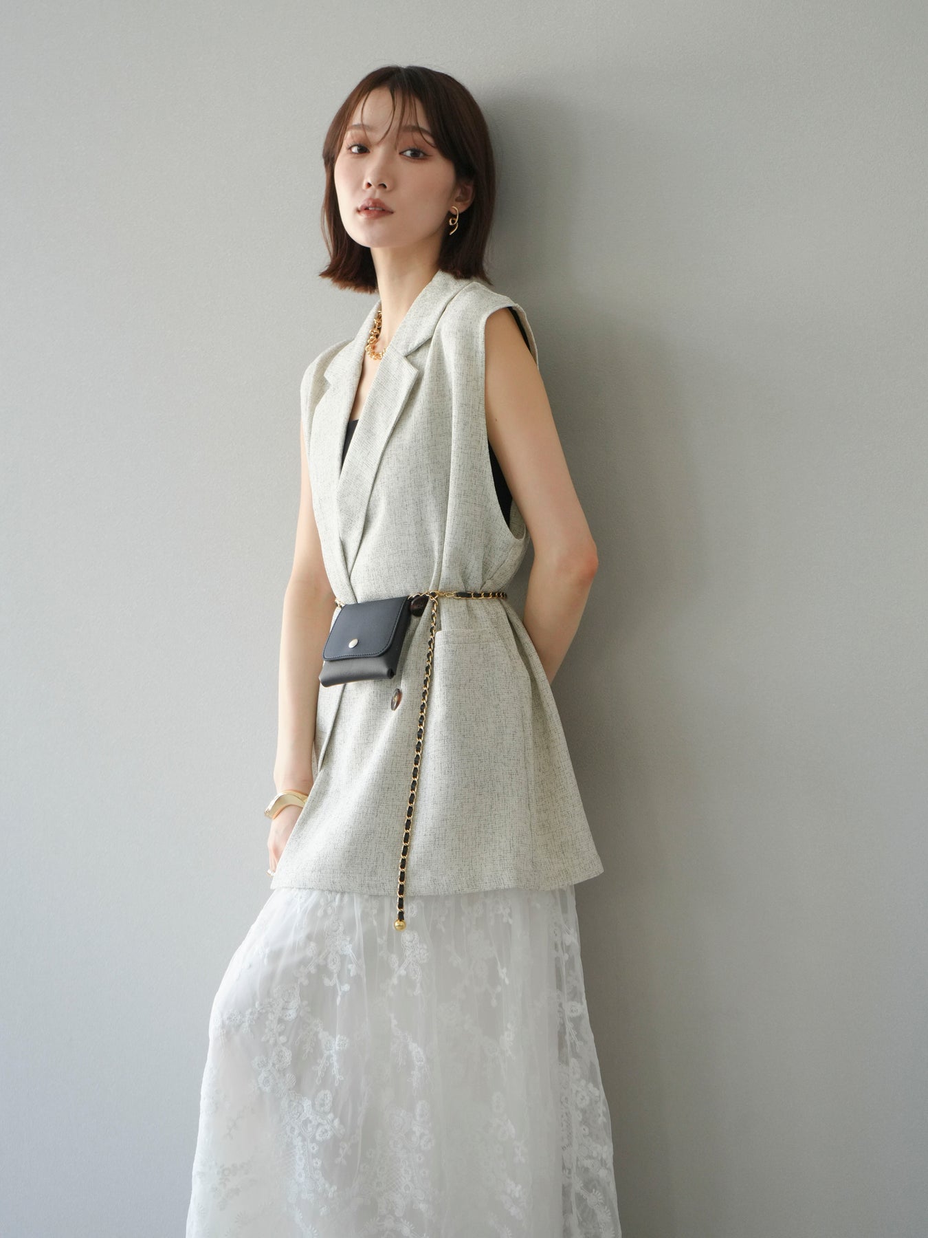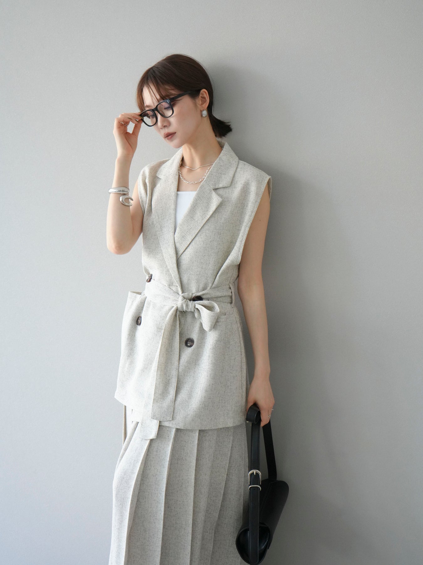 上品で洗練された印象を演出する、ミックスツイード素材のジレ。クラシカルなダブルボタンデザインとウエストリボンが、メリハリのあるシルエットを叶えます。さらりと羽織るだけでコーデを格上げし、インナー次第でロングシーズン活躍。カジュアルからオフィスシーンまで幅広く着まわせる1着です。 ※ボトムス、キャミソール(インナー)以外の商品は一律でインナーは付属していません。