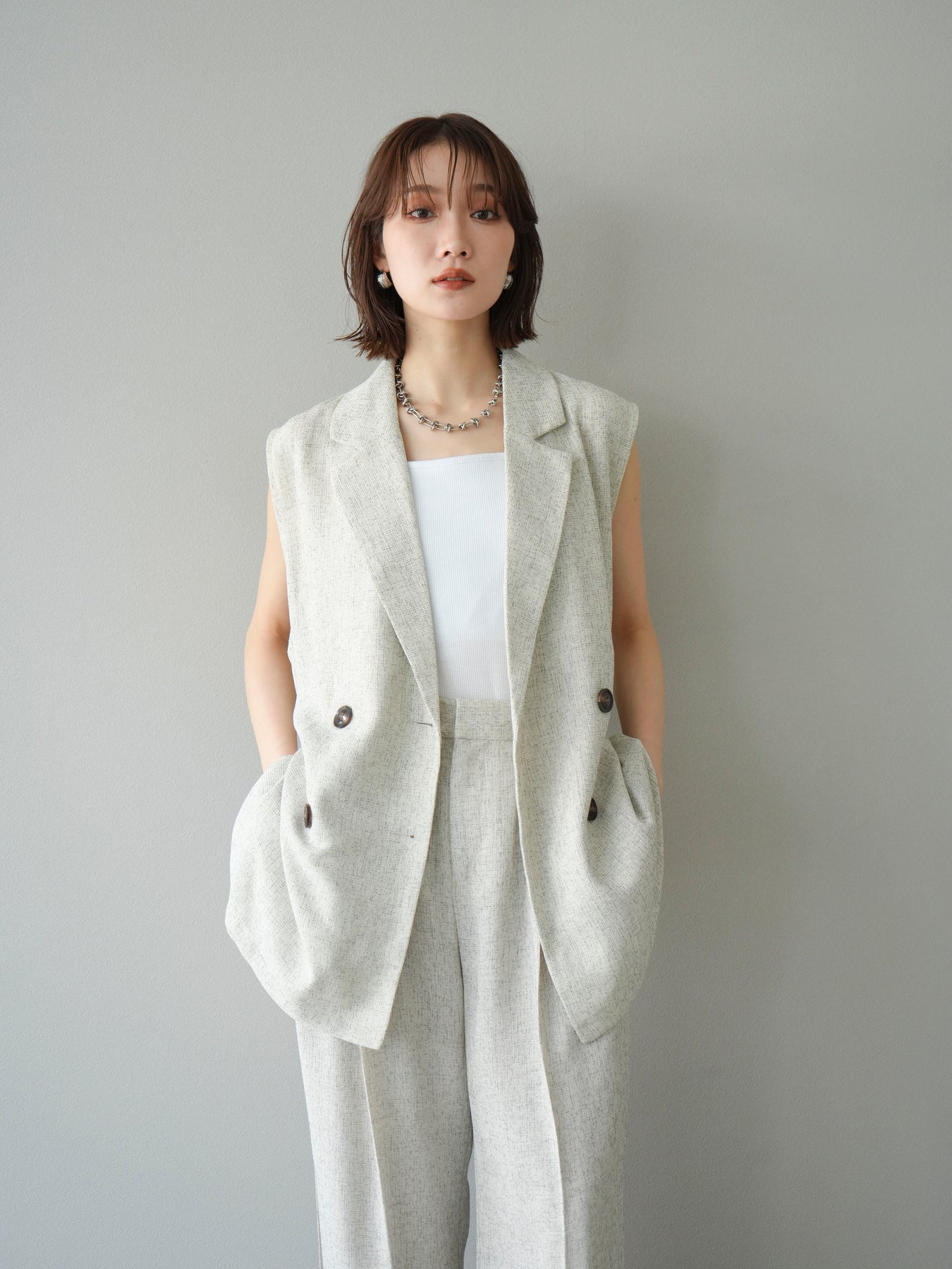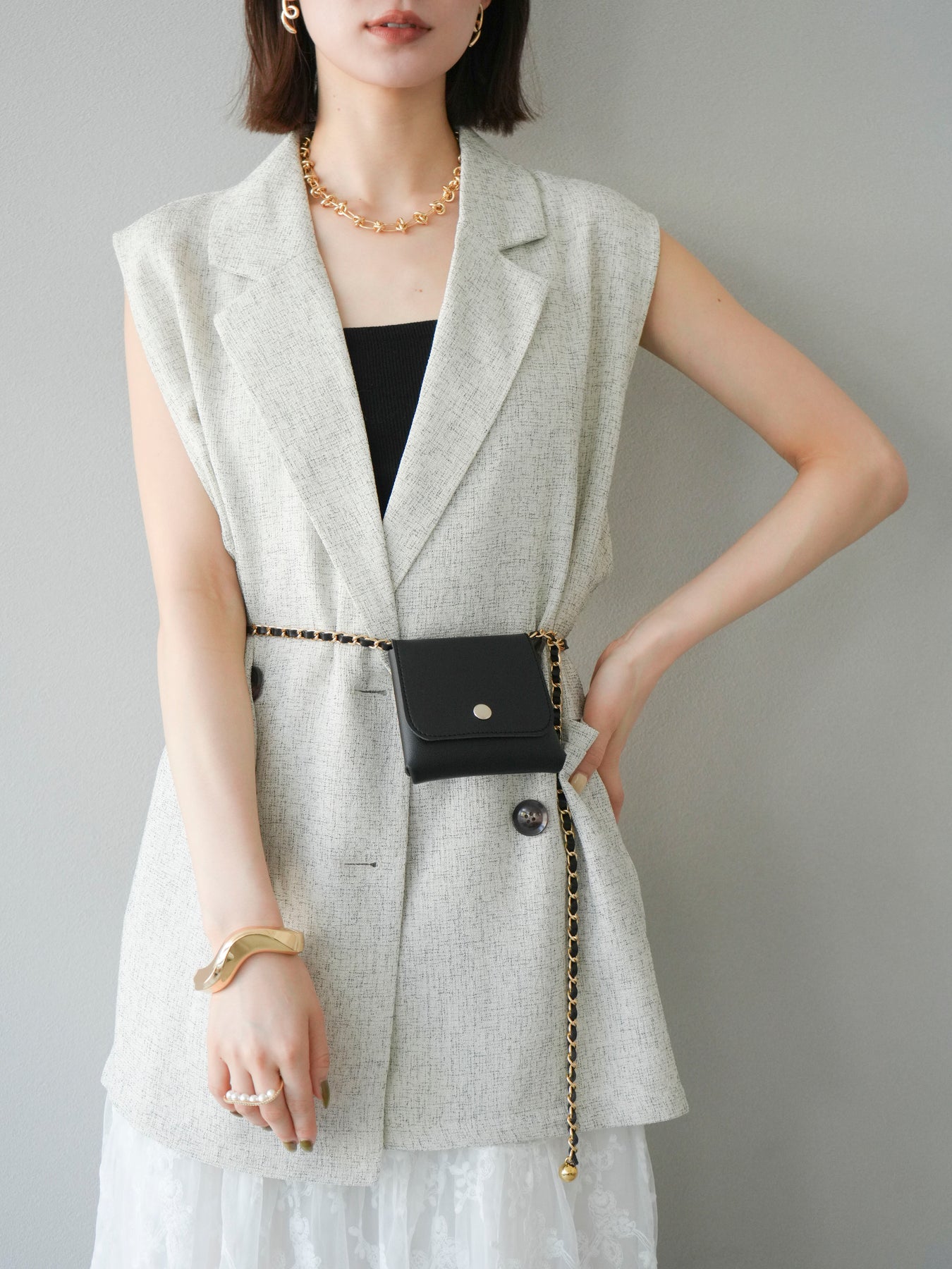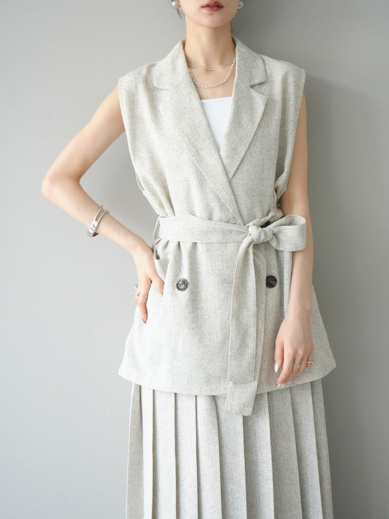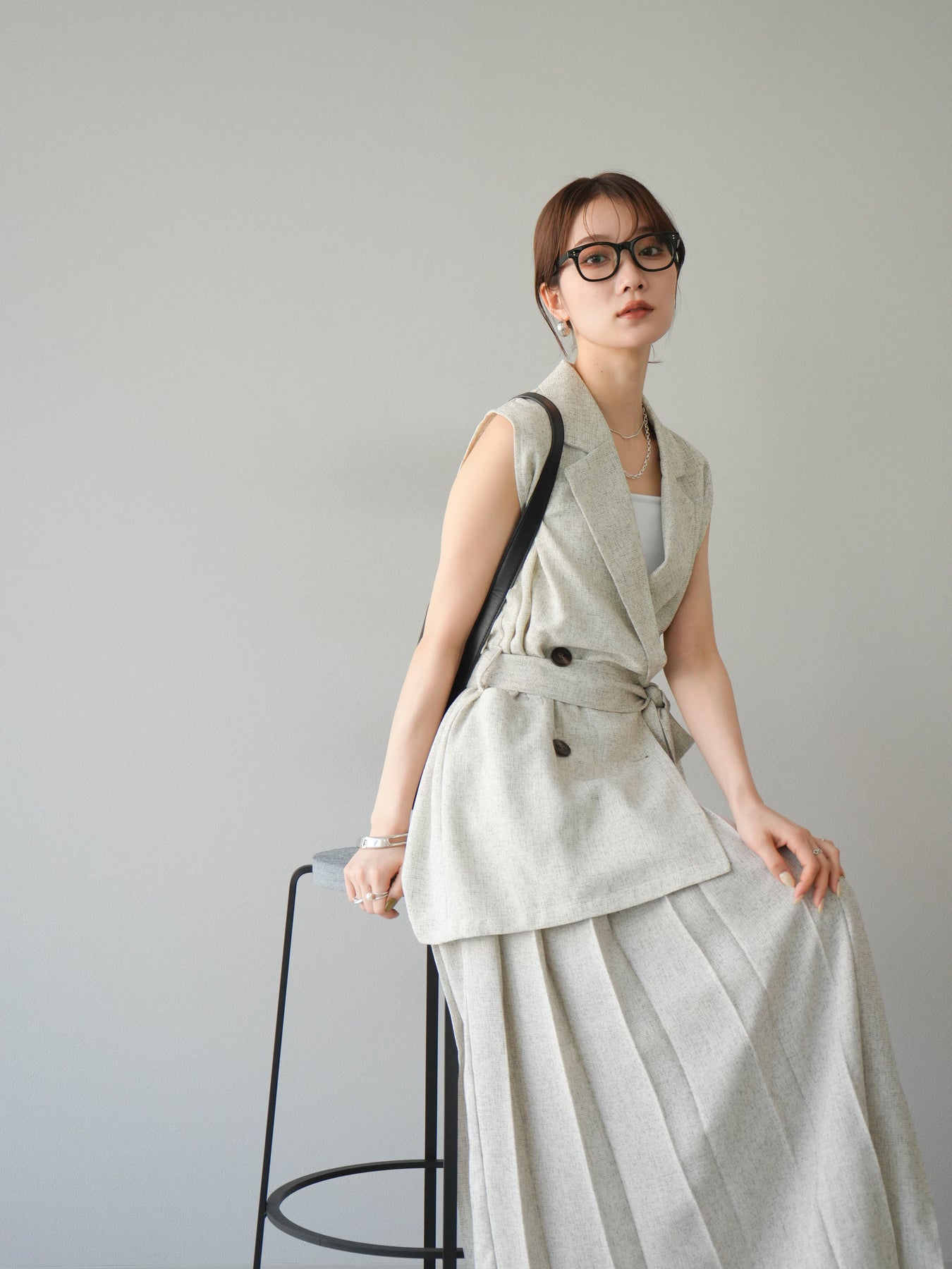 上品で洗練された印象を演出する、ミックスツイード素材のジレ。クラシカルなダブルボタンデザインとウエストリボンが、メリハリのあるシルエットを叶えます。さらりと羽織るだけでコーデを格上げし、インナー次第でロングシーズン活躍。カジュアルからオフィスシーンまで幅広く着まわせる1着です。 ※ボトムス、キャミソール(インナー)以外の商品は一律でインナーは付属していません。