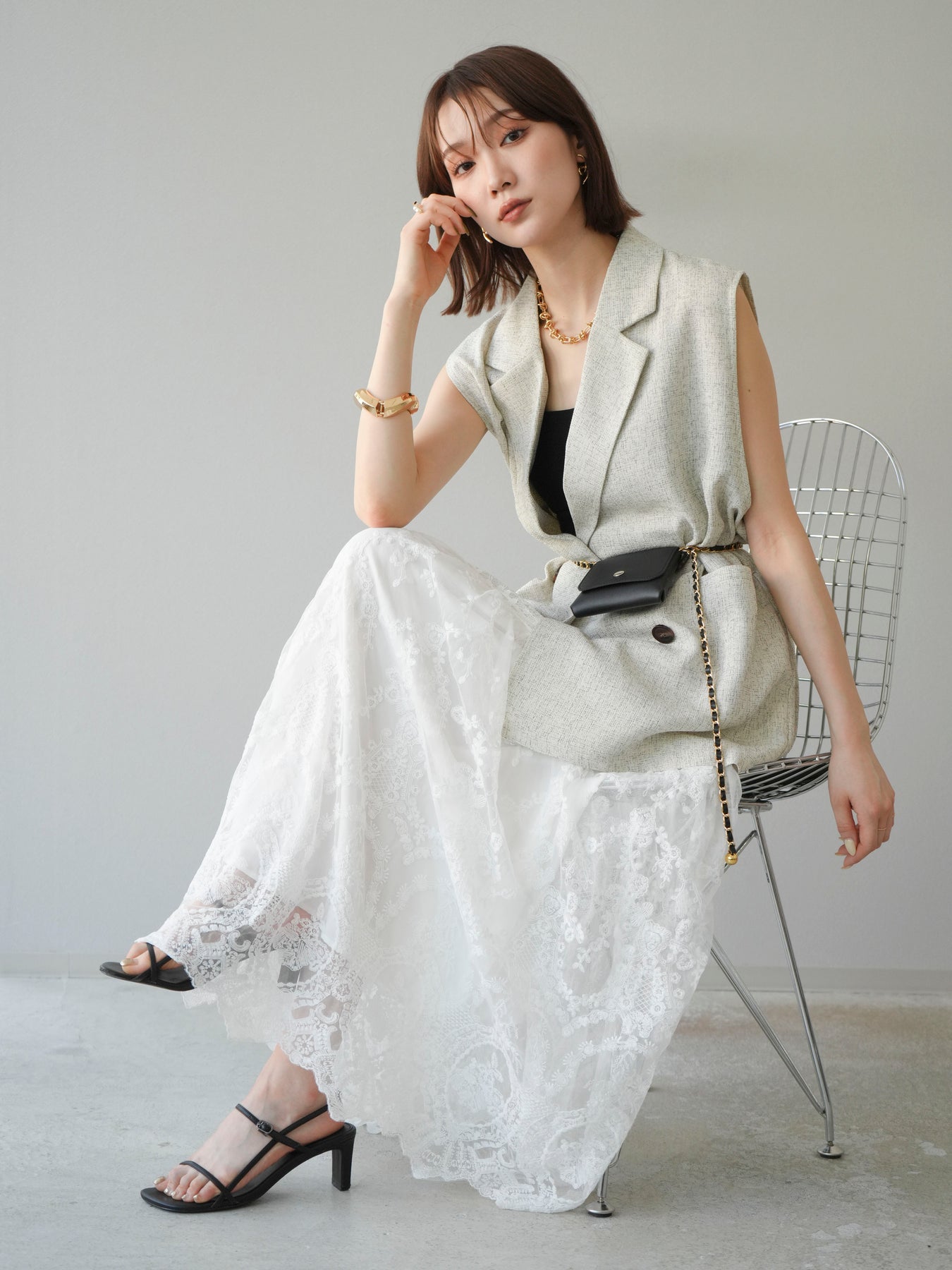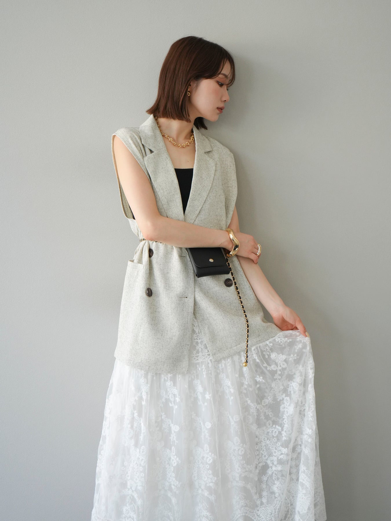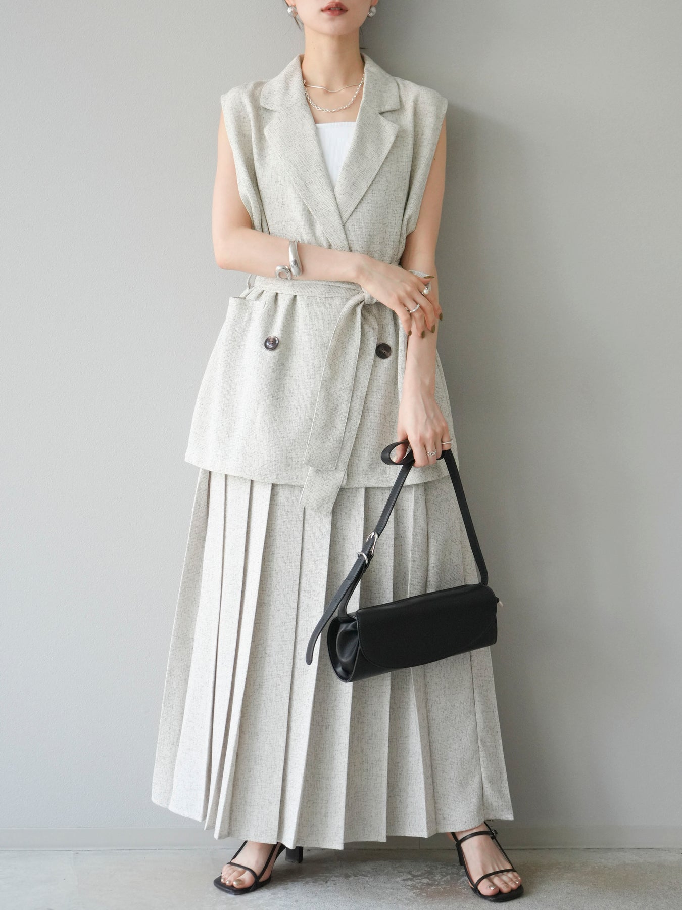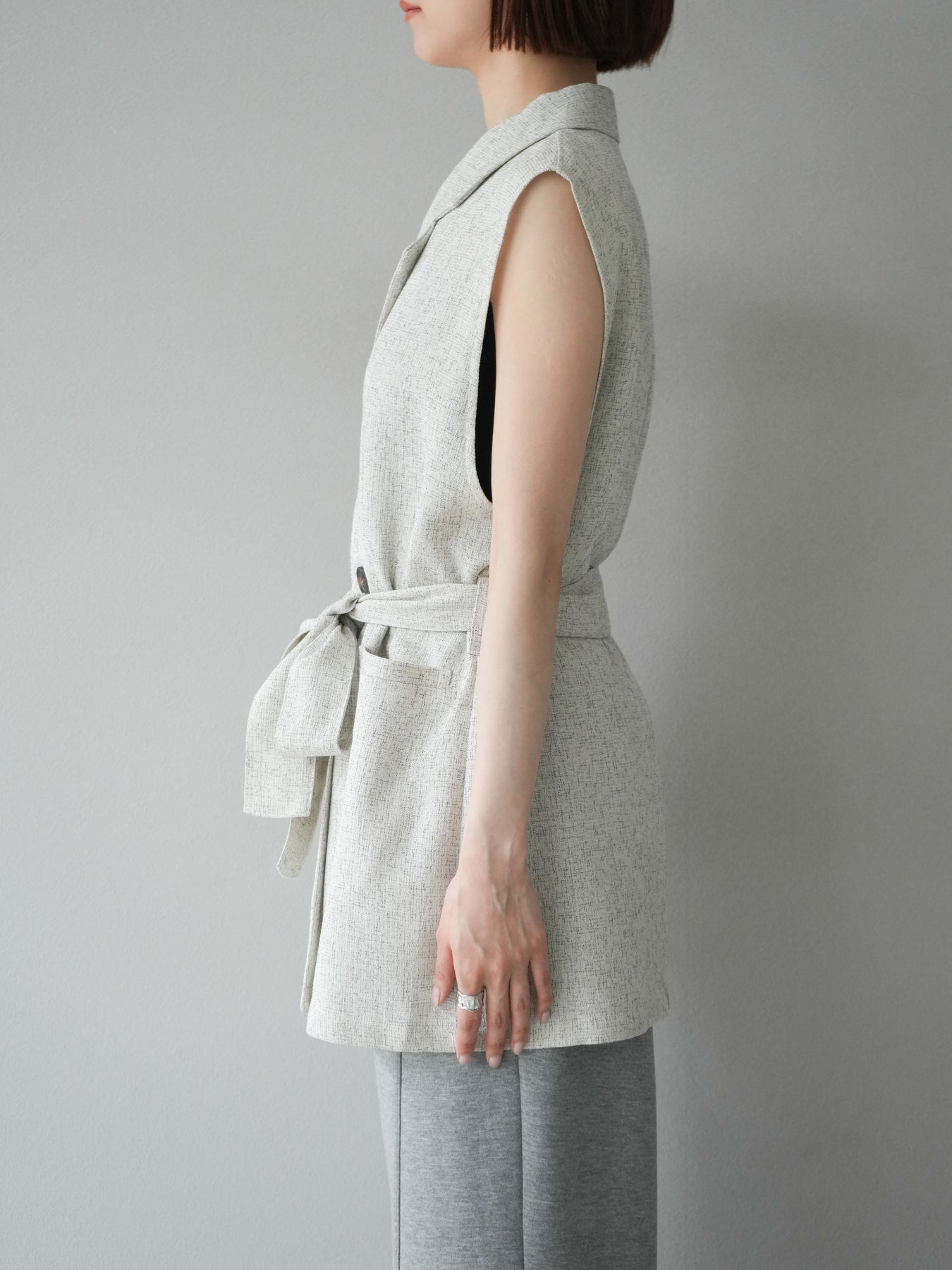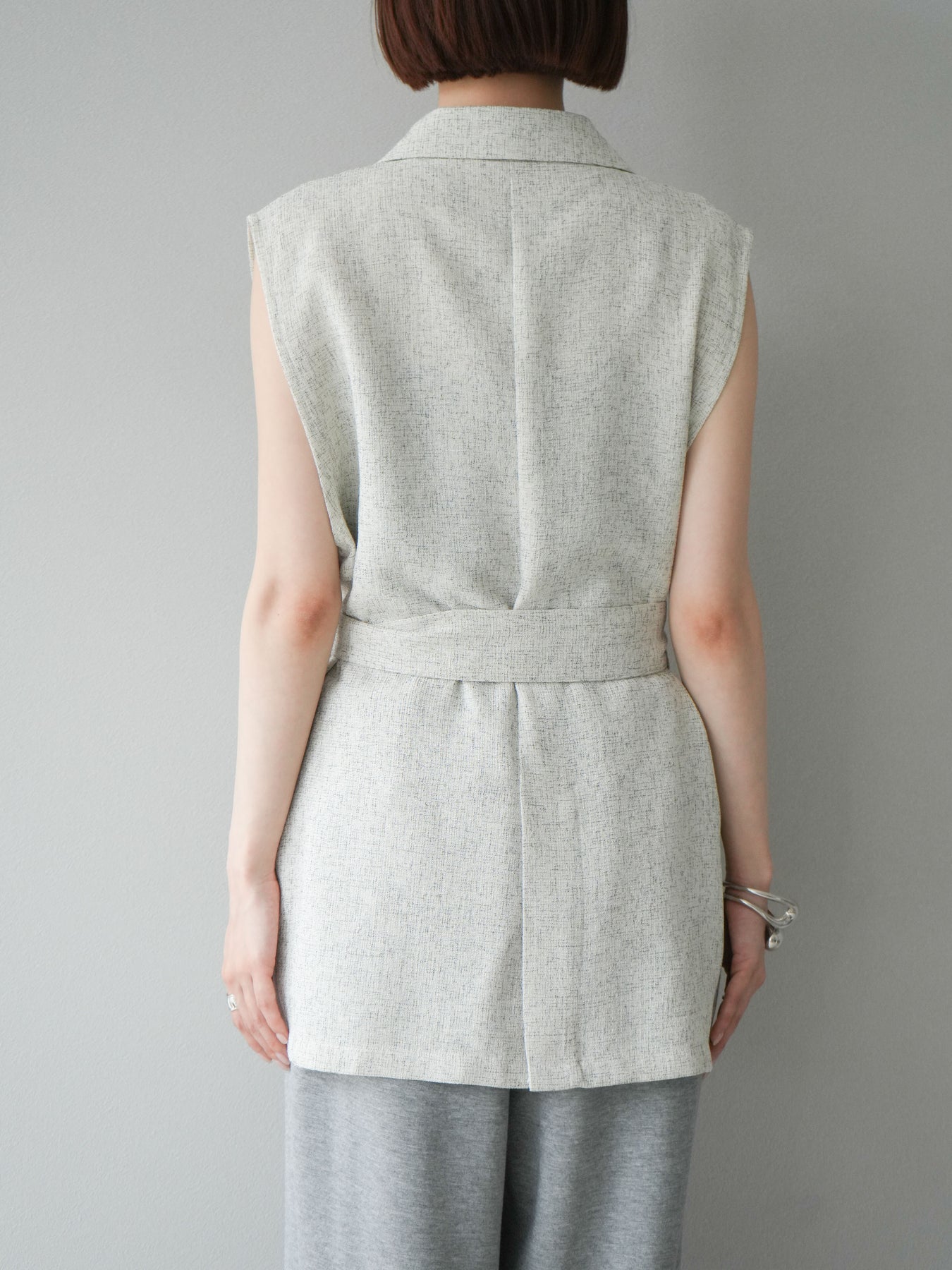 上品で洗練された印象を演出する、ミックスツイード素材のジレ。クラシカルなダブルボタンデザインとウエストリボンが、メリハリのあるシルエットを叶えます。さらりと羽織るだけでコーデを格上げし、インナー次第でロングシーズン活躍。カジュアルからオフィスシーンまで幅広く着まわせる1着です。 ※ボトムス、キャミソール(インナー)以外の商品は一律でインナーは付属していません。