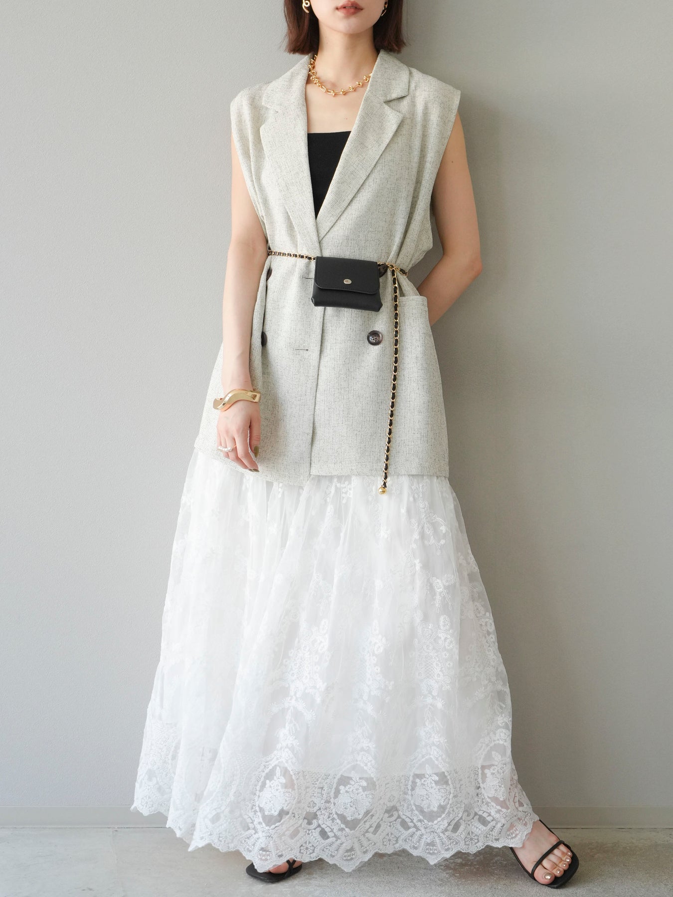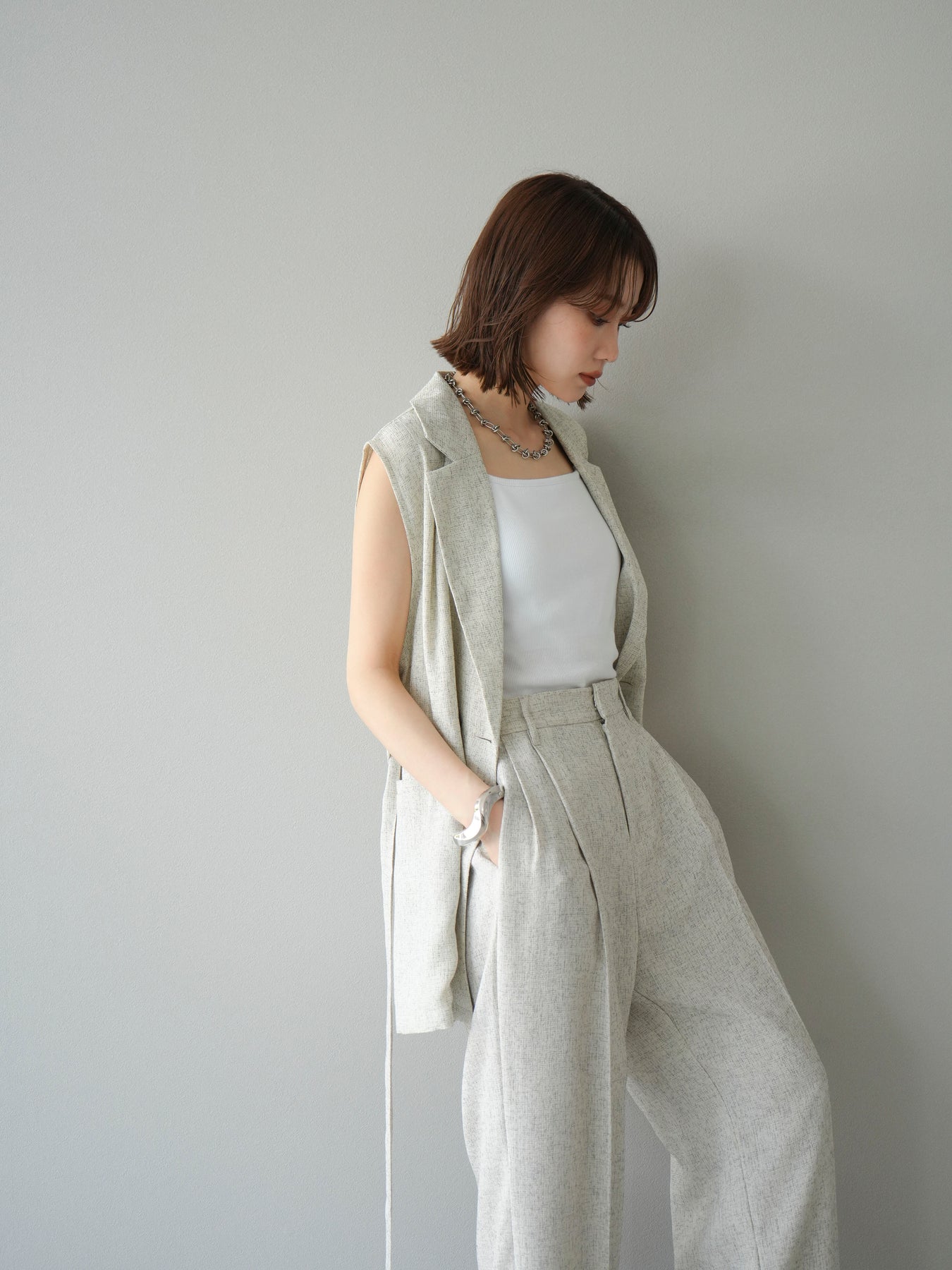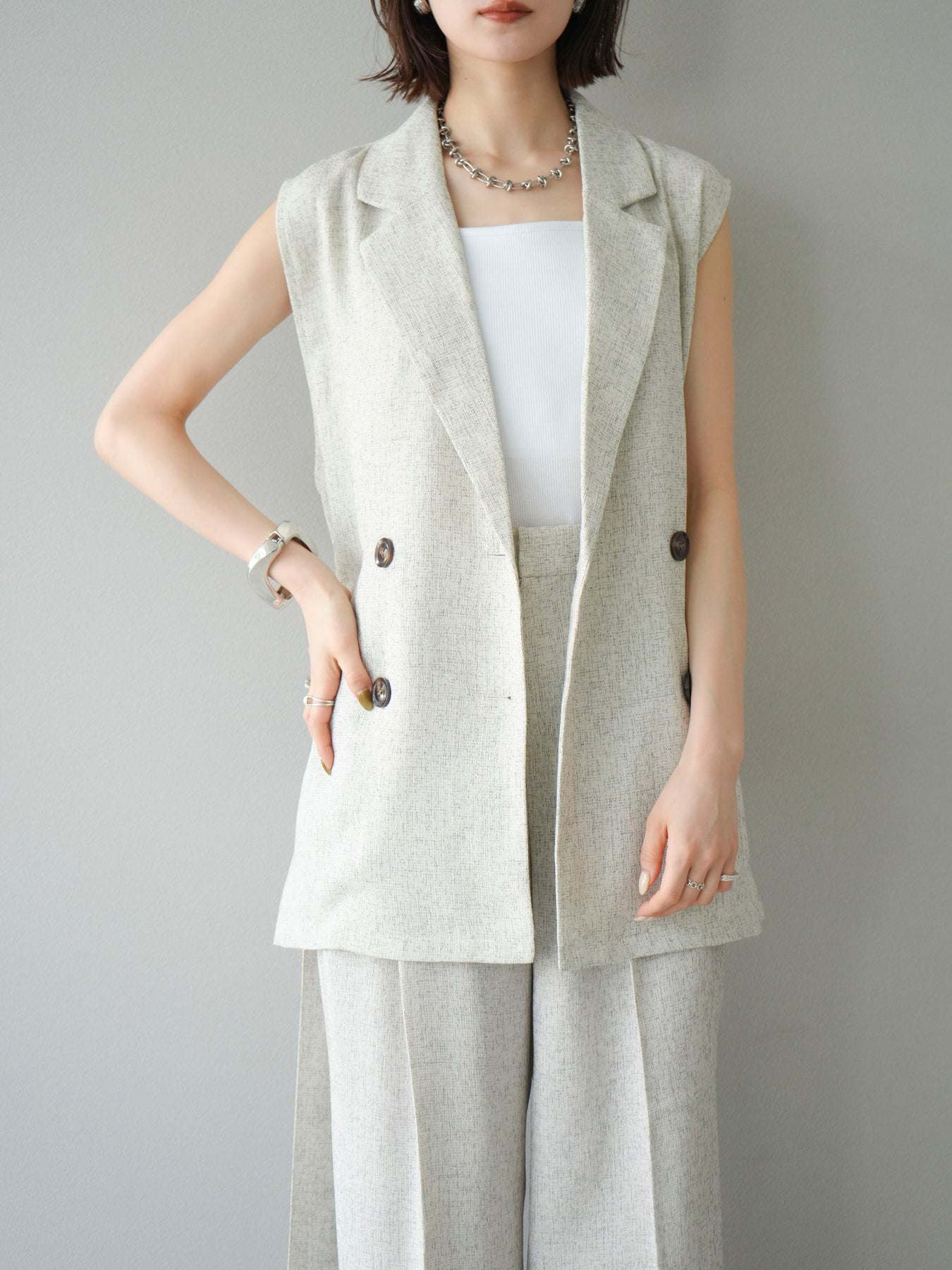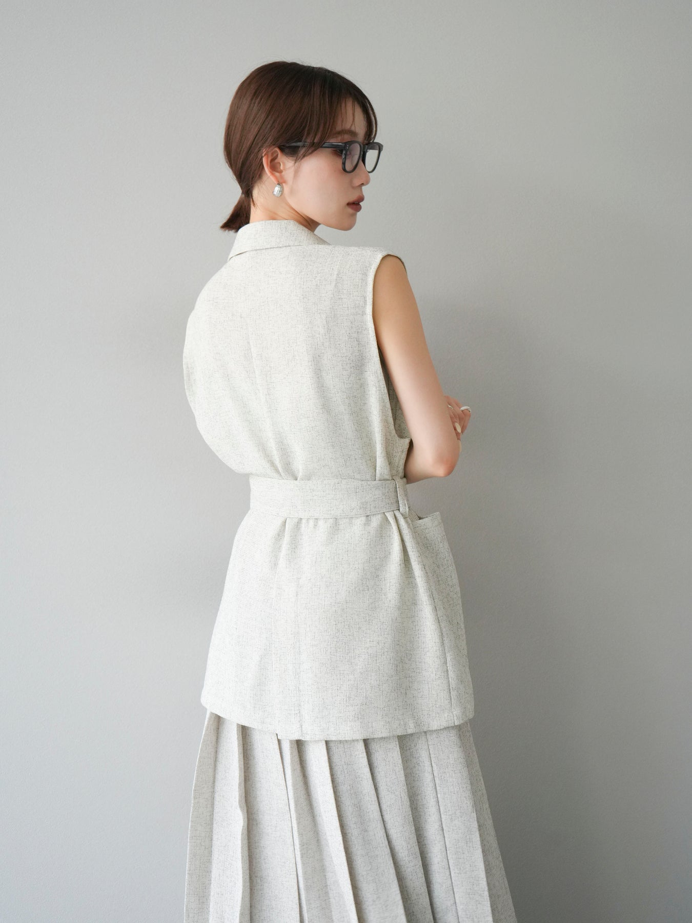 上品で洗練された印象を演出する、ミックスツイード素材のジレ。クラシカルなダブルボタンデザインとウエストリボンが、メリハリのあるシルエットを叶えます。さらりと羽織るだけでコーデを格上げし、インナー次第でロングシーズン活躍。カジュアルからオフィスシーンまで幅広く着まわせる1着です。 ※ボトムス、キャミソール(インナー)以外の商品は一律でインナーは付属していません。