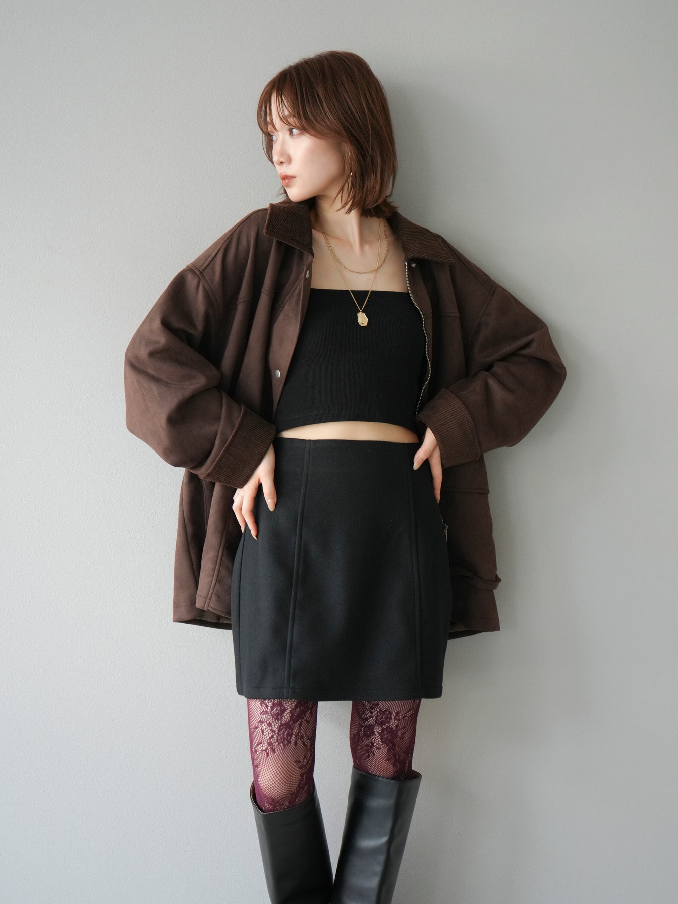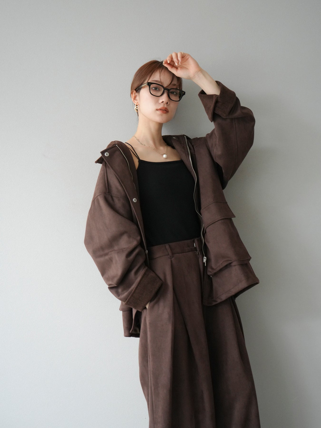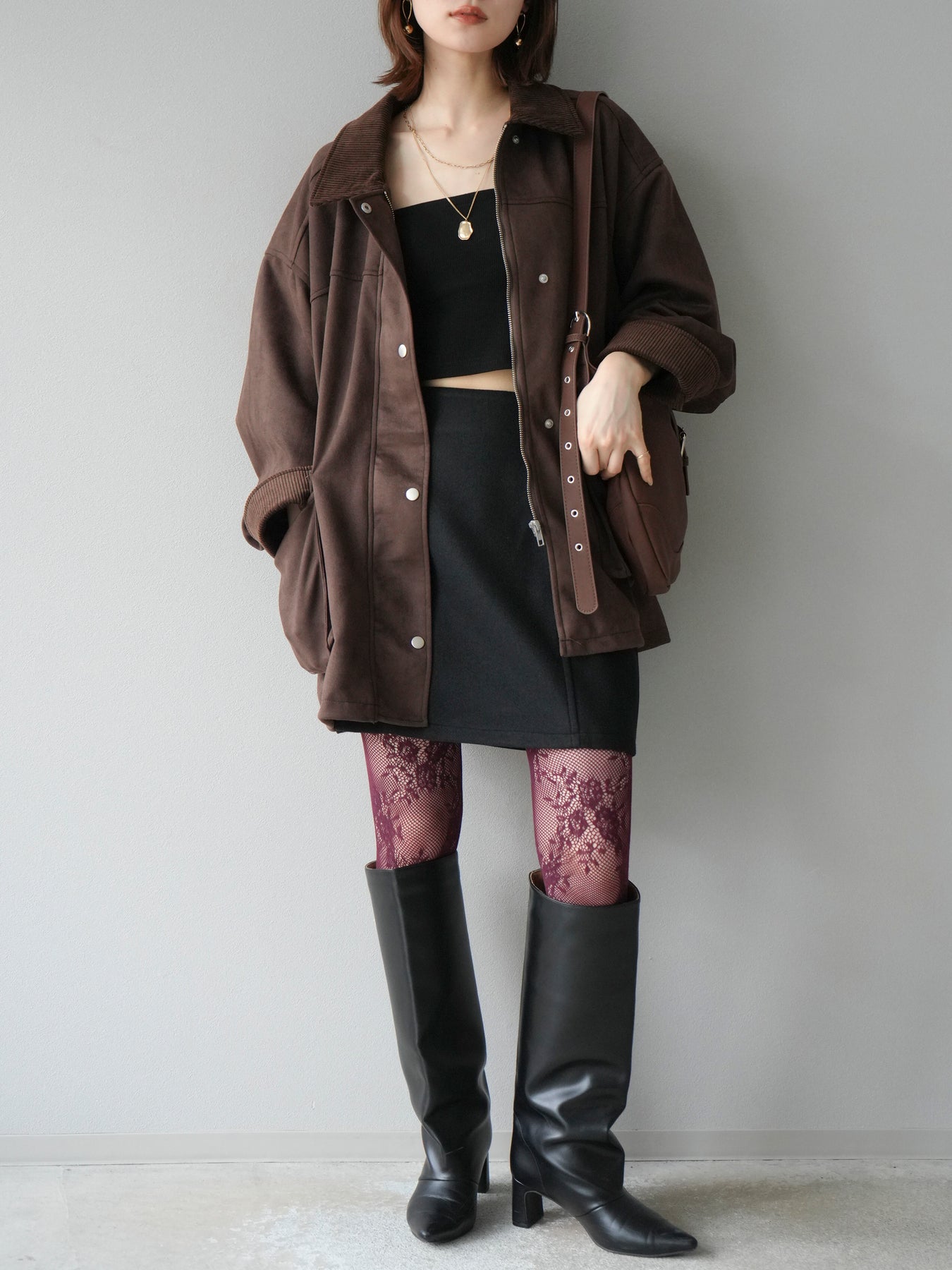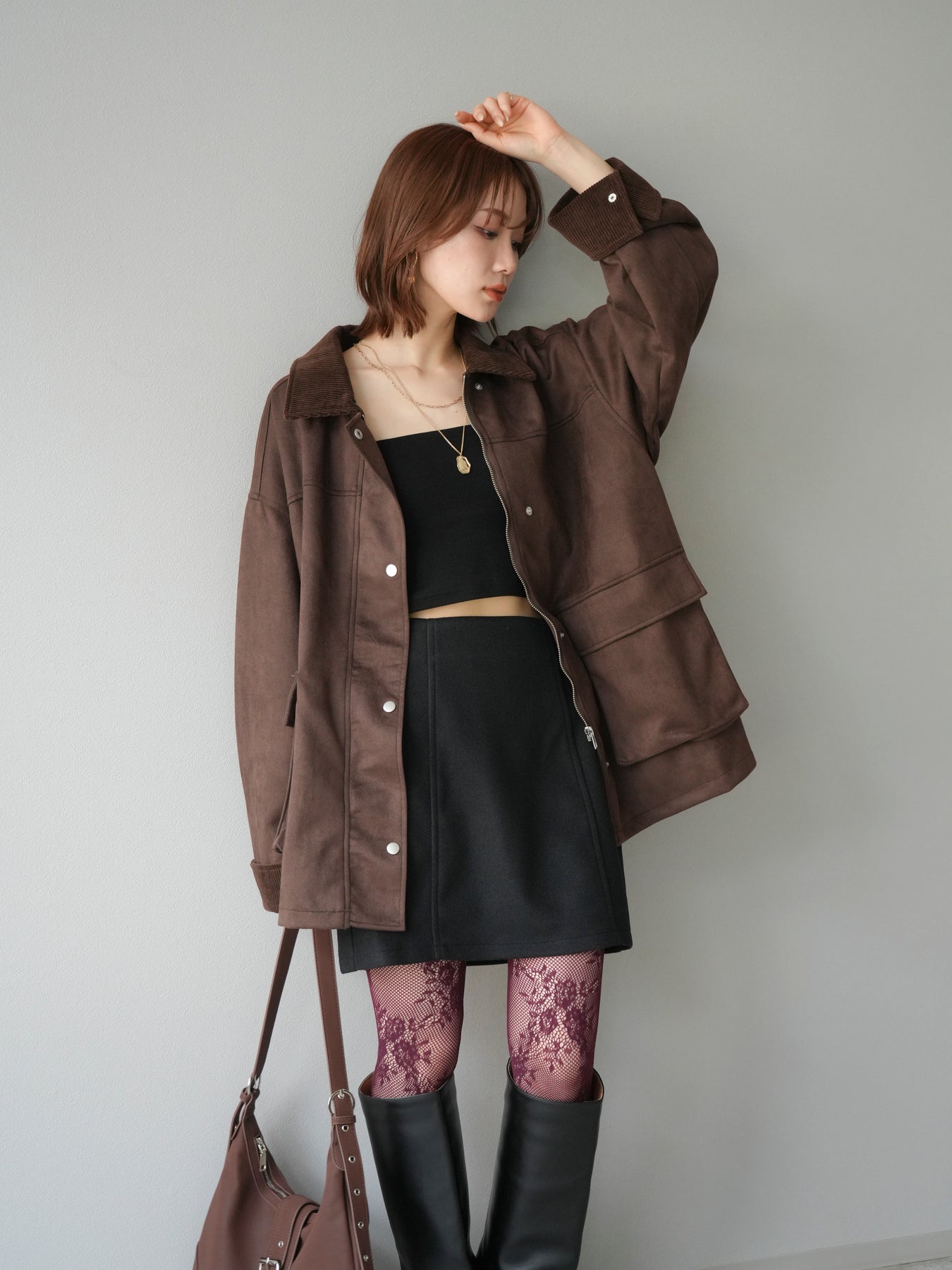 滑らかなスウェード調素材にコーデュロイ襟を組み合わせた、存在感のあるミドルジャケット。異素材のコントラストがシーズンムードを引き立て、羽織るだけでこなれ感を演出します。程よくゆとりのあるシルエットで重ね着しやすく、デイリーからお出かけシーンまで幅広く活躍。大きめのフロントポケットやカフス部分の切り替えなど、細部にまでこだわったデザインが魅力です。シンプルなスタイリングにプラスするだけで、着映えする主役アイテムになります。 ※ボトムス、キャミソール(インナー)以外の商品は一律でインナーは付属していません。