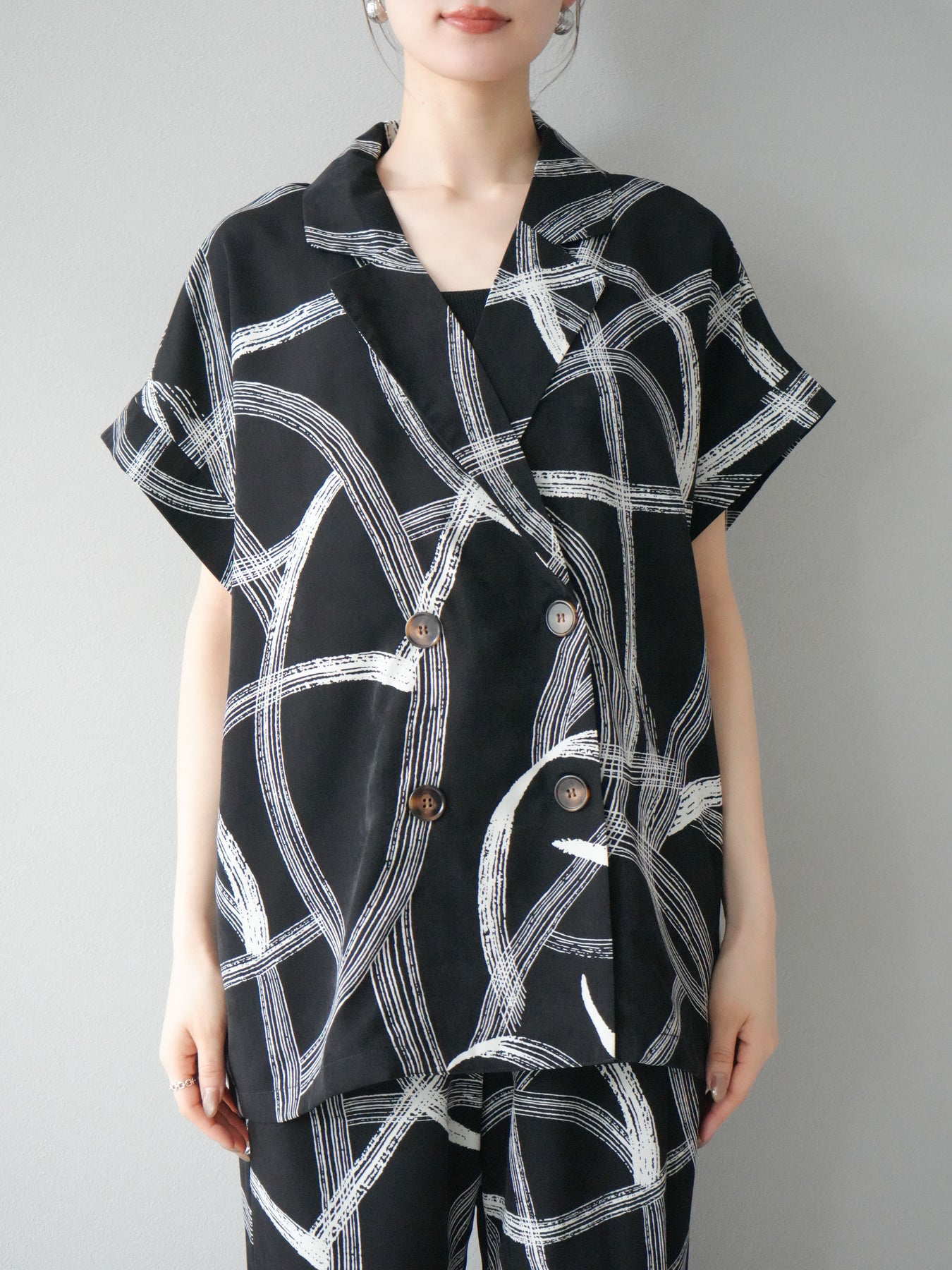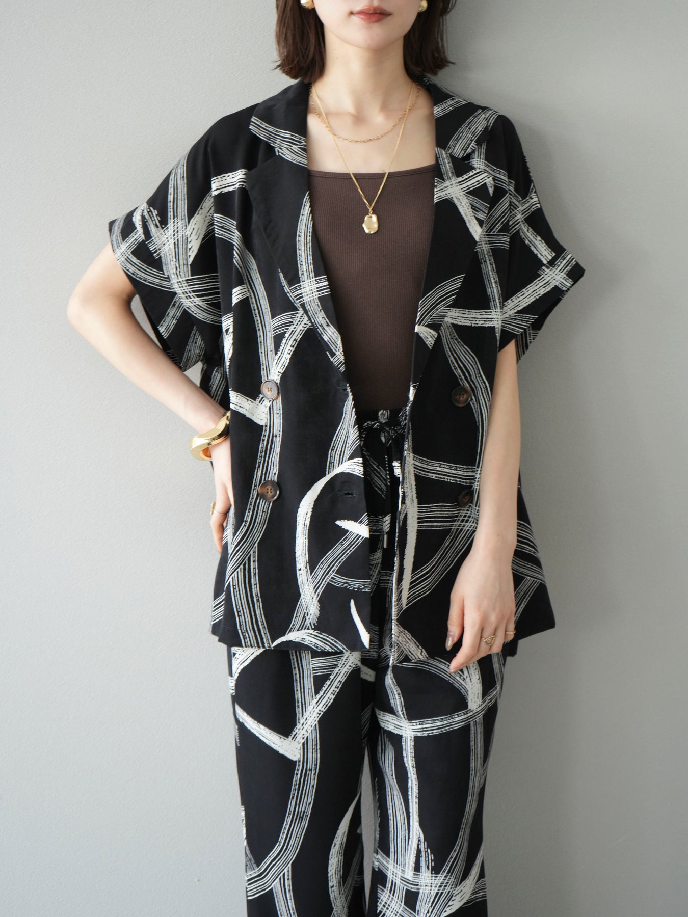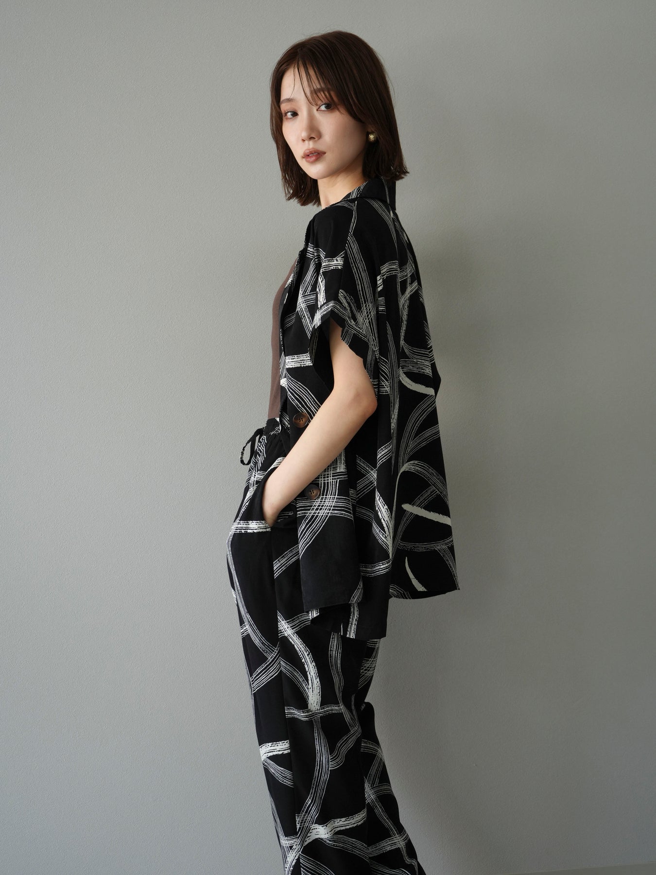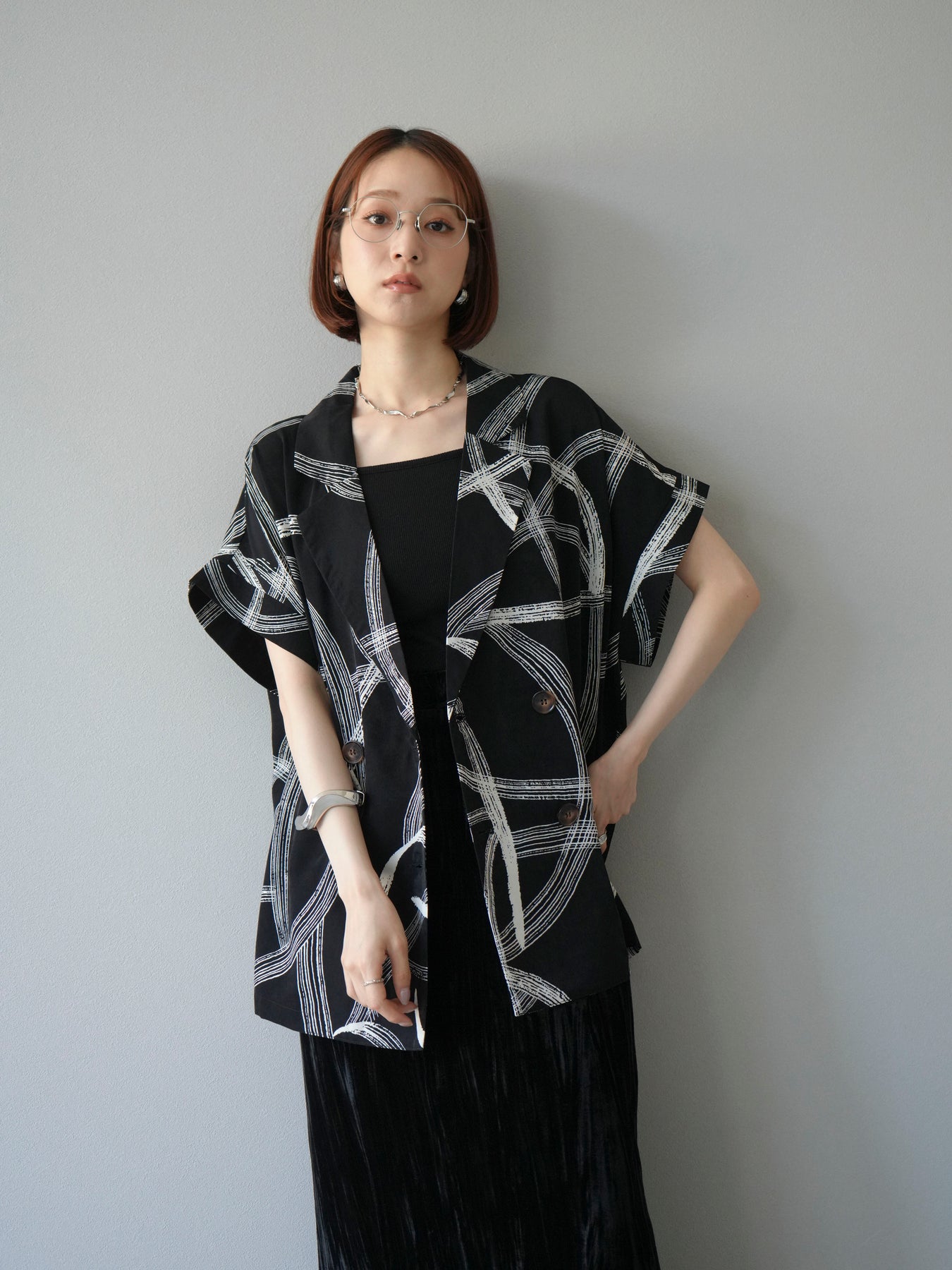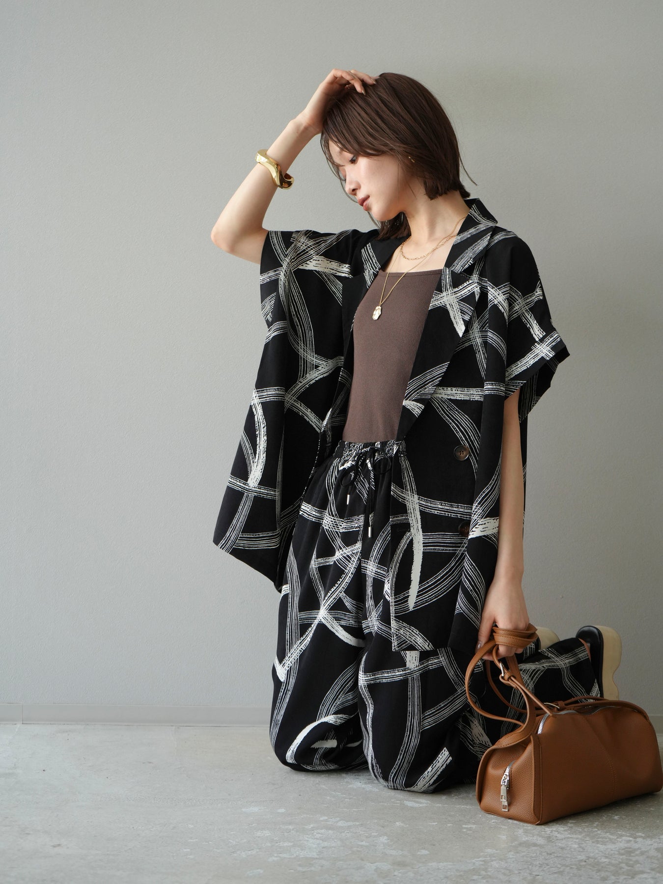大胆なサークル柄が目を惹くハーフジャケット。さらりとした素材感で軽やかに羽織れ、季節の変わり目にも活躍するアイテムです。ゆとりのあるシルエットが抜け感を演出し、Tシャツやカットソーの上から羽織るだけでスタイリングが決まる一枚。フロントのボタンを留めればシャツライクに、開けて羽織ればラフなジャケット風にと着回しの幅も広がります。存在感のあるデザインながらコーディネートに取り入れやすく、シンプルなボトムスと合わせるだけでモードな雰囲気を楽しめます。 ※ボトムス、キャミソール(インナー)以外の商品は一律でインナーは付属していません。