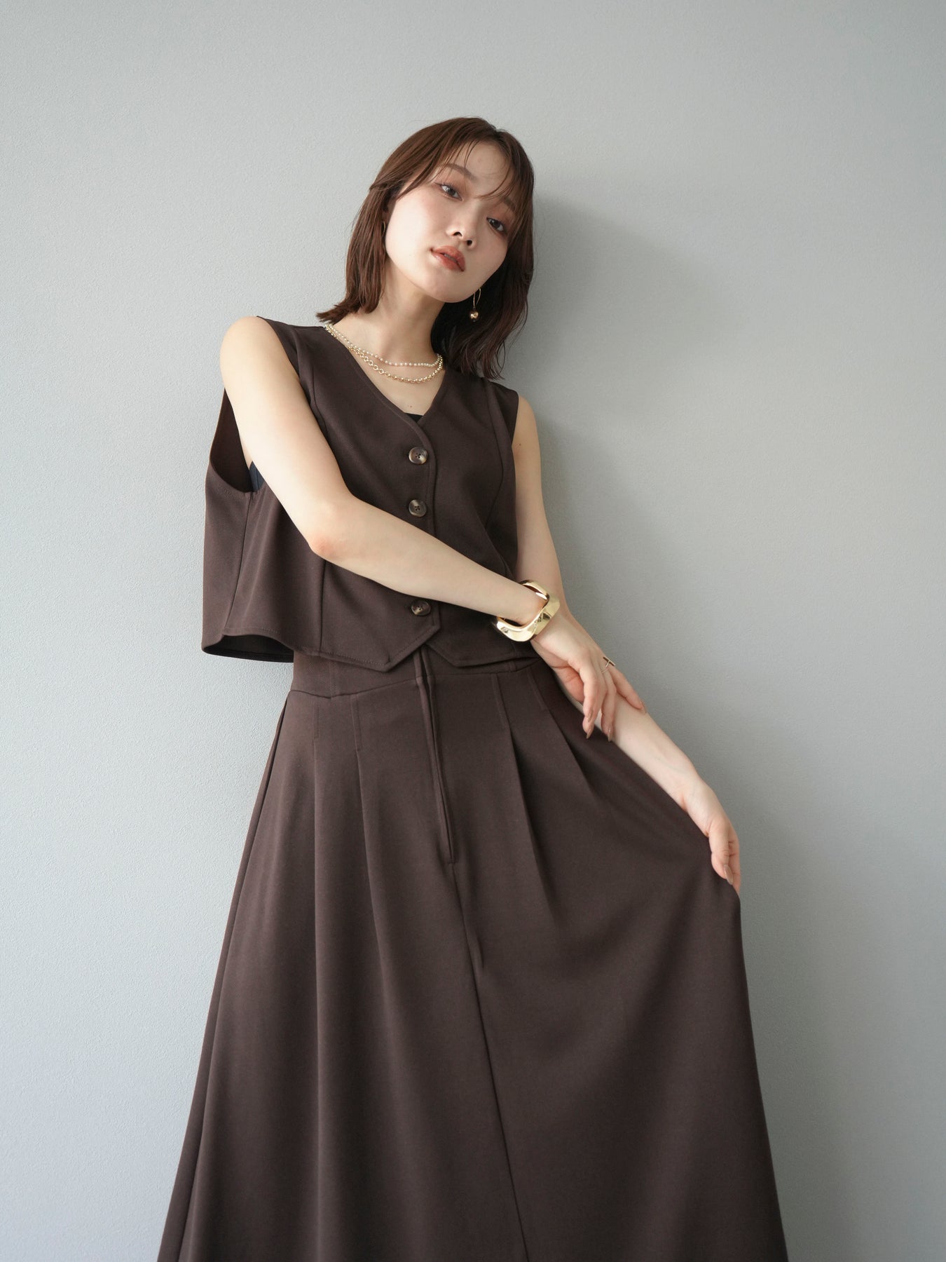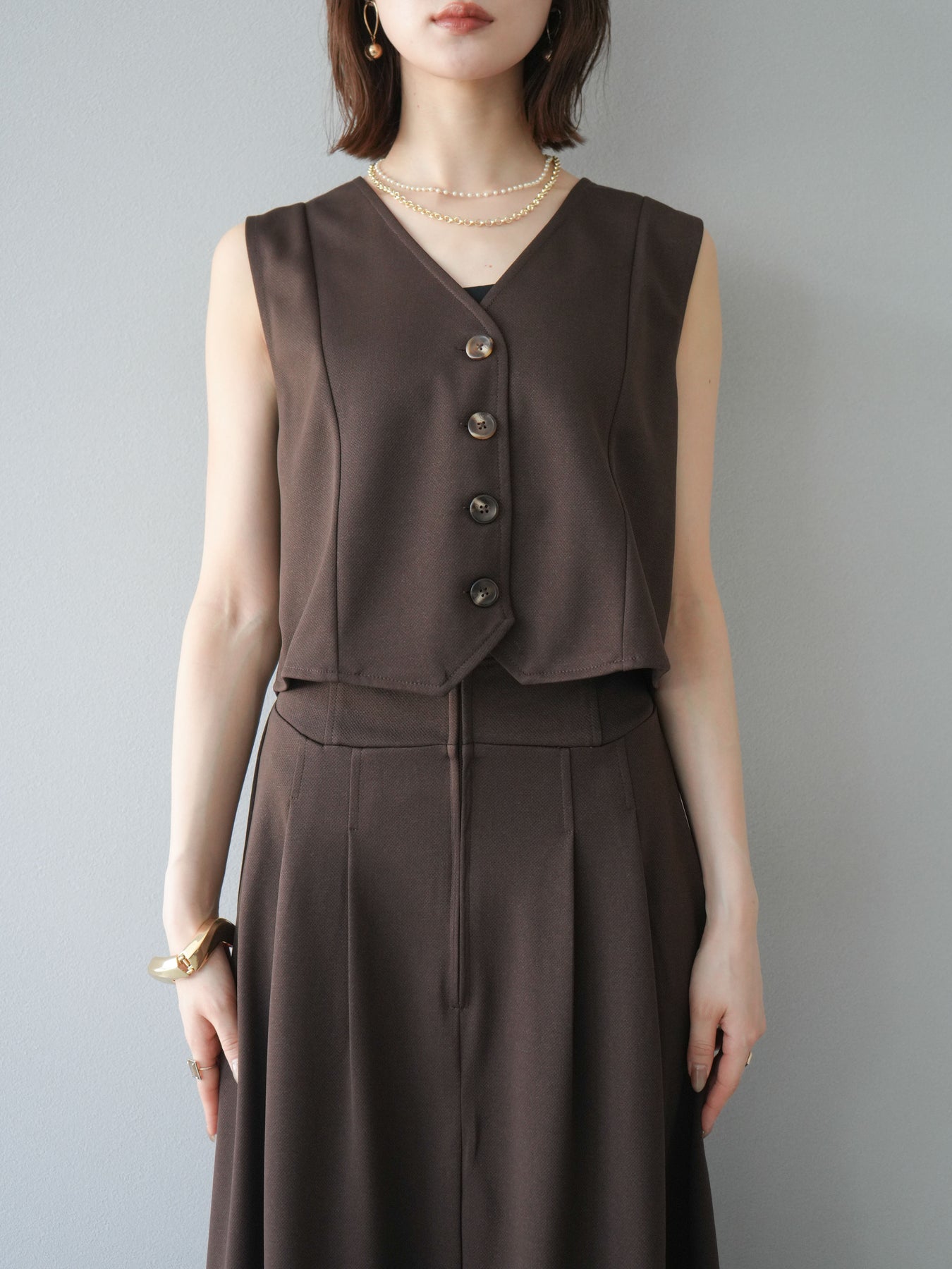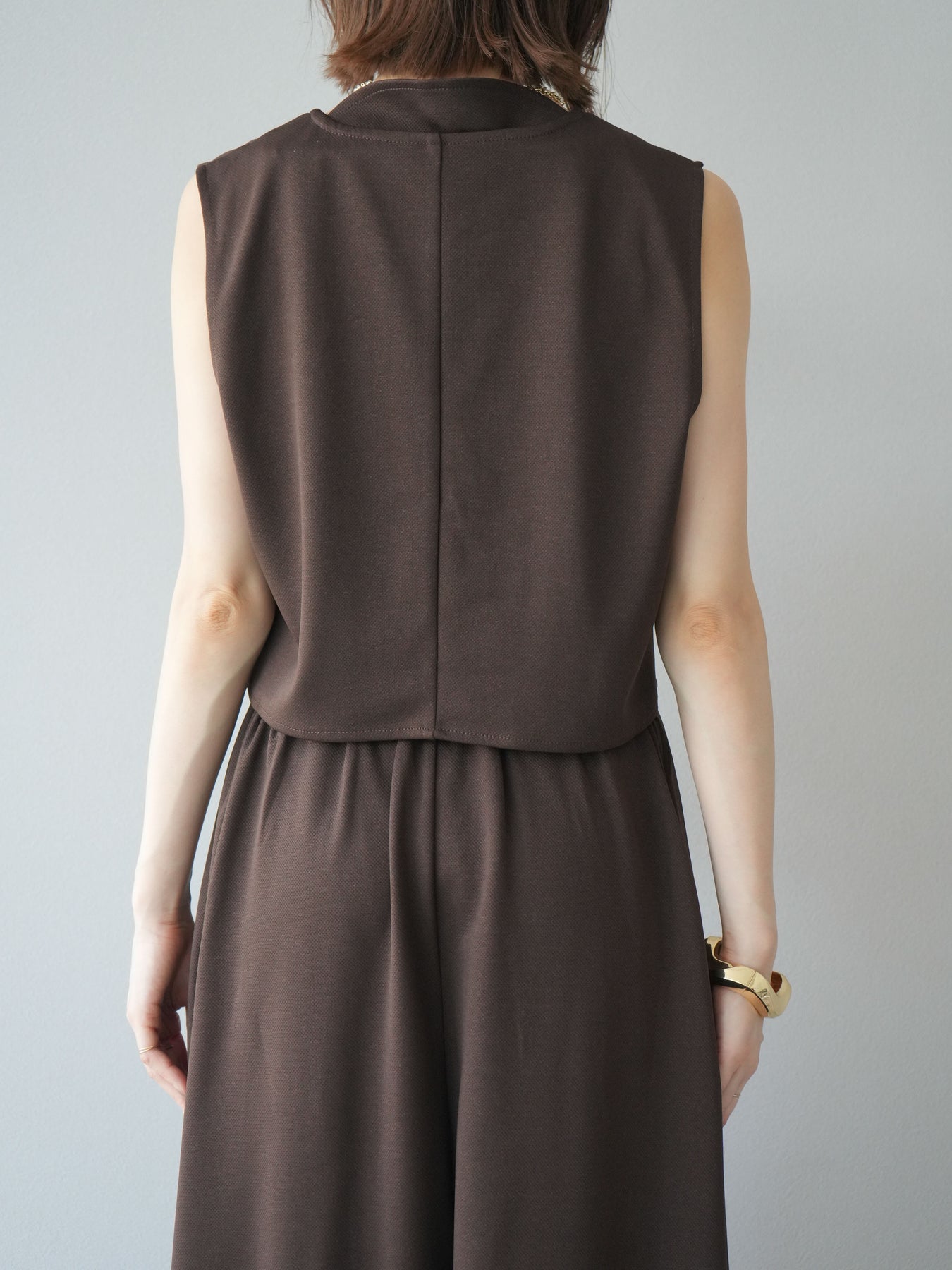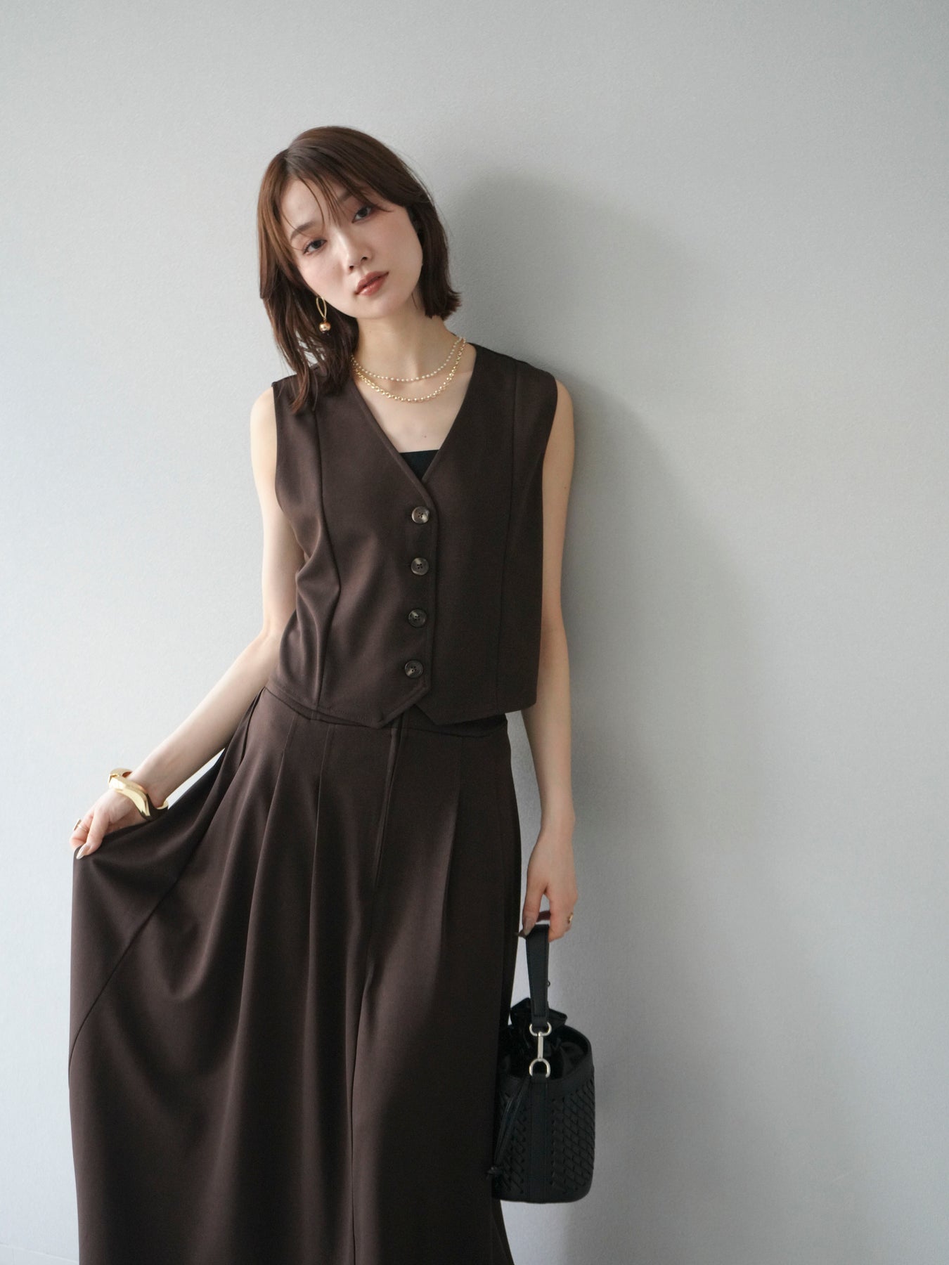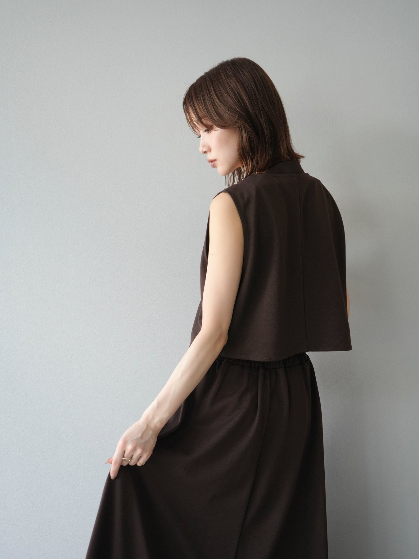 柔らかさと程よいハリ感を兼ね備えたポンチ素材を使用したノーカラーベスト。フロントに配したボタンディテールとウエストにかけての立体的なシルエットが、すっきりとした印象を演出します。ノーカラー仕様のため、シャツやカットソー、ワンピースの上からさらりと羽織るだけでスタイリングが完成。トレンドのレイヤードスタイルを楽しめるうえ、シーズンレスで活躍できる万能アイテムです。カジュアルにもきれいめにも合わせやすく、幅広いシーンで重宝します。 ※ボトムス、キャミソール(インナー)以外の商品は一律でインナーは付属していません。