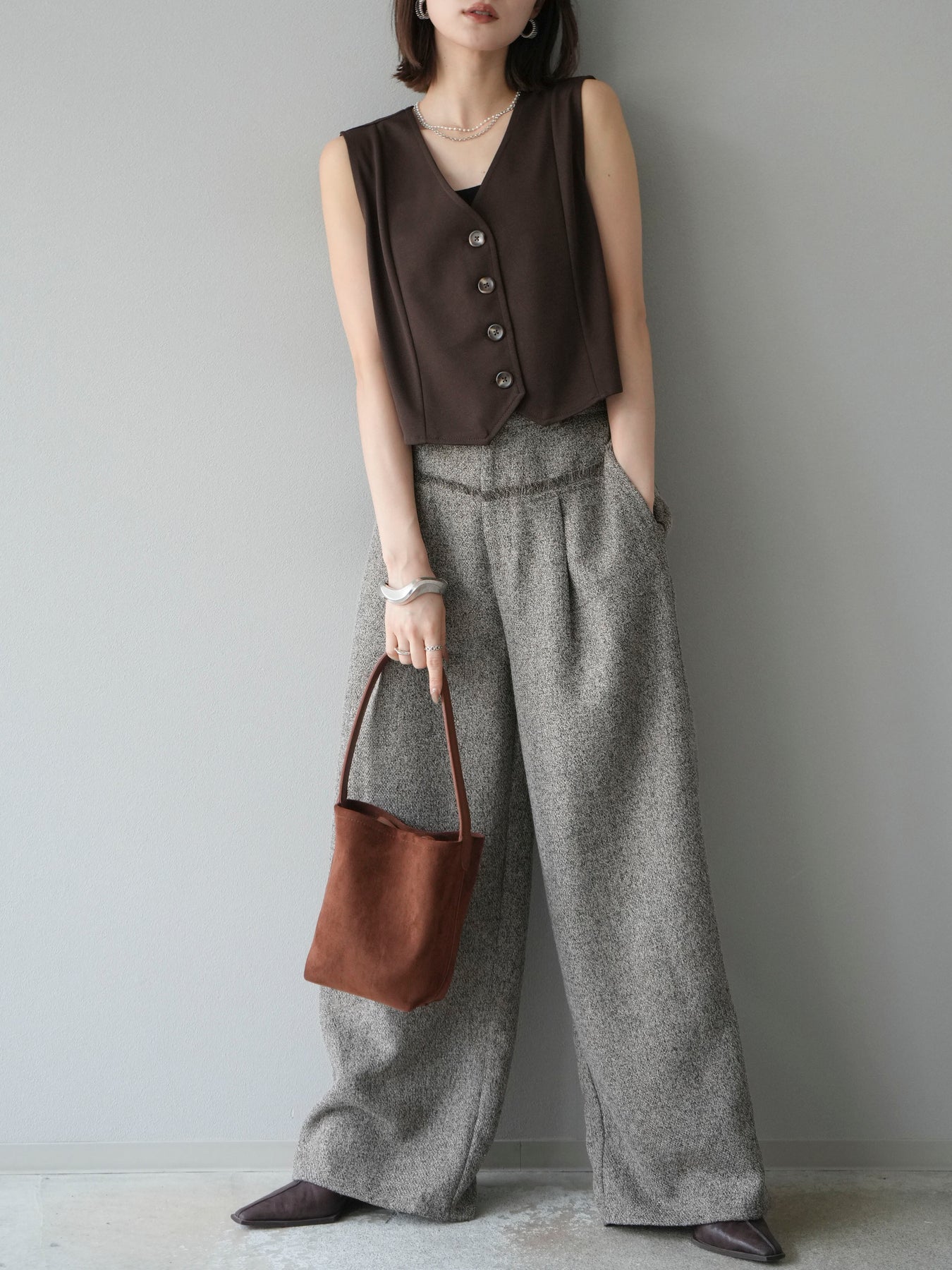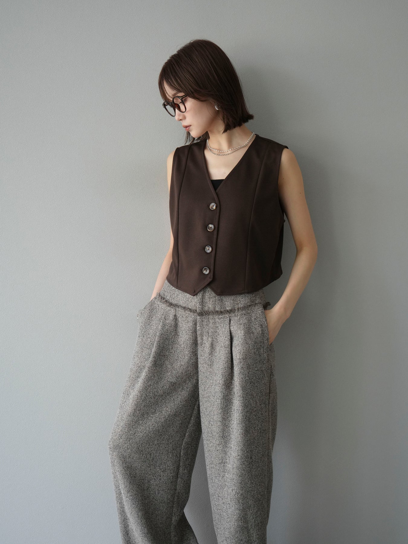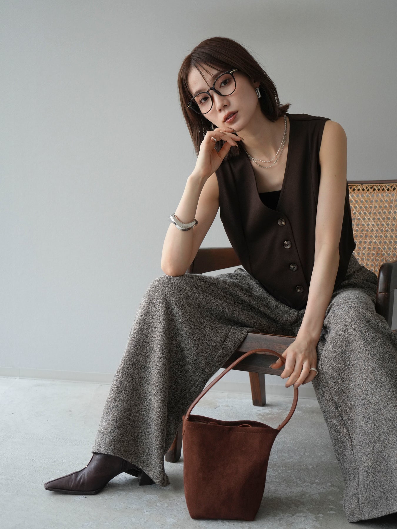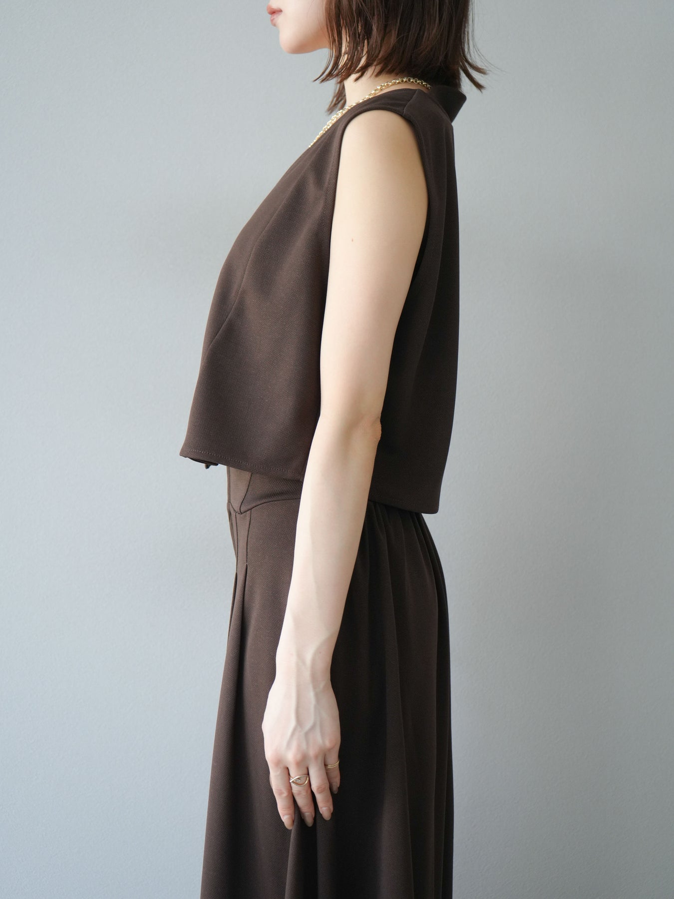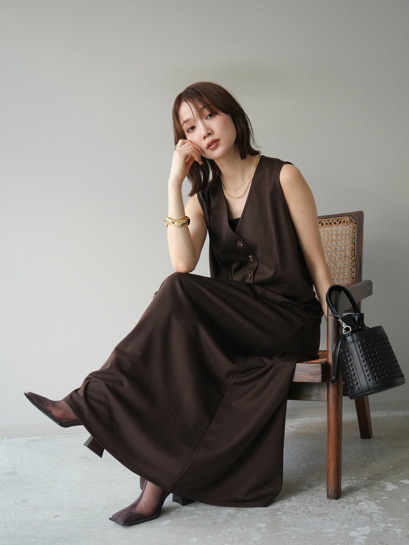 柔らかさと程よいハリ感を兼ね備えたポンチ素材を使用したノーカラーベスト。フロントに配したボタンディテールとウエストにかけての立体的なシルエットが、すっきりとした印象を演出します。ノーカラー仕様のため、シャツやカットソー、ワンピースの上からさらりと羽織るだけでスタイリングが完成。トレンドのレイヤードスタイルを楽しめるうえ、シーズンレスで活躍できる万能アイテムです。カジュアルにもきれいめにも合わせやすく、幅広いシーンで重宝します。 ※ボトムス、キャミソール(インナー)以外の商品は一律でインナーは付属していません。
