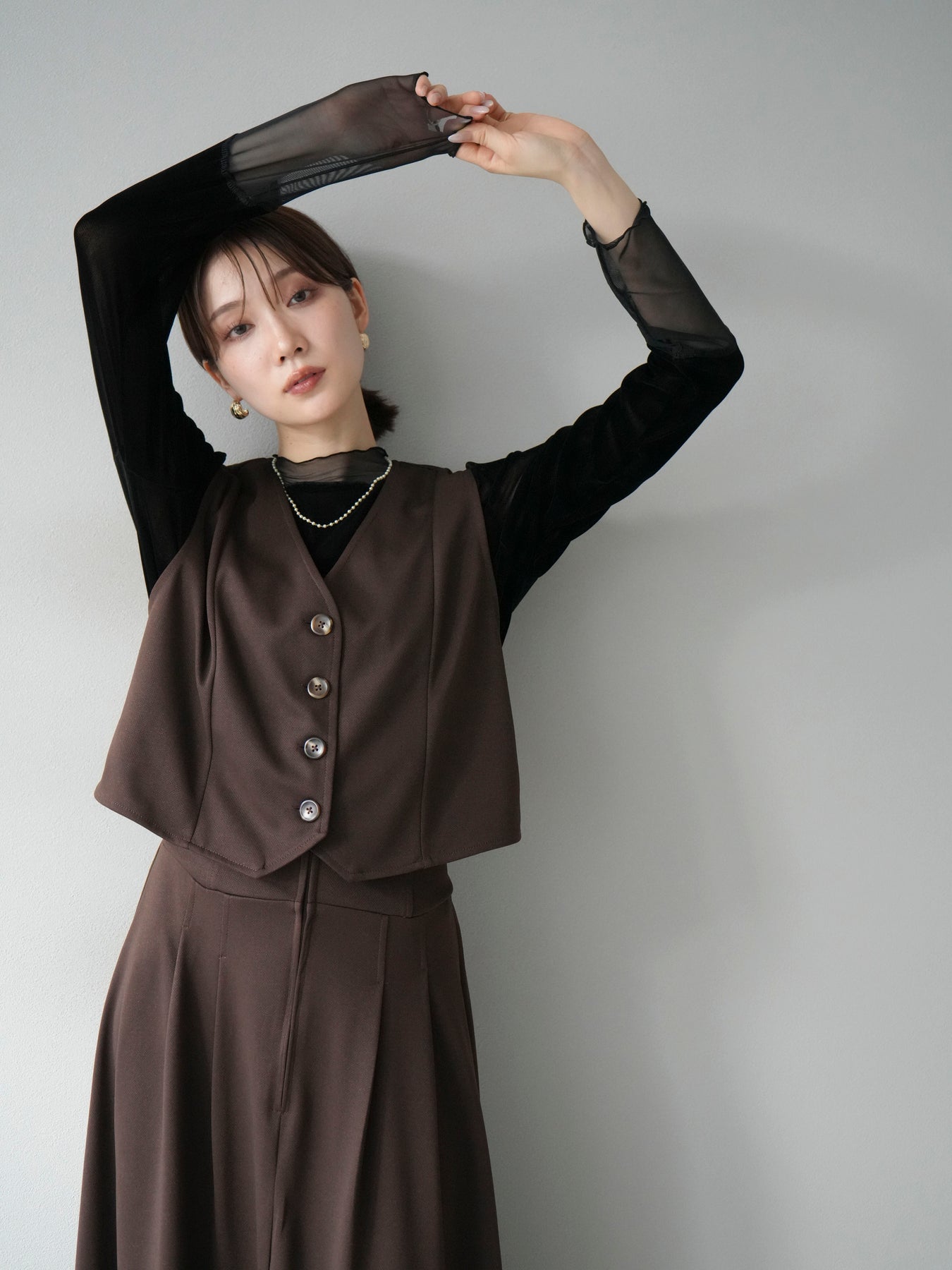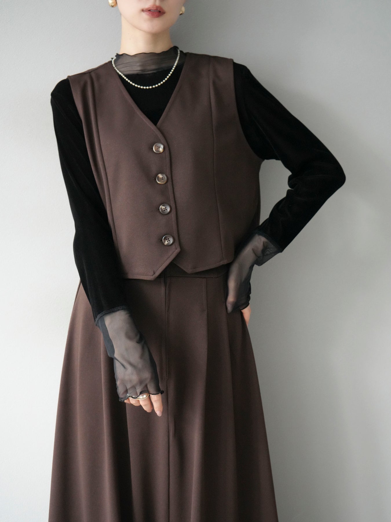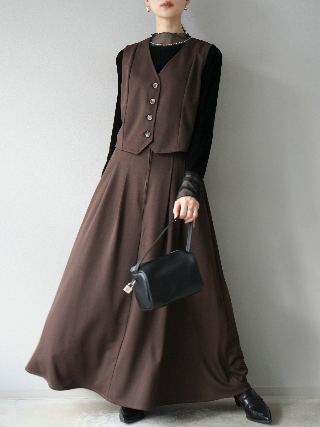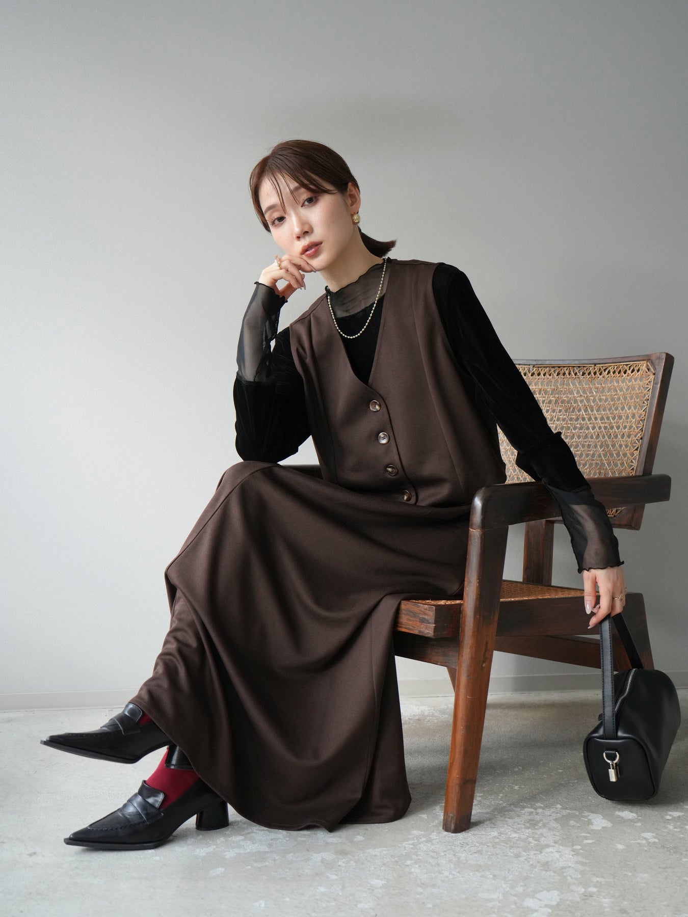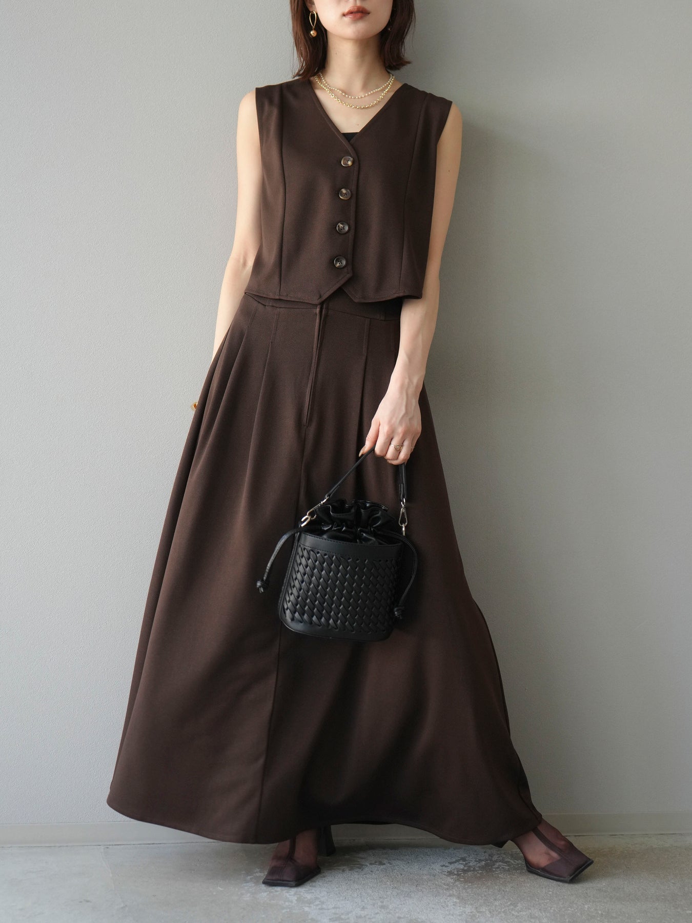 柔らかさと程よいハリ感を兼ね備えたポンチ素材を使用したノーカラーベスト。フロントに配したボタンディテールとウエストにかけての立体的なシルエットが、すっきりとした印象を演出します。ノーカラー仕様のため、シャツやカットソー、ワンピースの上からさらりと羽織るだけでスタイリングが完成。トレンドのレイヤードスタイルを楽しめるうえ、シーズンレスで活躍できる万能アイテムです。カジュアルにもきれいめにも合わせやすく、幅広いシーンで重宝します。 ※ボトムス、キャミソール(インナー)以外の商品は一律でインナーは付属していません。