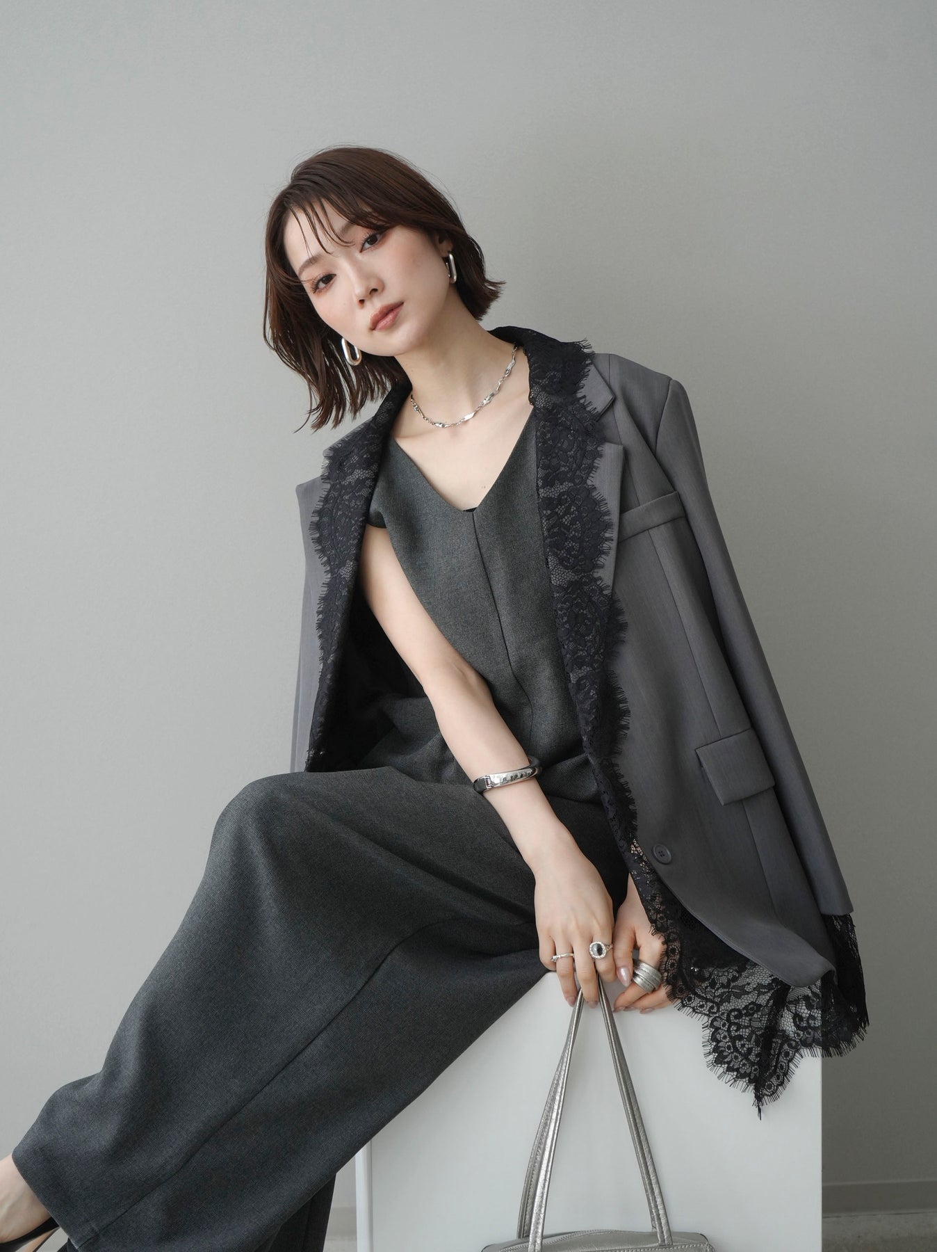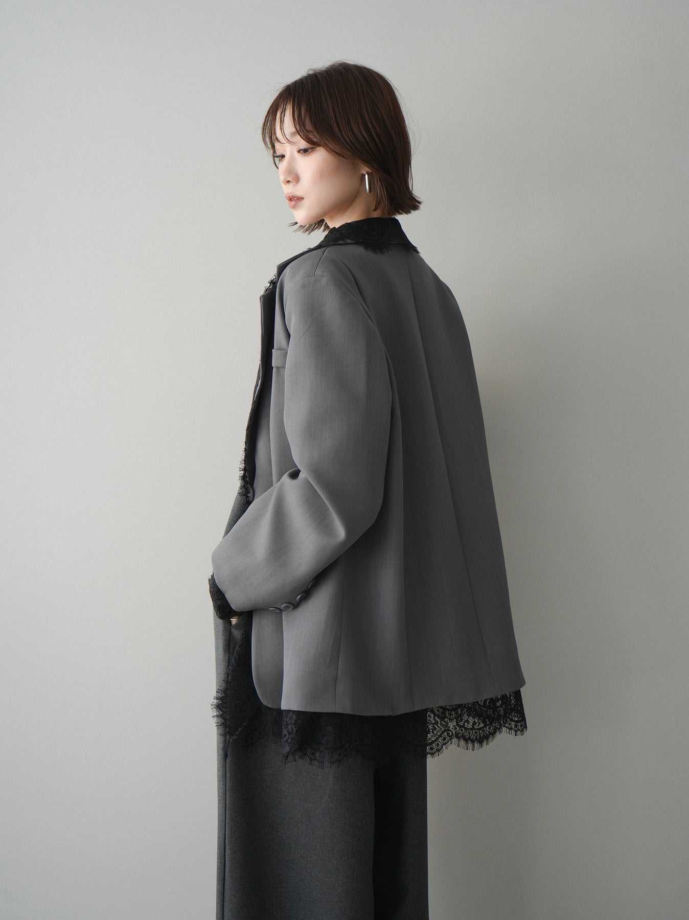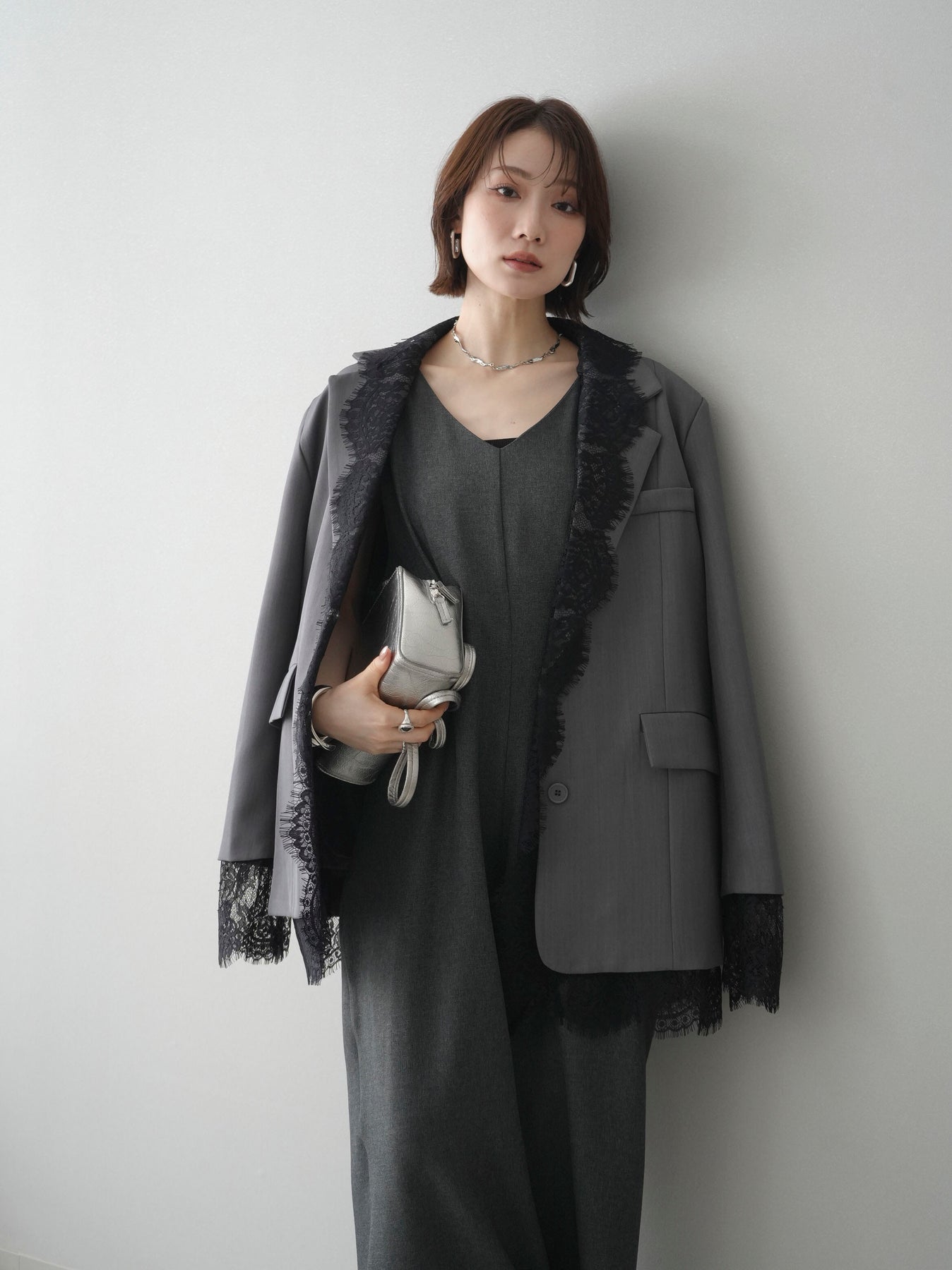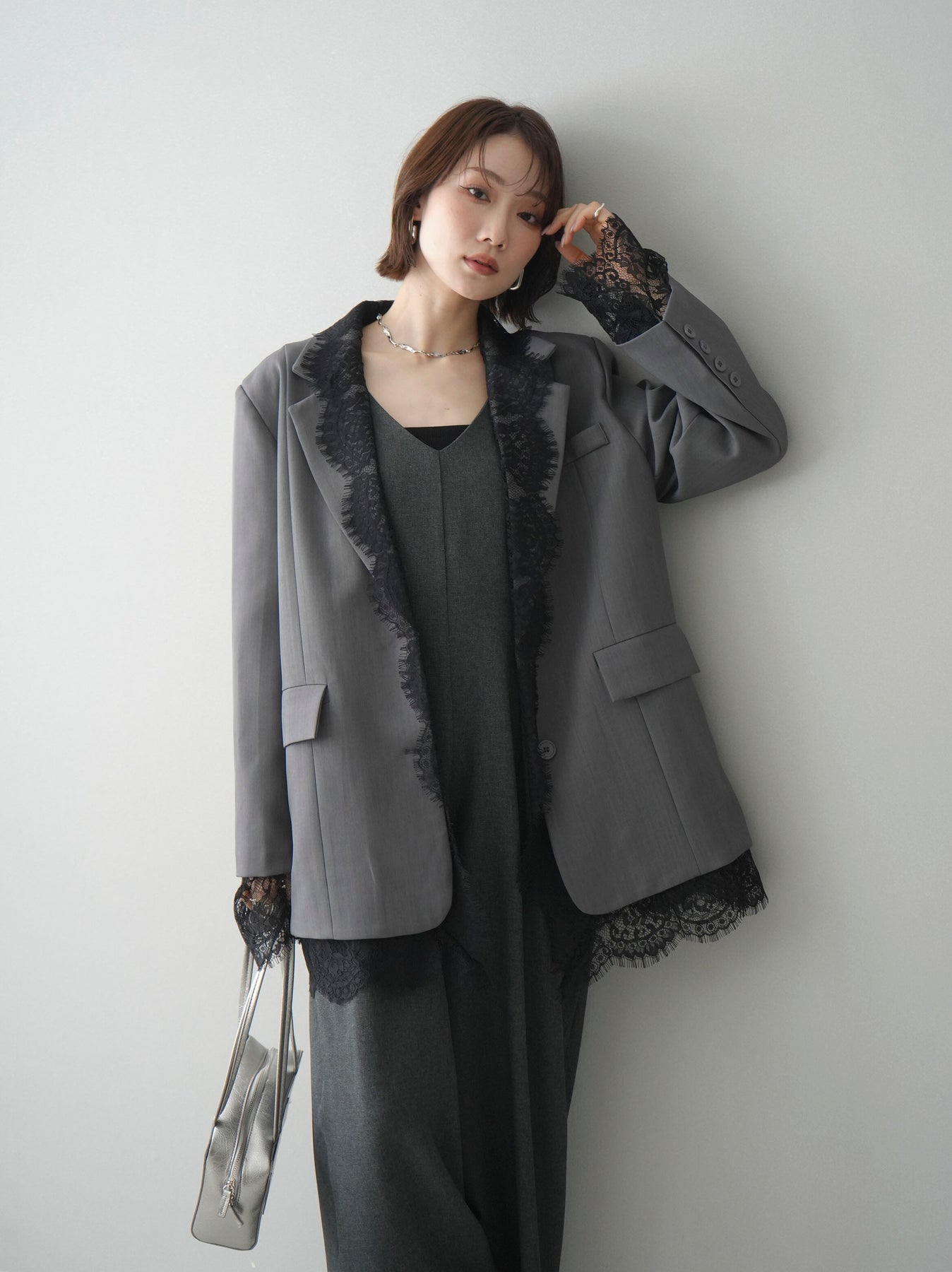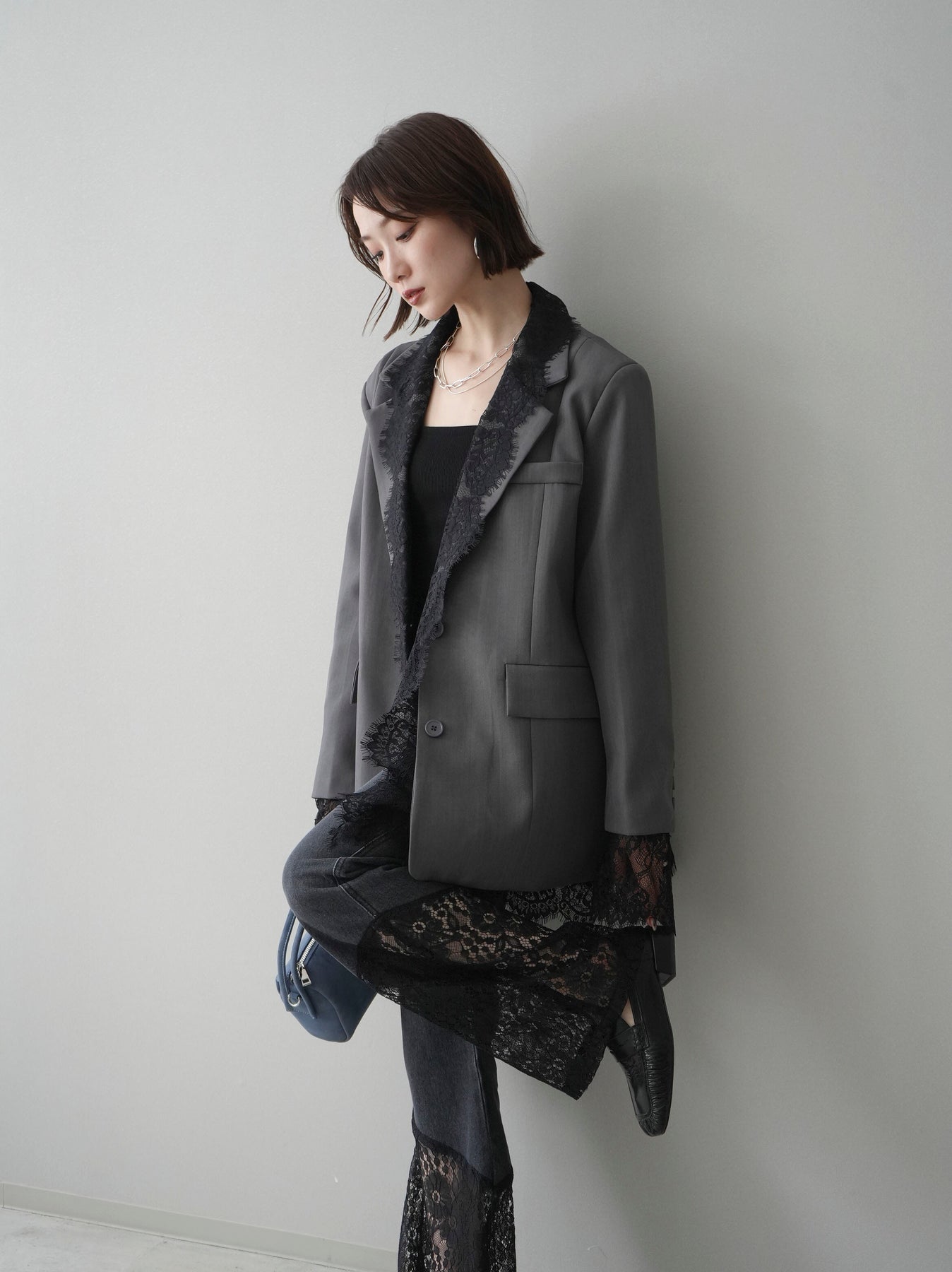 クラシカルなテーラードジャケットに繊細なレースをドッキングした、存在感のあるオーバージャケット。襟元や裾から覗くレースが上品な華やかさを添え、マニッシュなシルエットとのコントラストが洗練された印象を演出します。ゆとりのあるオーバーサイズで抜け感をプラスし、羽織るだけでこなれたスタイリングに。ヒップにかかる丈感で体のラインをさりげなくカバーし、パンツスタイルにもスカートスタイルにも好相性です。デイリーコーデを格上げしてくれる、主役級の一着です。 ※ボトムス、キャミソール(インナー)以外の商品は一律でインナーは付属していません。