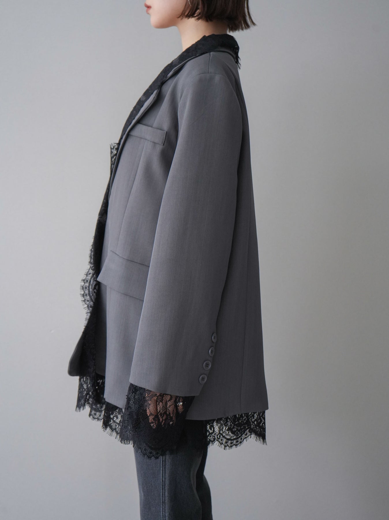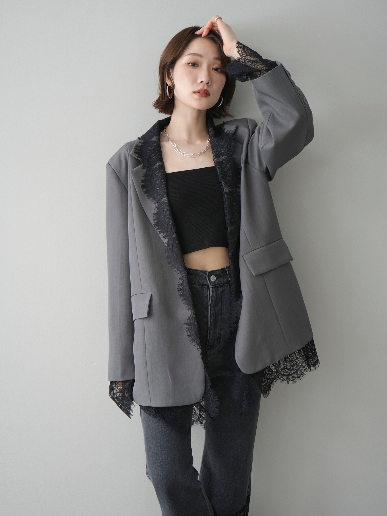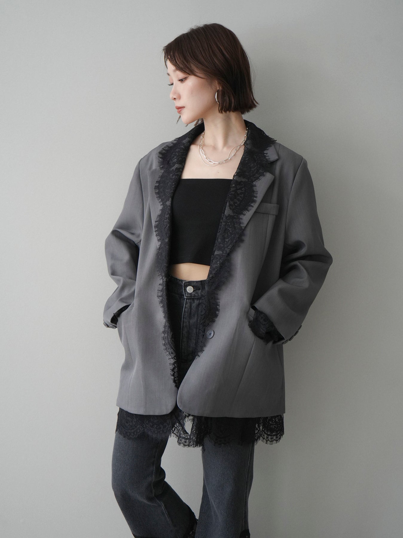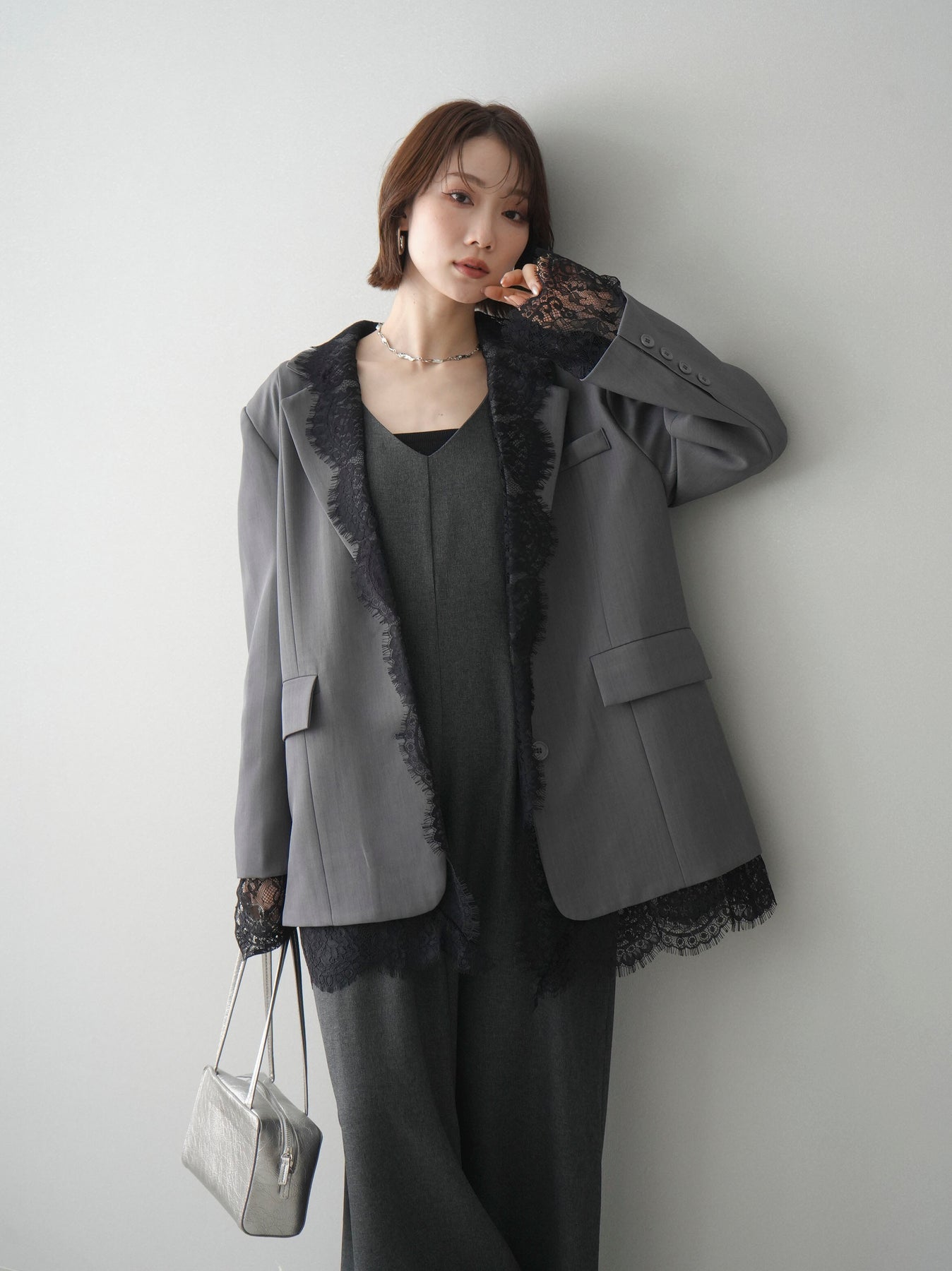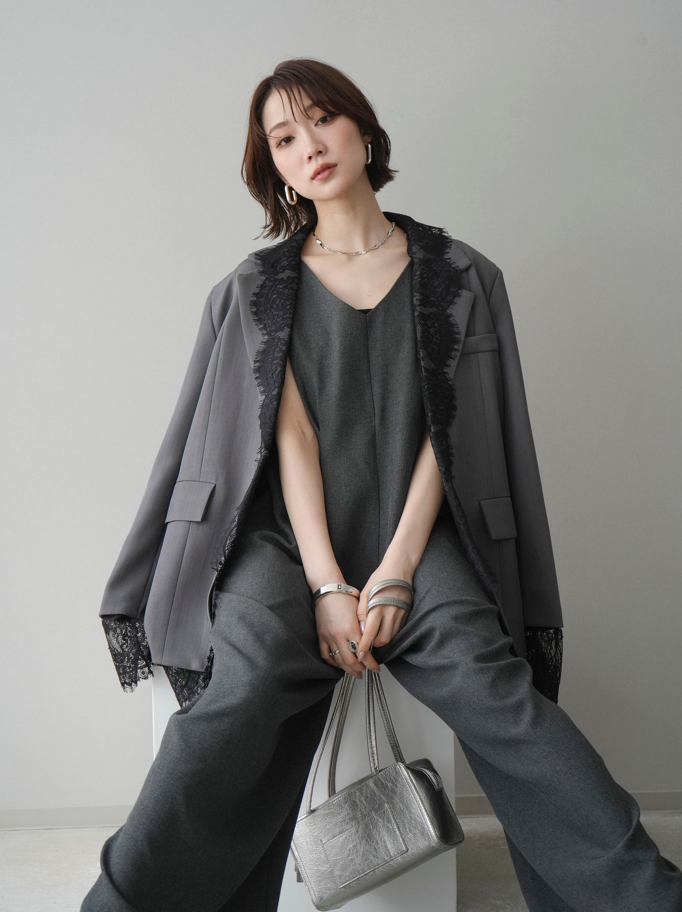 クラシカルなテーラードジャケットに繊細なレースをドッキングした、存在感のあるオーバージャケット。襟元や裾から覗くレースが上品な華やかさを添え、マニッシュなシルエットとのコントラストが洗練された印象を演出します。ゆとりのあるオーバーサイズで抜け感をプラスし、羽織るだけでこなれたスタイリングに。ヒップにかかる丈感で体のラインをさりげなくカバーし、パンツスタイルにもスカートスタイルにも好相性です。デイリーコーデを格上げしてくれる、主役級の一着です。 ※ボトムス、キャミソール(インナー)以外の商品は一律でインナーは付属していません。