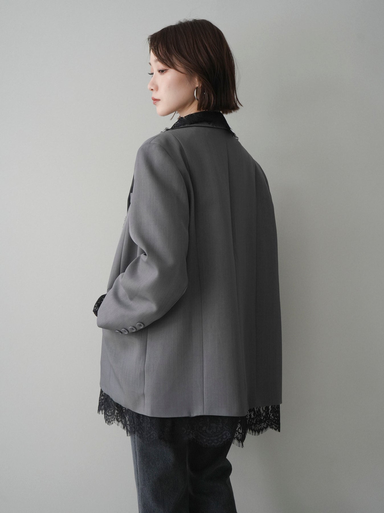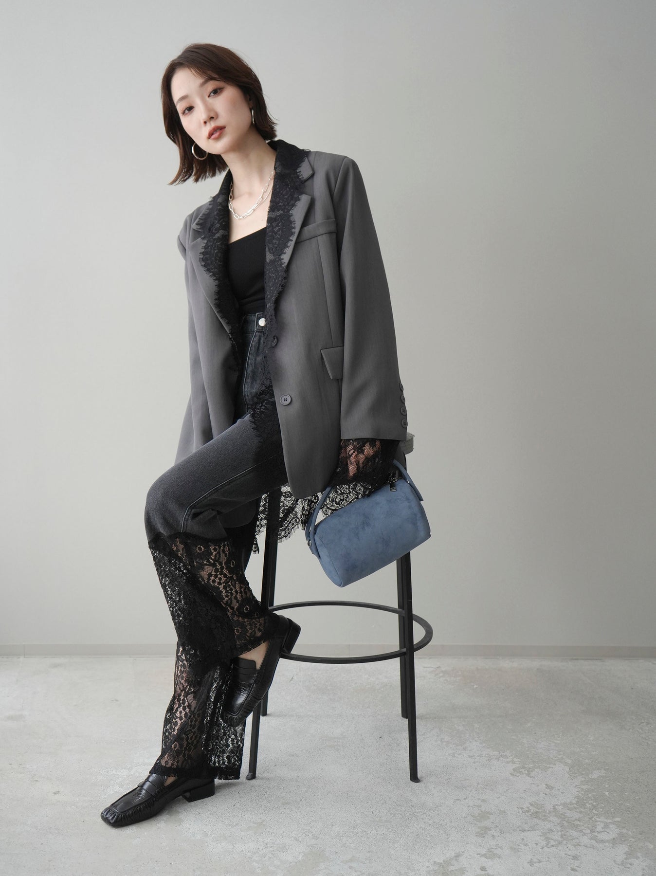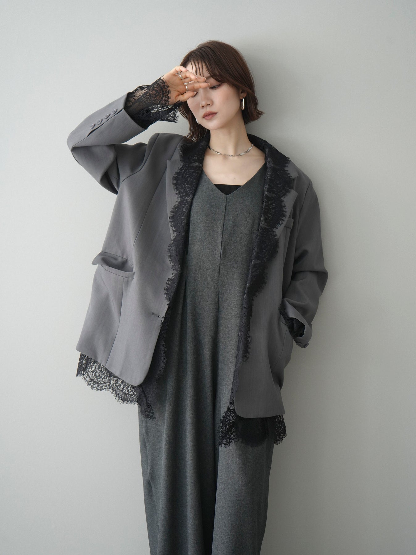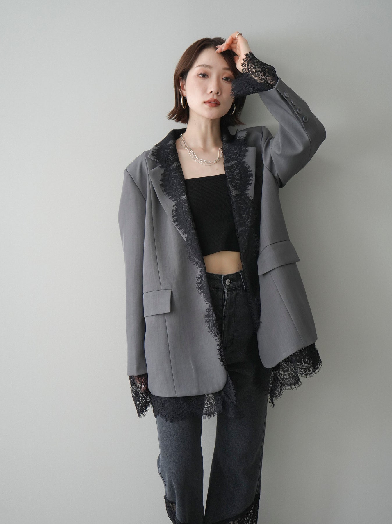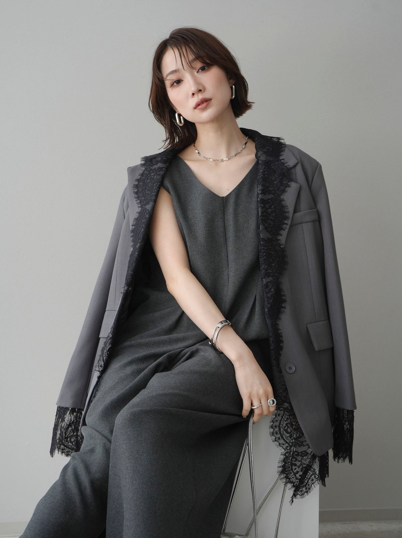 クラシカルなテーラードジャケットに繊細なレースをドッキングした、存在感のあるオーバージャケット。襟元や裾から覗くレースが上品な華やかさを添え、マニッシュなシルエットとのコントラストが洗練された印象を演出します。ゆとりのあるオーバーサイズで抜け感をプラスし、羽織るだけでこなれたスタイリングに。ヒップにかかる丈感で体のラインをさりげなくカバーし、パンツスタイルにもスカートスタイルにも好相性です。デイリーコーデを格上げしてくれる、主役級の一着です。 ※ボトムス、キャミソール(インナー)以外の商品は一律でインナーは付属していません。