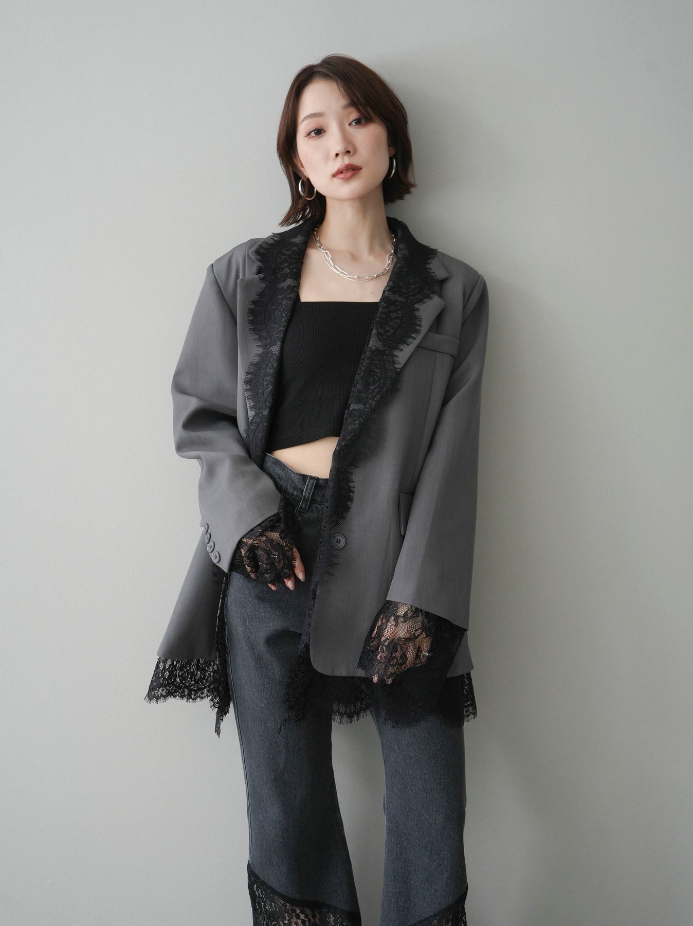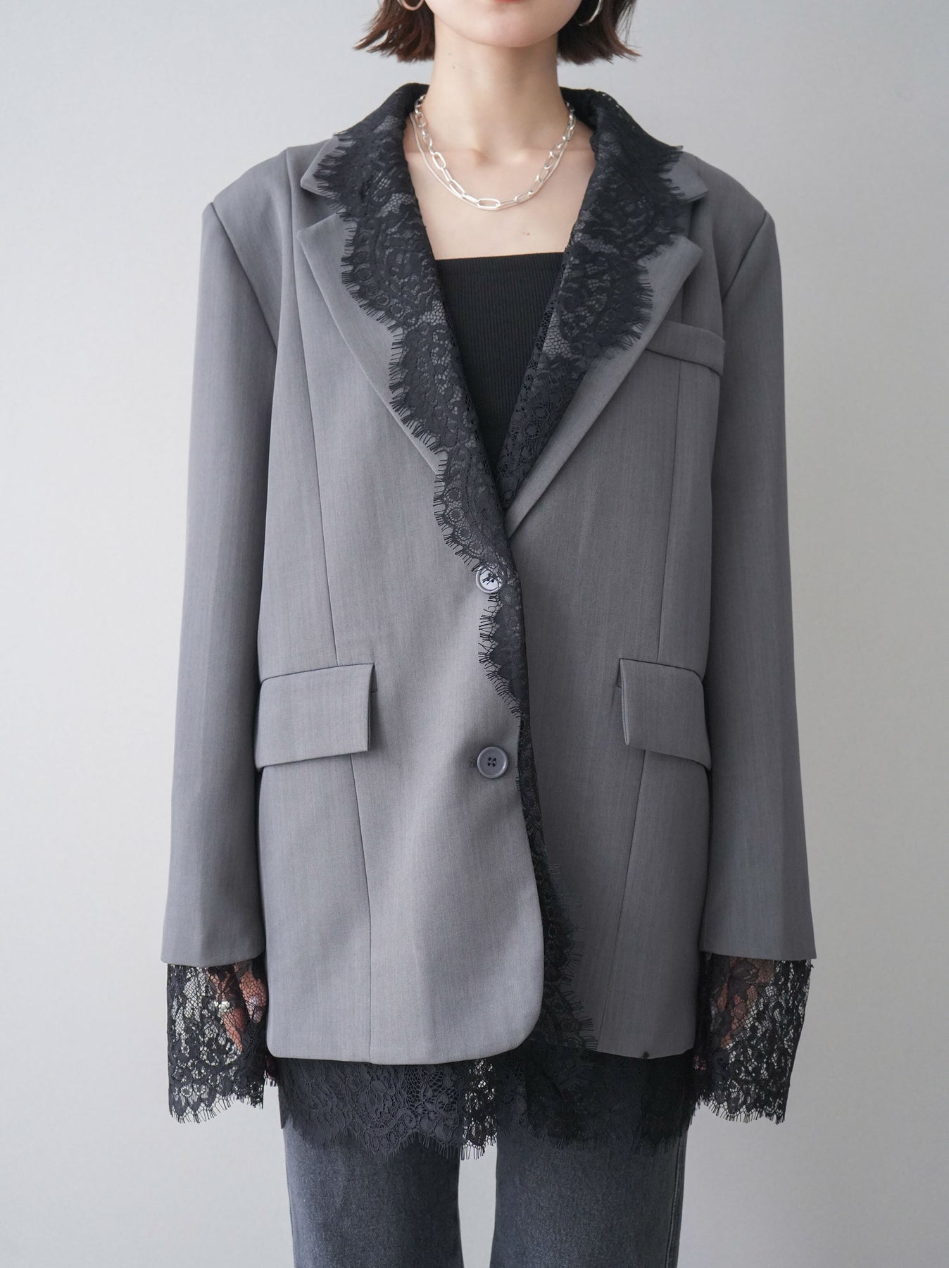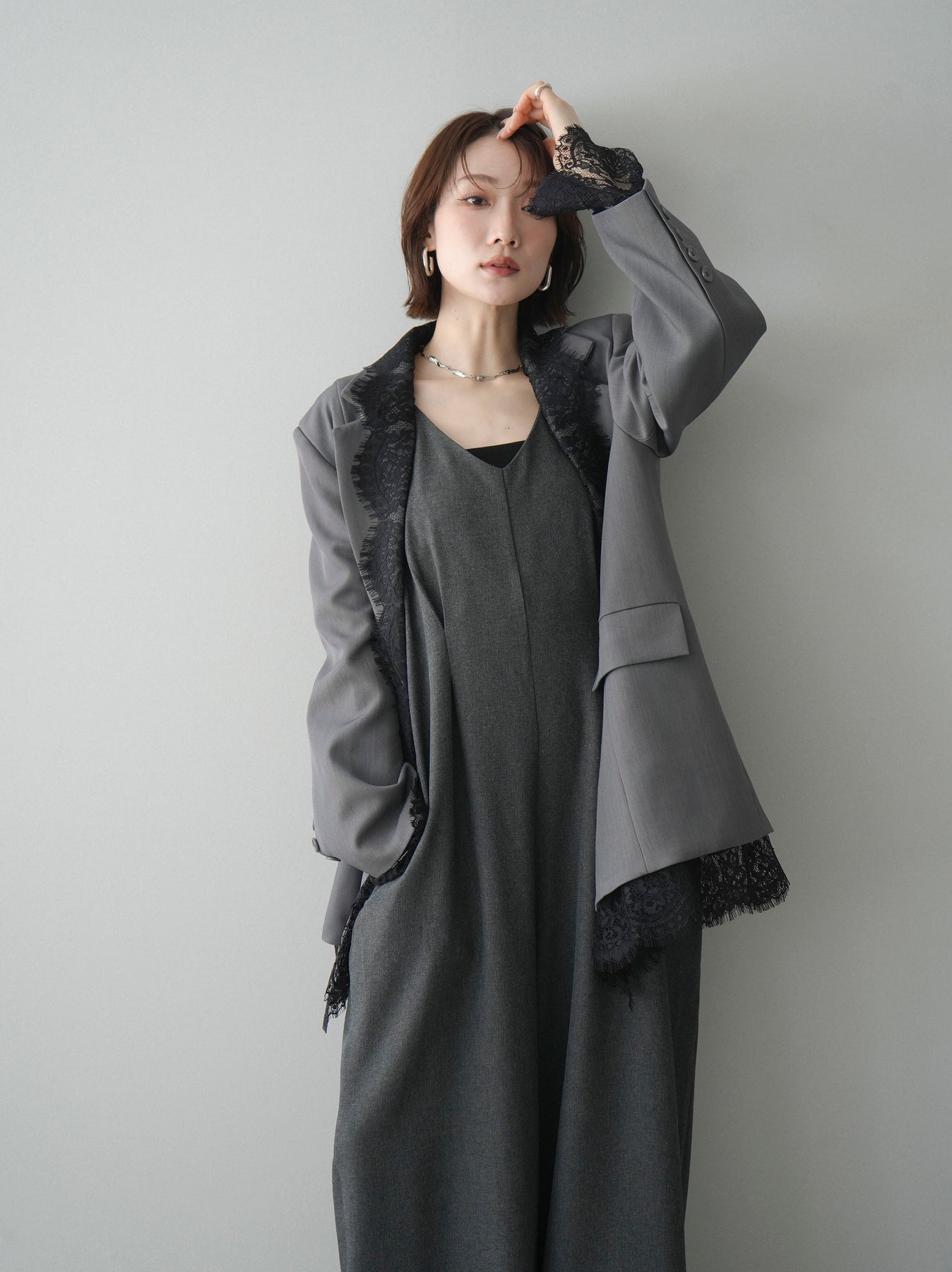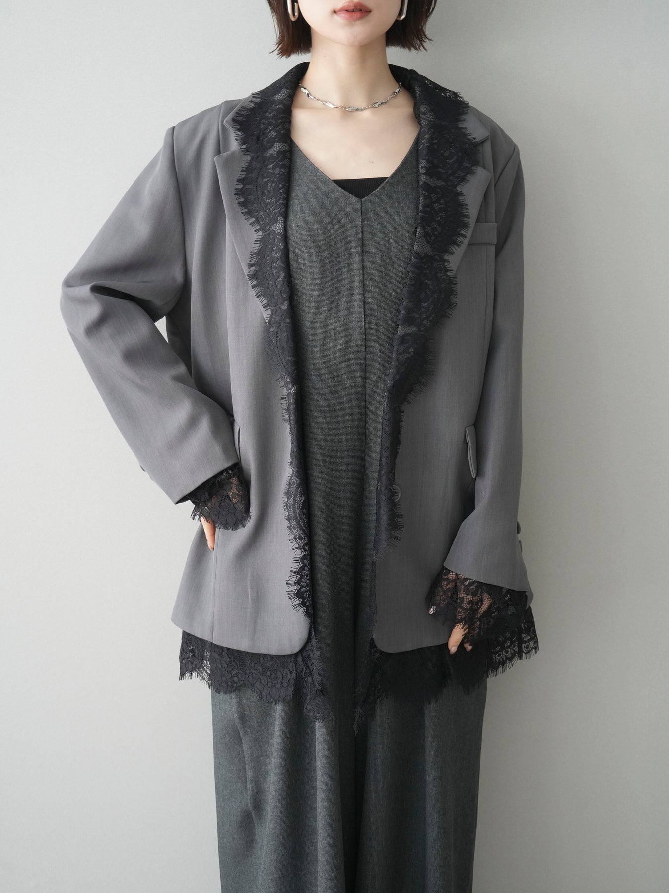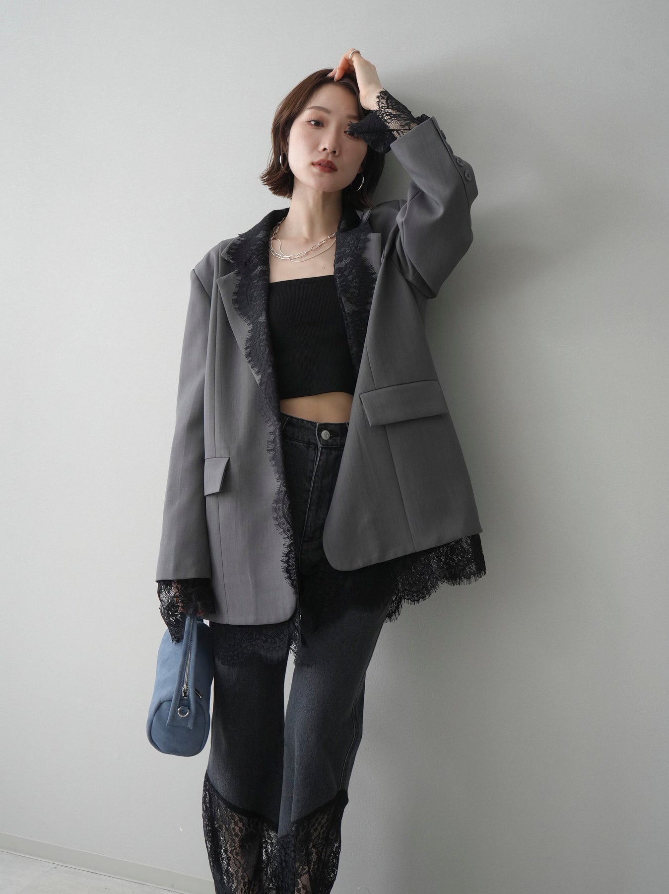 クラシカルなテーラードジャケットに繊細なレースをドッキングした、存在感のあるオーバージャケット。襟元や裾から覗くレースが上品な華やかさを添え、マニッシュなシルエットとのコントラストが洗練された印象を演出します。ゆとりのあるオーバーサイズで抜け感をプラスし、羽織るだけでこなれたスタイリングに。ヒップにかかる丈感で体のラインをさりげなくカバーし、パンツスタイルにもスカートスタイルにも好相性です。デイリーコーデを格上げしてくれる、主役級の一着です。 ※ボトムス、キャミソール(インナー)以外の商品は一律でインナーは付属していません。