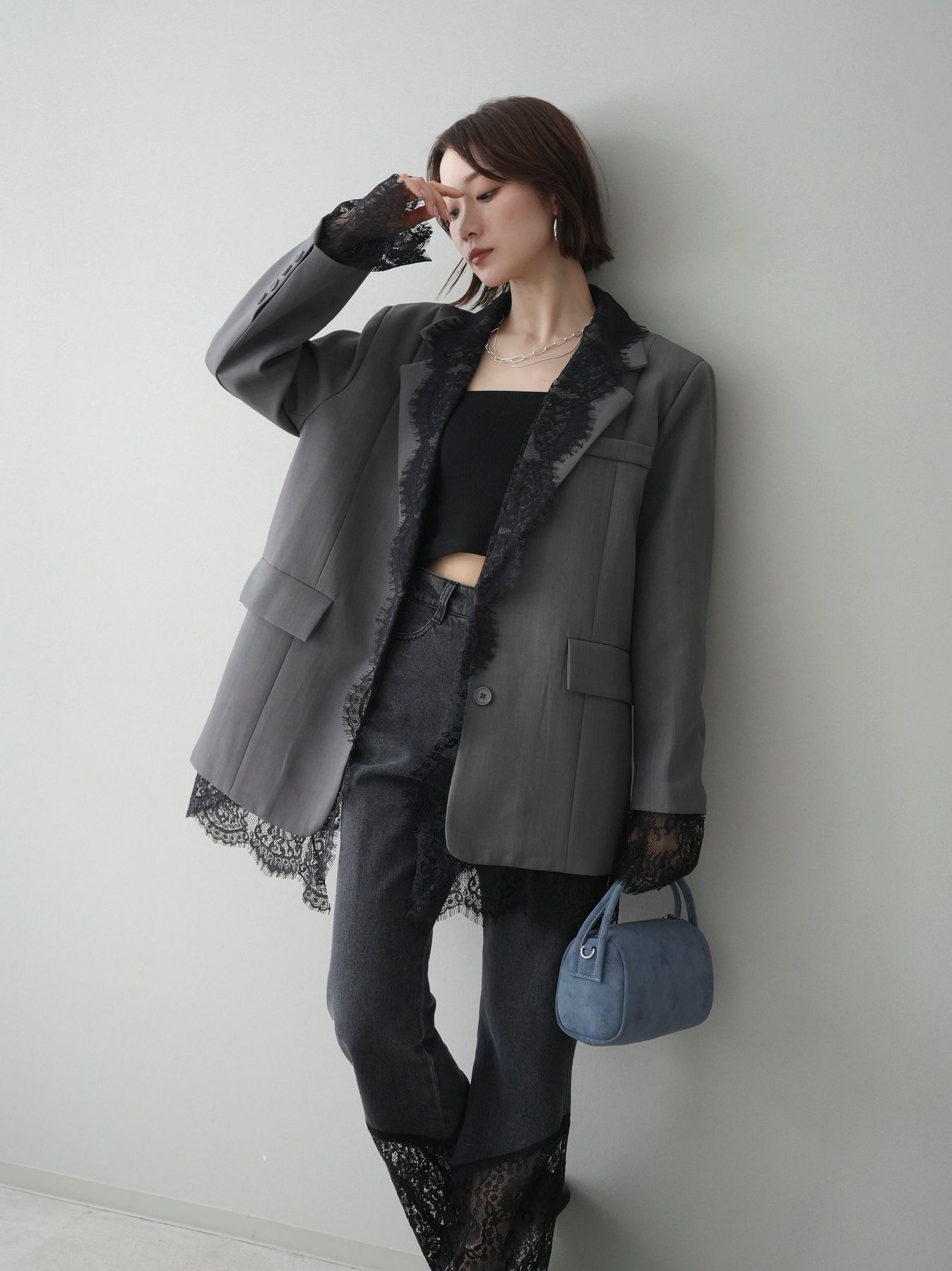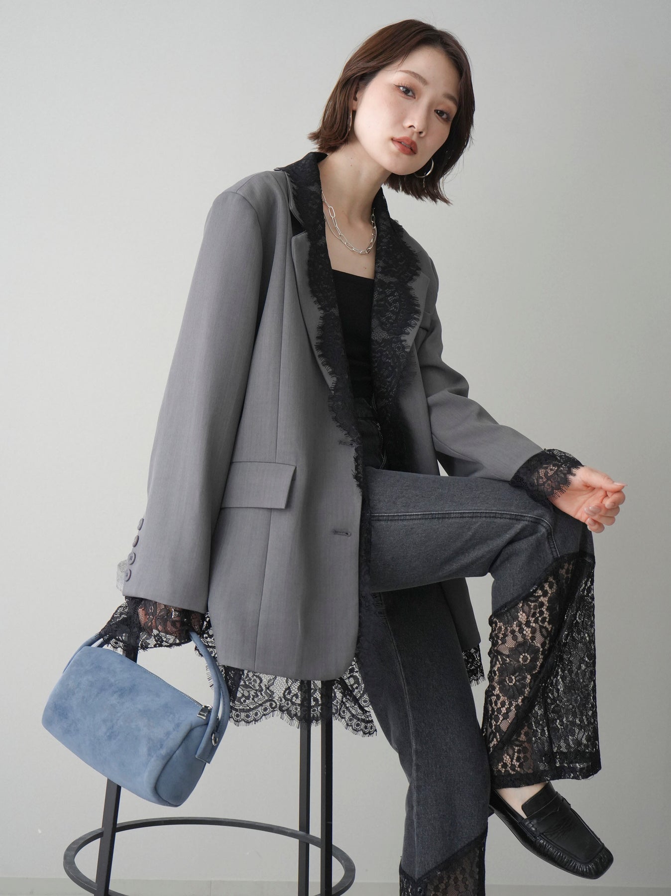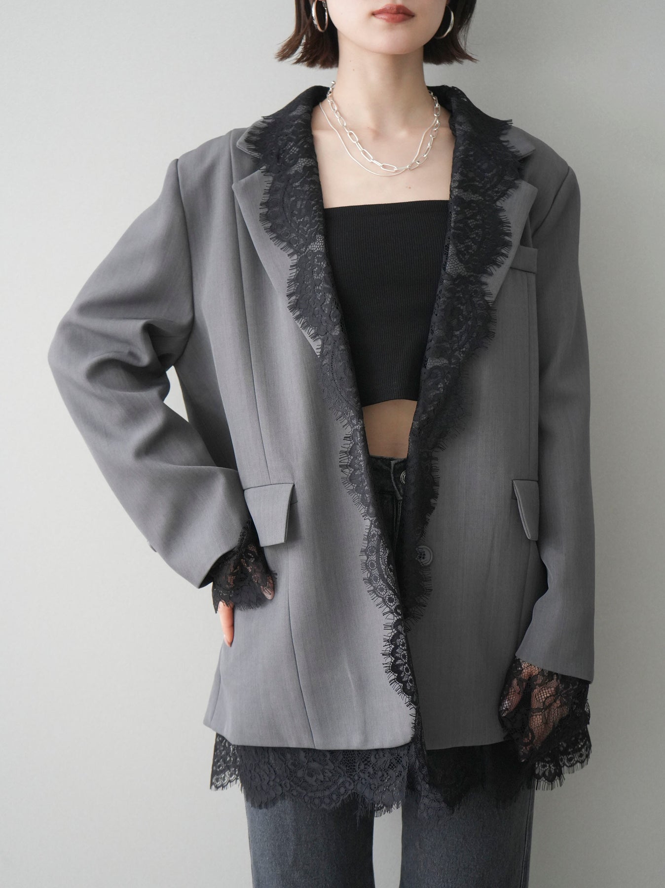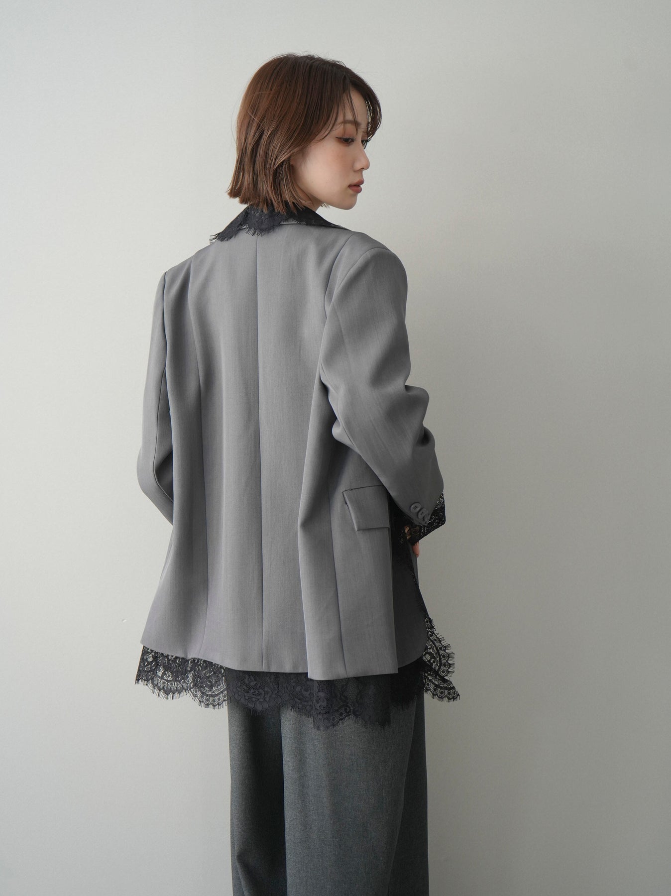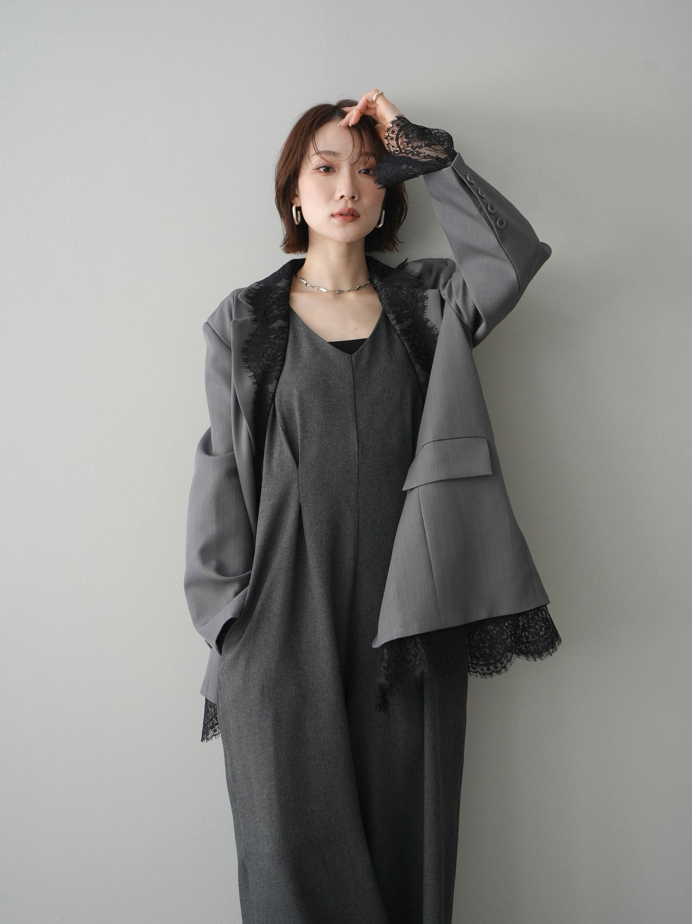 クラシカルなテーラードジャケットに繊細なレースをドッキングした、存在感のあるオーバージャケット。襟元や裾から覗くレースが上品な華やかさを添え、マニッシュなシルエットとのコントラストが洗練された印象を演出します。ゆとりのあるオーバーサイズで抜け感をプラスし、羽織るだけでこなれたスタイリングに。ヒップにかかる丈感で体のラインをさりげなくカバーし、パンツスタイルにもスカートスタイルにも好相性です。デイリーコーデを格上げしてくれる、主役級の一着です。 ※ボトムス、キャミソール(インナー)以外の商品は一律でインナーは付属していません。