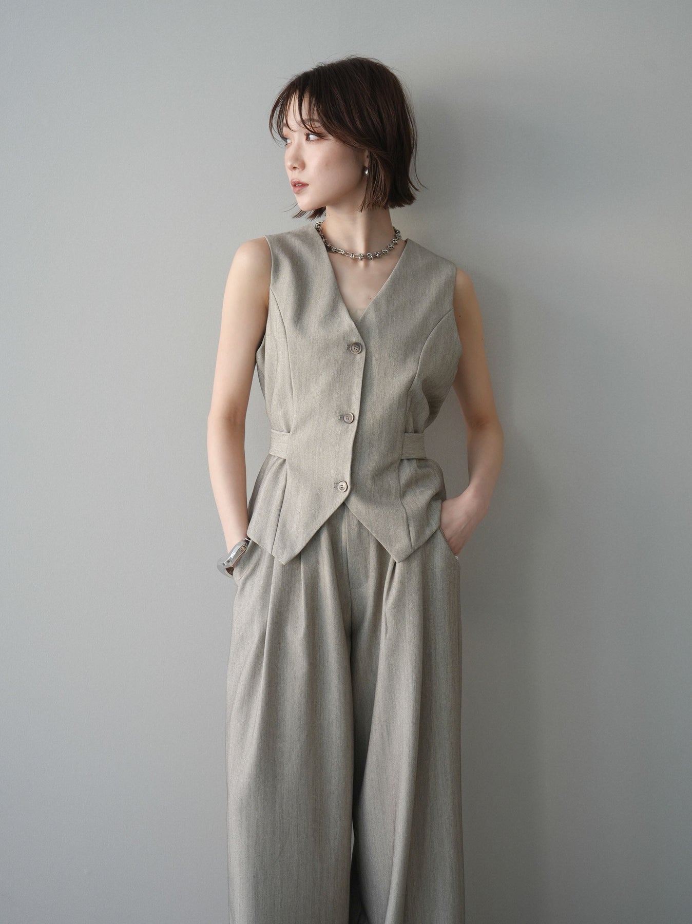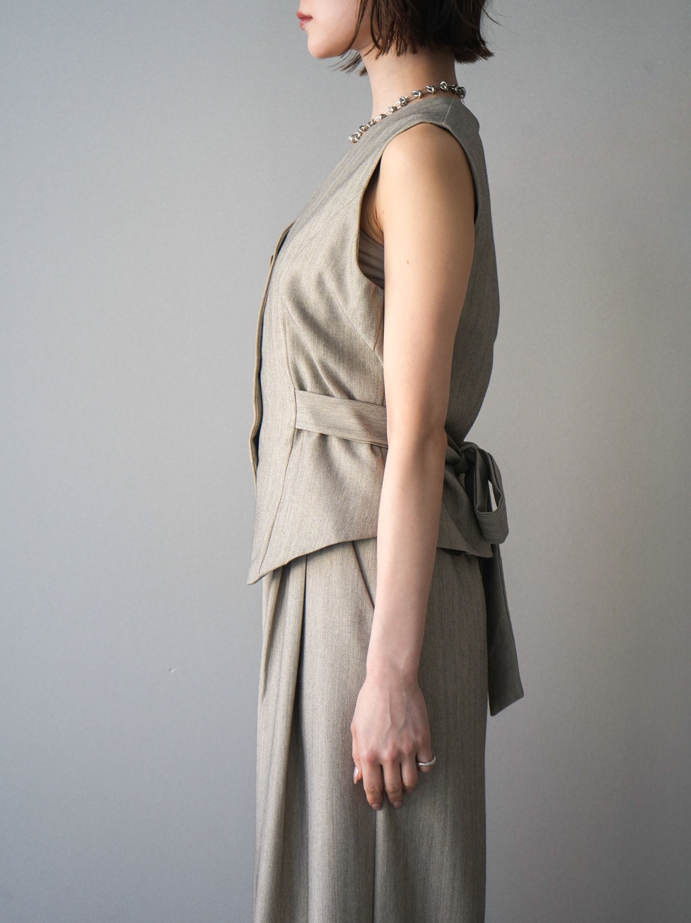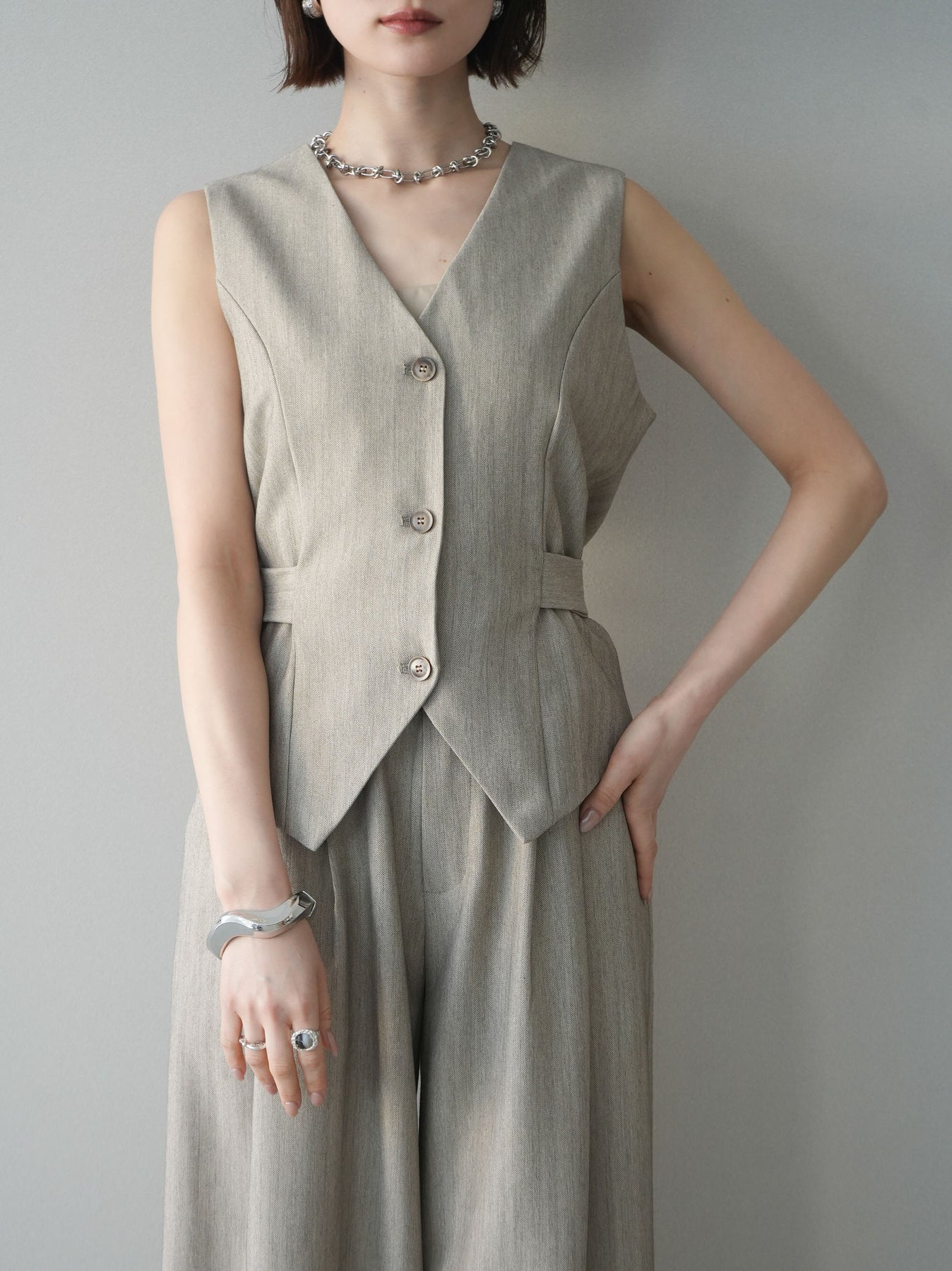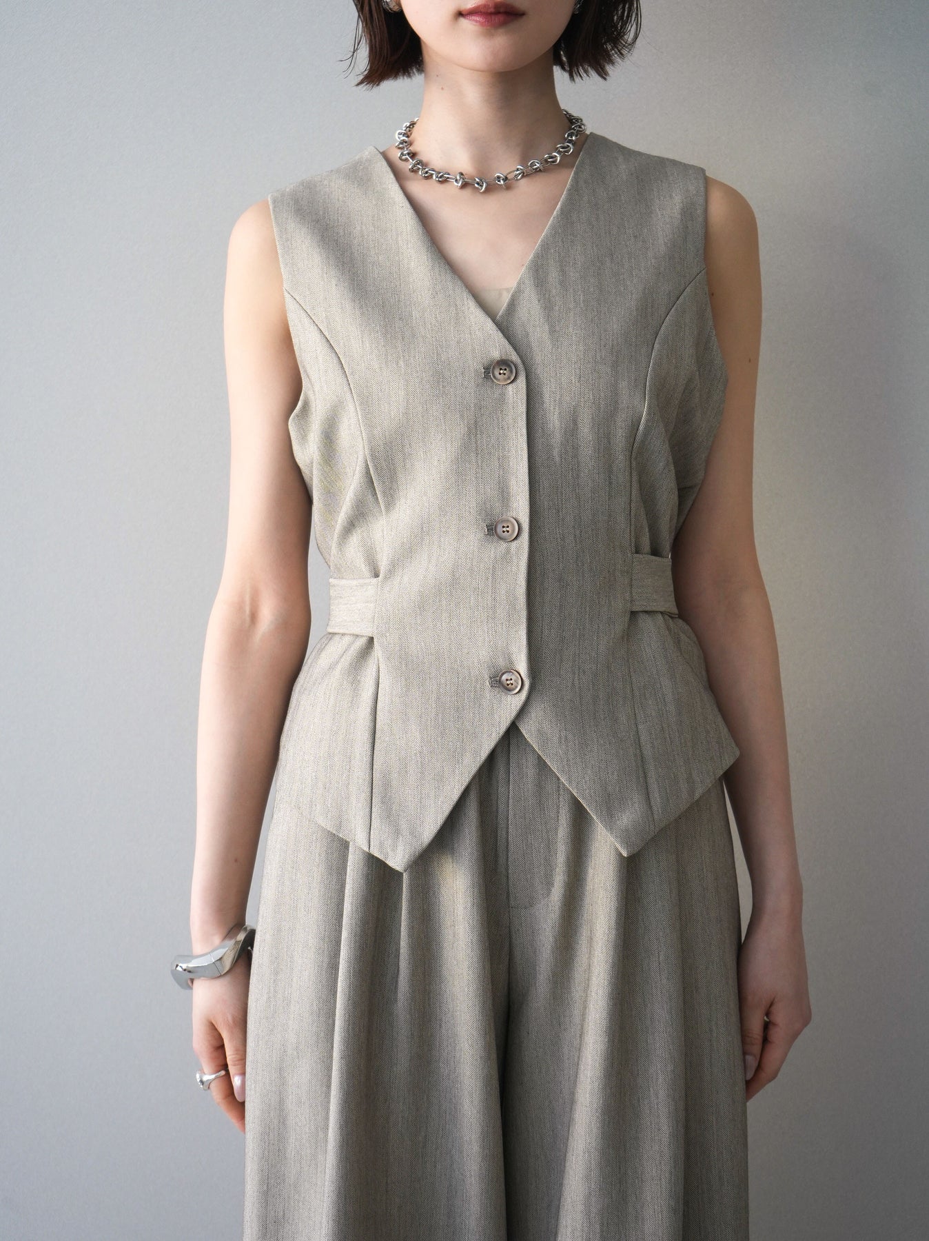 上品なヘリンボーン生地を使用した、サイド切替デザインのベスト。すっきりとしたVネックラインが顔まわりをシャープに見せ、レイヤードスタイルに取り入れやすい一枚です。サイドに施した切替とベルトディテールが立体感を生み、自然とメリハリのあるシルエットを演出。フロントボタンがさりげないアクセントとなり、シンプルながらも存在感のある仕上がりに。シャツやカットソー、シアートップスとの重ね着はもちろん、同素材のボトムと合わせたセットアップ風コーデもおすすめ。オンスタイルからデイリーまで幅広く活躍するアイテムです。 ※ボトムス、キャミソール(インナー)以外の商品は一律でインナーは付属していません。