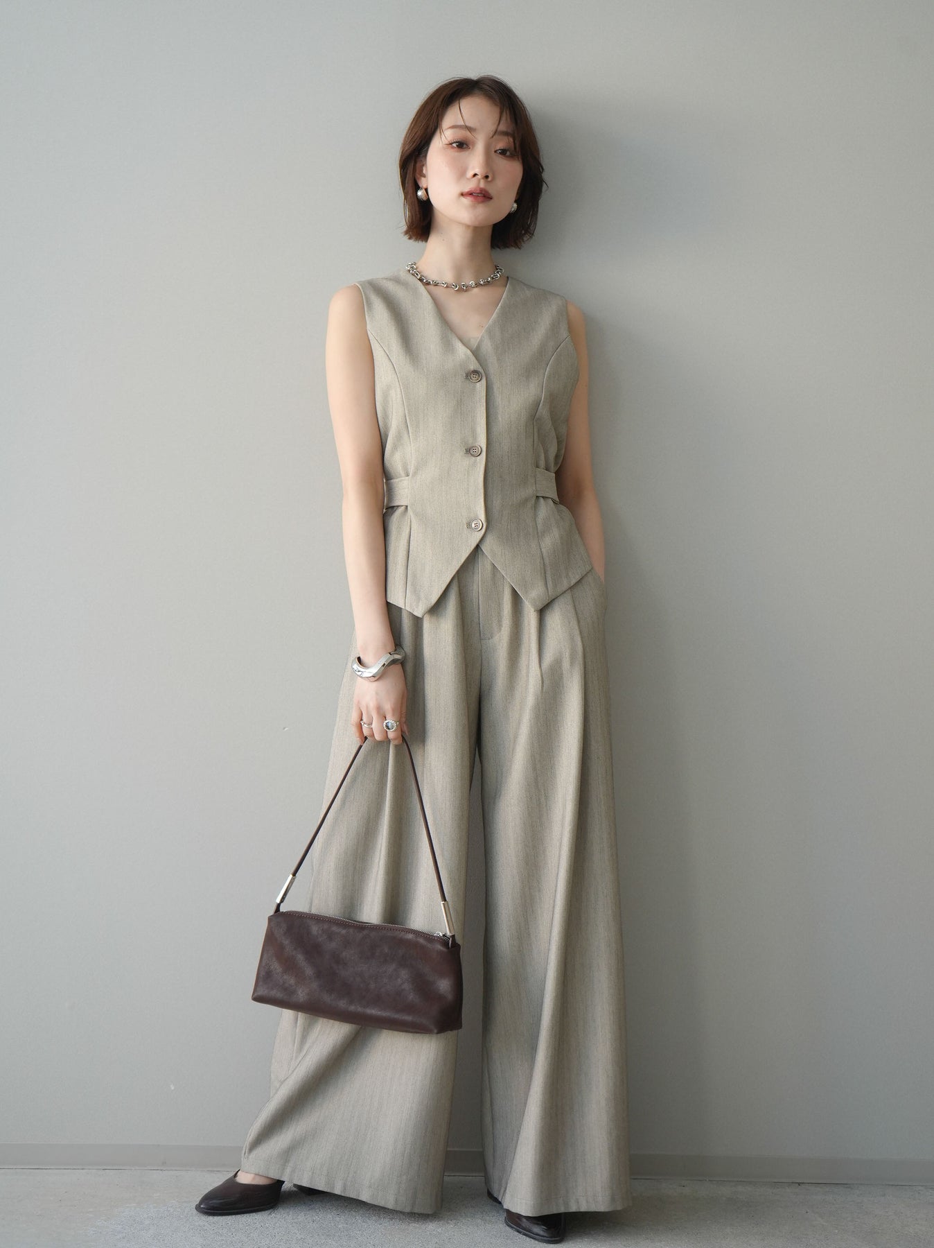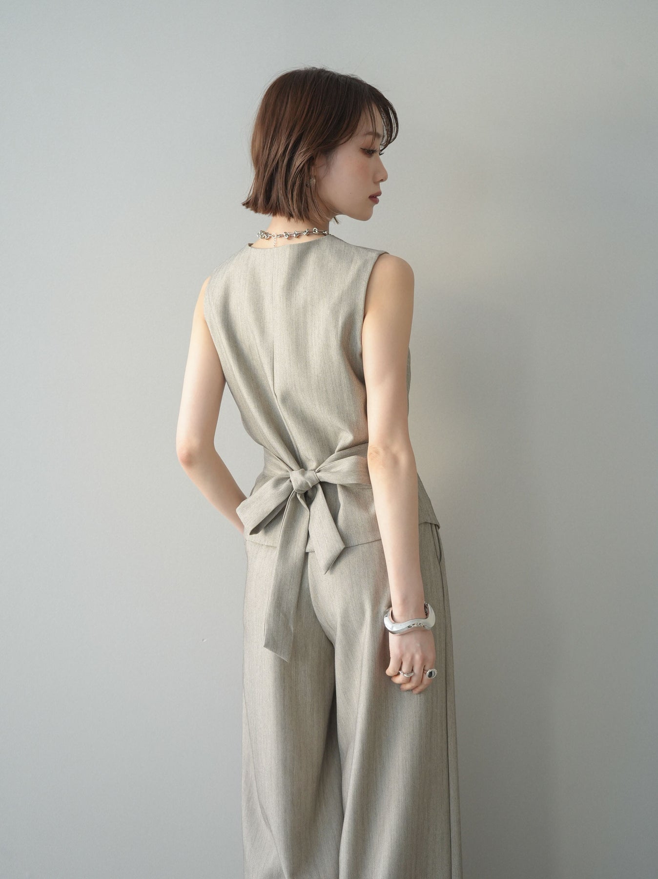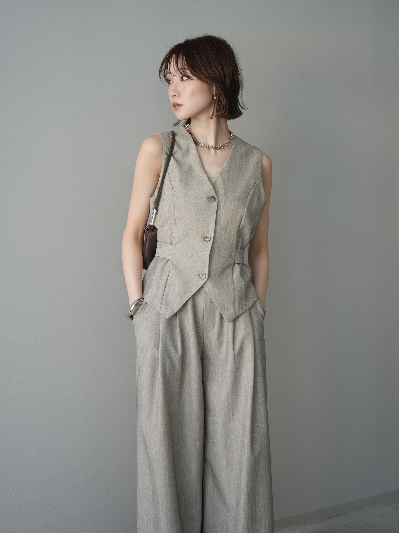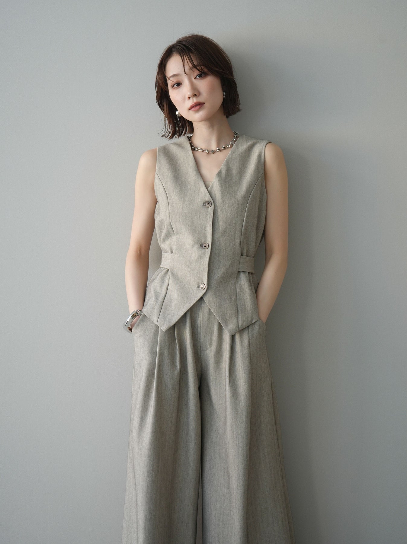 上品なヘリンボーン生地を使用した、サイド切替デザインのベスト。すっきりとしたVネックラインが顔まわりをシャープに見せ、レイヤードスタイルに取り入れやすい一枚です。サイドに施した切替とベルトディテールが立体感を生み、自然とメリハリのあるシルエットを演出。フロントボタンがさりげないアクセントとなり、シンプルながらも存在感のある仕上がりに。シャツやカットソー、シアートップスとの重ね着はもちろん、同素材のボトムと合わせたセットアップ風コーデもおすすめ。オンスタイルからデイリーまで幅広く活躍するアイテムです。 ※ボトムス、キャミソール(インナー)以外の商品は一律でインナーは付属していません。