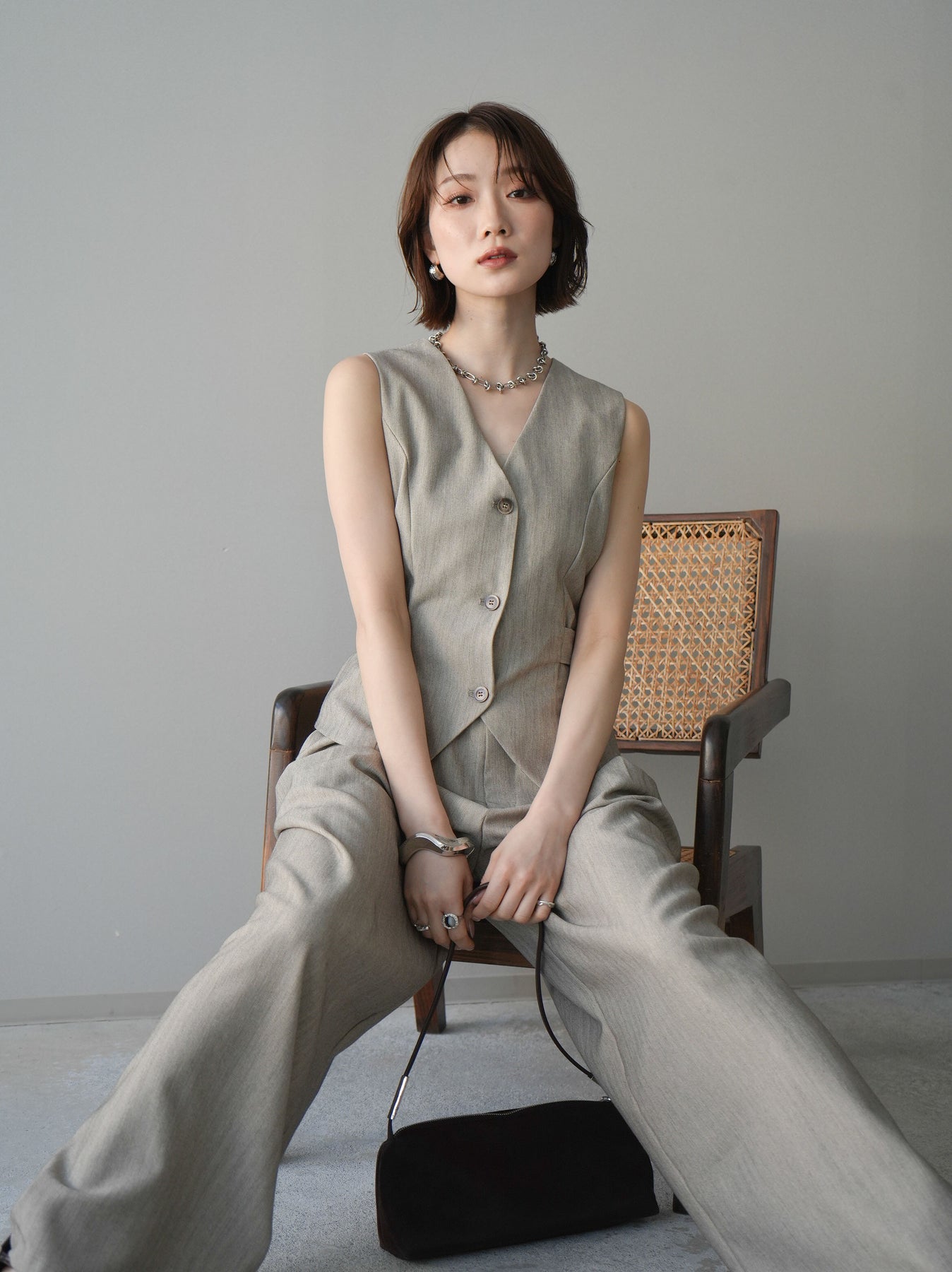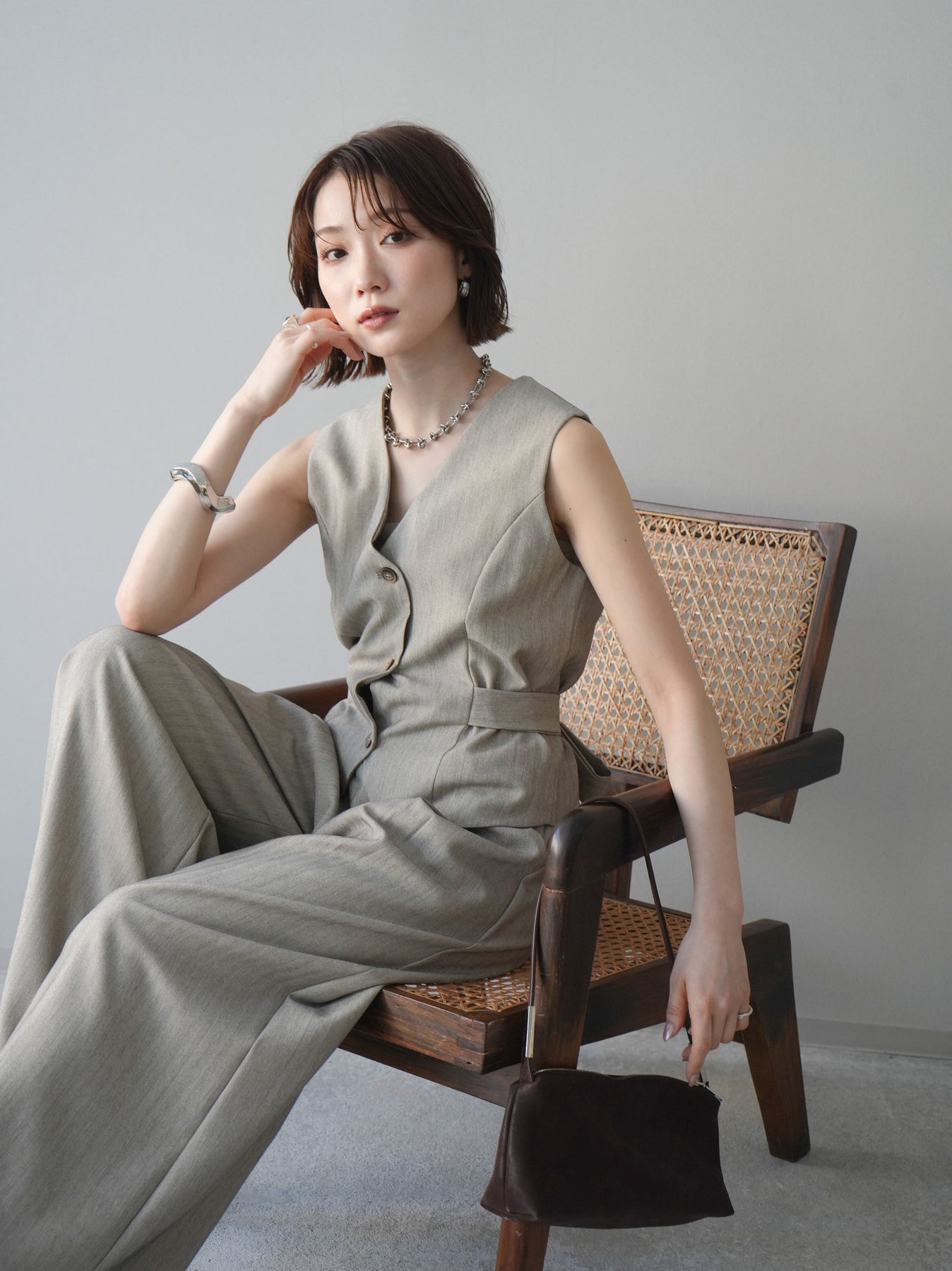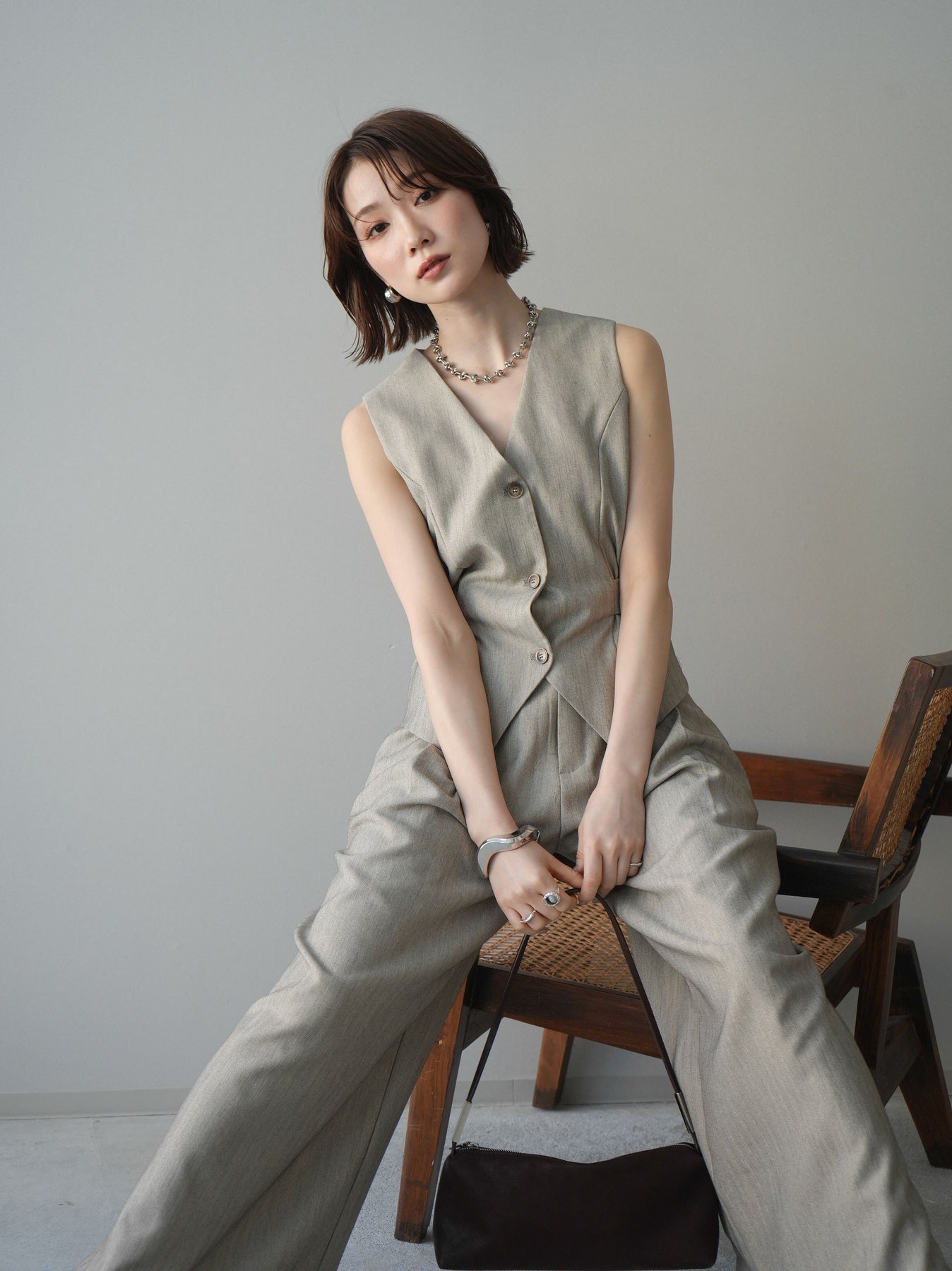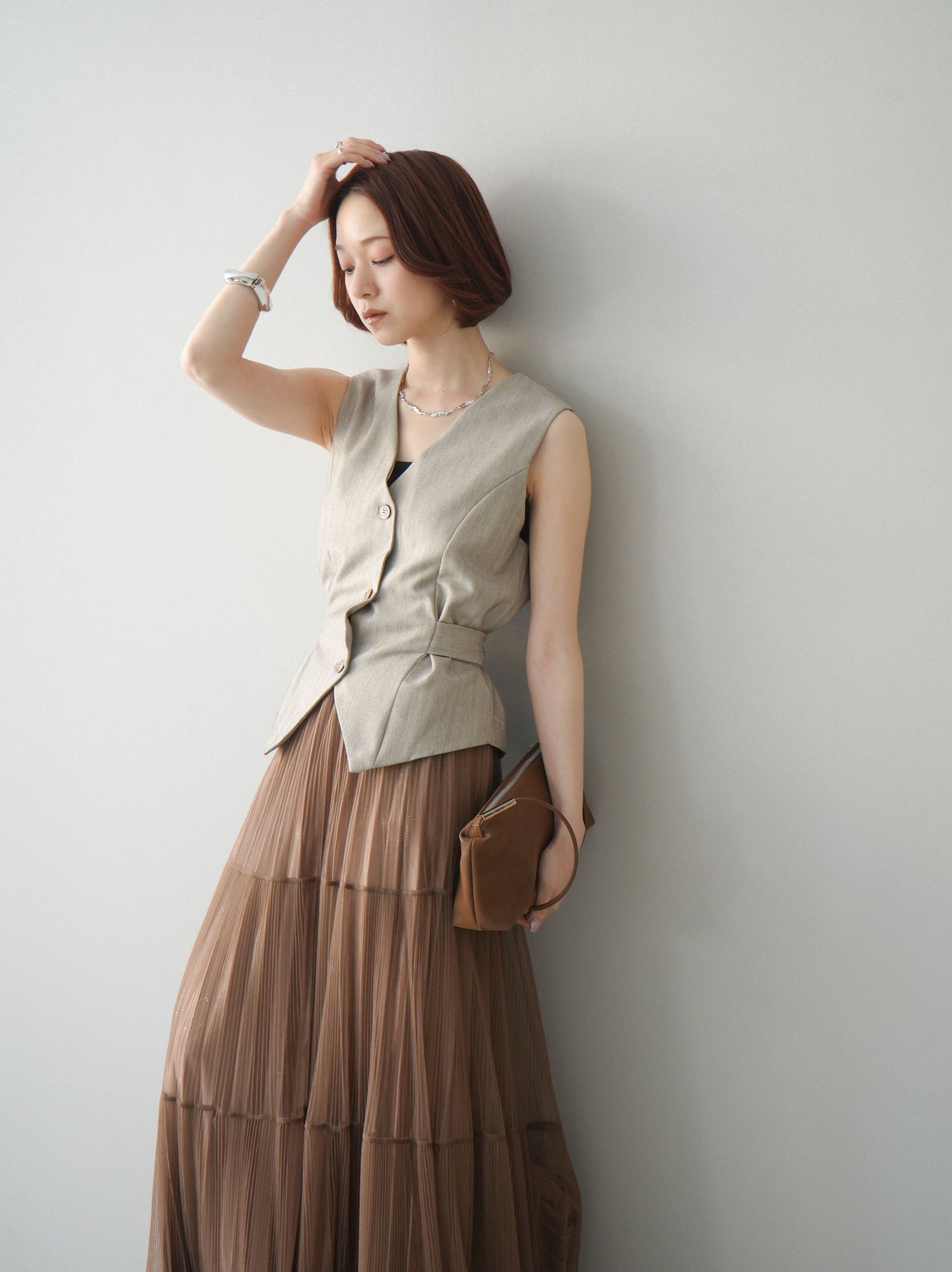 上品なヘリンボーン生地を使用した、サイド切替デザインのベスト。すっきりとしたVネックラインが顔まわりをシャープに見せ、レイヤードスタイルに取り入れやすい一枚です。サイドに施した切替とベルトディテールが立体感を生み、自然とメリハリのあるシルエットを演出。フロントボタンがさりげないアクセントとなり、シンプルながらも存在感のある仕上がりに。シャツやカットソー、シアートップスとの重ね着はもちろん、同素材のボトムと合わせたセットアップ風コーデもおすすめ。オンスタイルからデイリーまで幅広く活躍するアイテムです。 ※ボトムス、キャミソール(インナー)以外の商品は一律でインナーは付属していません。