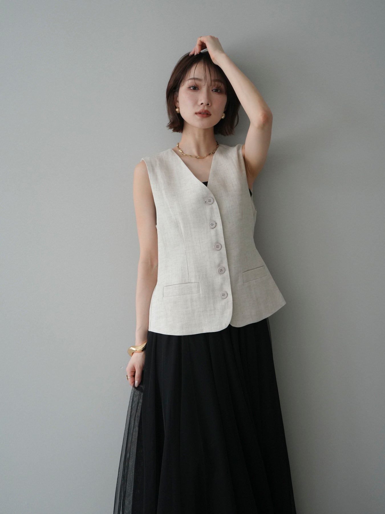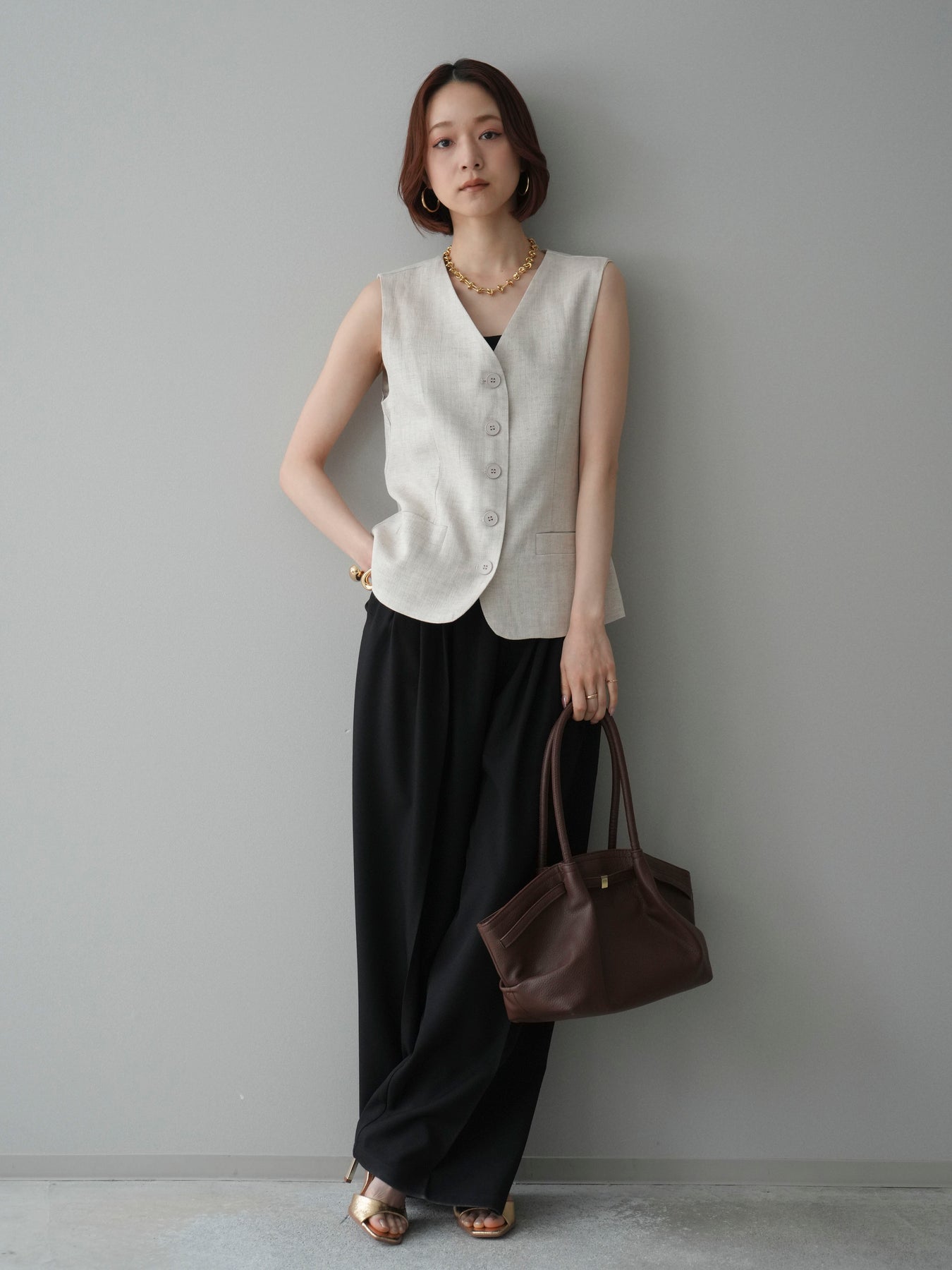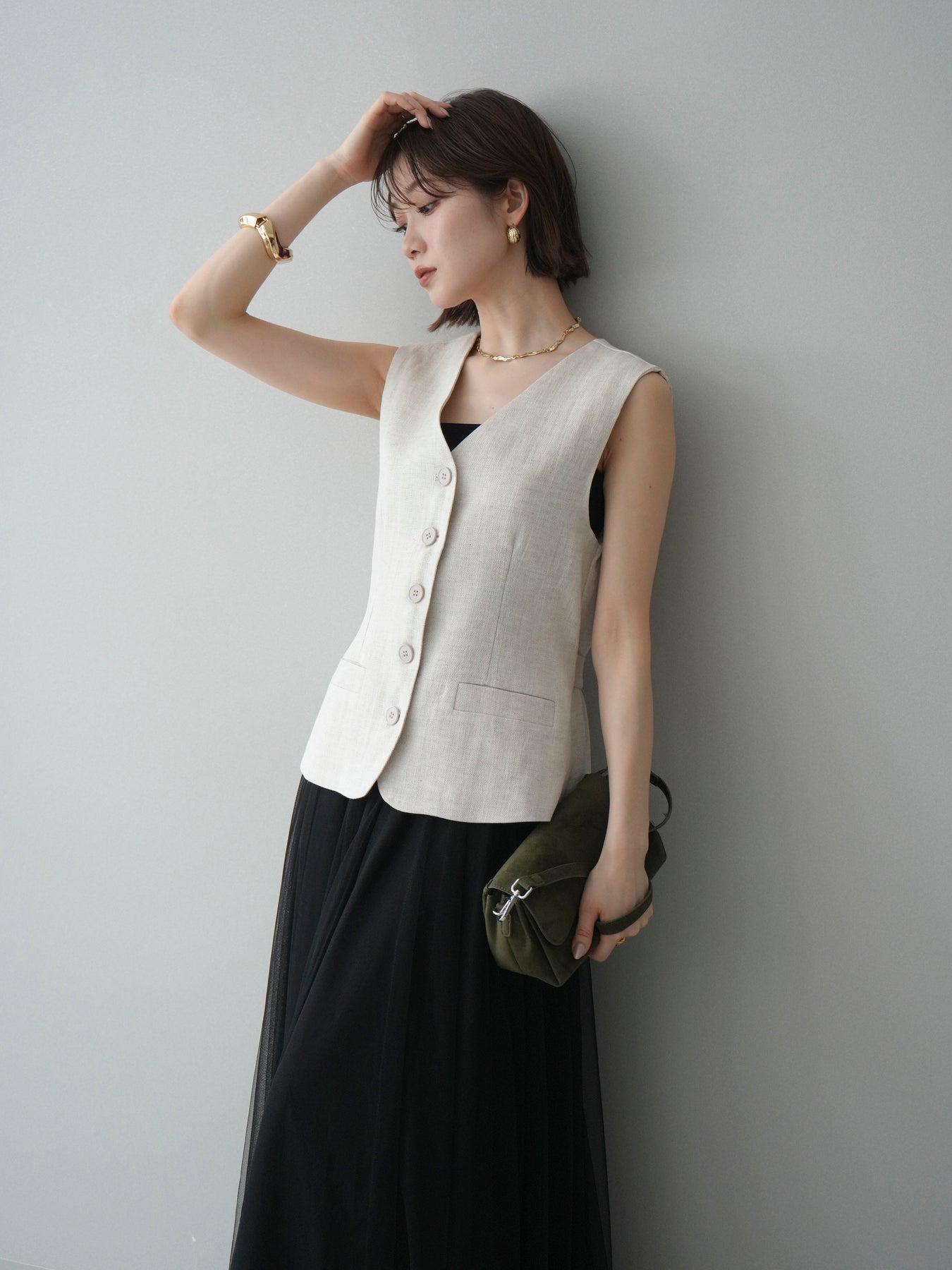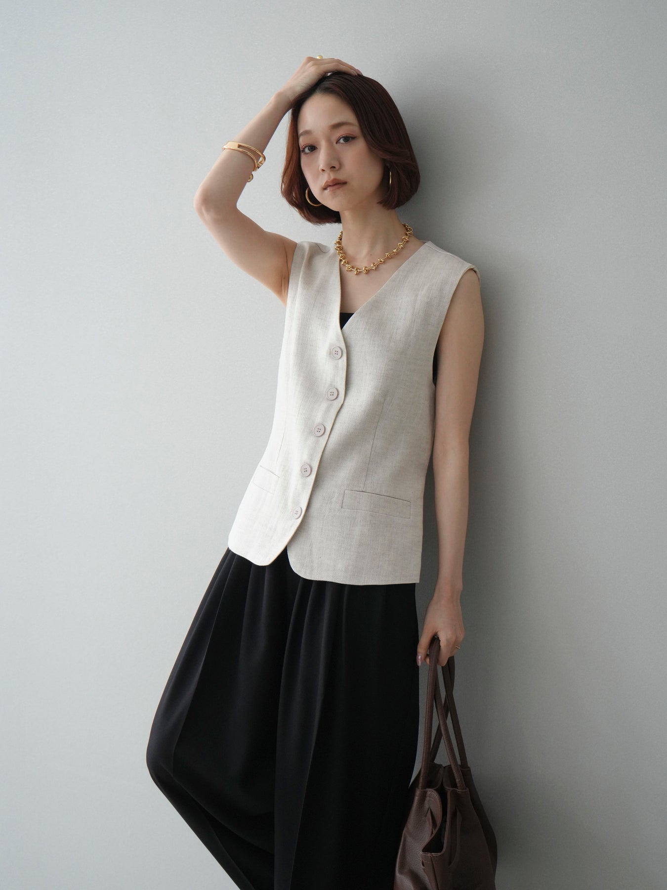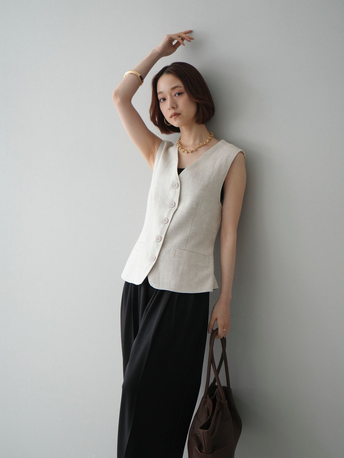 リネンライクな風合いが魅力のVネックジレ。さらっとした質感と程よいハリ感で、きちんと感がありながらも軽やかな印象に仕上げました。深めのVネックが縦ラインを強調し、すっきりとしたシルエットを演出。フロントボタンとポケットディテールがアクセントになり、シンプルなトップスに重ねるだけで洗練されたスタイリングが完成します。パンツにもスカートにも合わせやすく、シーズンレスで活躍する一着です。