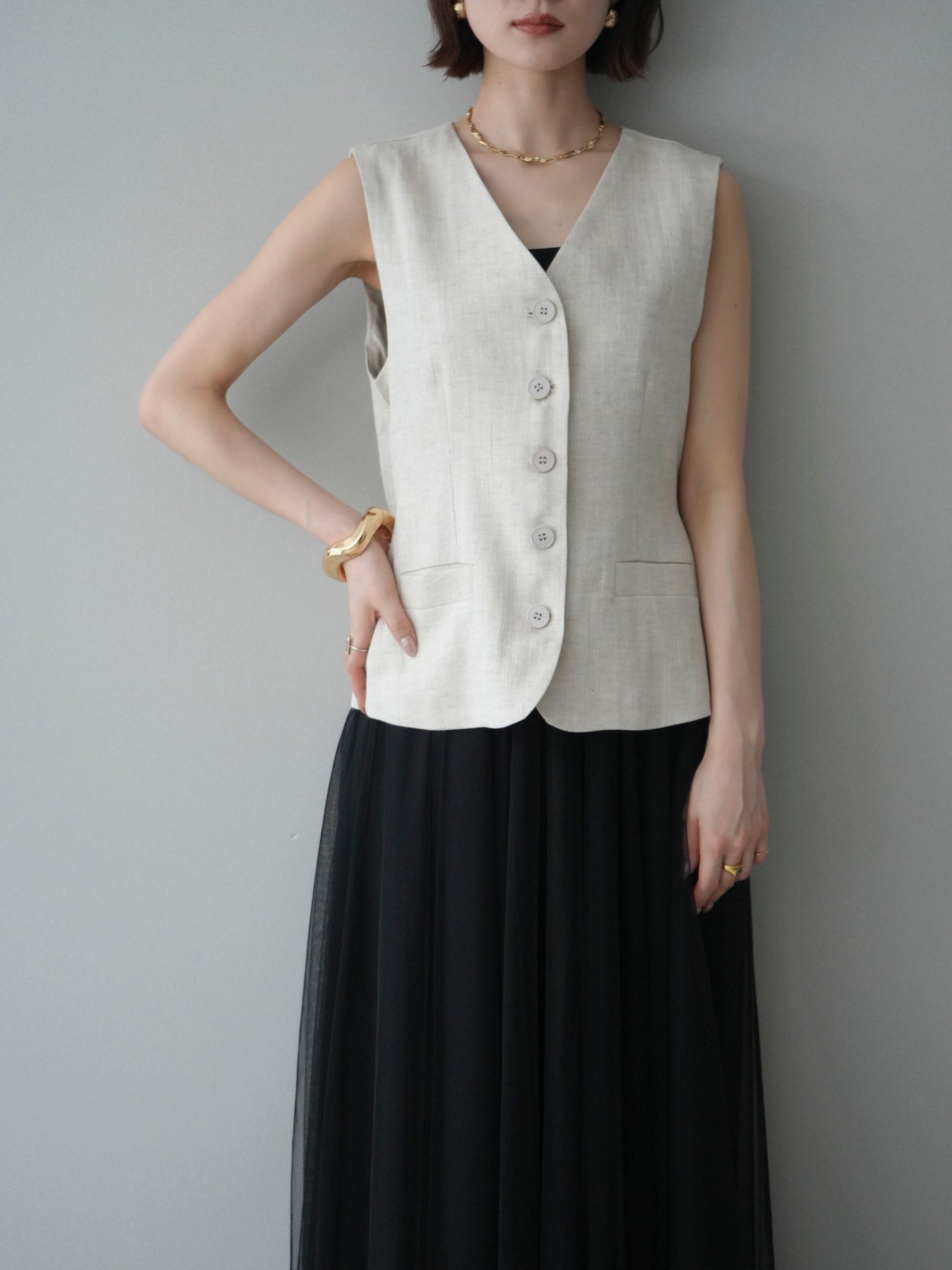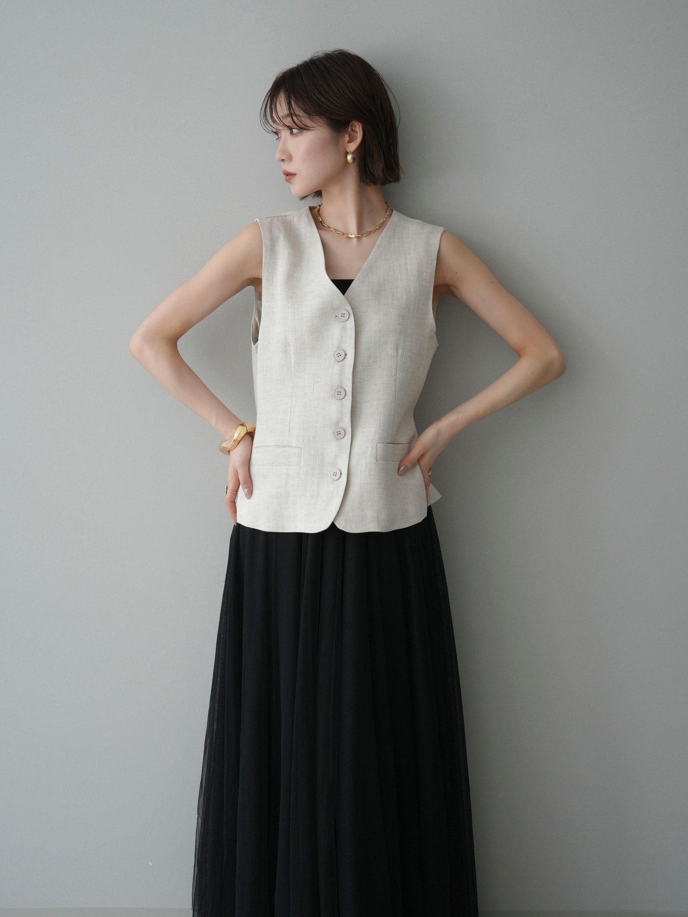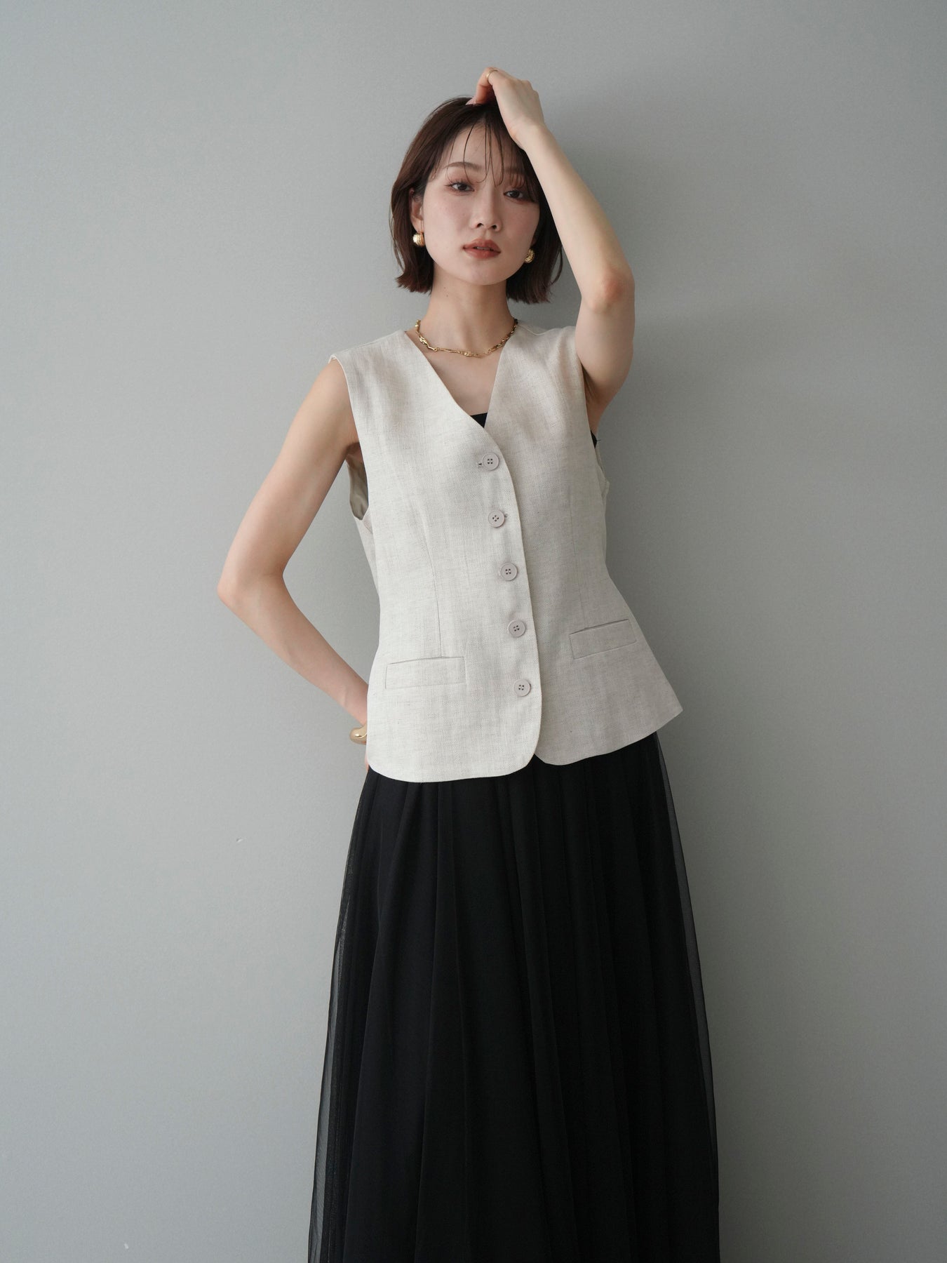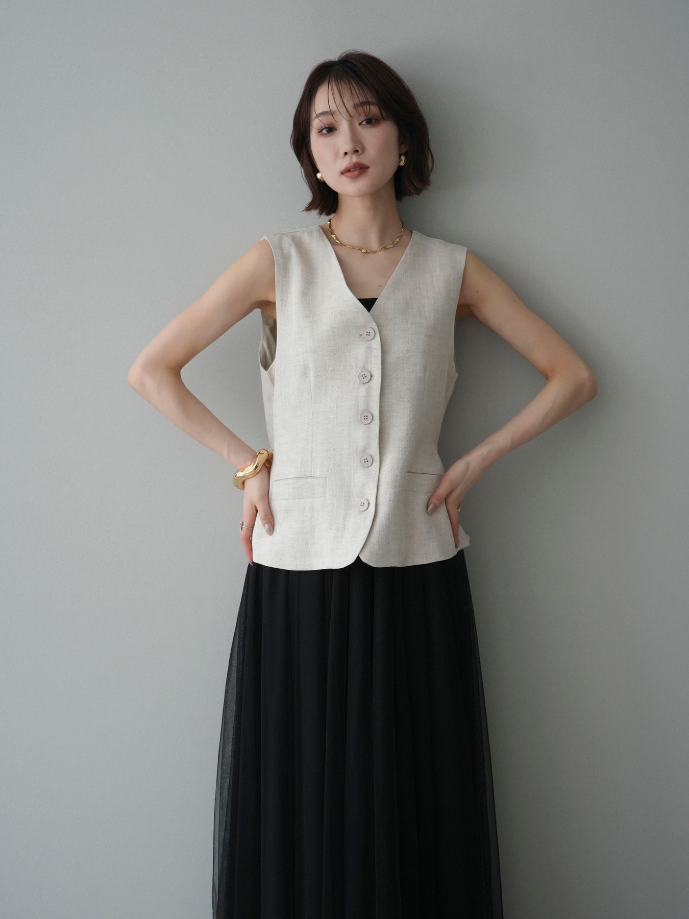 リネンライクな風合いが魅力のVネックジレ。さらっとした質感と程よいハリ感で、きちんと感がありながらも軽やかな印象に仕上げました。深めのVネックが縦ラインを強調し、すっきりとしたシルエットを演出。フロントボタンとポケットディテールがアクセントになり、シンプルなトップスに重ねるだけで洗練されたスタイリングが完成します。パンツにもスカートにも合わせやすく、シーズンレスで活躍する一着です。