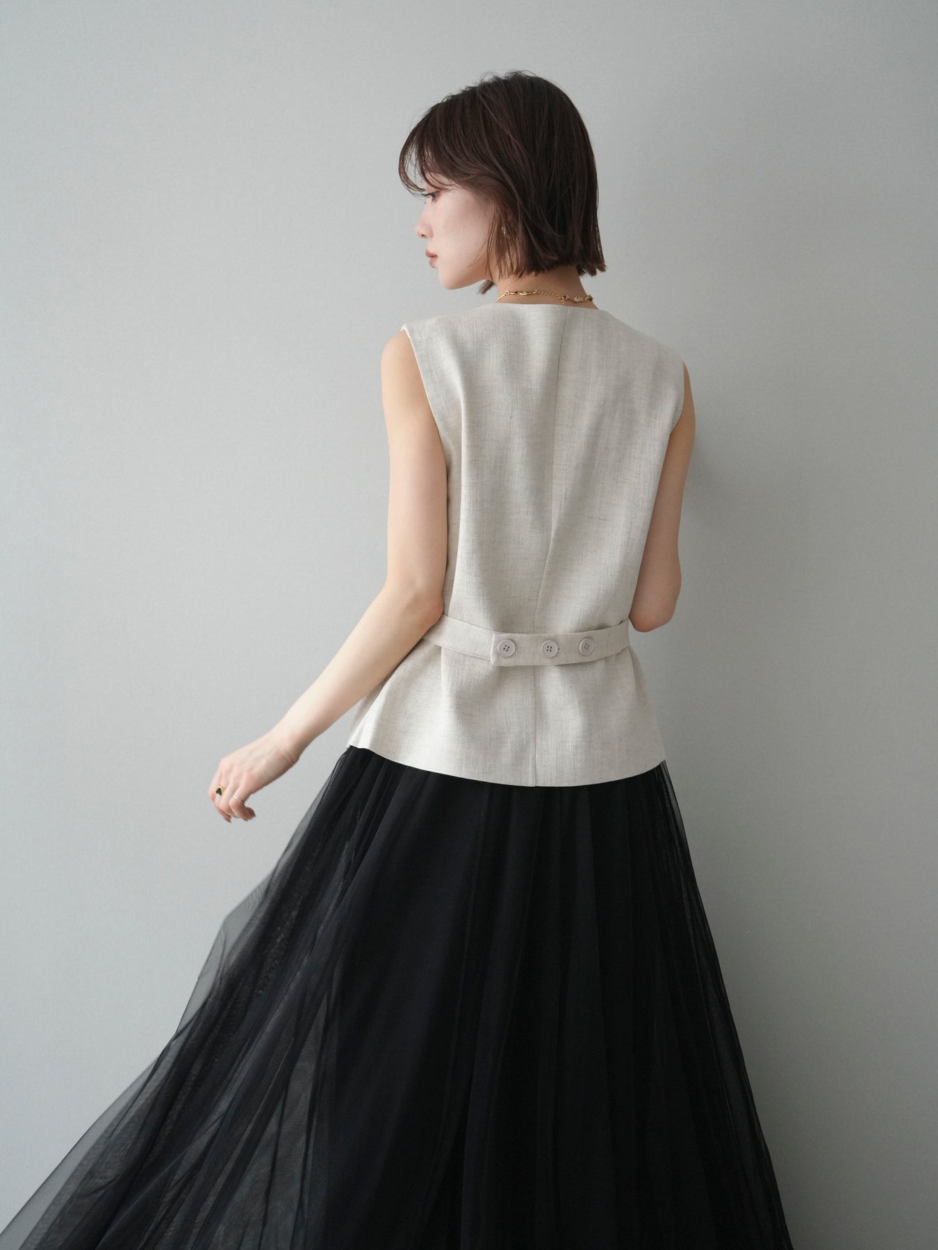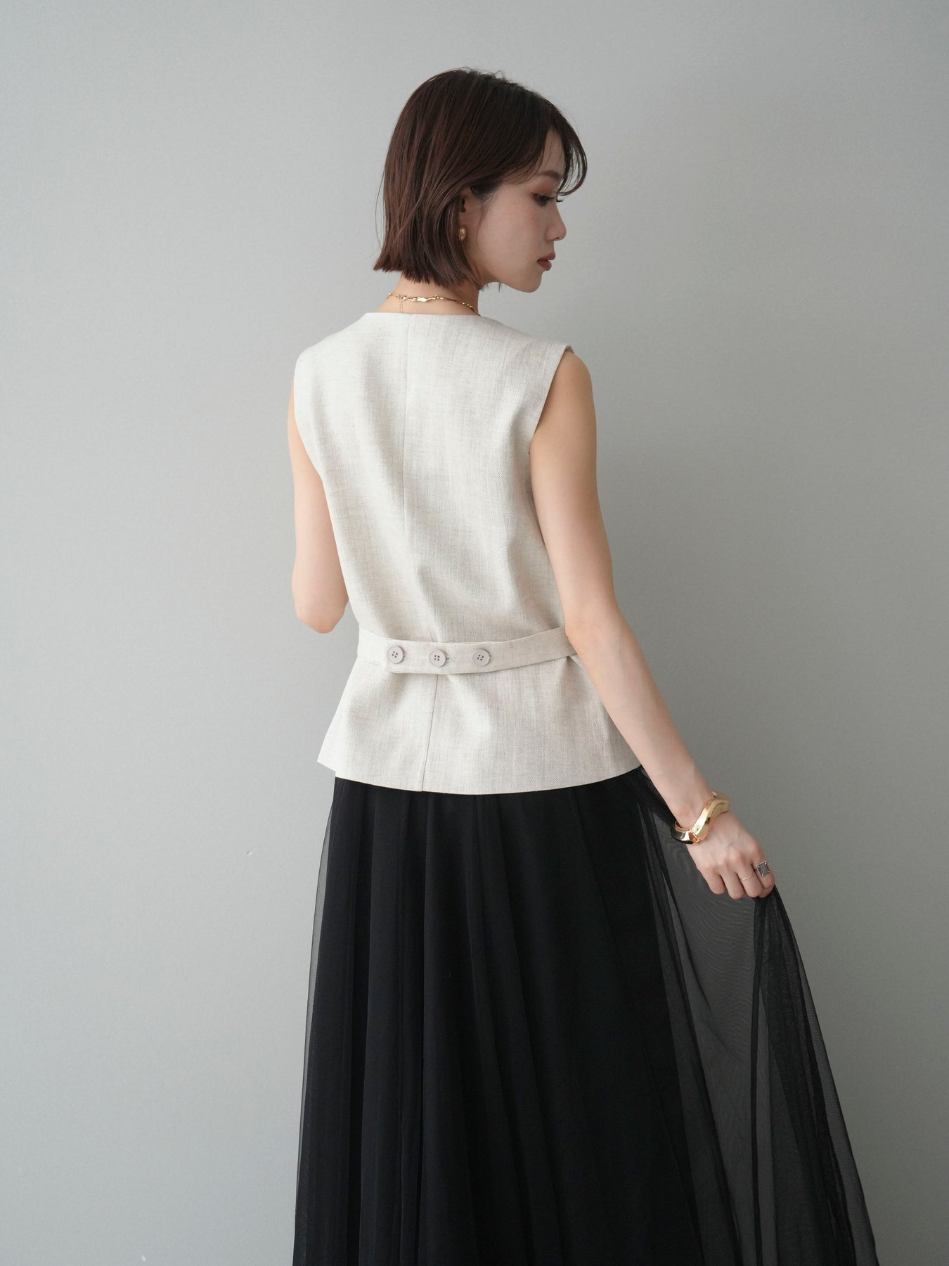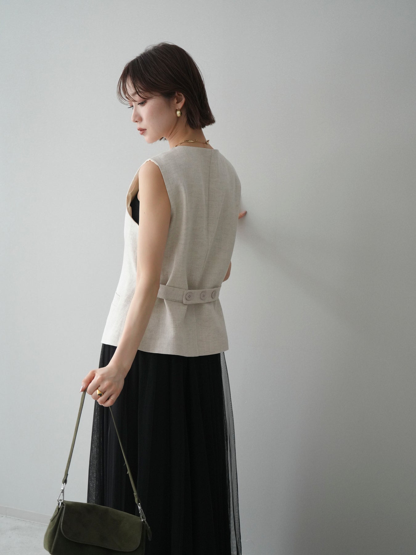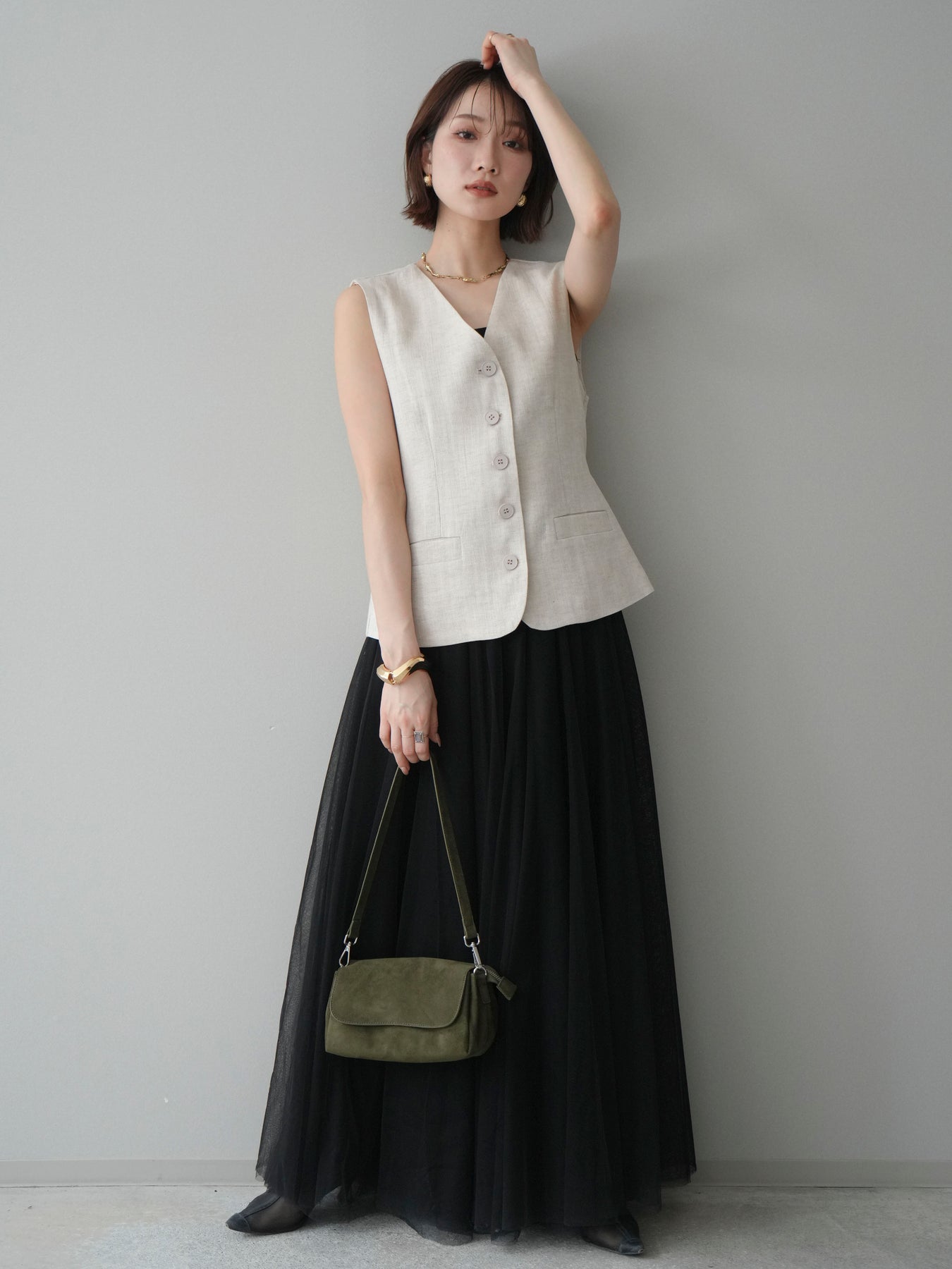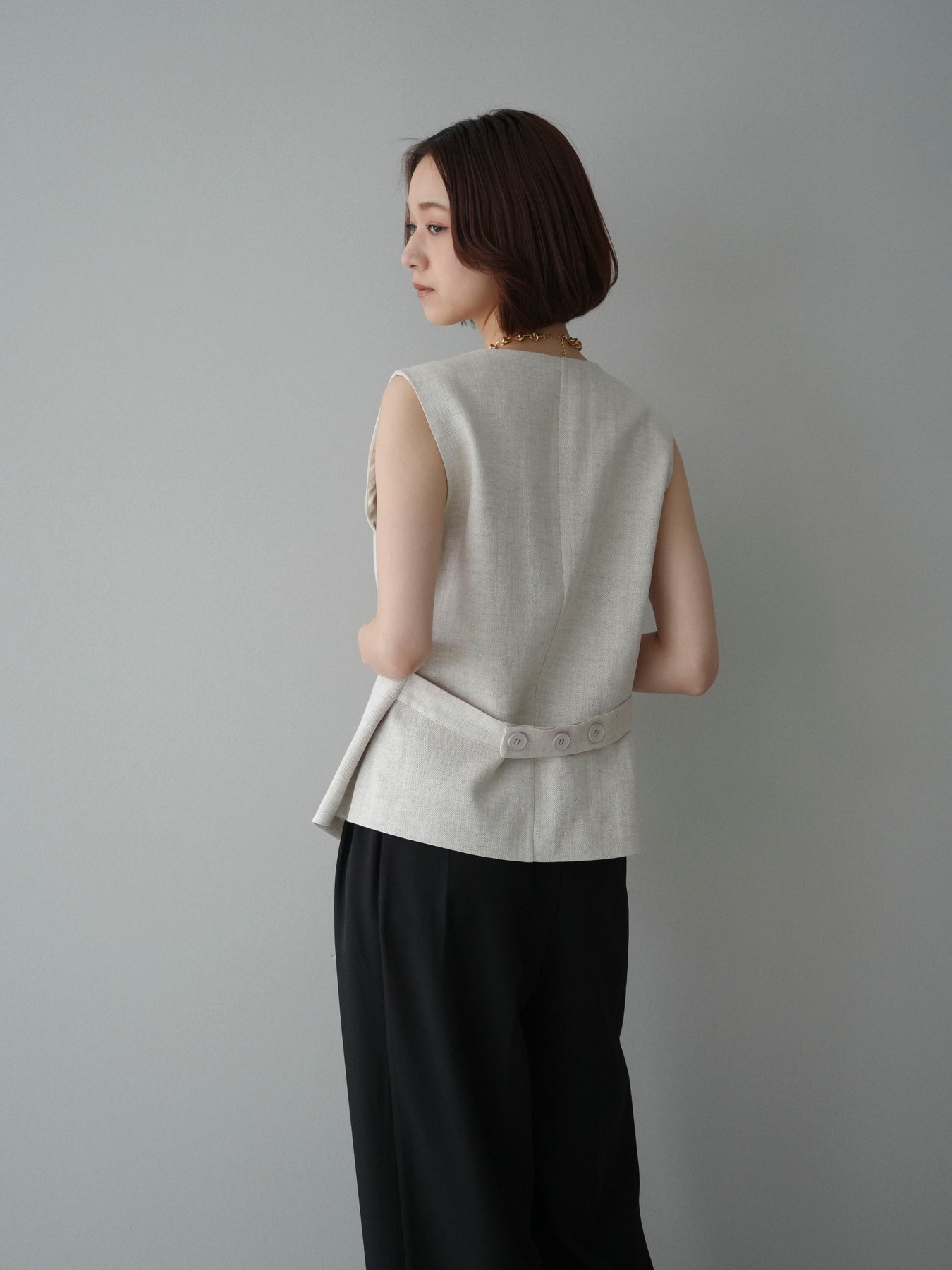 リネンライクな風合いが魅力のVネックジレ。さらっとした質感と程よいハリ感で、きちんと感がありながらも軽やかな印象に仕上げました。深めのVネックが縦ラインを強調し、すっきりとしたシルエットを演出。フロントボタンとポケットディテールがアクセントになり、シンプルなトップスに重ねるだけで洗練されたスタイリングが完成します。パンツにもスカートにも合わせやすく、シーズンレスで活躍する一着です。