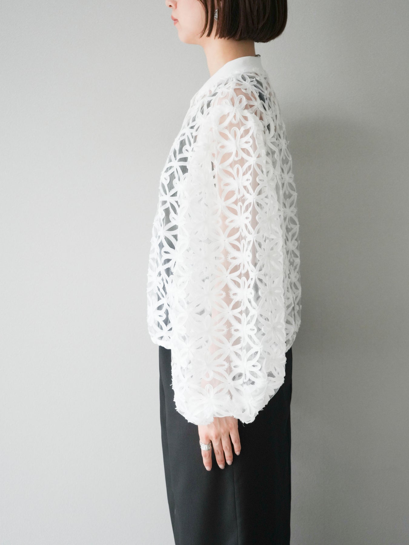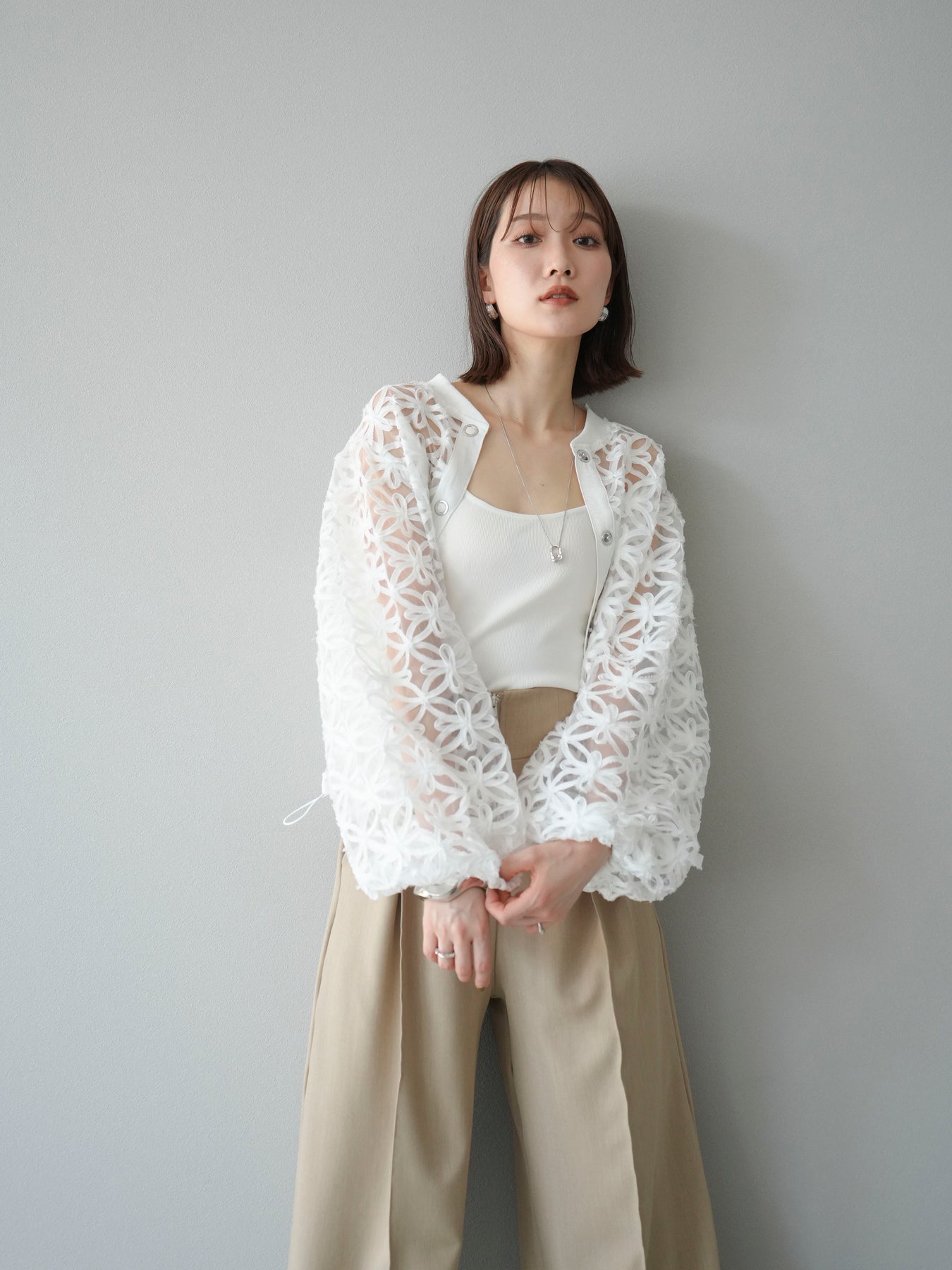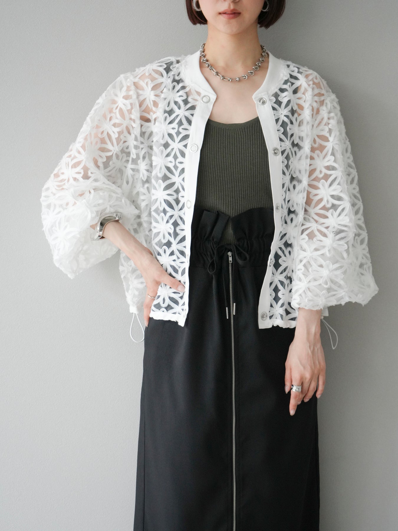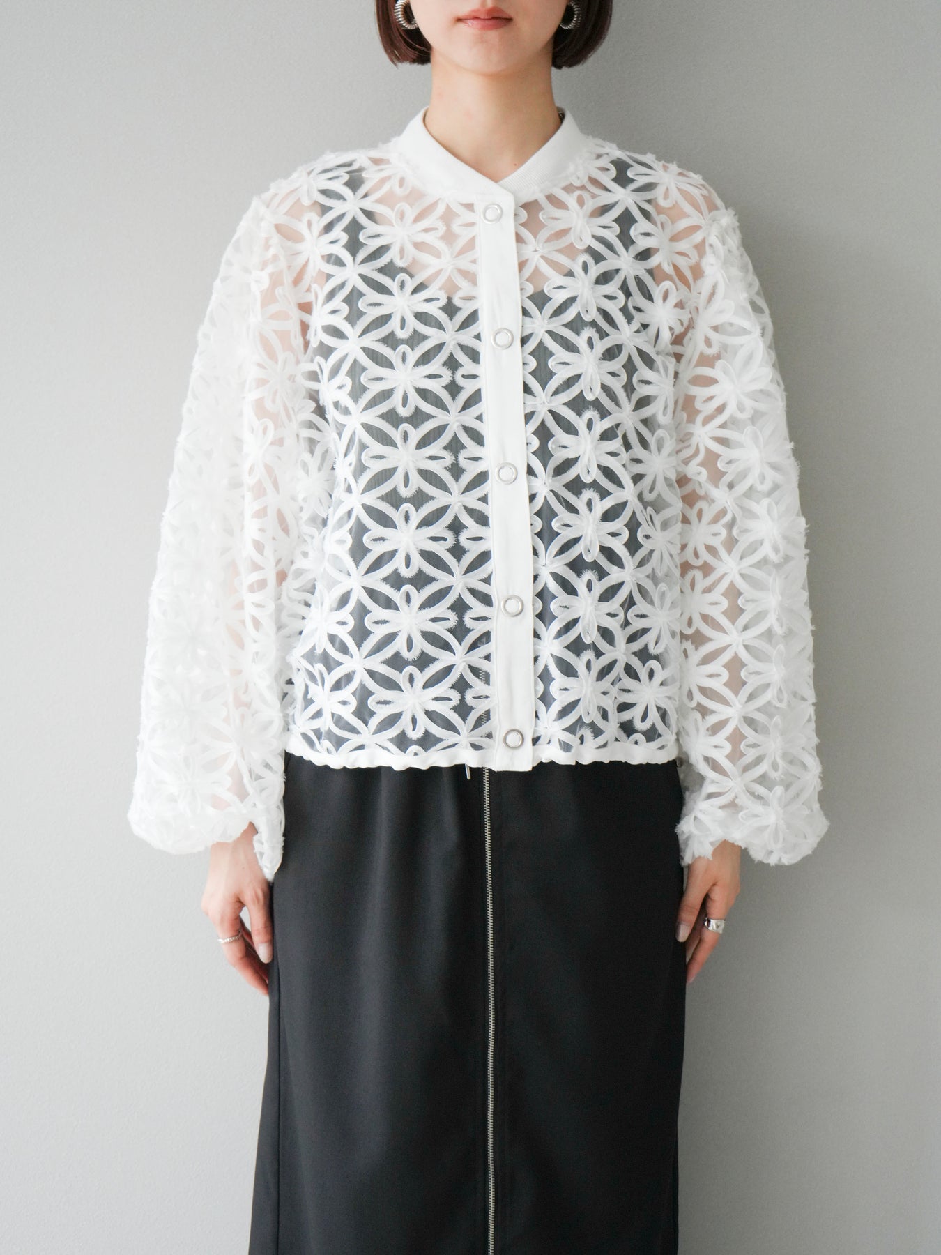 立体感のあるフラワーモチーフのテープレースが目を惹く、軽やかなシアーブルゾン。程よい透け感と華やかさがあり、羽織るだけでスタイリングをぐっと格上げしてくれます。 前立てには異素材テープを施し、モードなアクセントをプラス。ドロップショルダーとゆとりのあるシルエットで、抜け感のあるリラクシーな着心地に。 シンプルなインナーに合わせるだけで、女性らしくも洗練された印象に仕上がるアイテムです。 ※ボトムス、キャミソール(インナー)以外の商品は一律でインナーは付属していません。