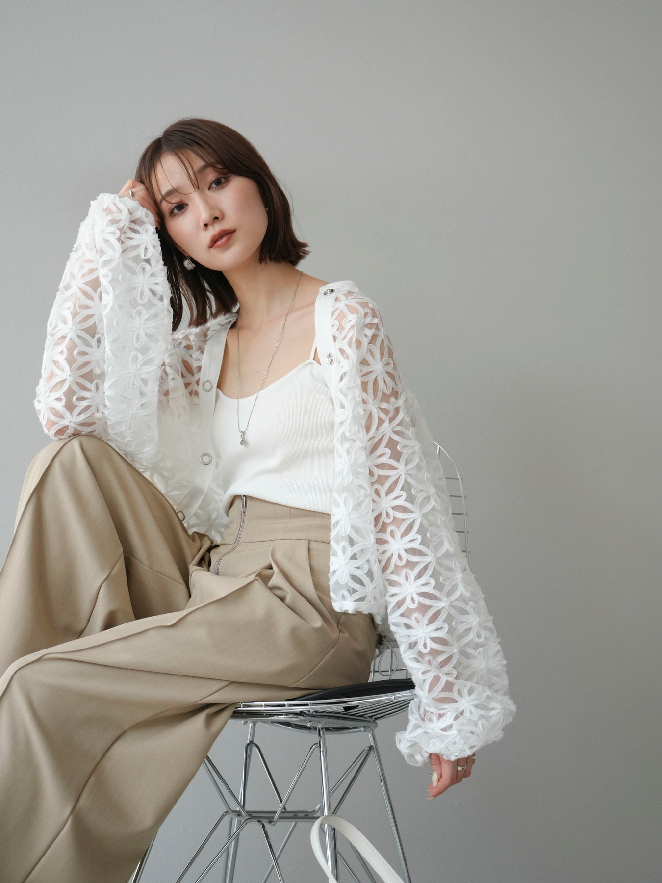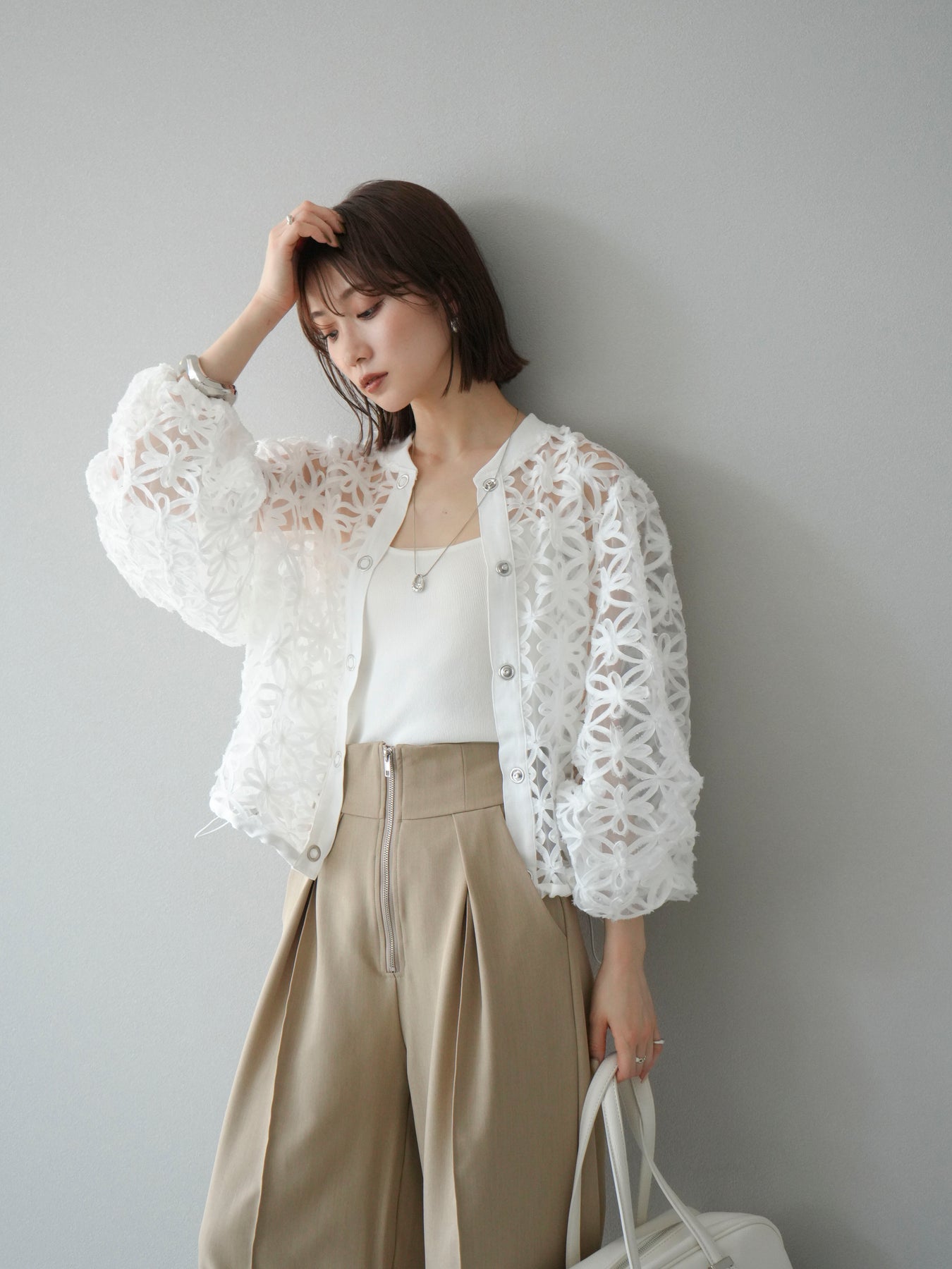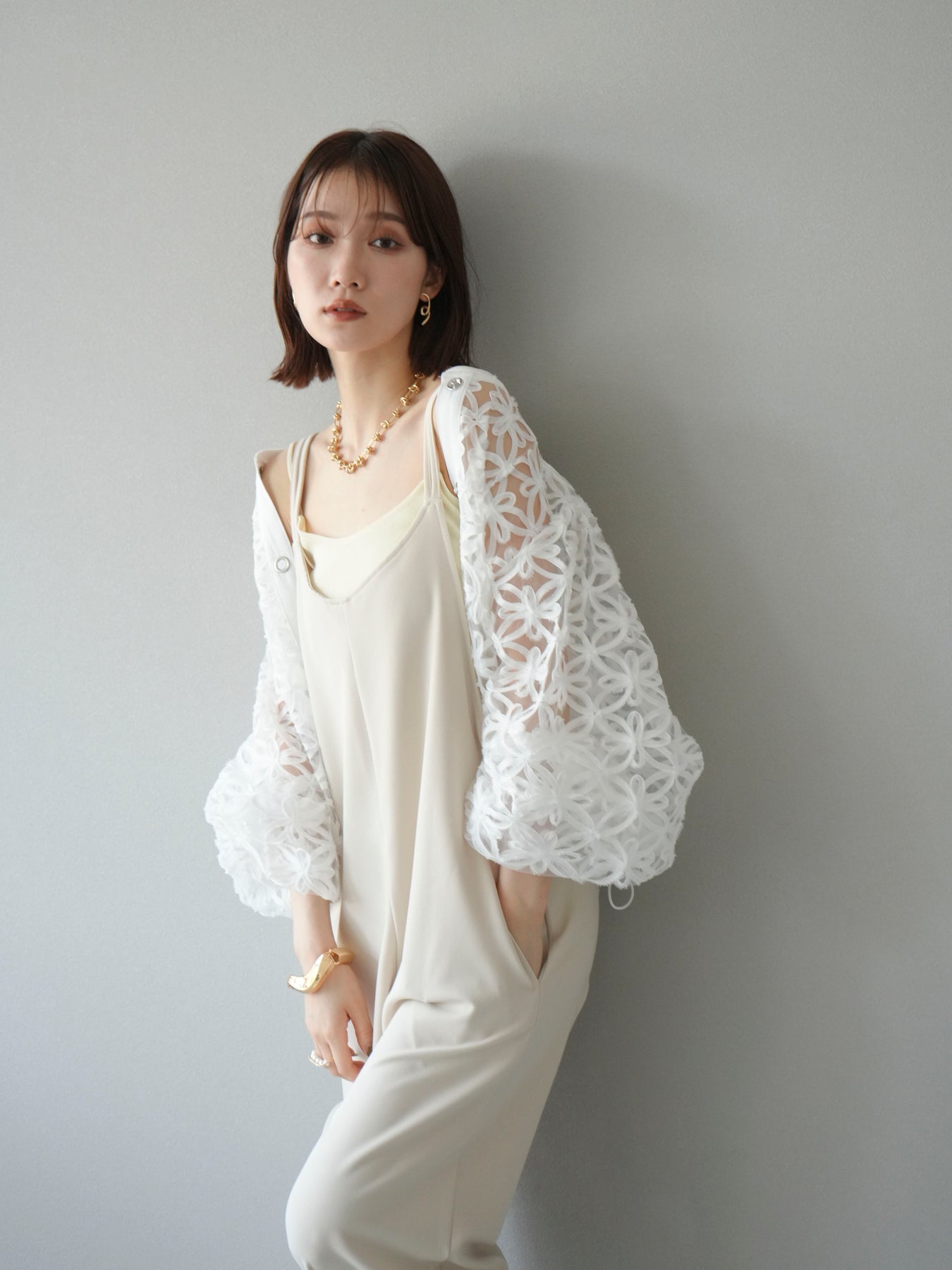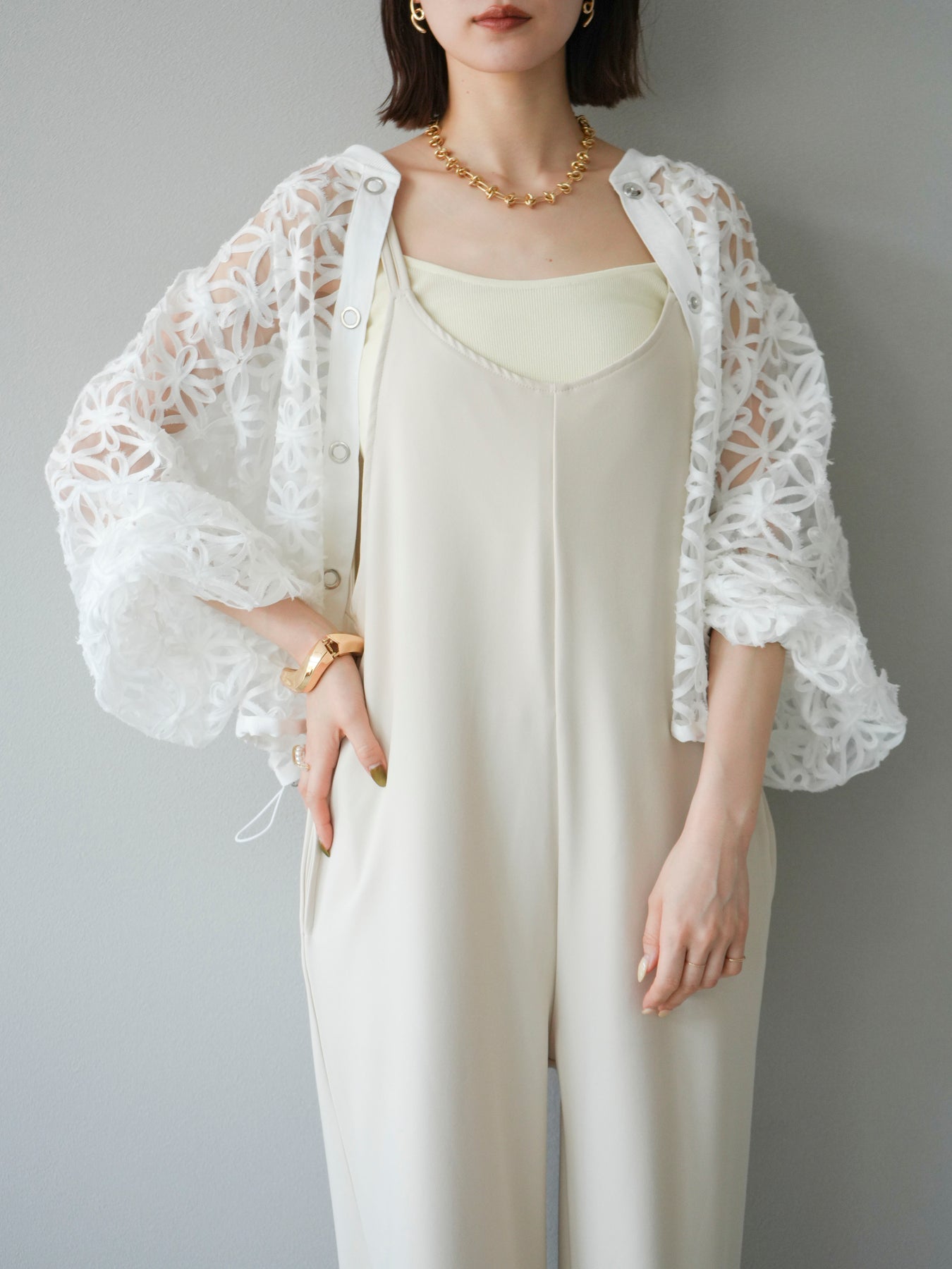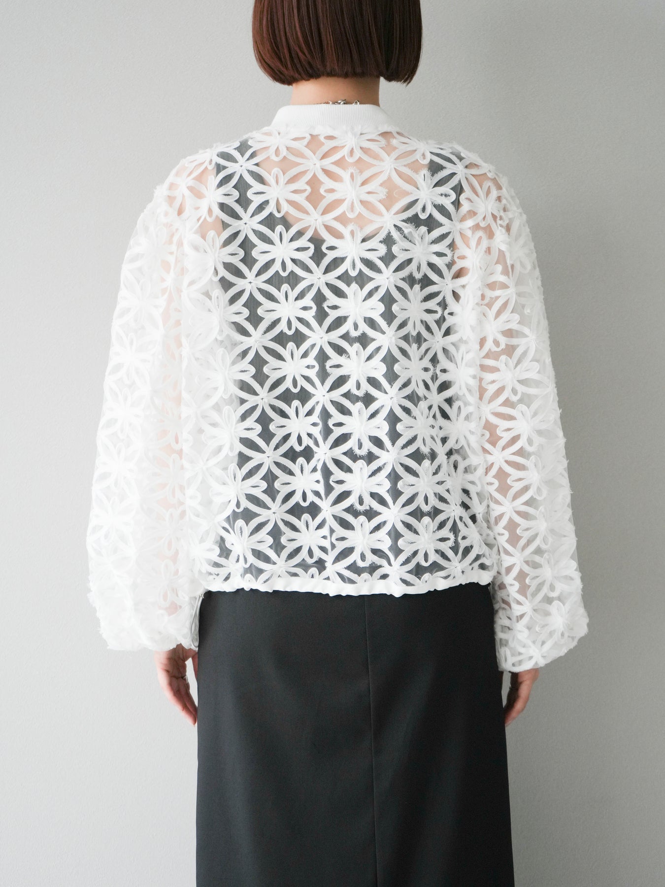 立体感のあるフラワーモチーフのテープレースが目を惹く、軽やかなシアーブルゾン。程よい透け感と華やかさがあり、羽織るだけでスタイリングをぐっと格上げしてくれます。 前立てには異素材テープを施し、モードなアクセントをプラス。ドロップショルダーとゆとりのあるシルエットで、抜け感のあるリラクシーな着心地に。 シンプルなインナーに合わせるだけで、女性らしくも洗練された印象に仕上がるアイテムです。 ※ボトムス、キャミソール(インナー)以外の商品は一律でインナーは付属していません。