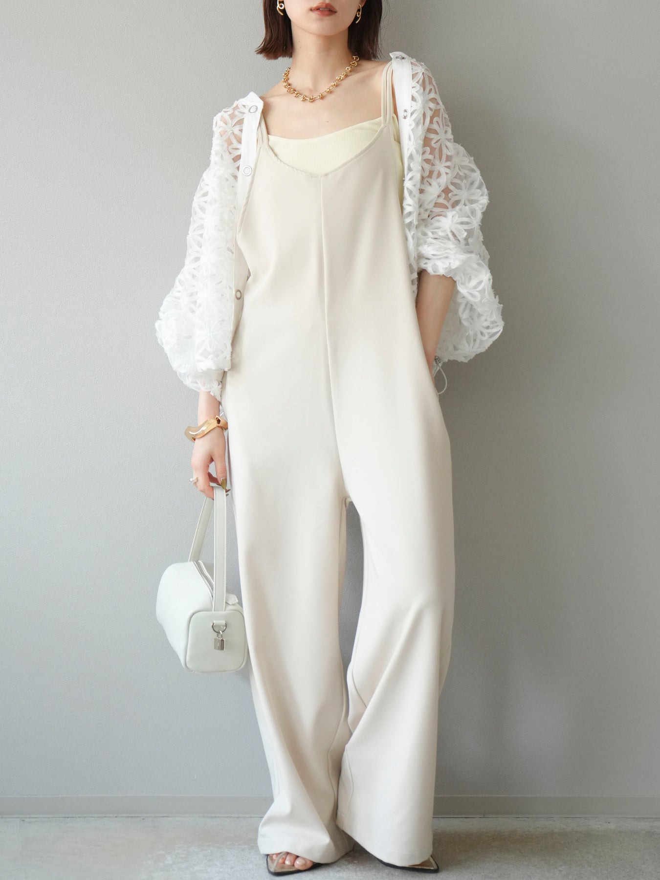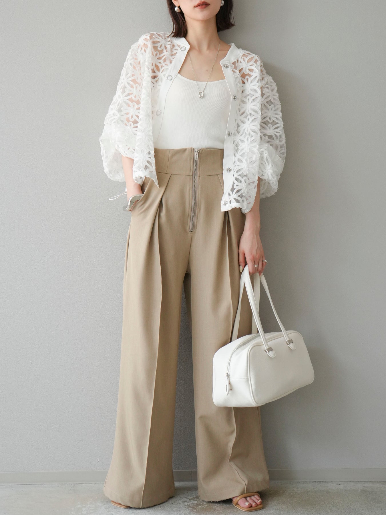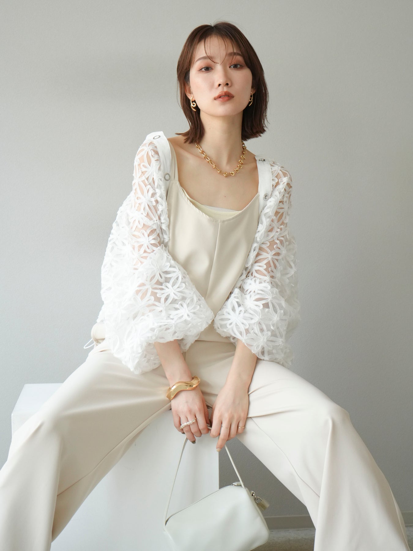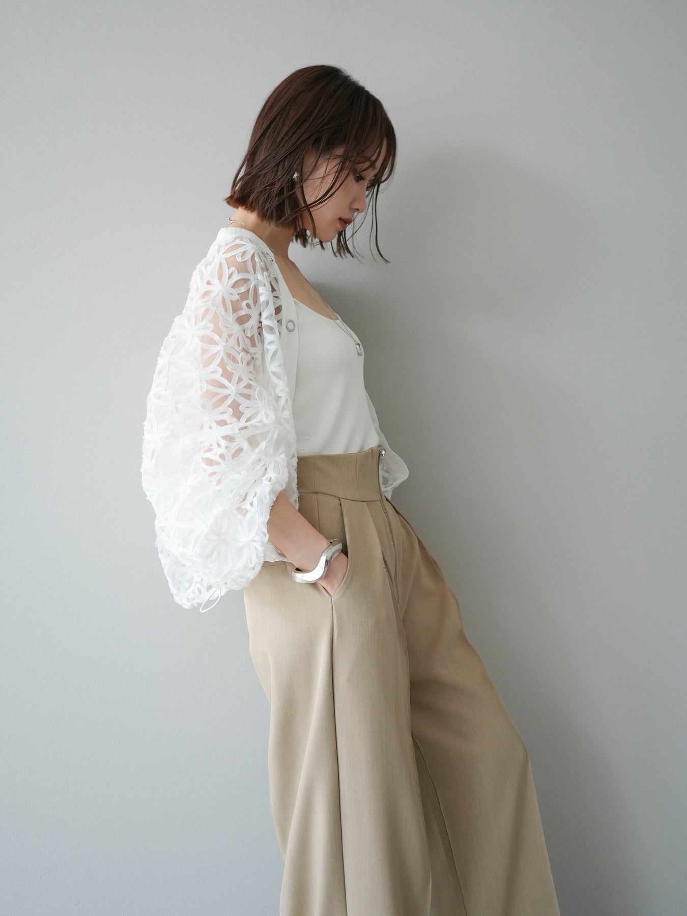 立体感のあるフラワーモチーフのテープレースが目を惹く、軽やかなシアーブルゾン。程よい透け感と華やかさがあり、羽織るだけでスタイリングをぐっと格上げしてくれます。 前立てには異素材テープを施し、モードなアクセントをプラス。ドロップショルダーとゆとりのあるシルエットで、抜け感のあるリラクシーな着心地に。 シンプルなインナーに合わせるだけで、女性らしくも洗練された印象に仕上がるアイテムです。 ※ボトムス、キャミソール(インナー)以外の商品は一律でインナーは付属していません。