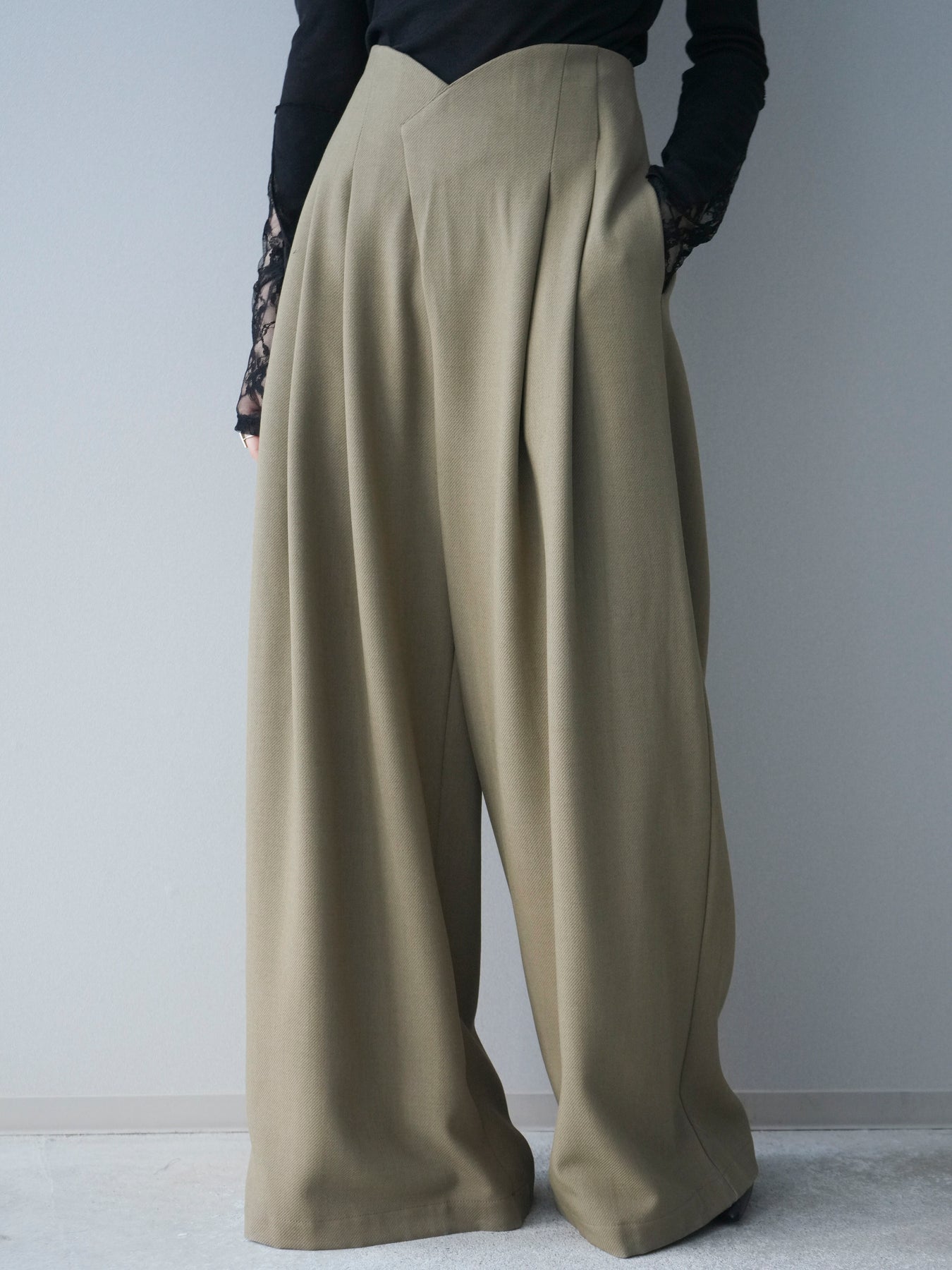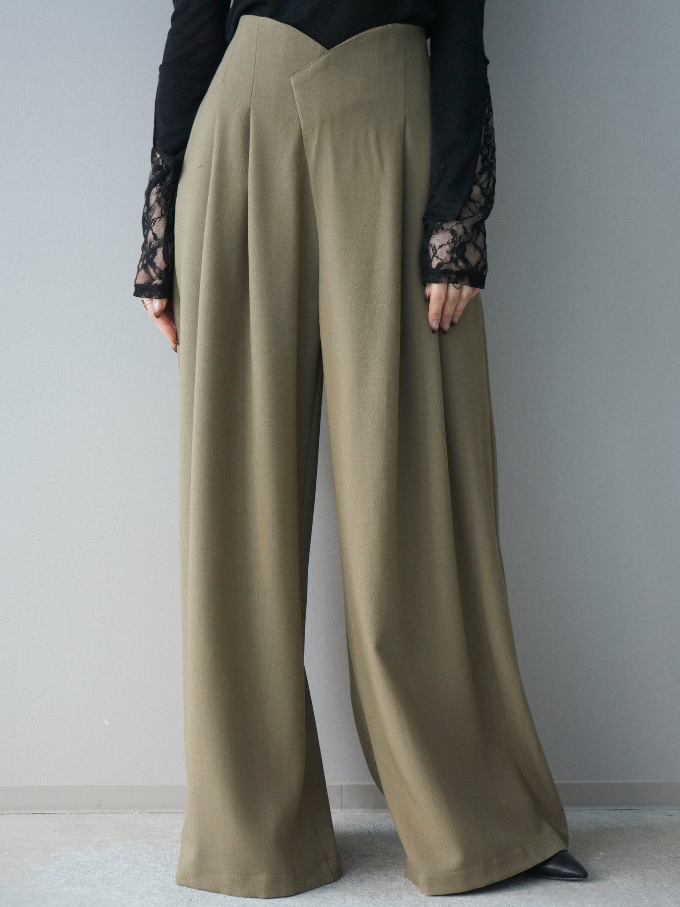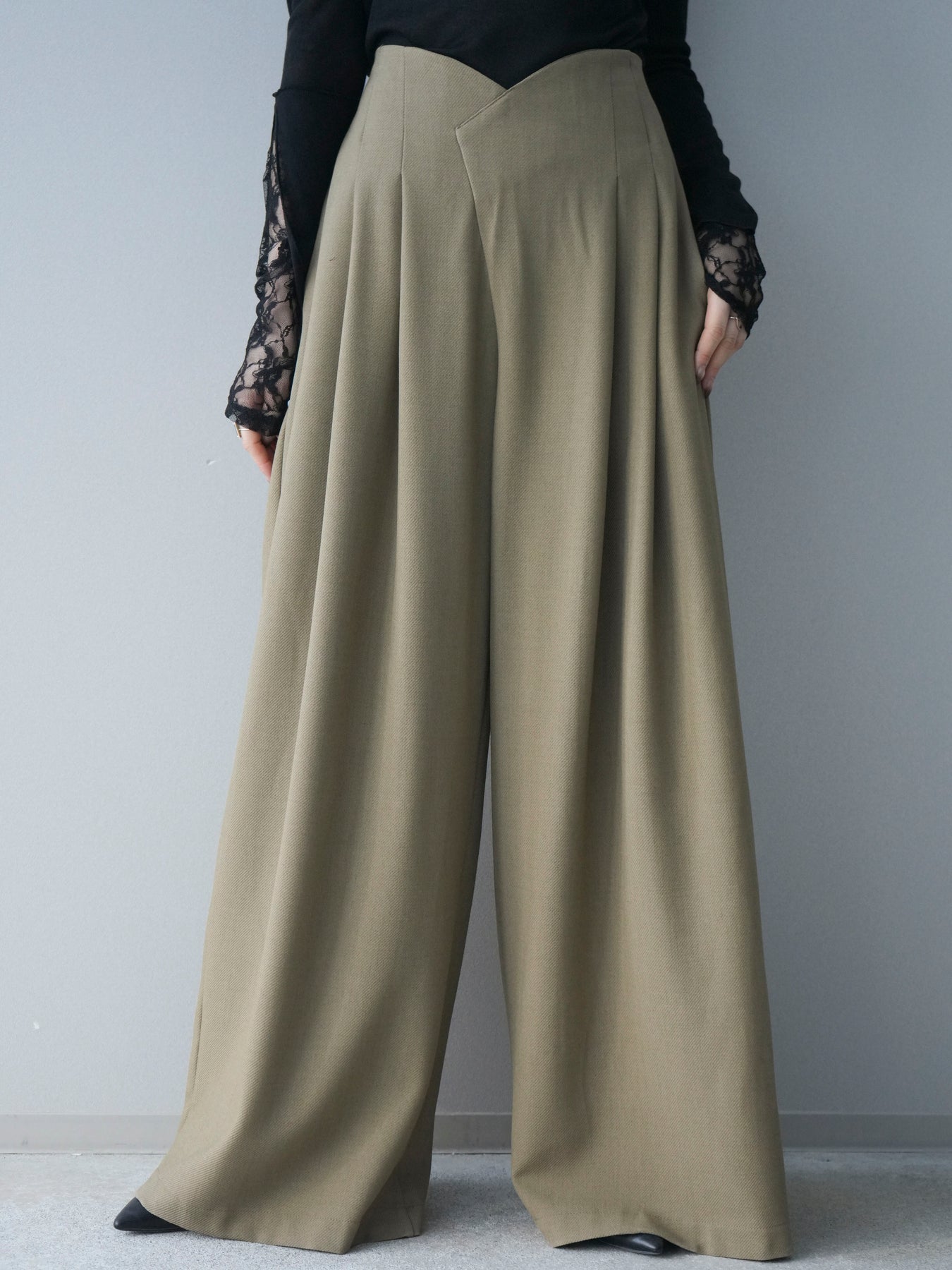 立体的なデザインが目を惹く、ハイウエスト仕様のワイドパンツ。ウエスト部分に施したアシンメトリーな重なりデザインが、シンプルな中にもさりげない個性をプラスします。腰位置を高く見せるシルエットで、自然なスタイルアップを叶えつつ、裾に向かって広がるラインが脚のラインを拾いにくいのもポイント。落ち感のある素材で動きやすく、きれいめにもカジュアルにも幅広いスタイリングに活躍する一本です。