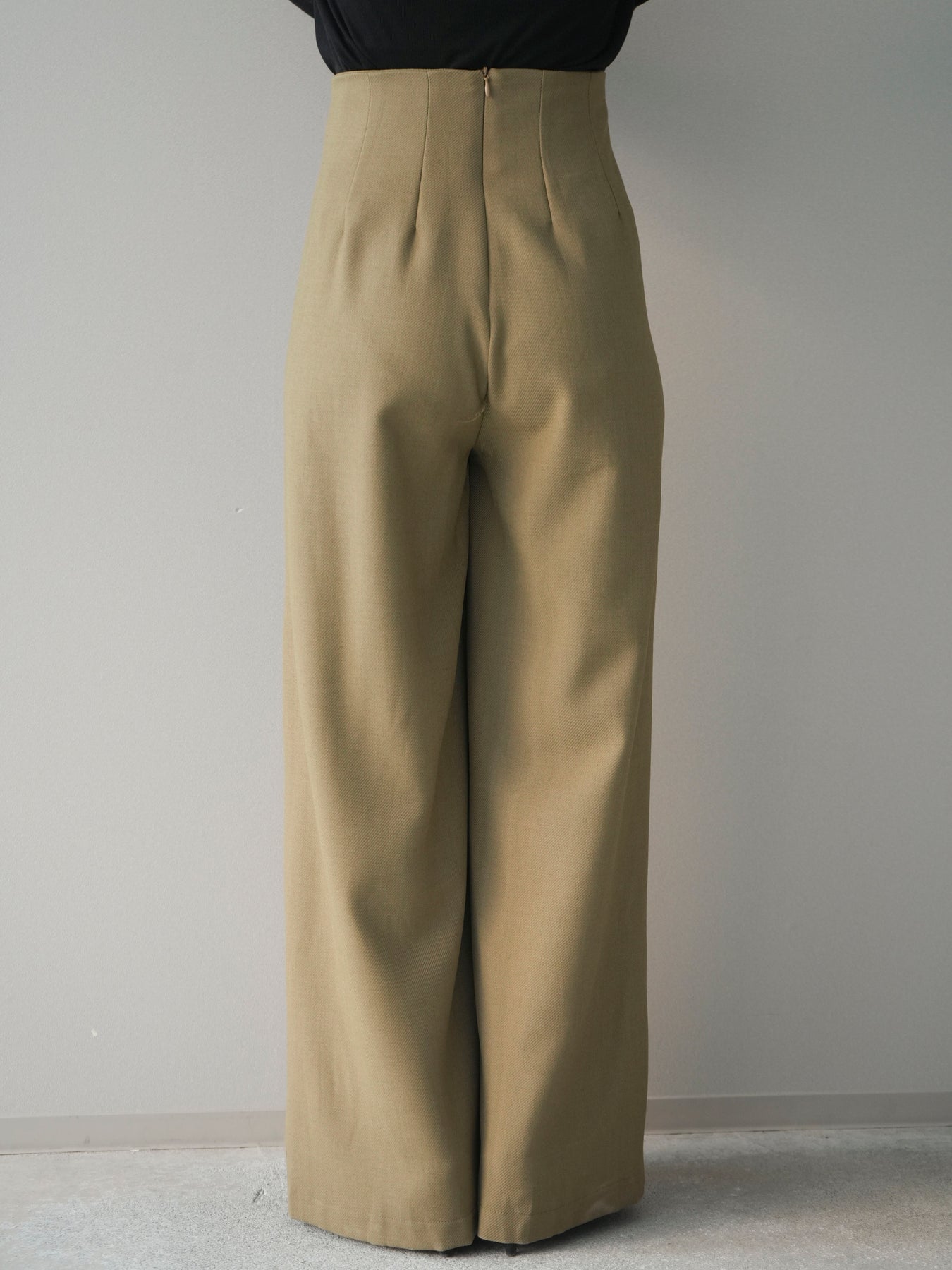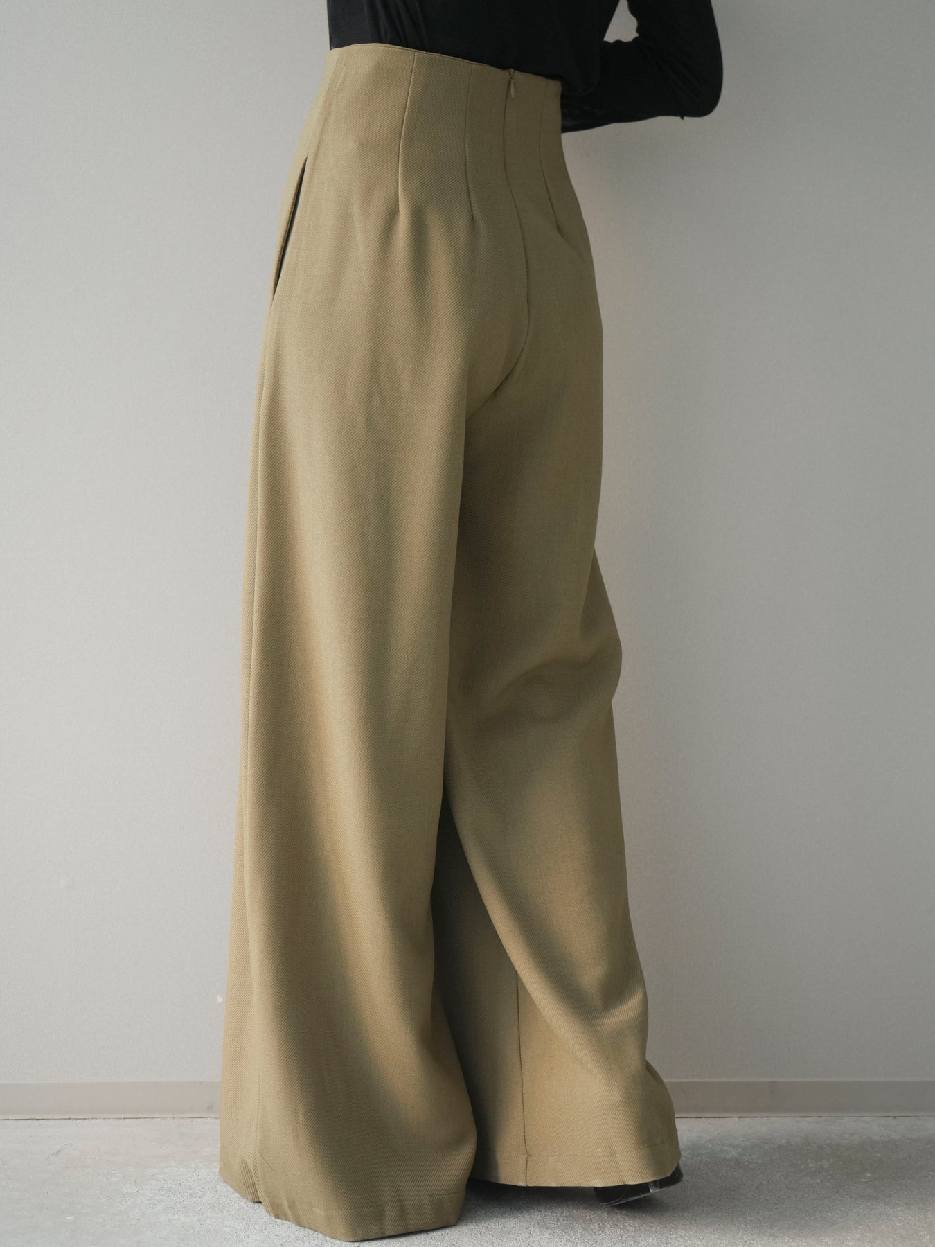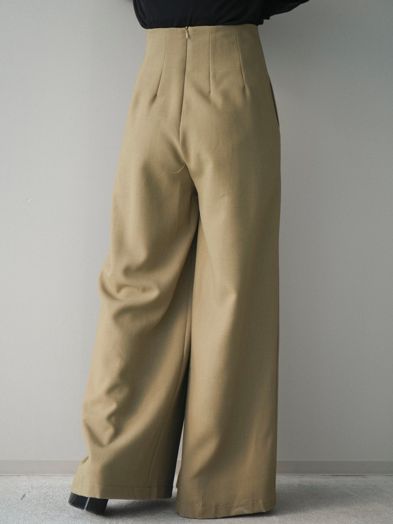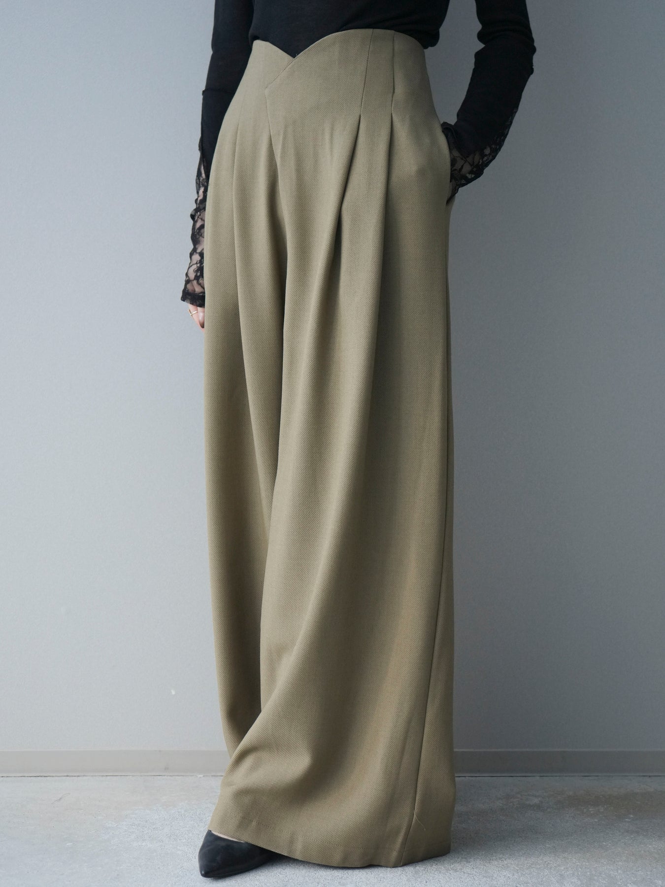 立体的なデザインが目を惹く、ハイウエスト仕様のワイドパンツ。ウエスト部分に施したアシンメトリーな重なりデザインが、シンプルな中にもさりげない個性をプラスします。腰位置を高く見せるシルエットで、自然なスタイルアップを叶えつつ、裾に向かって広がるラインが脚のラインを拾いにくいのもポイント。落ち感のある素材で動きやすく、きれいめにもカジュアルにも幅広いスタイリングに活躍する一本です。