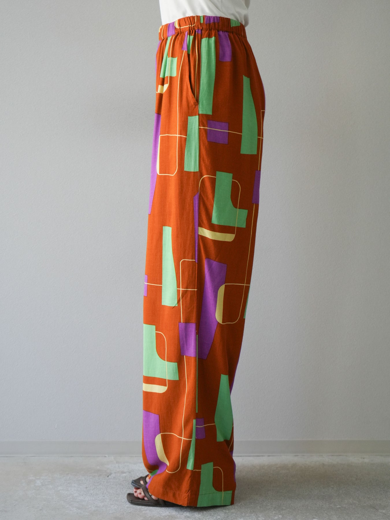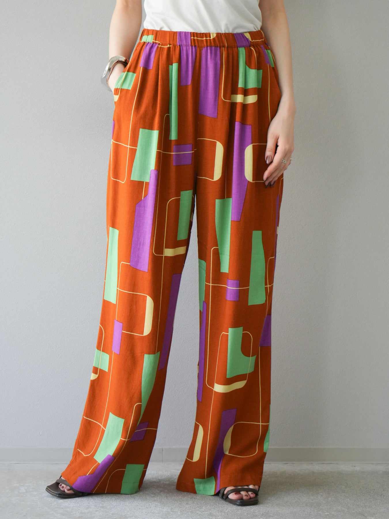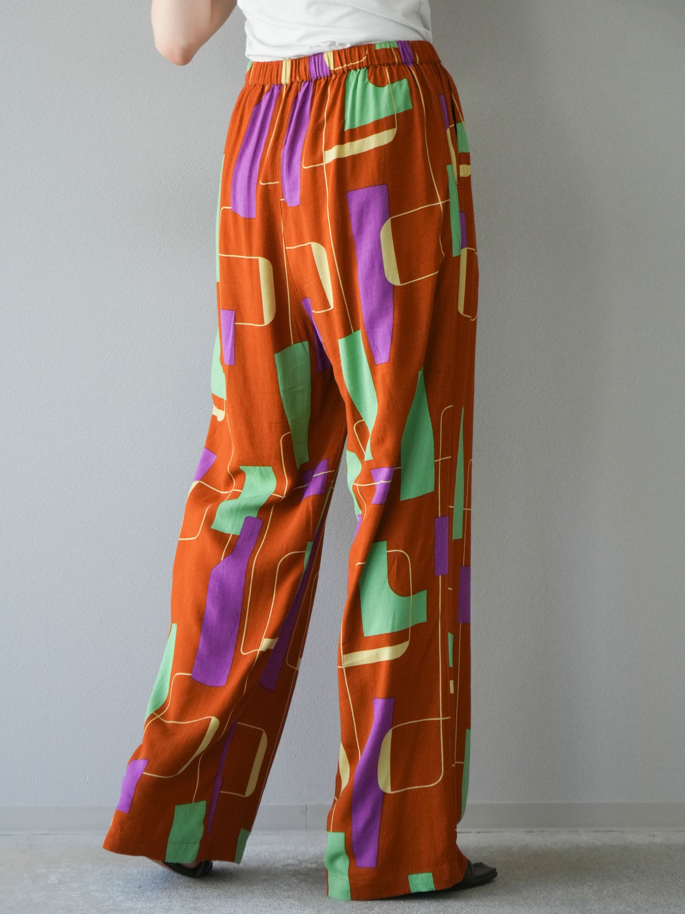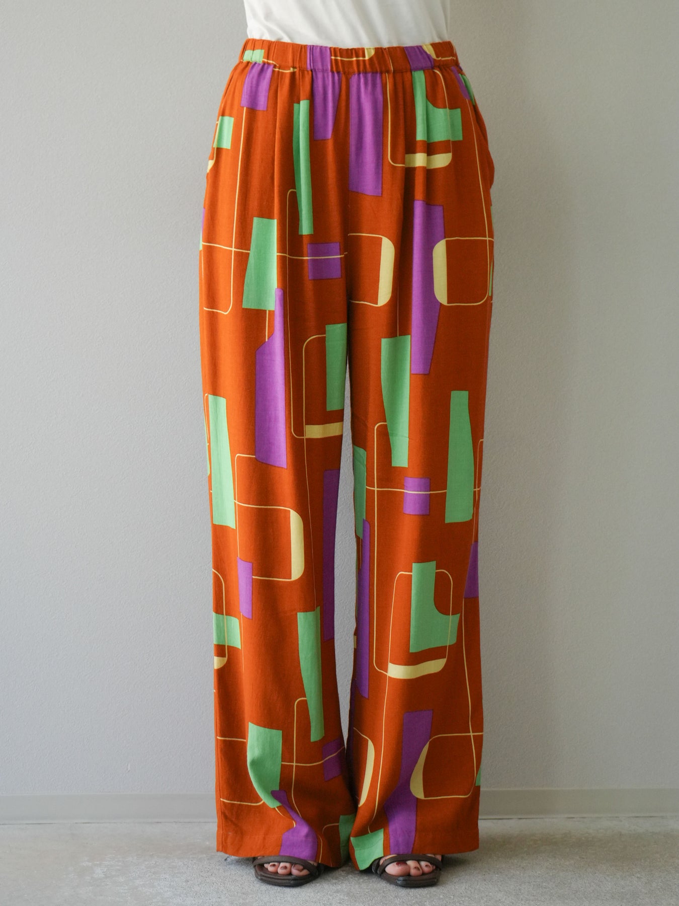 ヴィンテージ感漂うレトロな幾何柄が印象的なストレートパンツ。 レーヨン混のとろみ素材が肌に優しく馴染み、軽やかな穿き心地を実現。 ウエストは総ゴム仕様でストレスなく着用でき、体型問わずフィットします。 トップスを選ばず、コーディネートの主役になる存在感たっぷりの一本です。