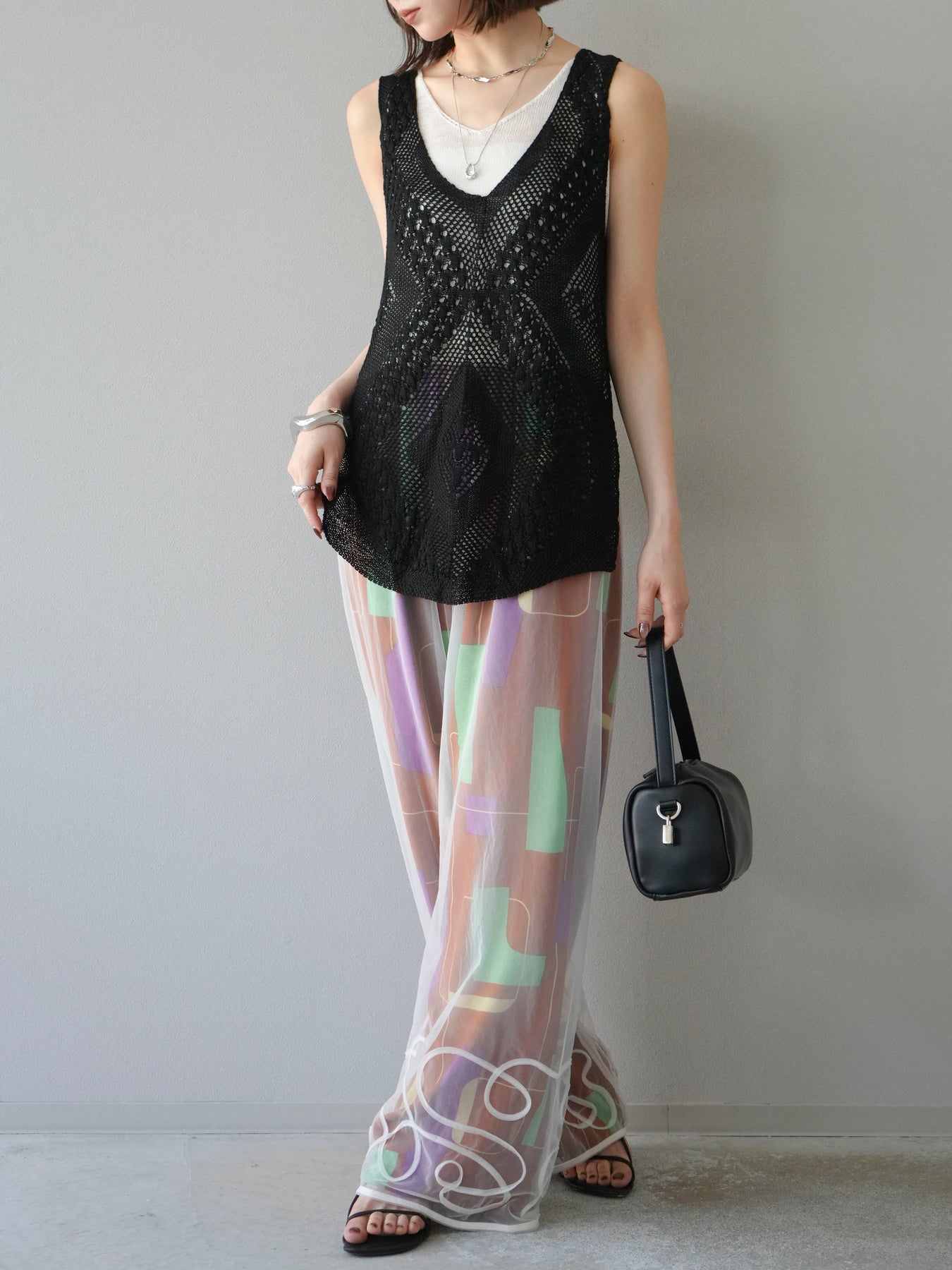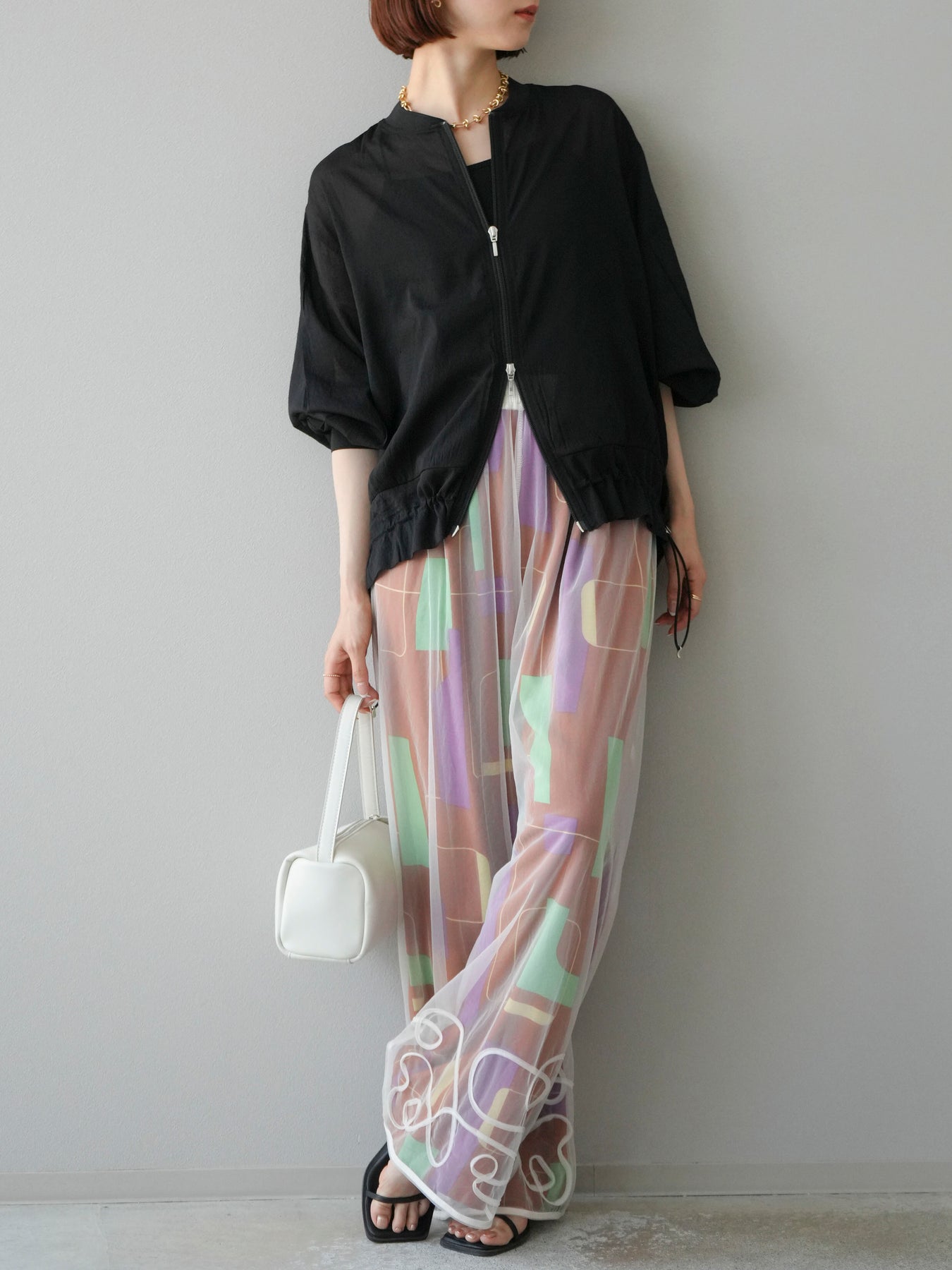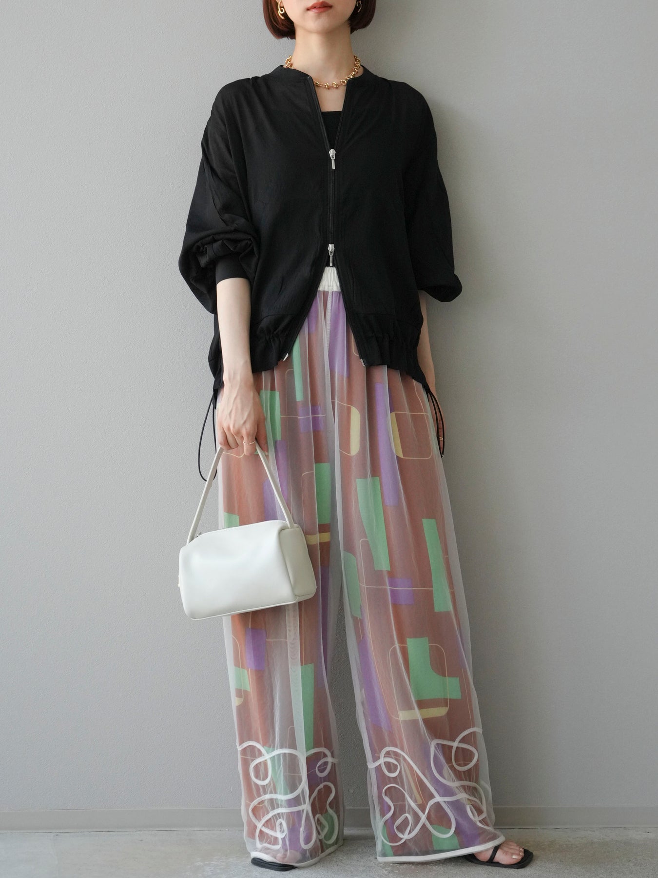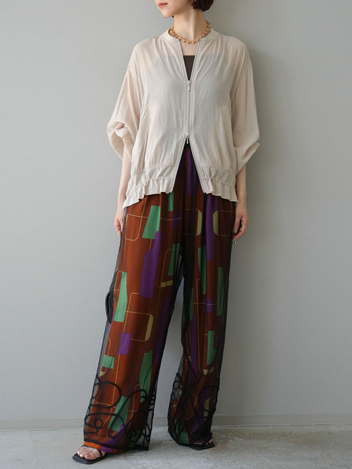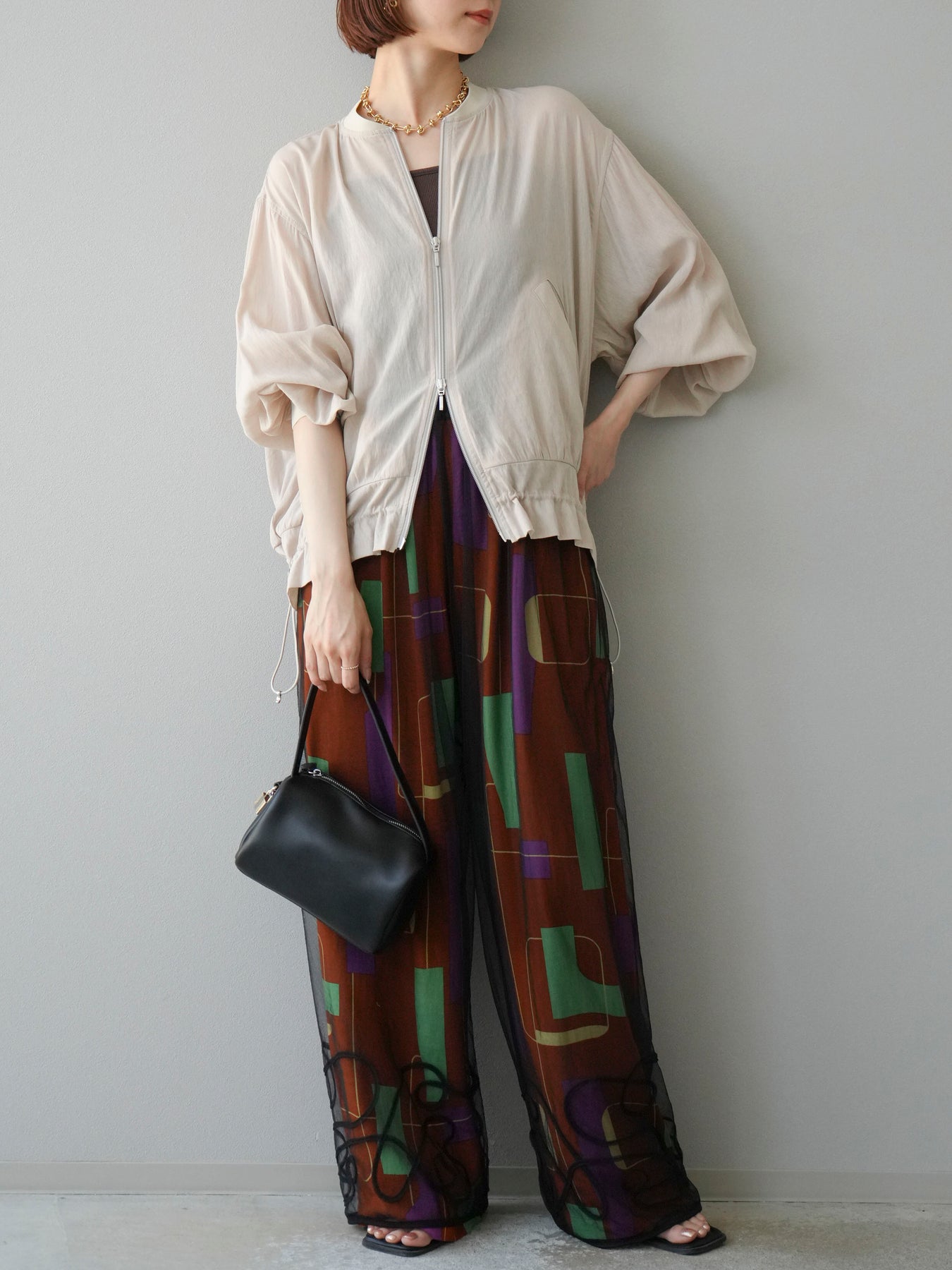 ヴィンテージ感漂うレトロな幾何柄が印象的なストレートパンツ。 レーヨン混のとろみ素材が肌に優しく馴染み、軽やかな穿き心地を実現。 ウエストは総ゴム仕様でストレスなく着用でき、体型問わずフィットします。 トップスを選ばず、コーディネートの主役になる存在感たっぷりの一本です。