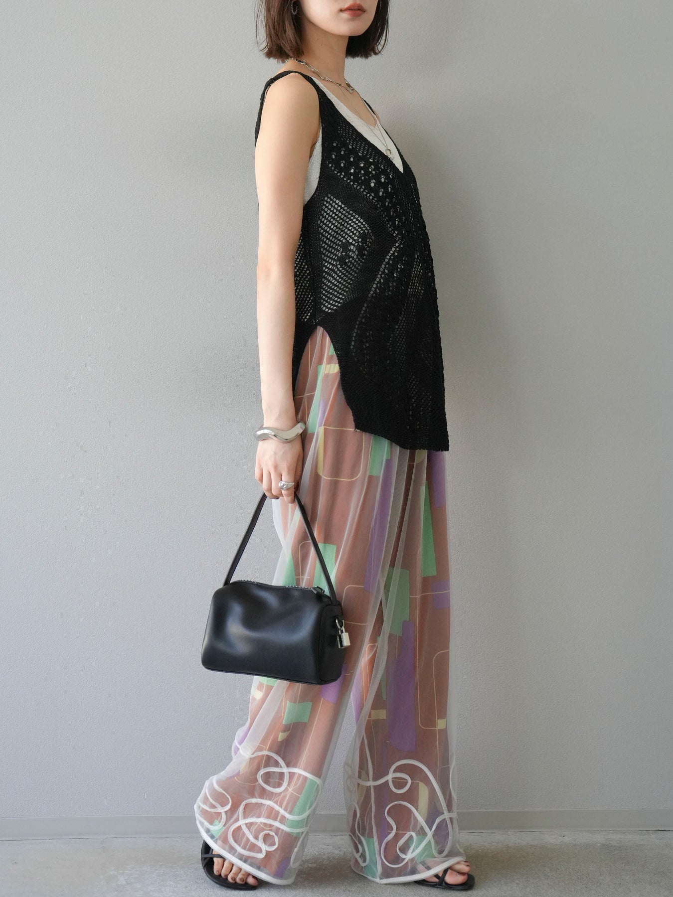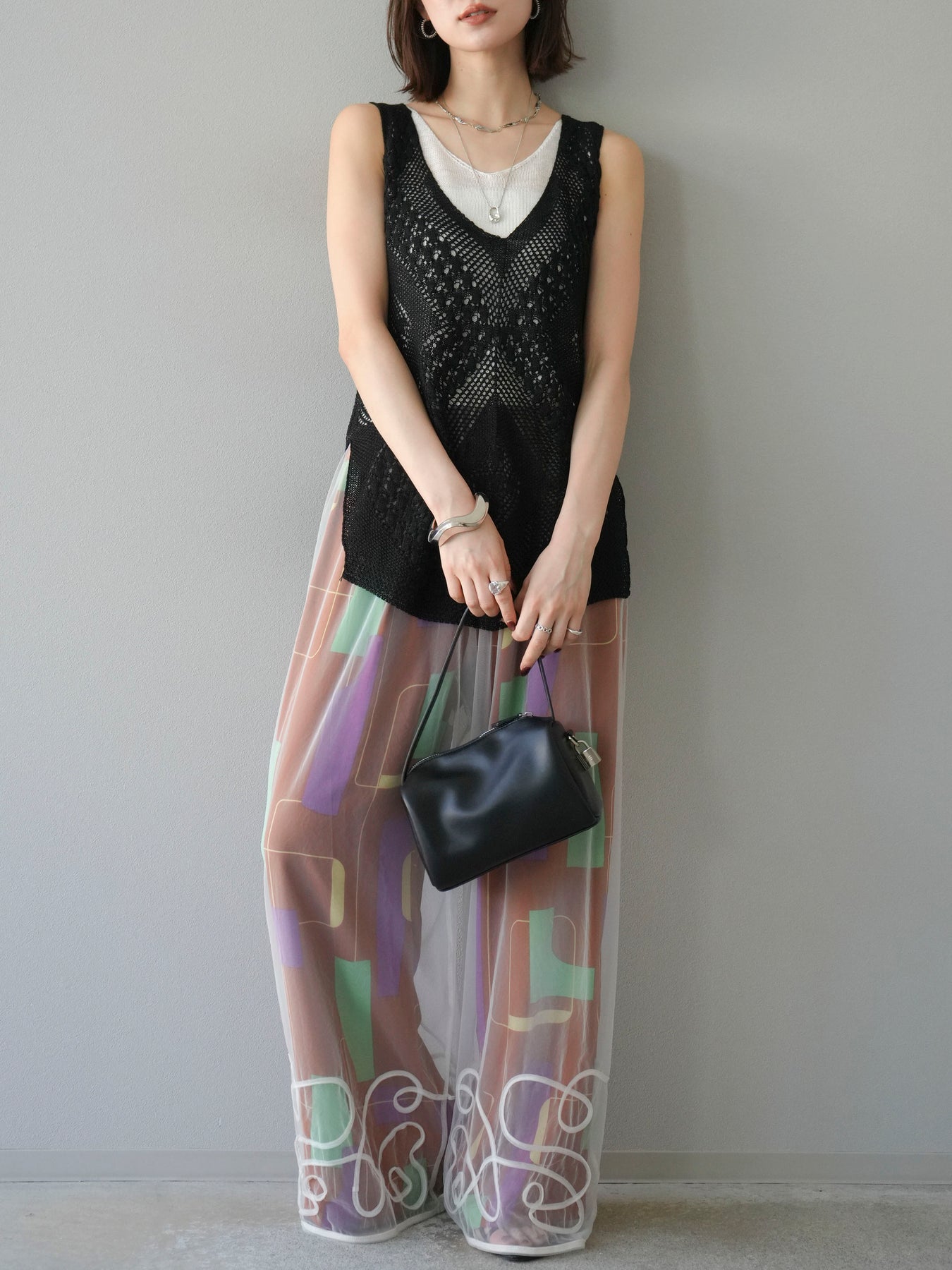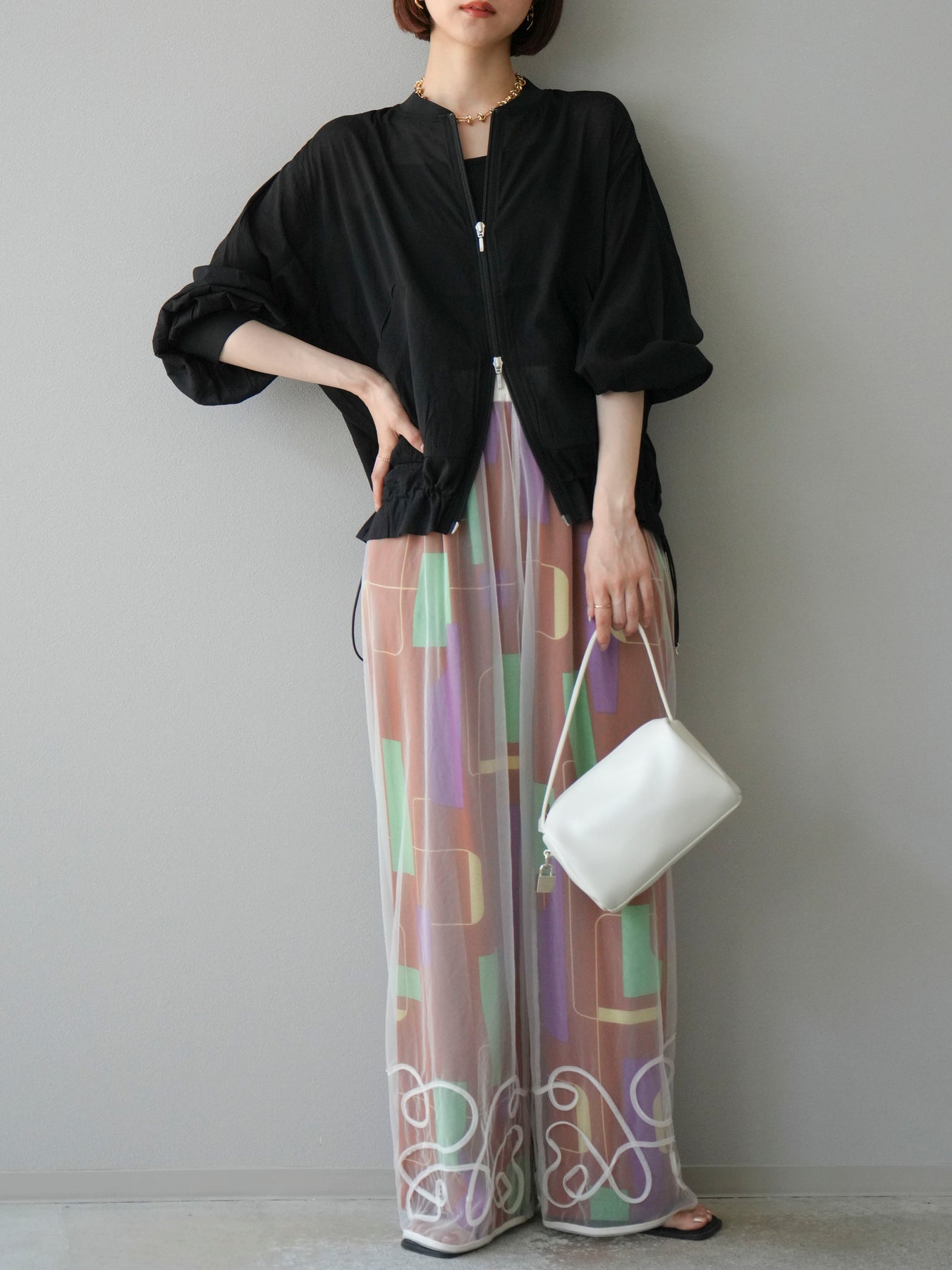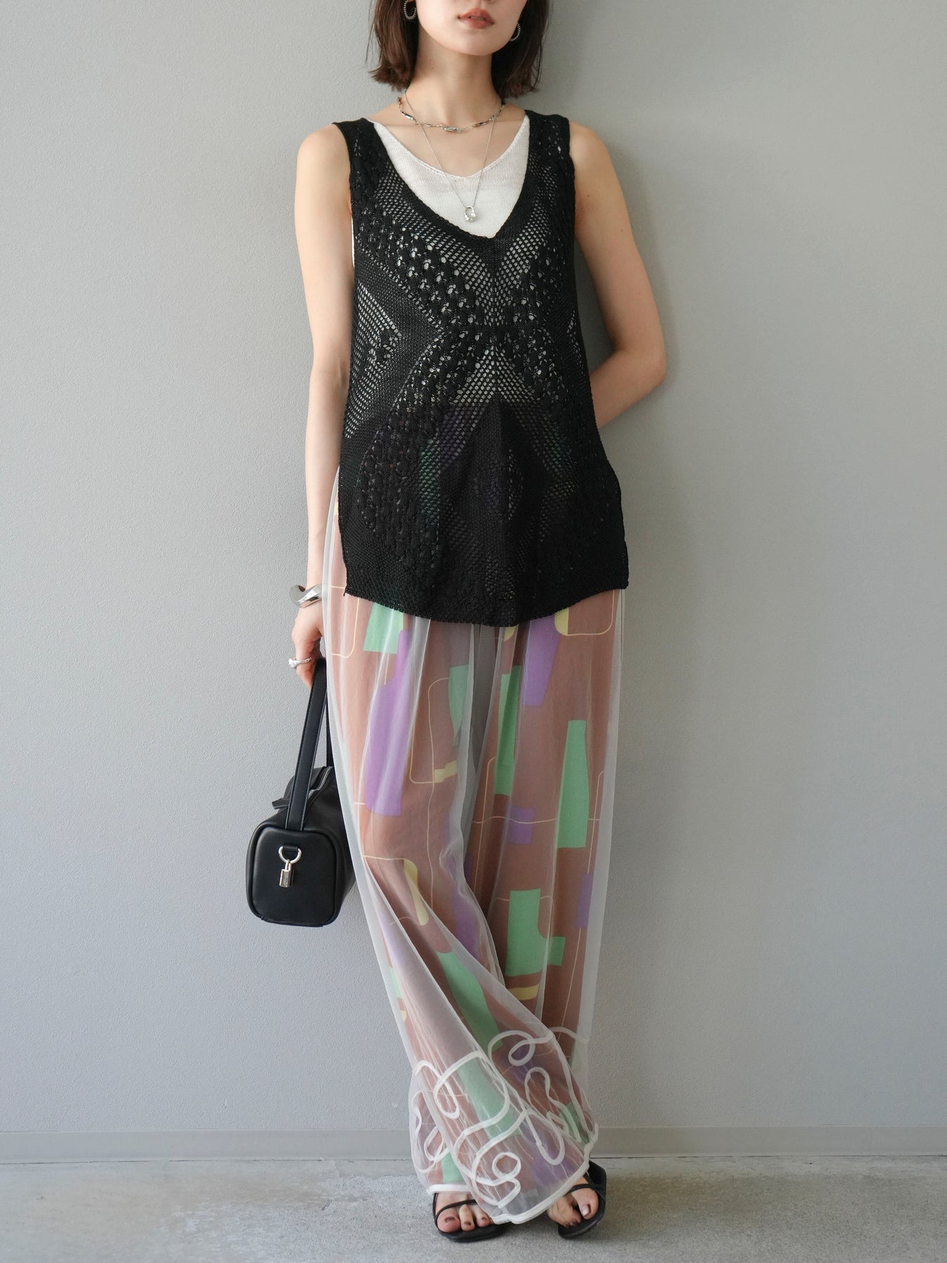 ヴィンテージ感漂うレトロな幾何柄が印象的なストレートパンツ。 レーヨン混のとろみ素材が肌に優しく馴染み、軽やかな穿き心地を実現。 ウエストは総ゴム仕様でストレスなく着用でき、体型問わずフィットします。 トップスを選ばず、コーディネートの主役になる存在感たっぷりの一本です。
