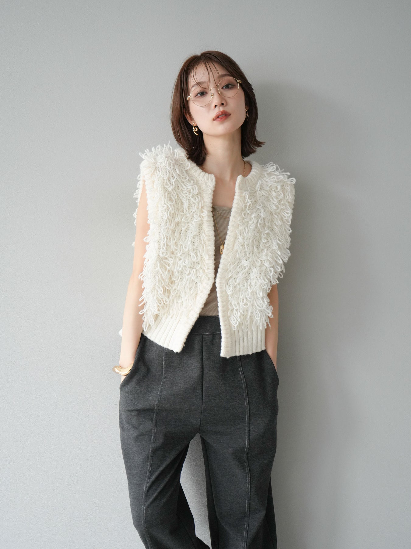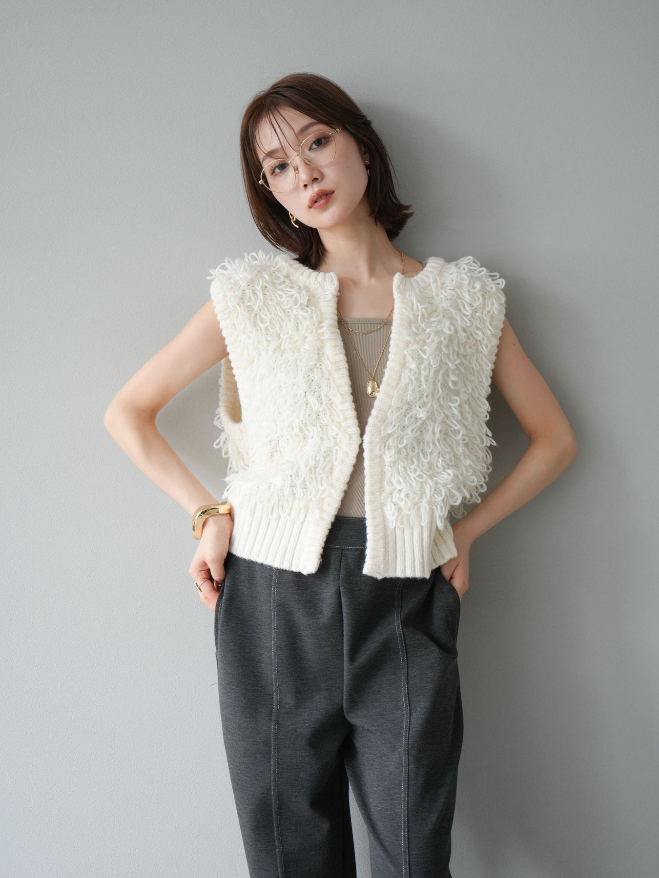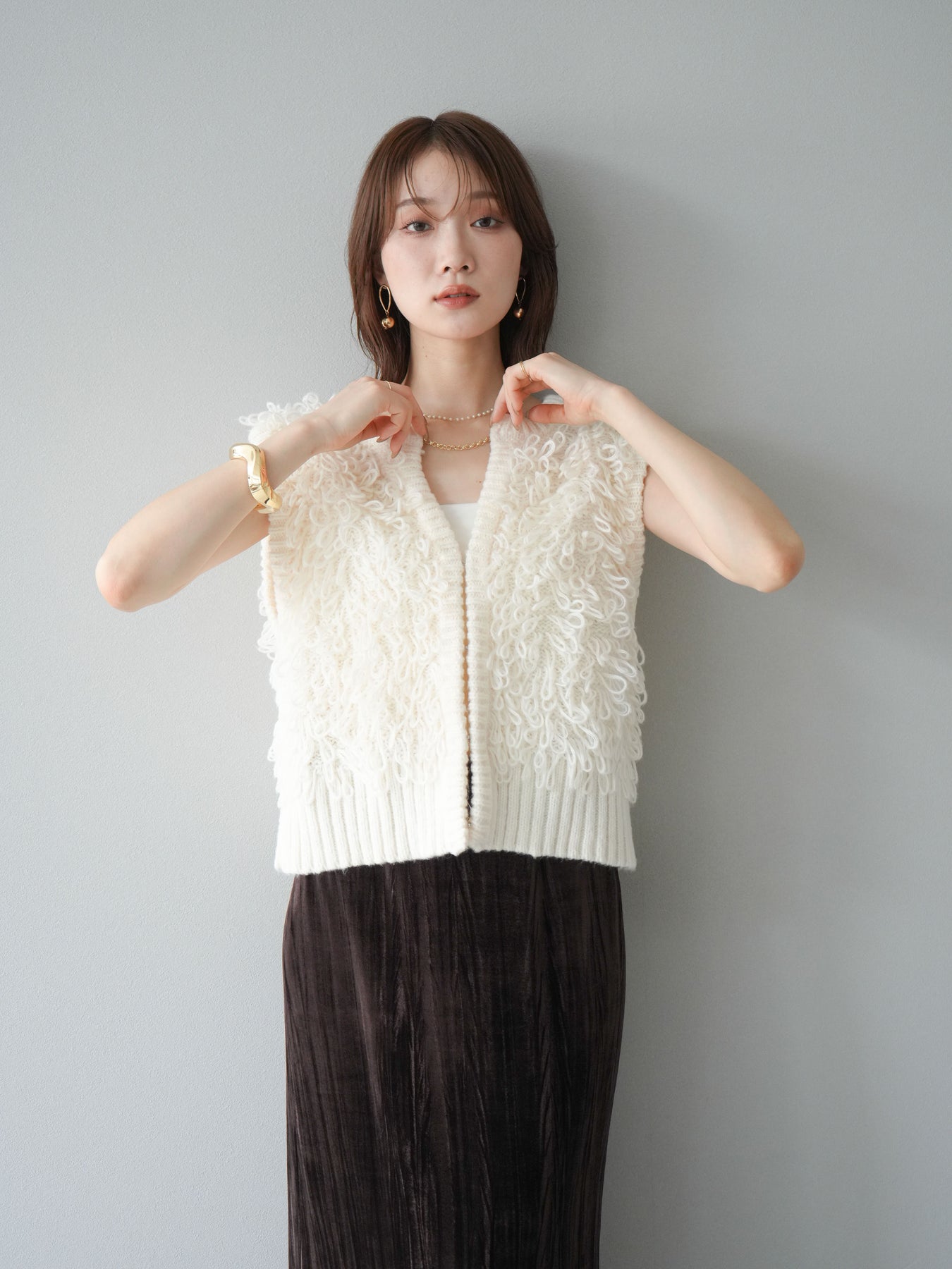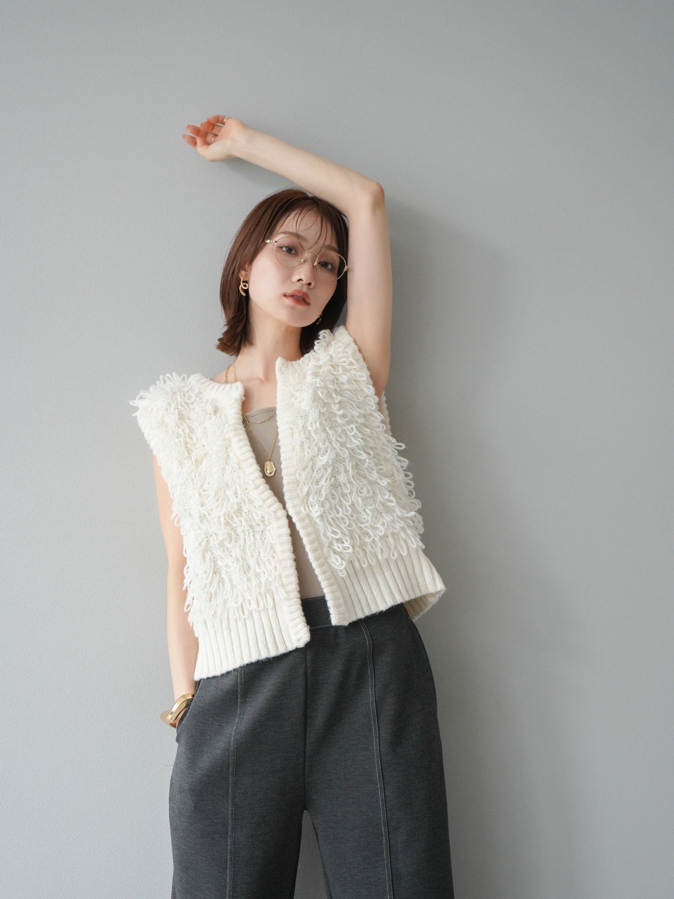 立体感のあるループ編みが印象的なニットベスト。フロントはホック留めで軽やかに羽織れる仕様になっており、カットソーやシャツとのレイヤードで表情豊かなスタイリングが楽しめます。存在感がありながらも合わせやすく、シーズンを通して活躍するアイテムです。 ※ボトムス、キャミソール(インナー)以外の商品は一律でインナーは付属していません。