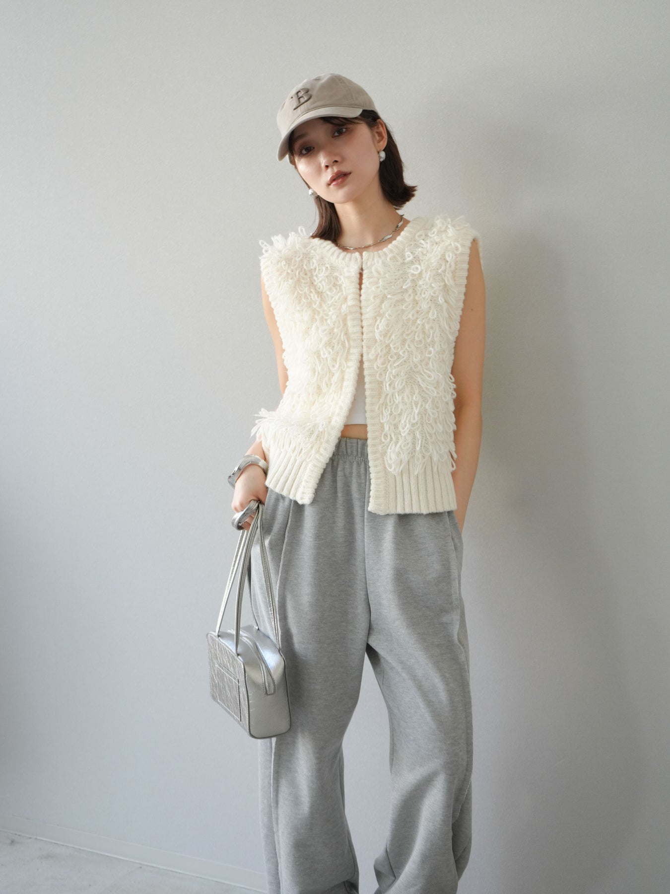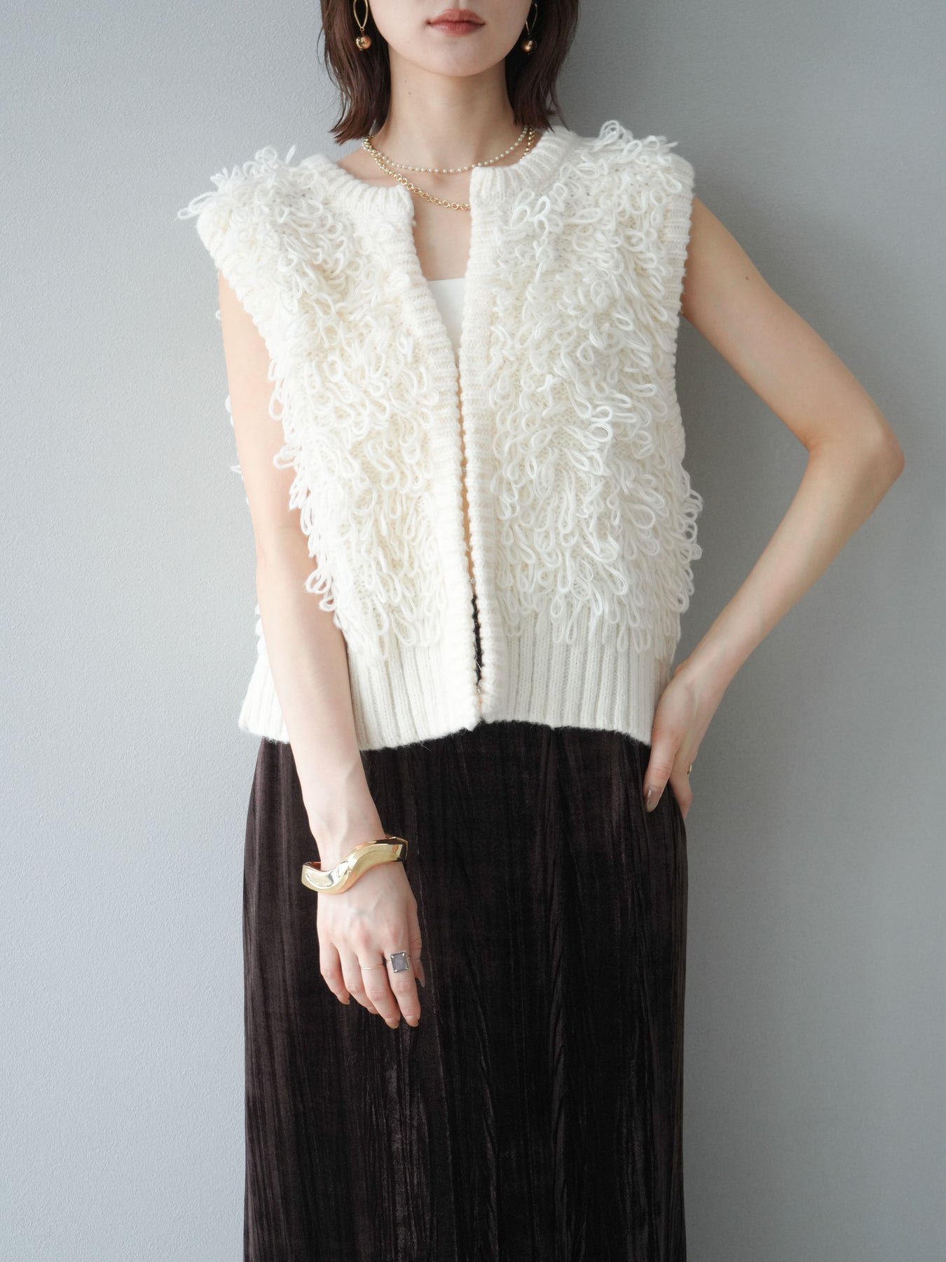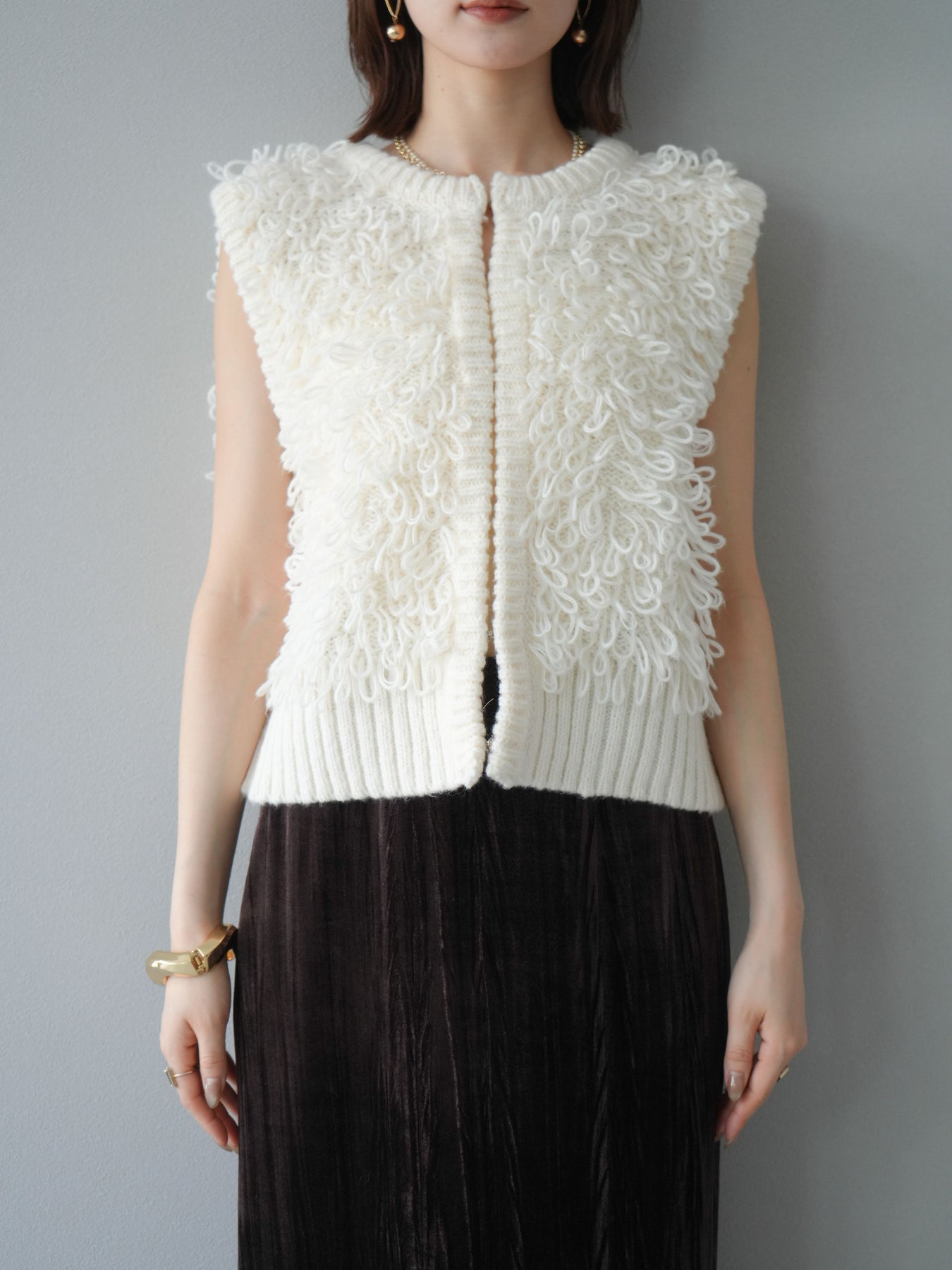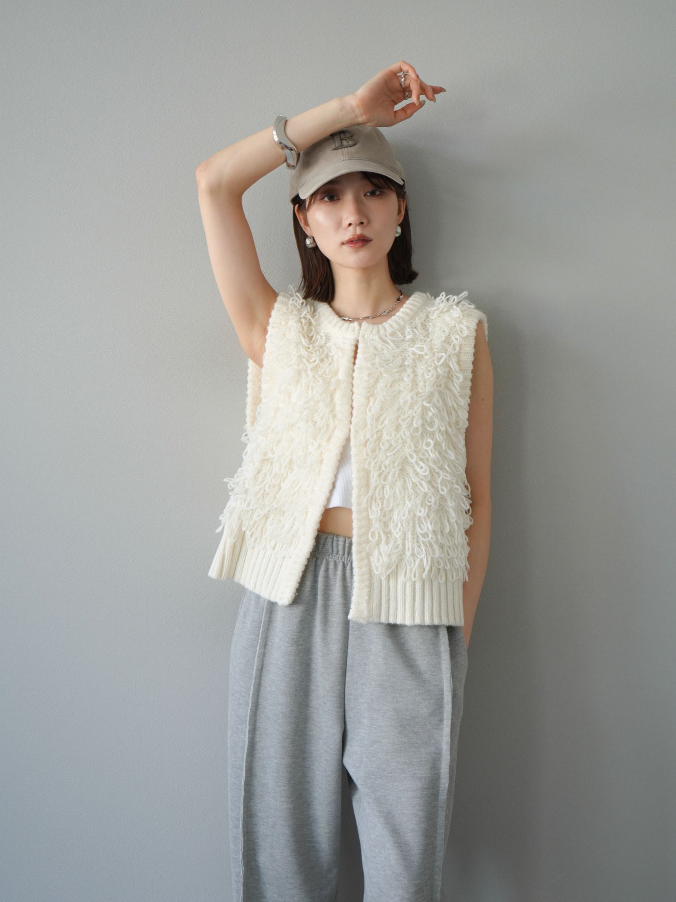 立体感のあるループ編みが印象的なニットベスト。フロントはホック留めで軽やかに羽織れる仕様になっており、カットソーやシャツとのレイヤードで表情豊かなスタイリングが楽しめます。存在感がありながらも合わせやすく、シーズンを通して活躍するアイテムです。 ※ボトムス、キャミソール(インナー)以外の商品は一律でインナーは付属していません。
