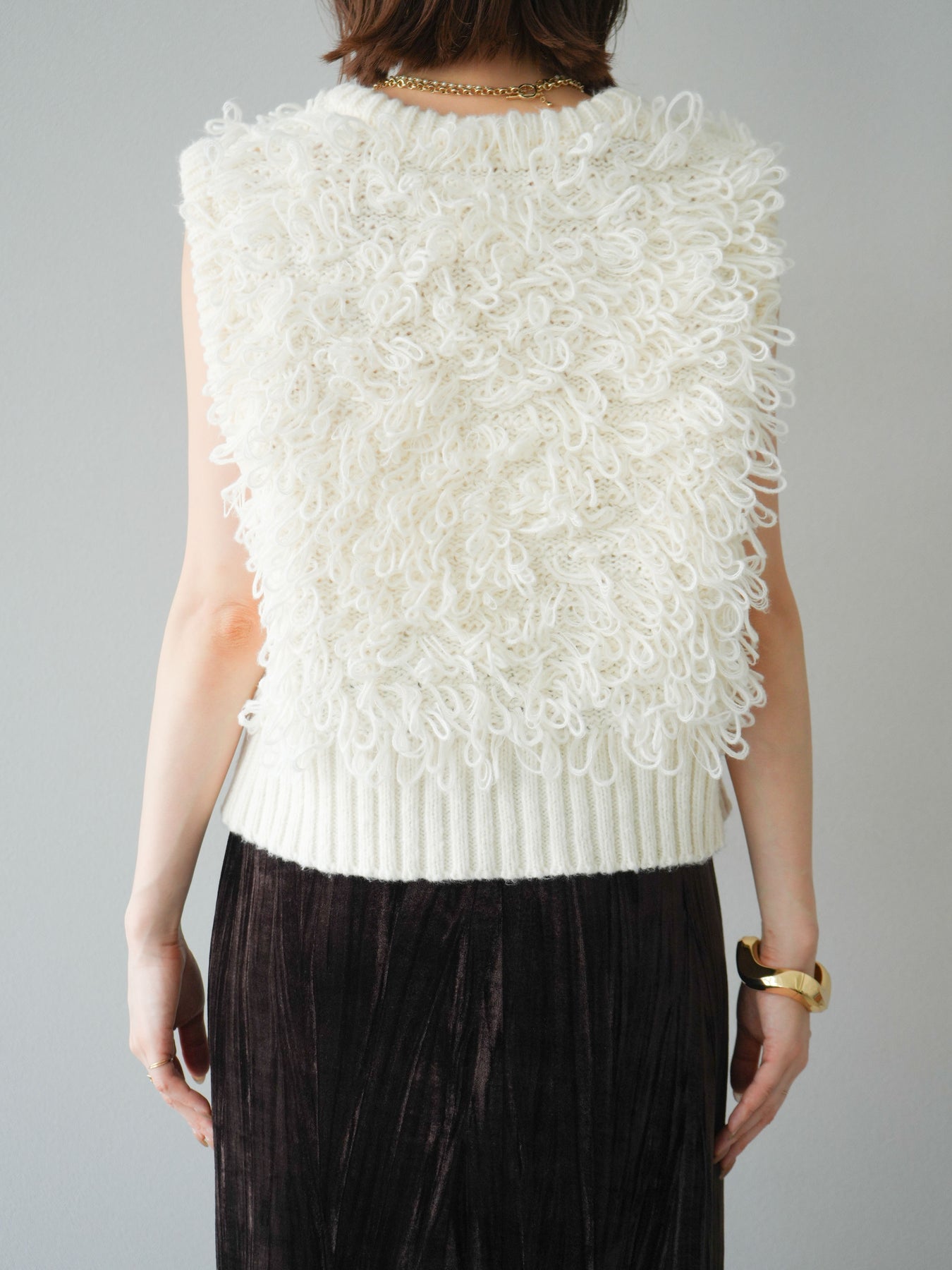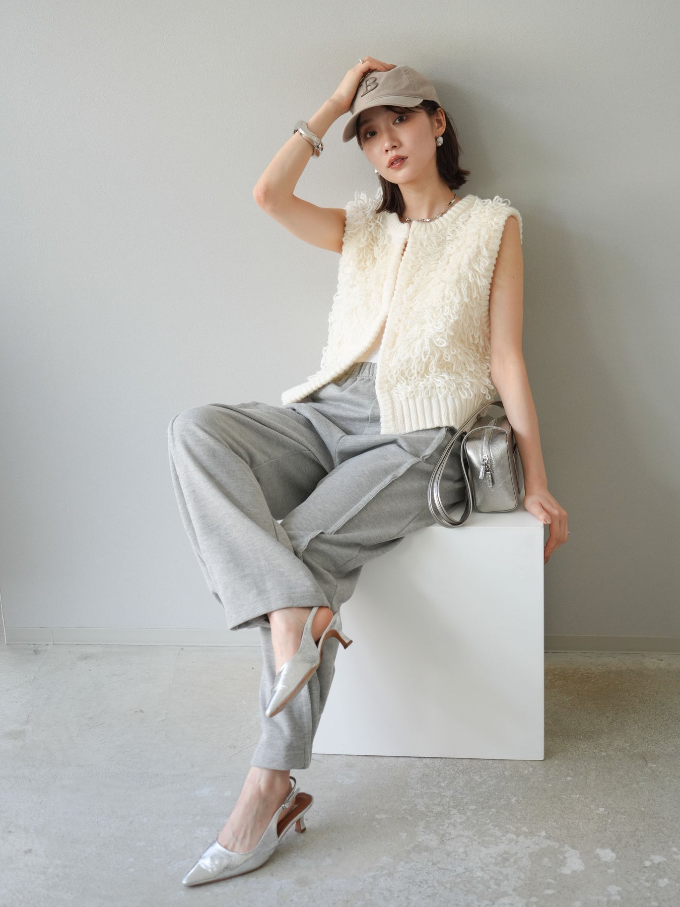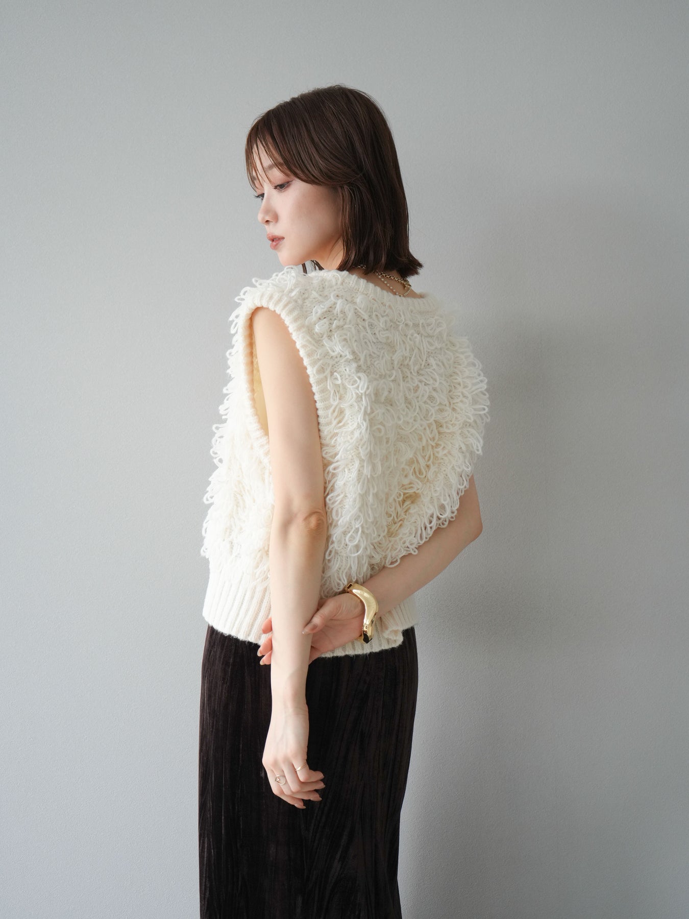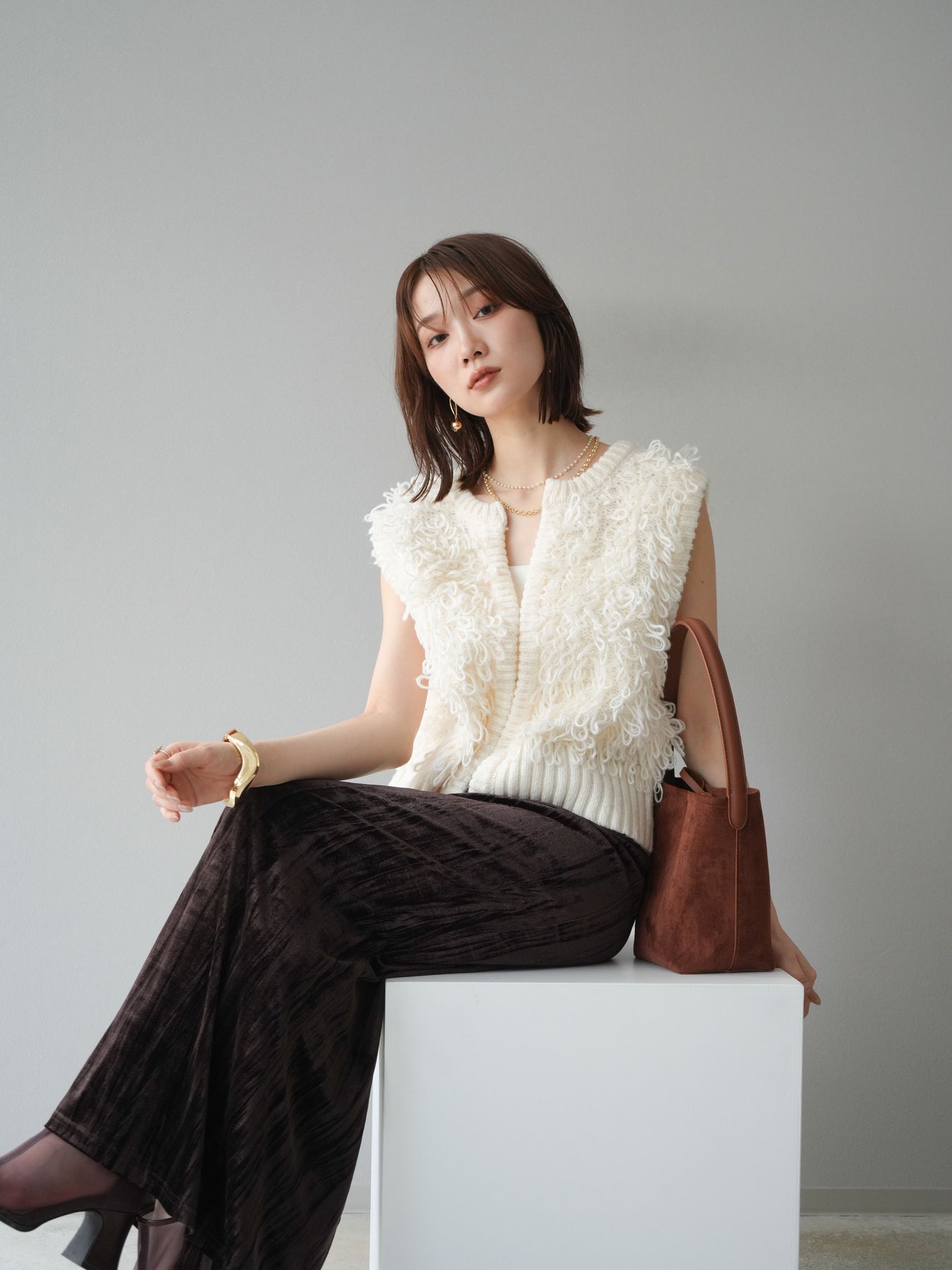 立体感のあるループ編みが印象的なニットベスト。フロントはホック留めで軽やかに羽織れる仕様になっており、カットソーやシャツとのレイヤードで表情豊かなスタイリングが楽しめます。存在感がありながらも合わせやすく、シーズンを通して活躍するアイテムです。 ※ボトムス、キャミソール(インナー)以外の商品は一律でインナーは付属していません。