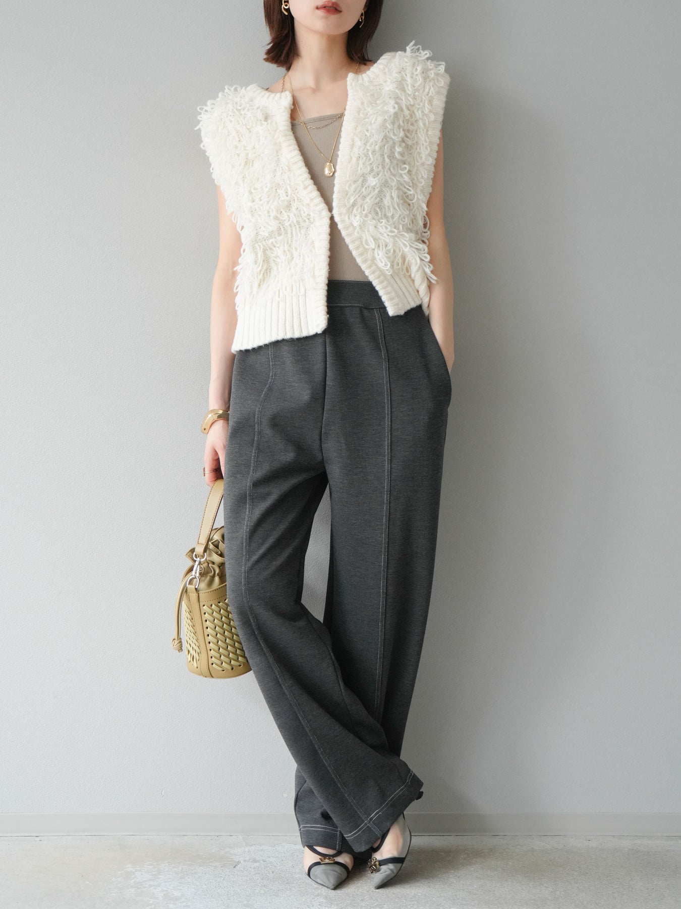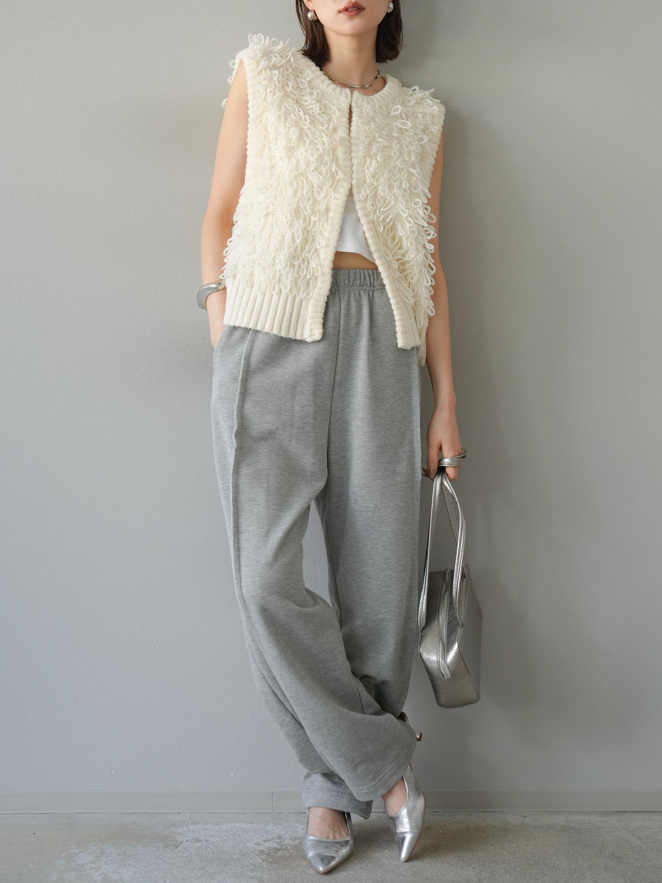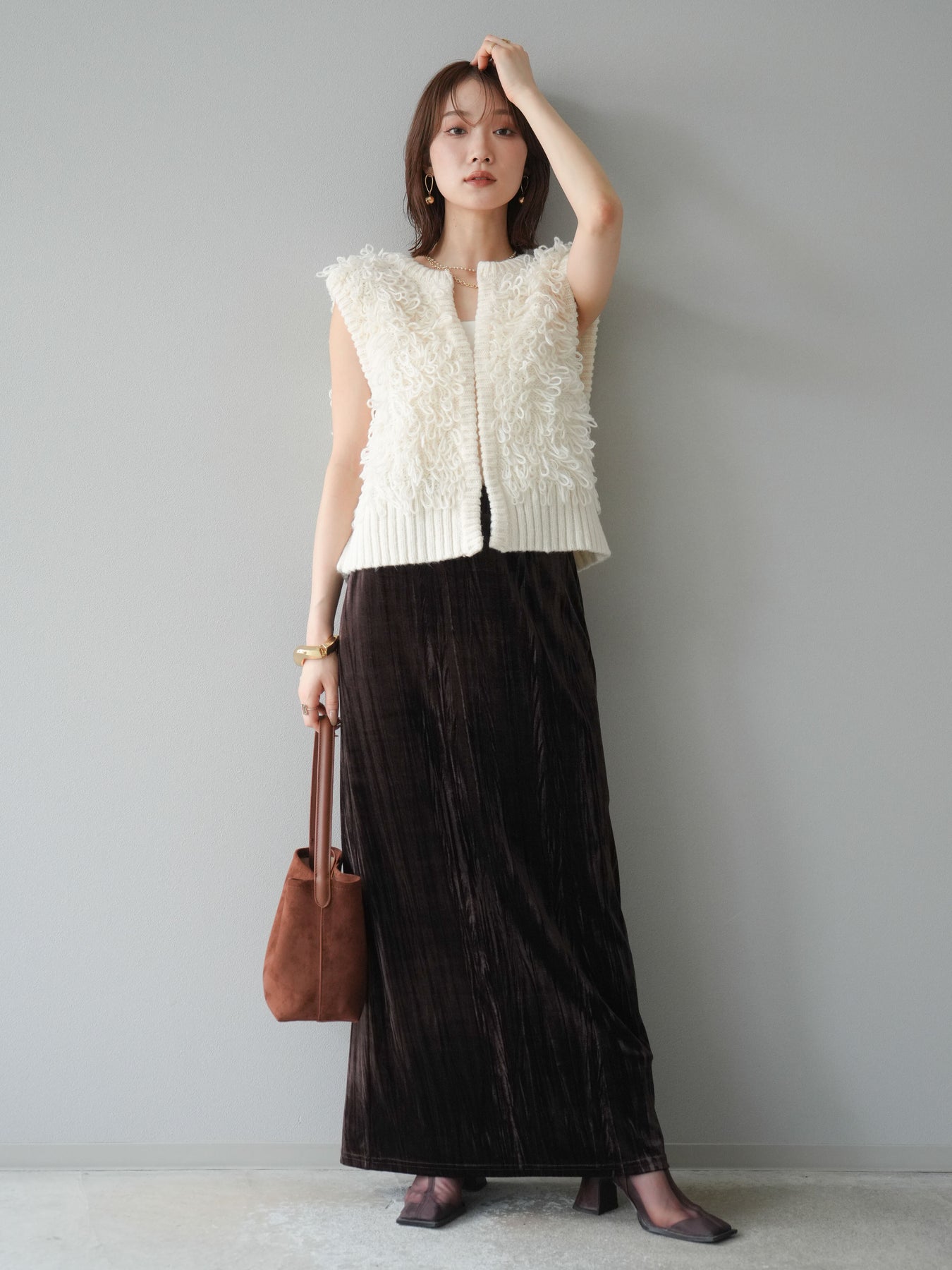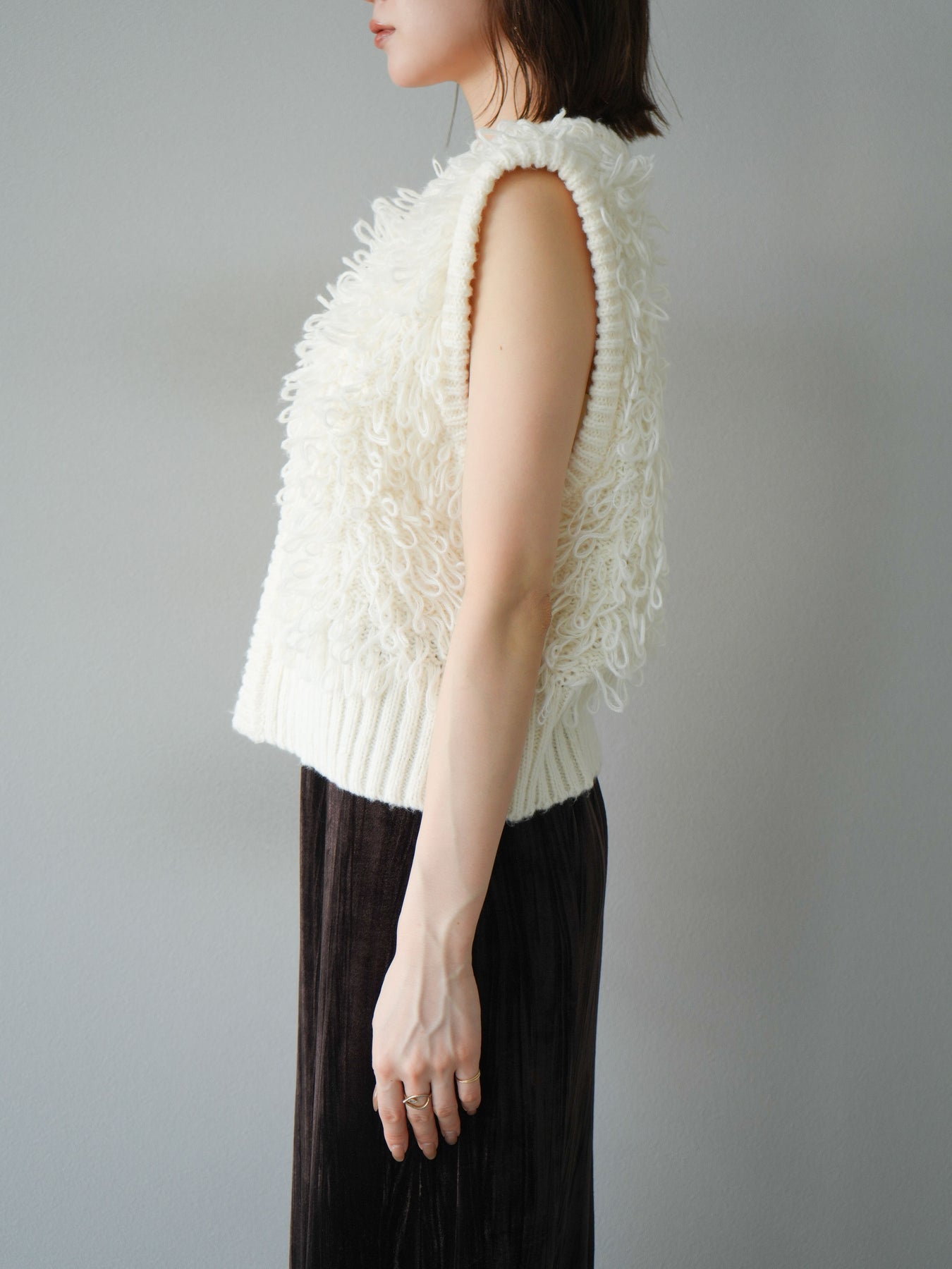 立体感のあるループ編みが印象的なニットベスト。フロントはホック留めで軽やかに羽織れる仕様になっており、カットソーやシャツとのレイヤードで表情豊かなスタイリングが楽しめます。存在感がありながらも合わせやすく、シーズンを通して活躍するアイテムです。 ※ボトムス、キャミソール(インナー)以外の商品は一律でインナーは付属していません。