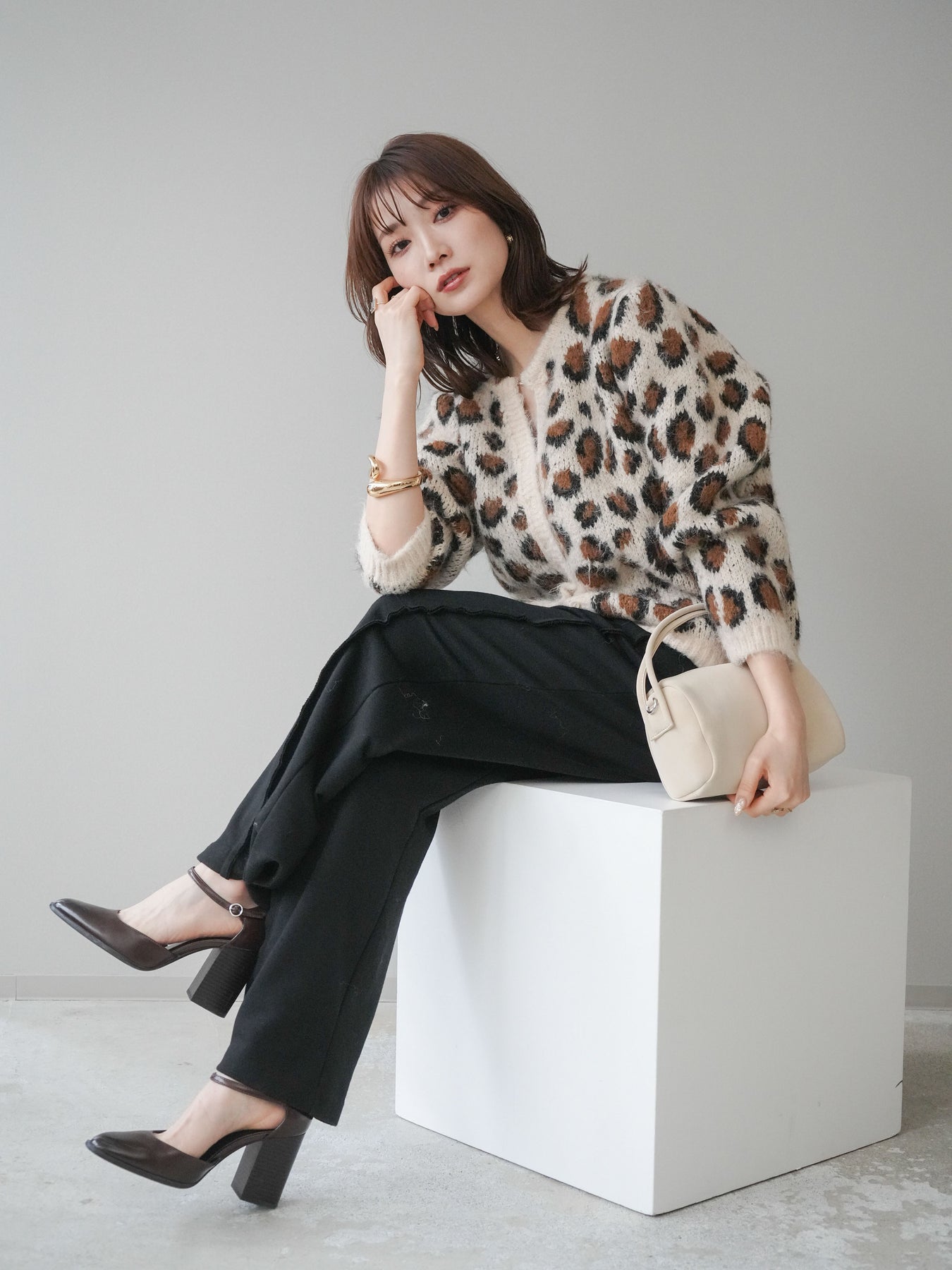 ふんわりとしたモヘアタッチの風合いが季節感を引き立てるレオパード柄ニットカーディガン。程よい厚みで暖かさがありつつ、軽やかな着心地を叶える一枚です。存在感のある柄デザインながらも着ぶくれしにくいバランスに仕上げており、羽織るだけでスタイリング全体がぐっと華やぐのが魅力。カジュアルからフェミニンまで幅広いコーデに取り入れやすく、シンプルなアイテムに合わせるだけでこなれたムードを演出できます。 ※ボトムス、キャミソール(インナー)以外の商品は一律でインナーは付属していません。