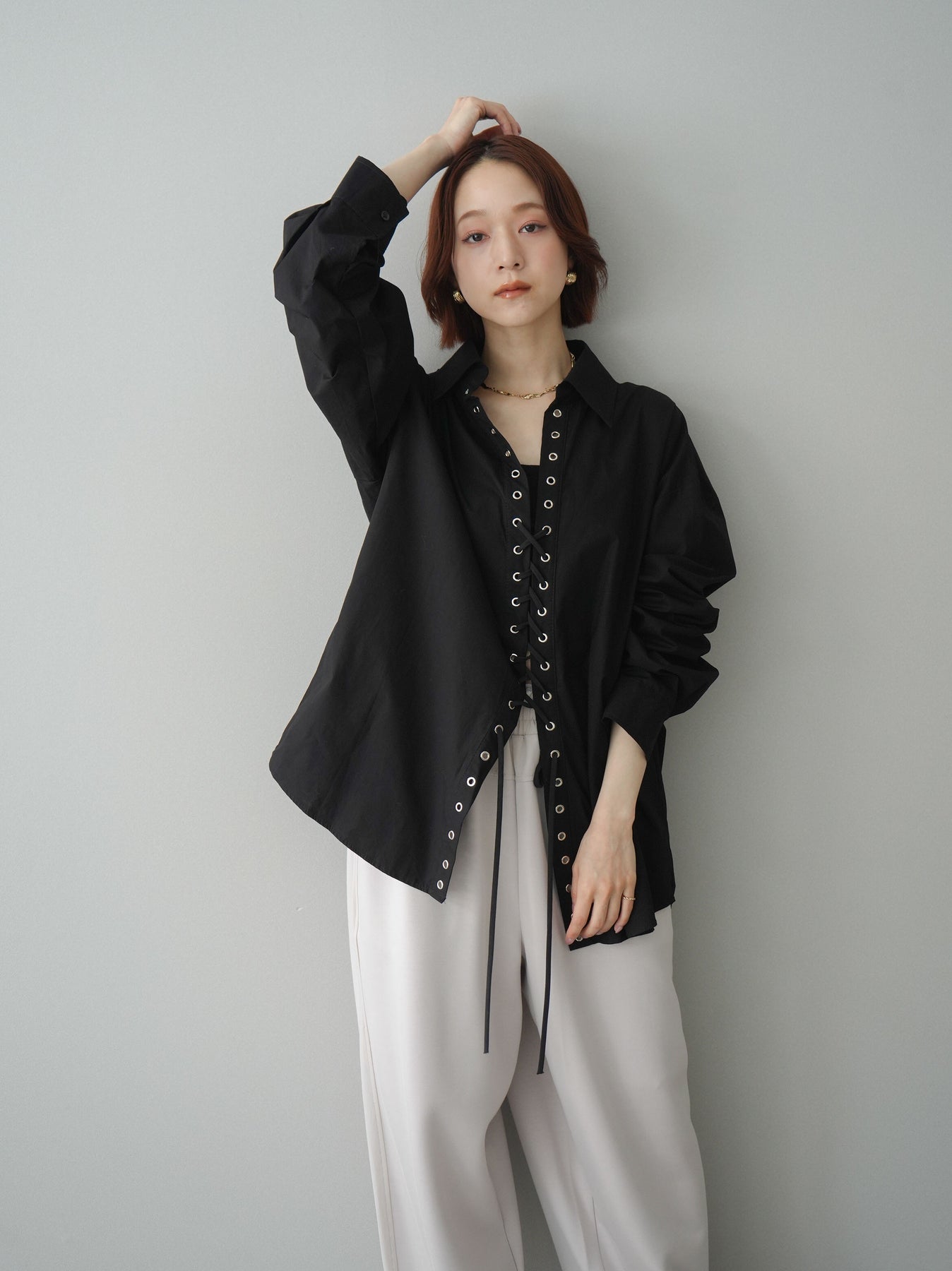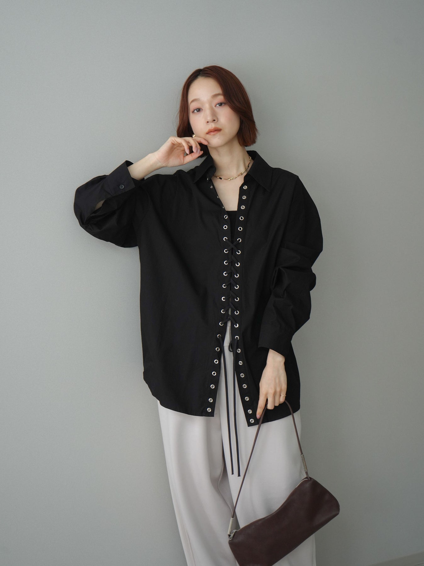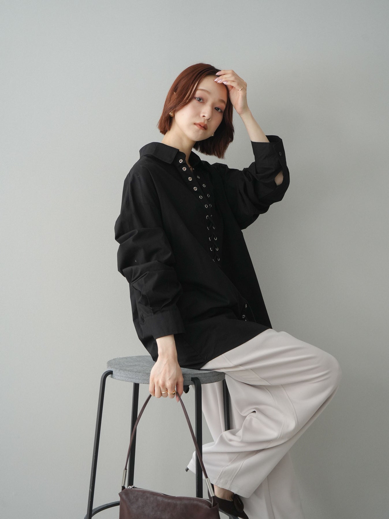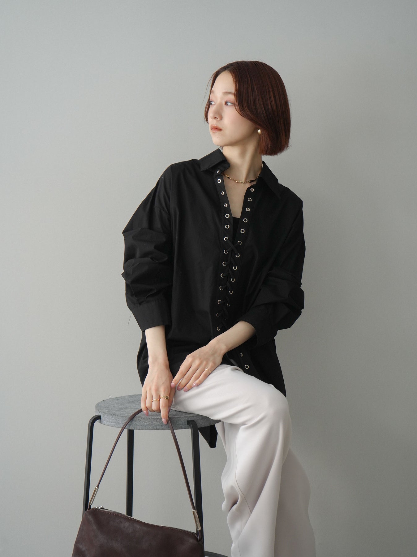 フロントのレースアップデザインが目を惹く主役級ブラウス。アイレットを施した縦ラインがスタイリングに程よいエッジを加えつつ、ゆとりのあるシルエットで抜け感のあるバランスに仕上げています。紐の結び方や開き具合で印象をアレンジでき、1枚ではもちろん羽織りとしても活躍。きれいめからモードな着こなしまで幅広く合わせやすいアイテムです。 ※ボトムス、キャミソール(インナー)以外の商品は一律でインナーは付属していません