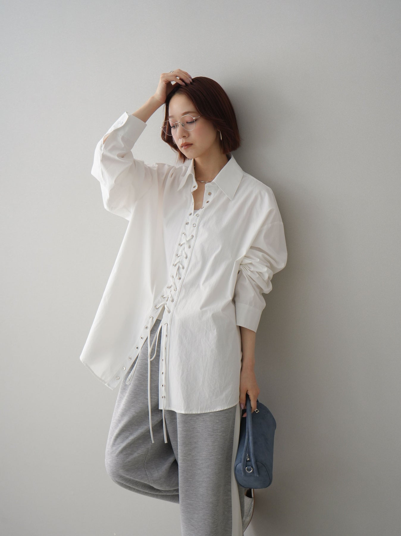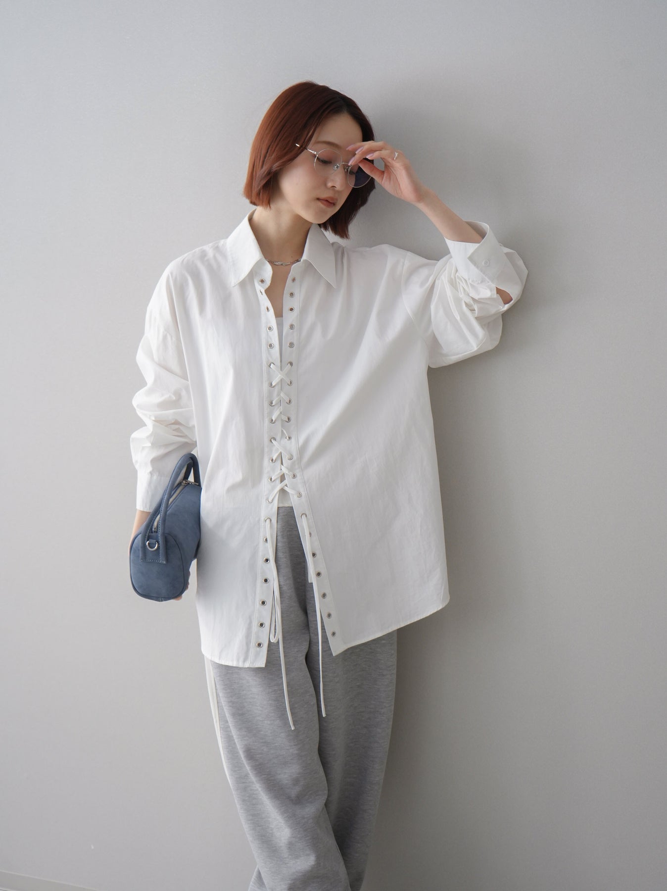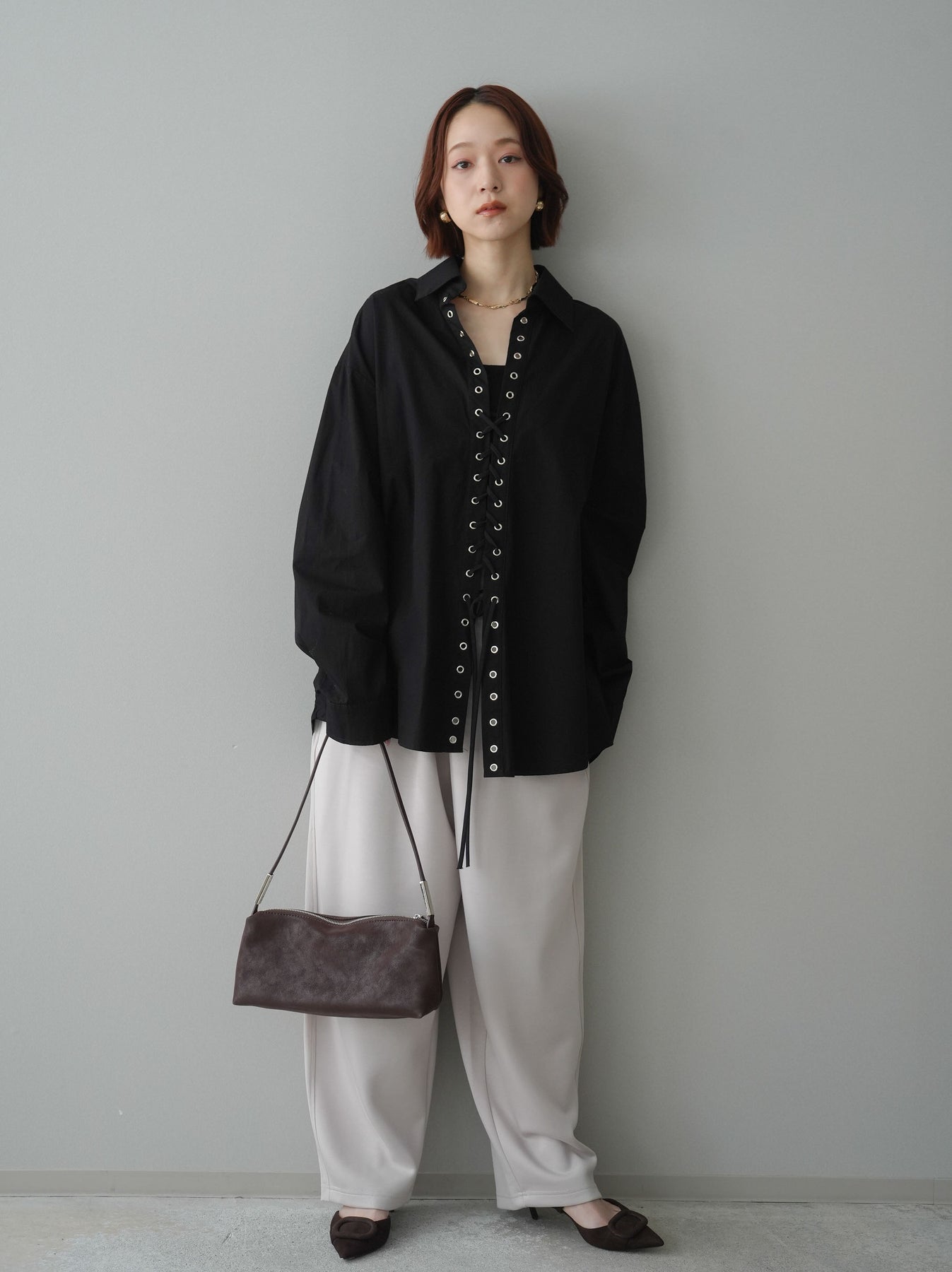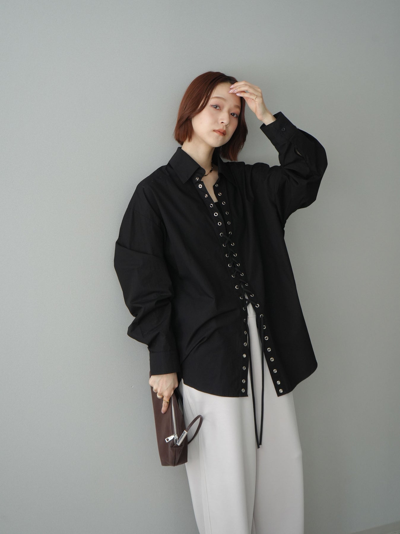 フロントのレースアップデザインが目を惹く主役級ブラウス。アイレットを施した縦ラインがスタイリングに程よいエッジを加えつつ、ゆとりのあるシルエットで抜け感のあるバランスに仕上げています。紐の結び方や開き具合で印象をアレンジでき、1枚ではもちろん羽織りとしても活躍。きれいめからモードな着こなしまで幅広く合わせやすいアイテムです。 ※ボトムス、キャミソール(インナー)以外の商品は一律でインナーは付属していません
