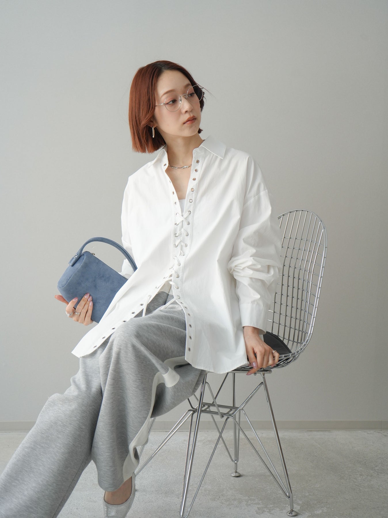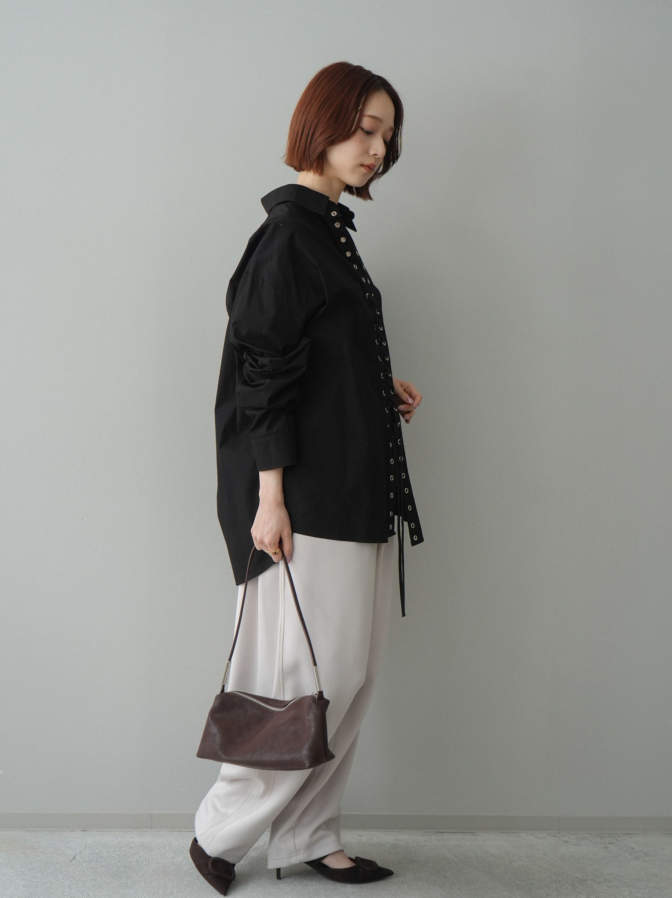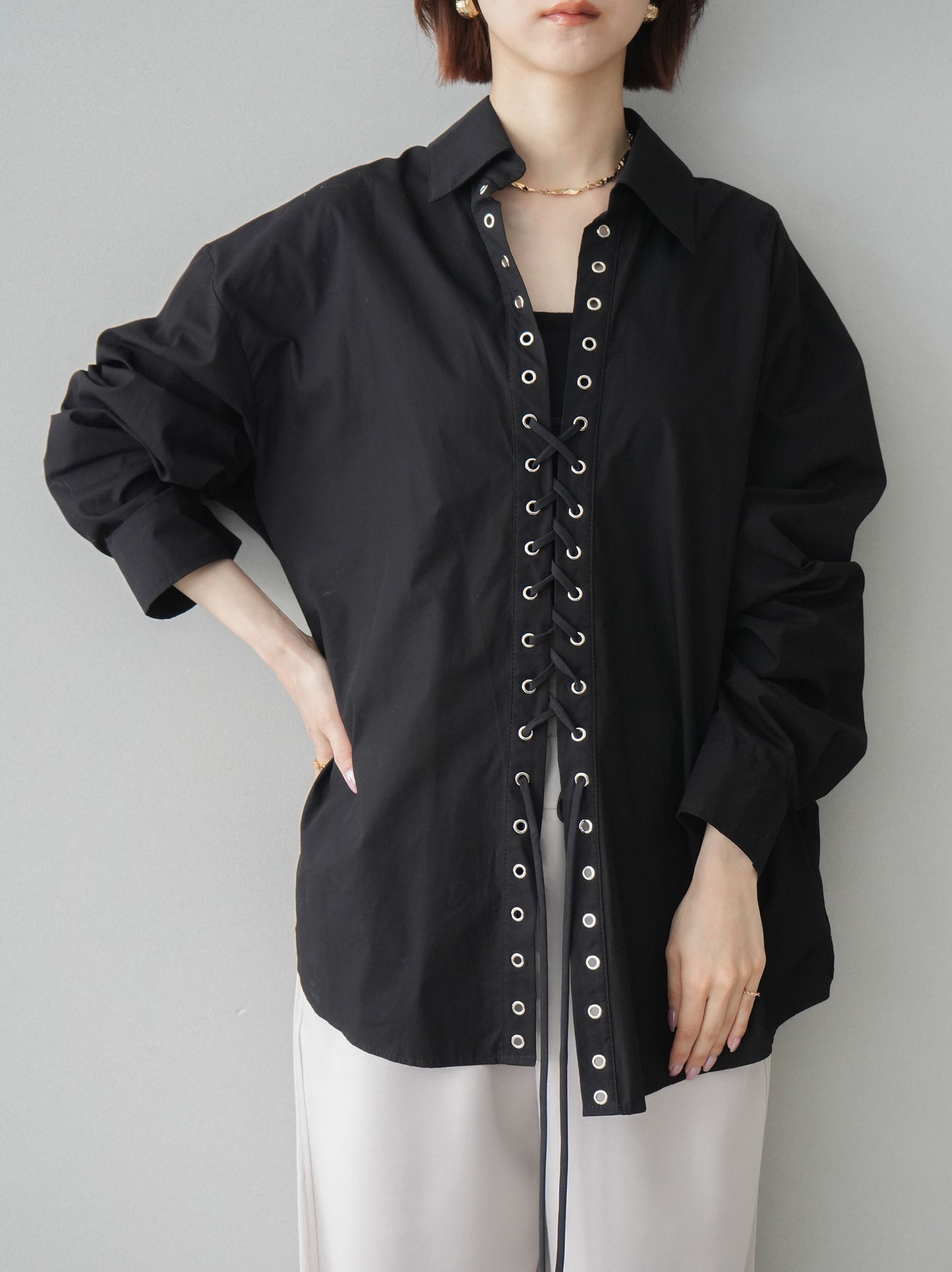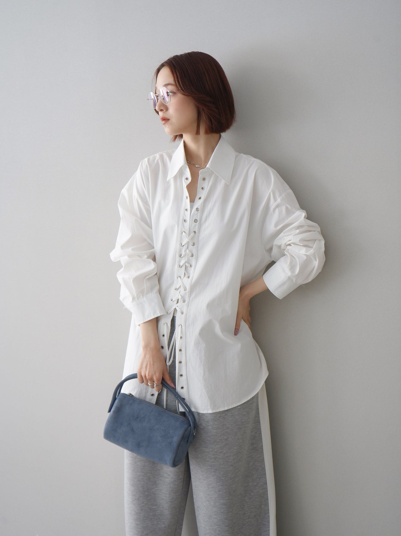 フロントのレースアップデザインが目を惹く主役級ブラウス。アイレットを施した縦ラインがスタイリングに程よいエッジを加えつつ、ゆとりのあるシルエットで抜け感のあるバランスに仕上げています。紐の結び方や開き具合で印象をアレンジでき、1枚ではもちろん羽織りとしても活躍。きれいめからモードな着こなしまで幅広く合わせやすいアイテムです。 ※ボトムス、キャミソール(インナー)以外の商品は一律でインナーは付属していません