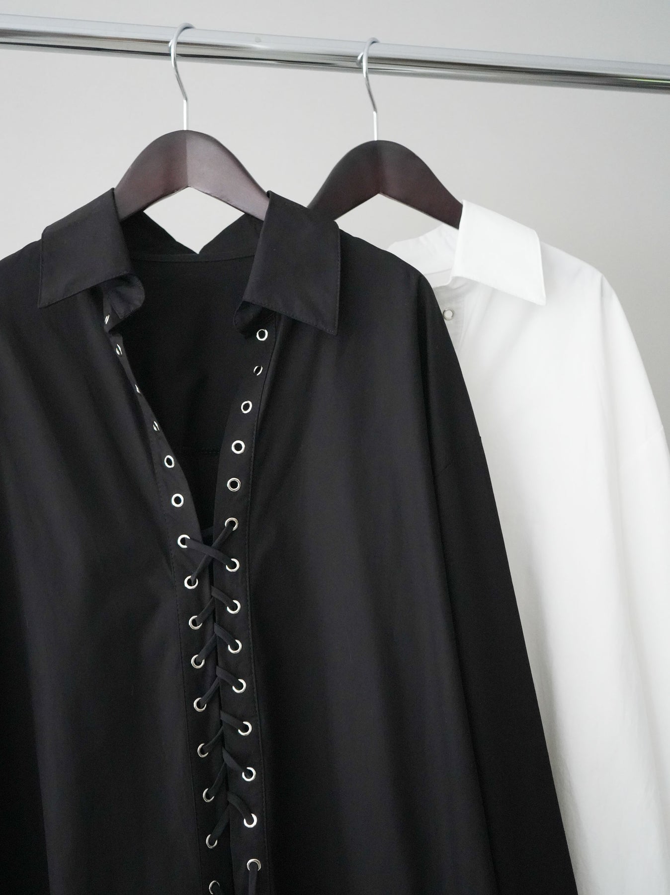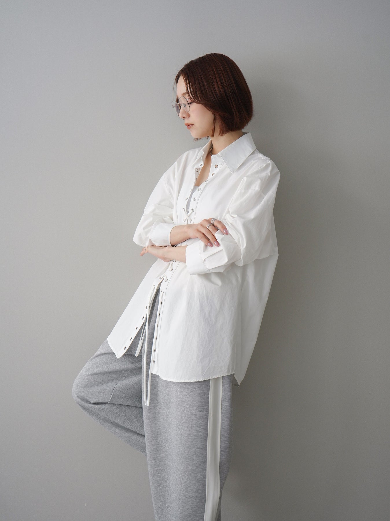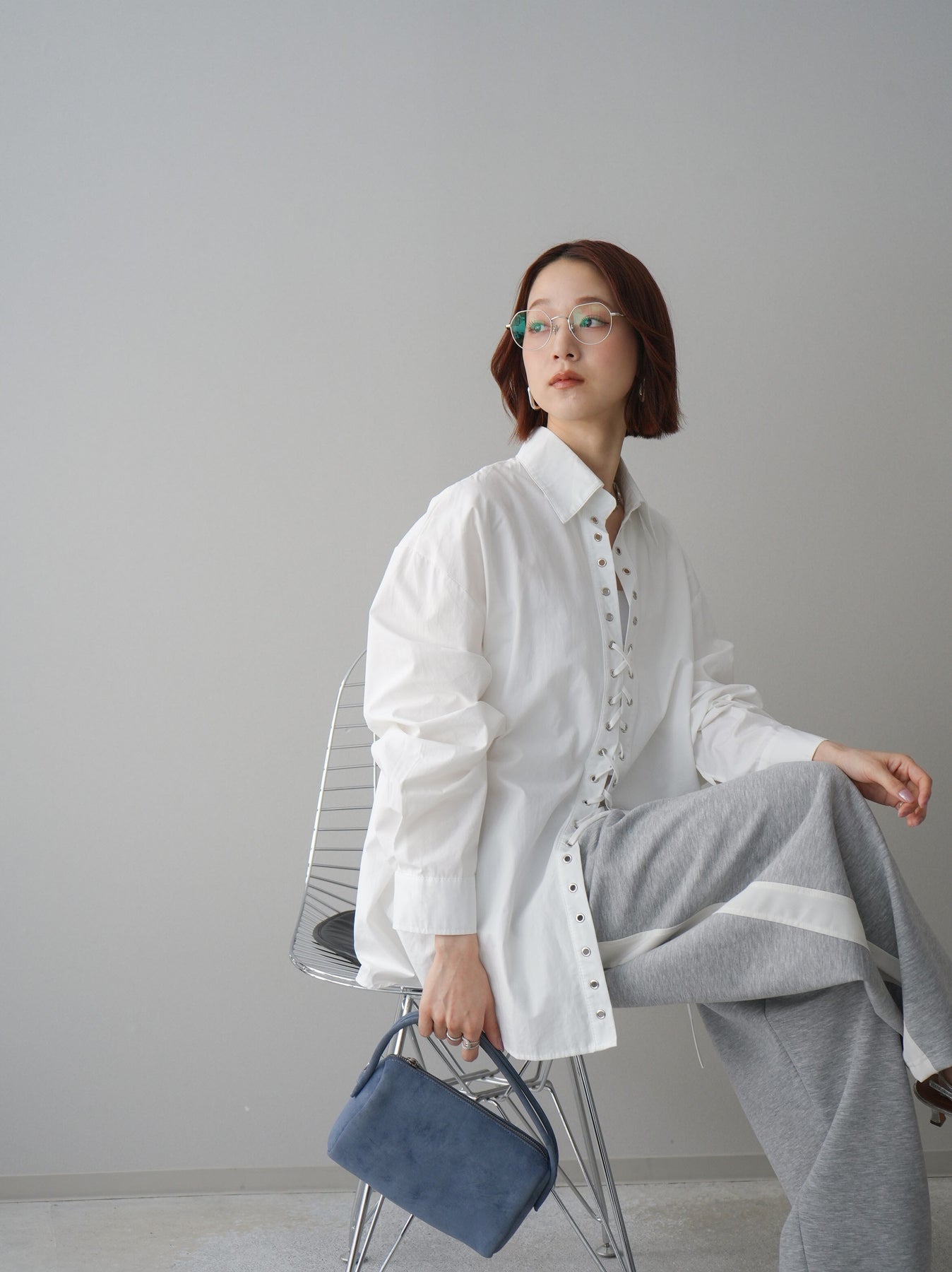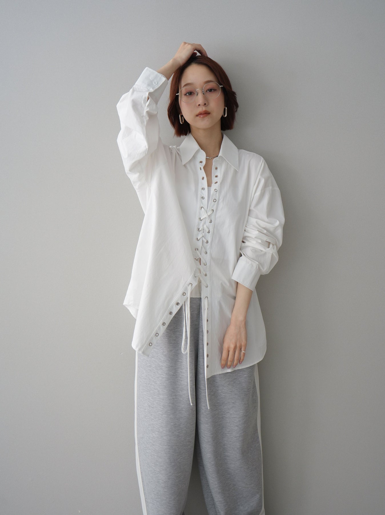 フロントのレースアップデザインが目を惹く主役級ブラウス。アイレットを施した縦ラインがスタイリングに程よいエッジを加えつつ、ゆとりのあるシルエットで抜け感のあるバランスに仕上げています。紐の結び方や開き具合で印象をアレンジでき、1枚ではもちろん羽織りとしても活躍。きれいめからモードな着こなしまで幅広く合わせやすいアイテムです。 ※ボトムス、キャミソール(インナー)以外の商品は一律でインナーは付属していません