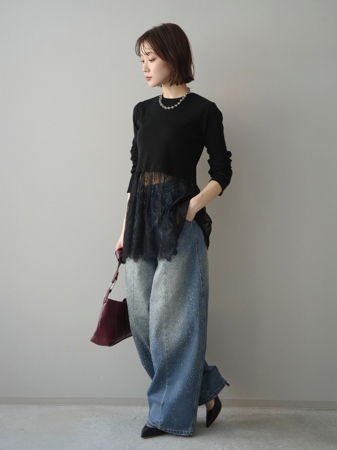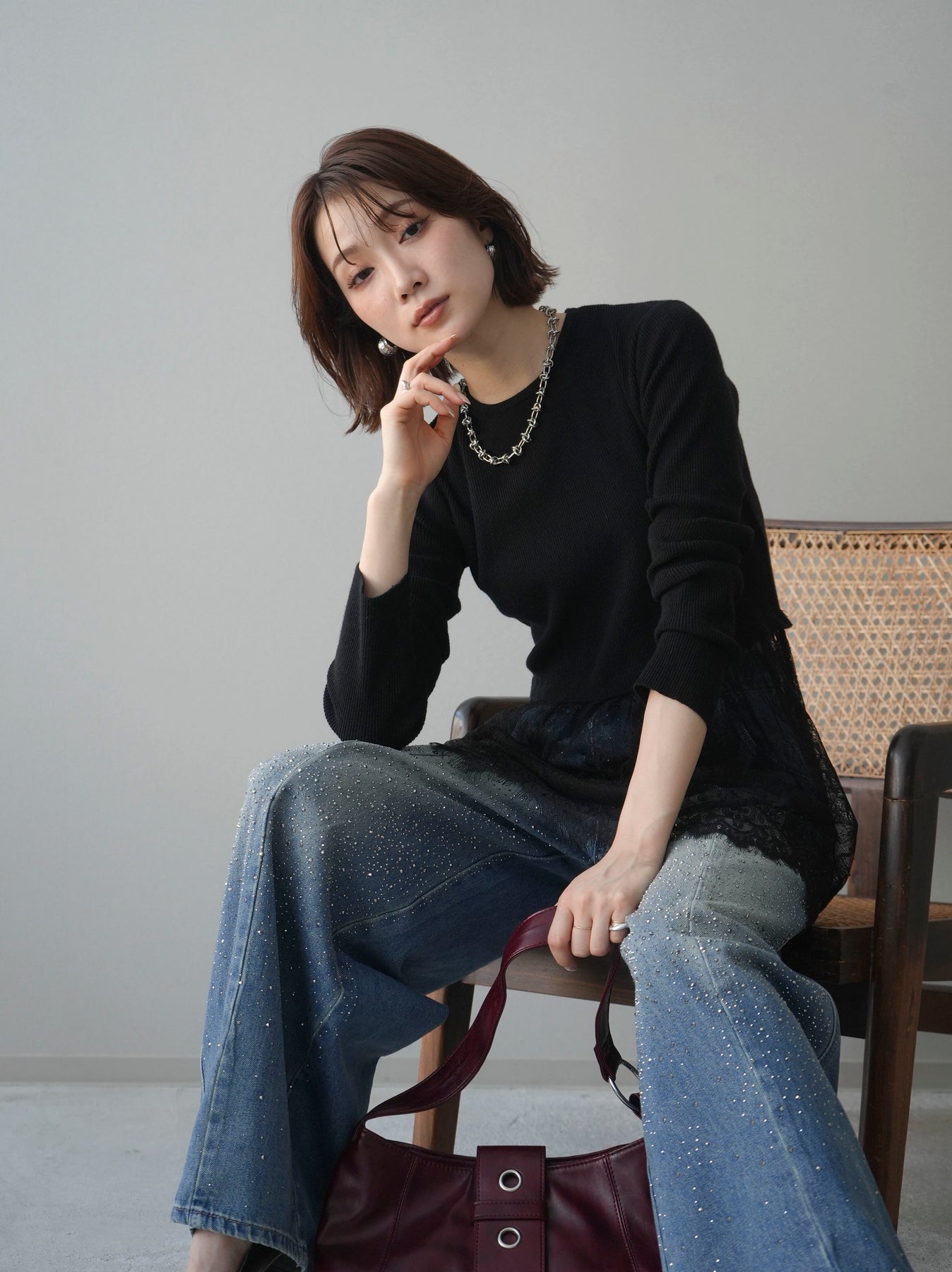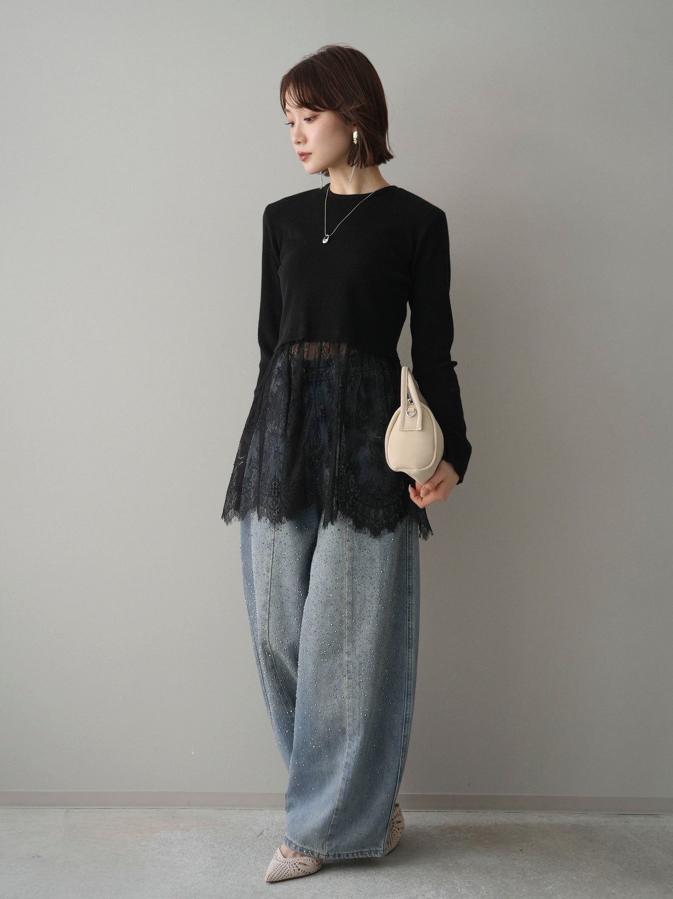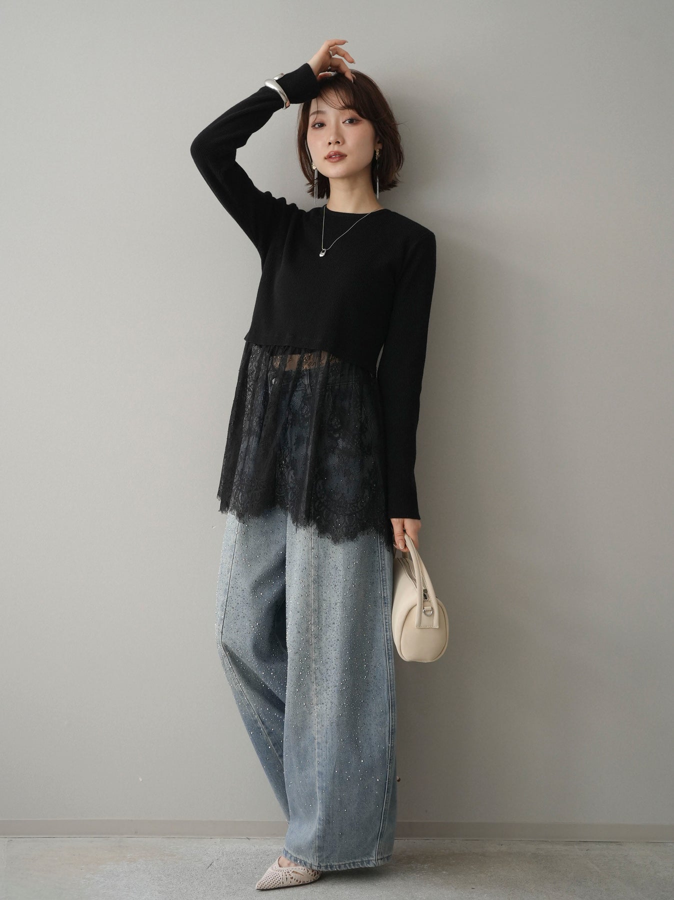 [SET]クルーネックレースドッキングリブニットトップス+フロントビジューカーブデニムパンツ(2set)