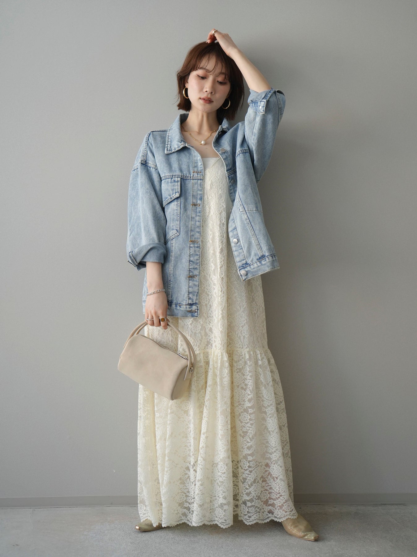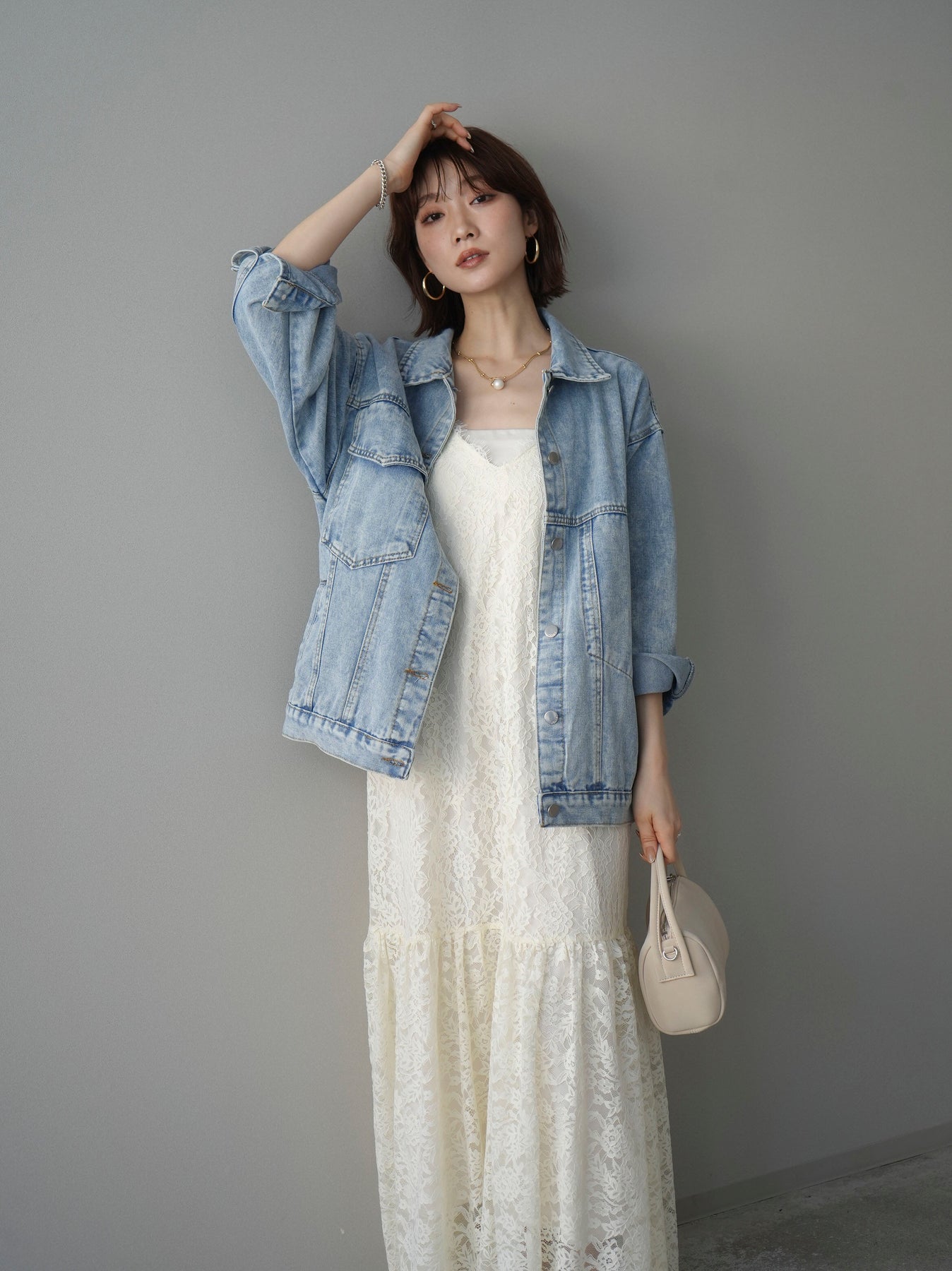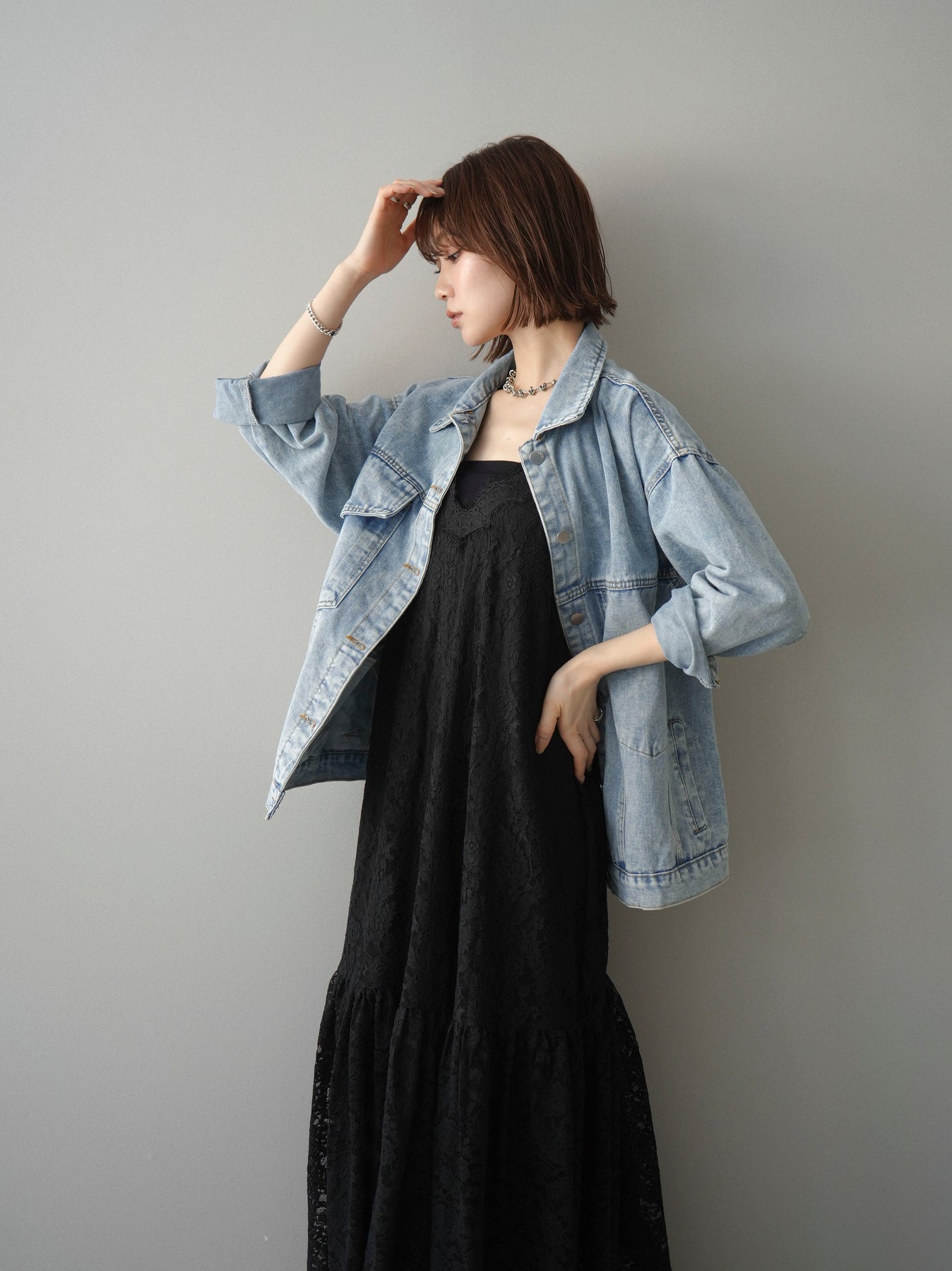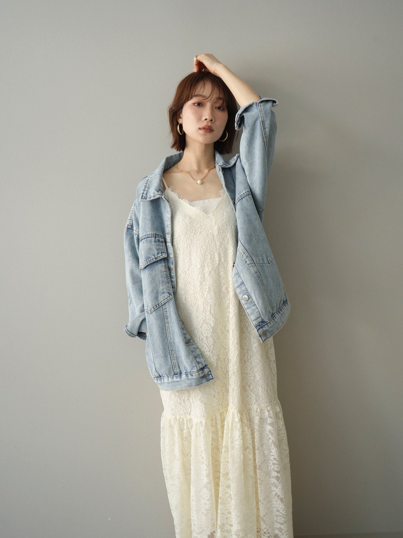 [SET]ギャザー切替レースキャミワンピース+デザインBIGポケットオーバーデニムジャケット(2set)