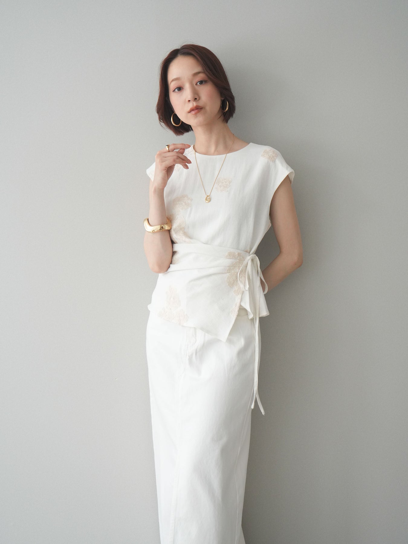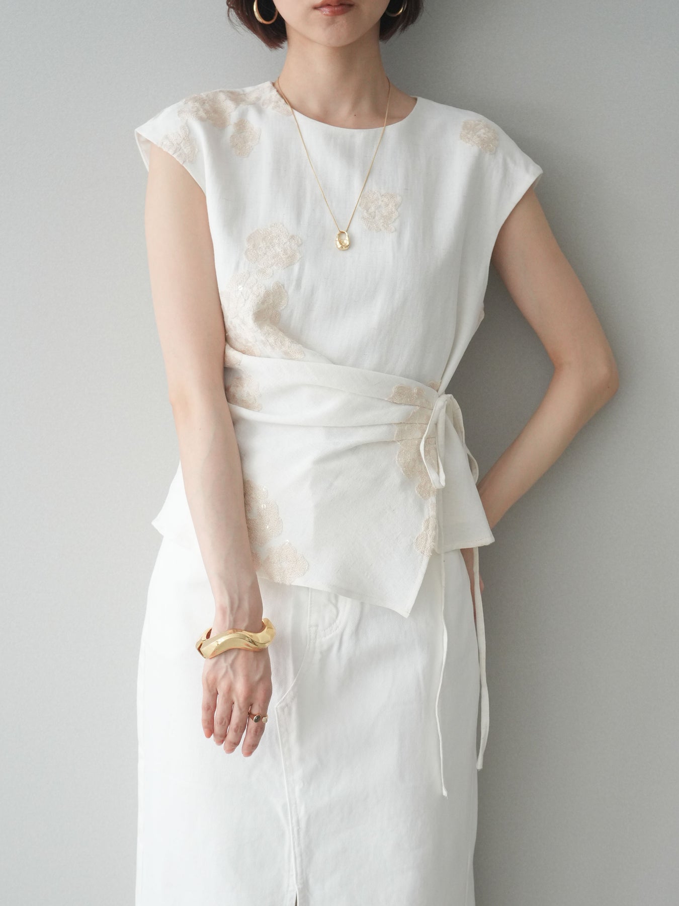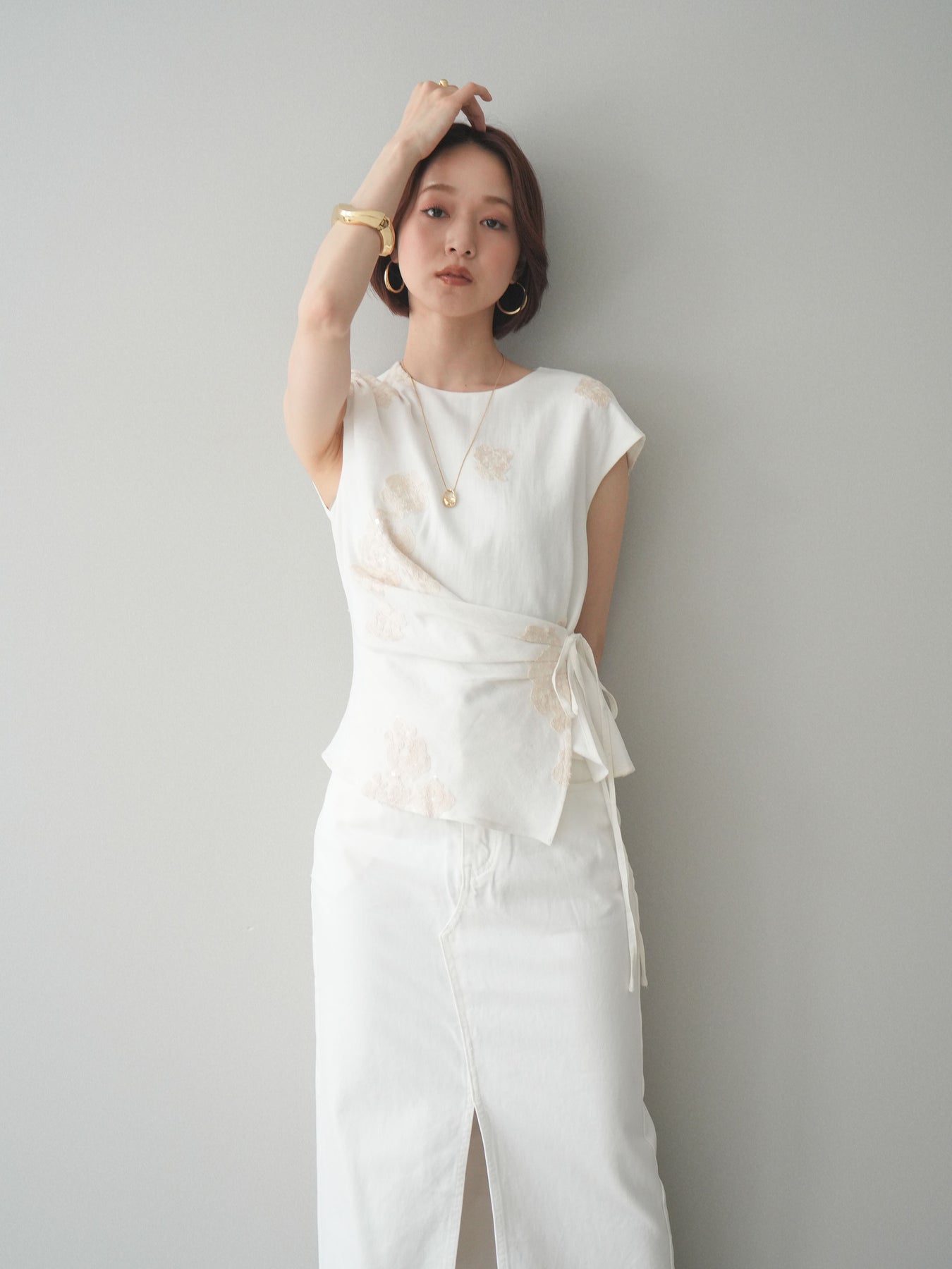 やわらかな風合いのリネンタッチ素材に、立体感のあるフラワージャガードをあしらったトップス。ナチュラルな表情と華やかさを兼ね備えた一枚です。サイドのラップデザインとリボンディテールがウエストラインにニュアンスを生み、すっきりとした印象に。アシンメトリーなヘムラインが動きをプラスし、シンプルなボトムスと合わせるだけでコーディネートが完成します。 ※ボトムス、キャミソール(インナー)以外の商品は一律でインナーは付属していません