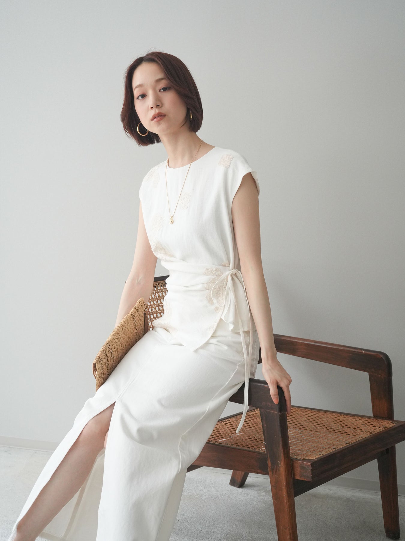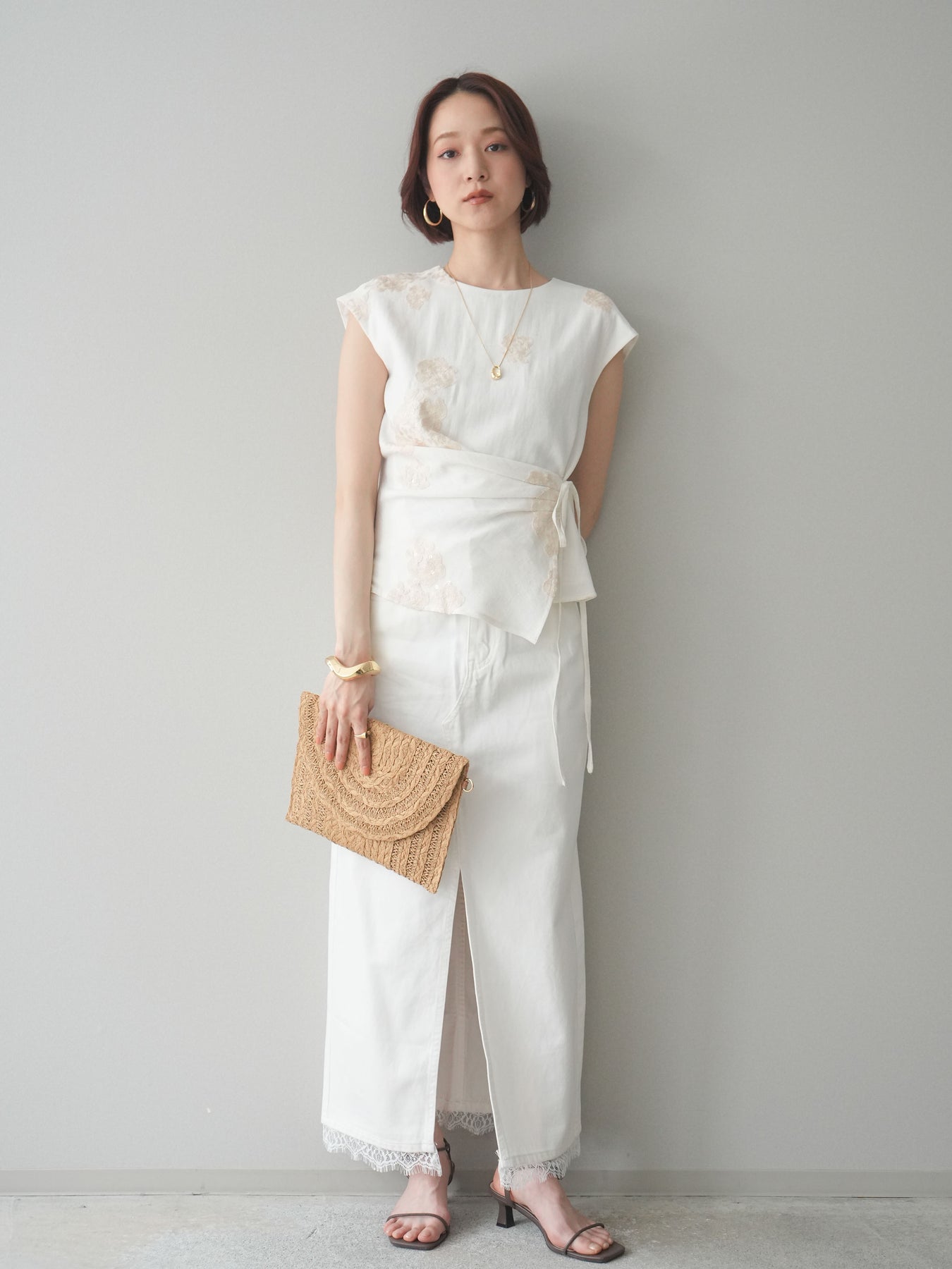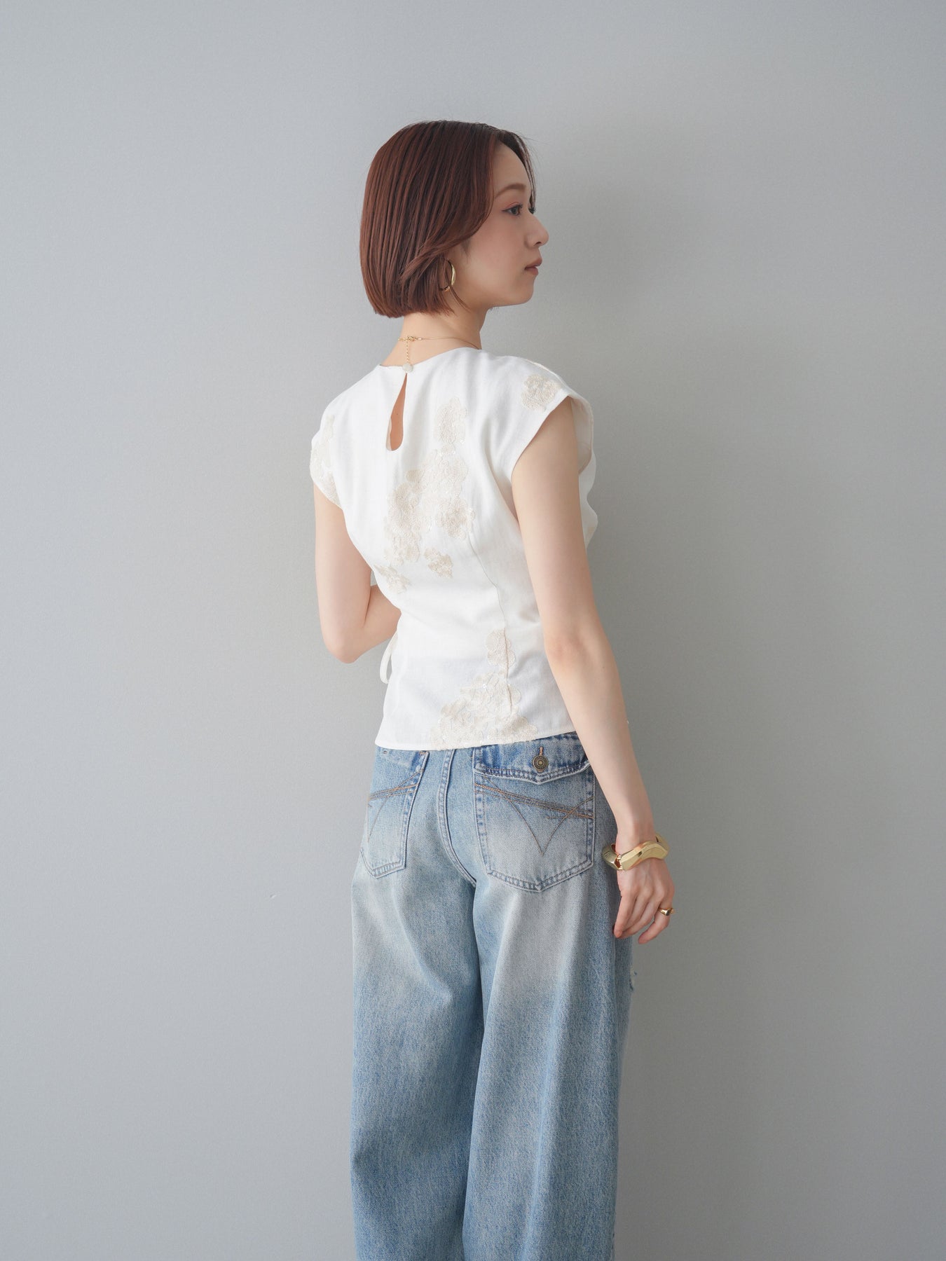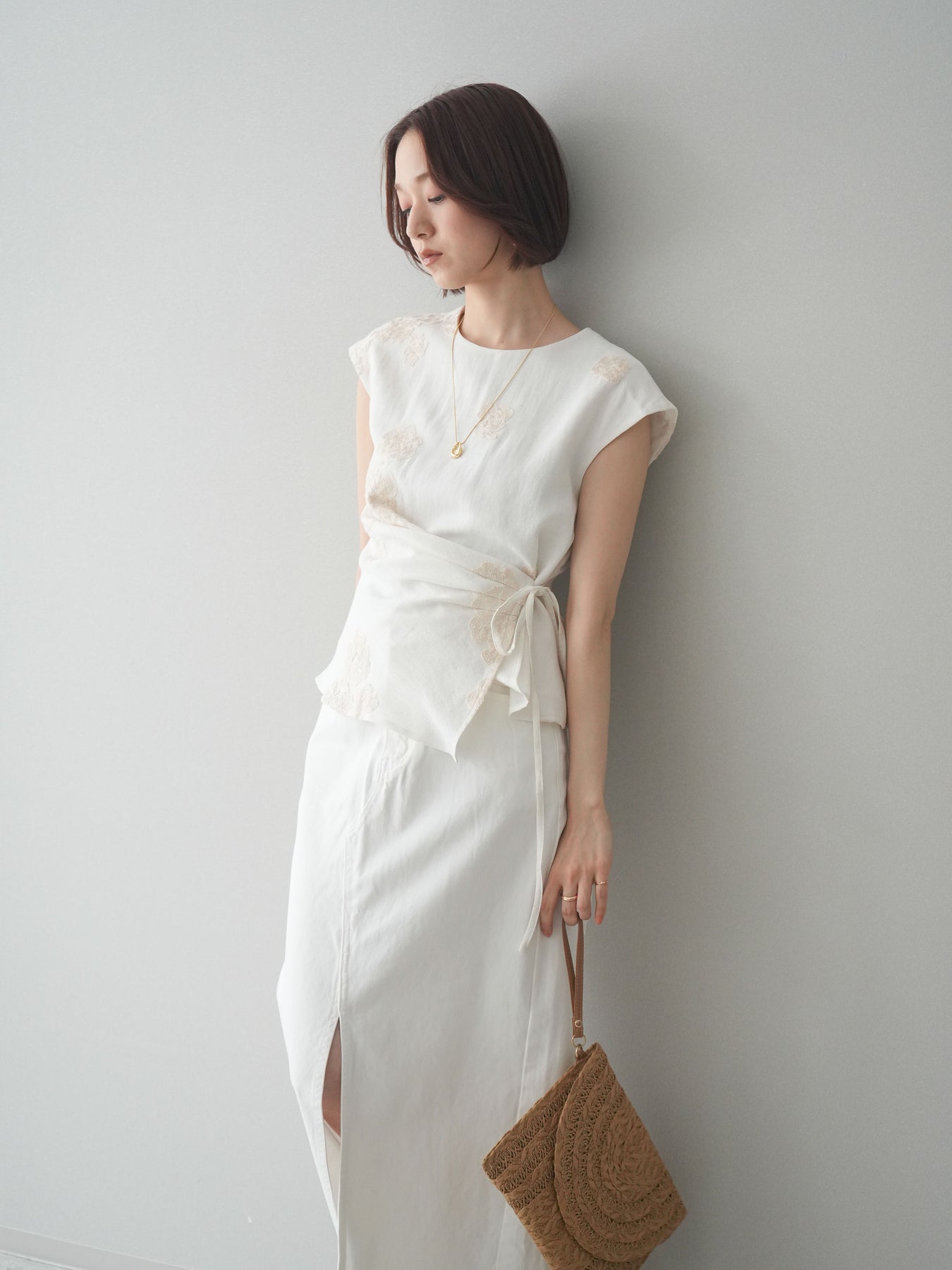 やわらかな風合いのリネンタッチ素材に、立体感のあるフラワージャガードをあしらったトップス。ナチュラルな表情と華やかさを兼ね備えた一枚です。サイドのラップデザインとリボンディテールがウエストラインにニュアンスを生み、すっきりとした印象に。アシンメトリーなヘムラインが動きをプラスし、シンプルなボトムスと合わせるだけでコーディネートが完成します。 ※ボトムス、キャミソール(インナー)以外の商品は一律でインナーは付属していません