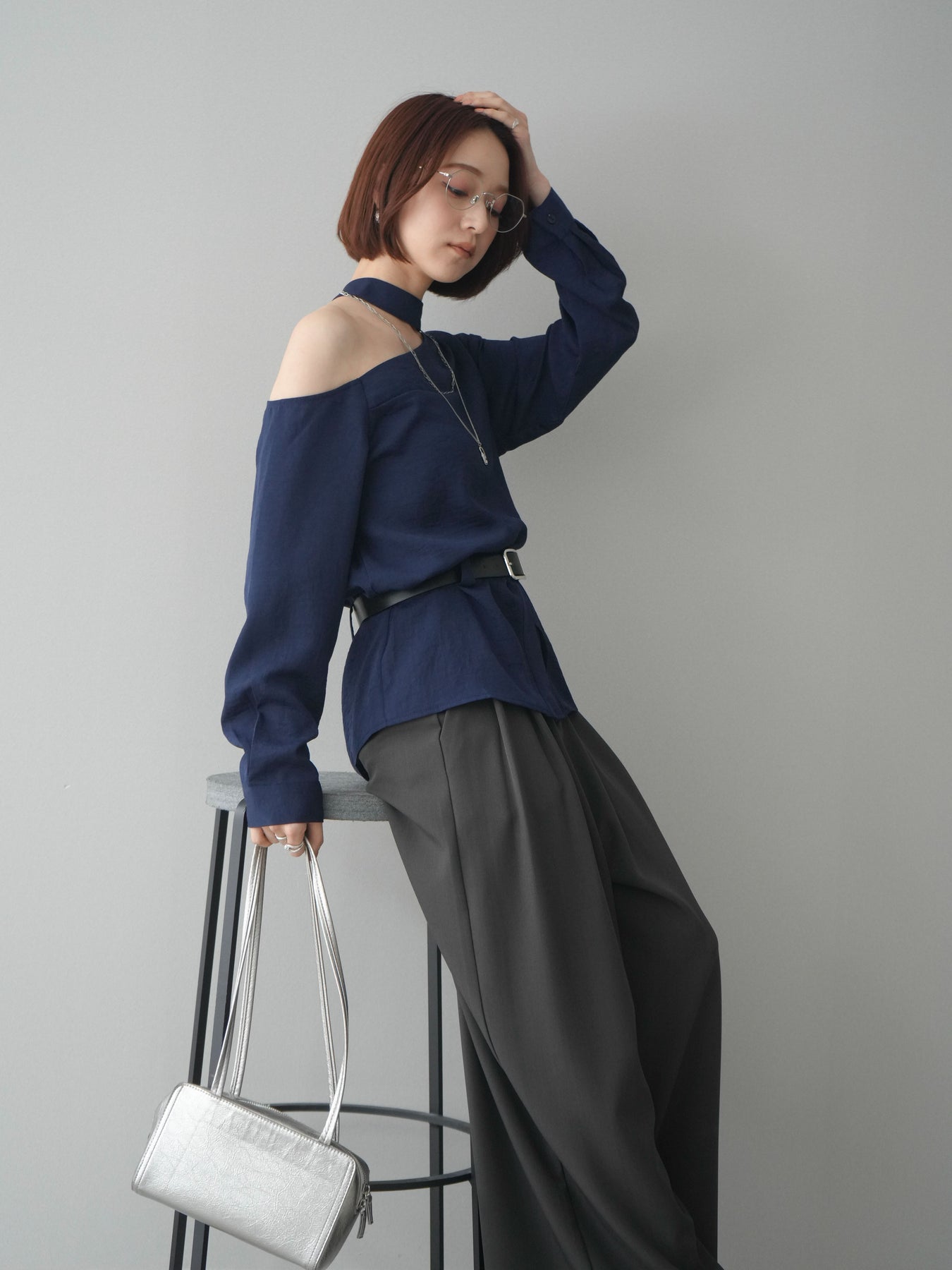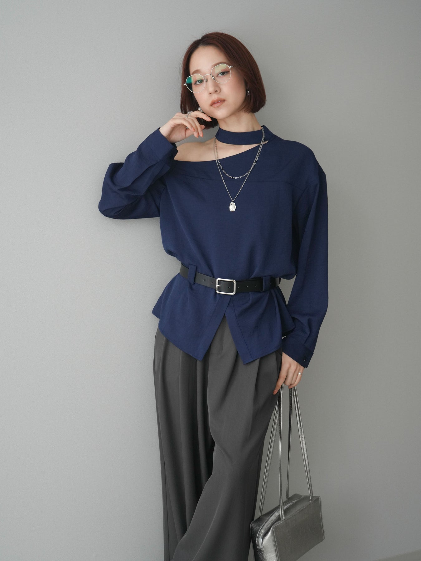 ◆ [予約]ベルト付ワンショルダースリットブラウス