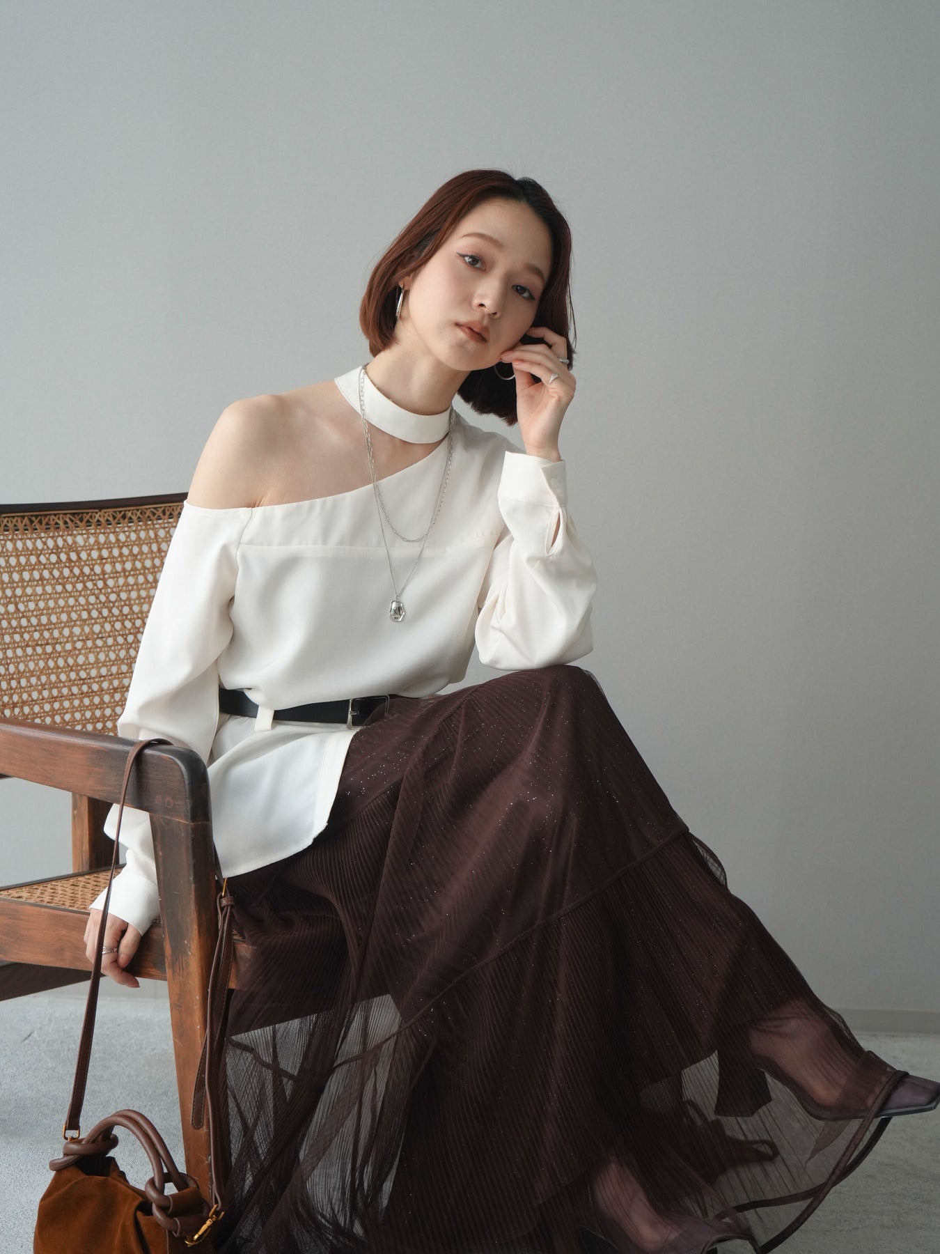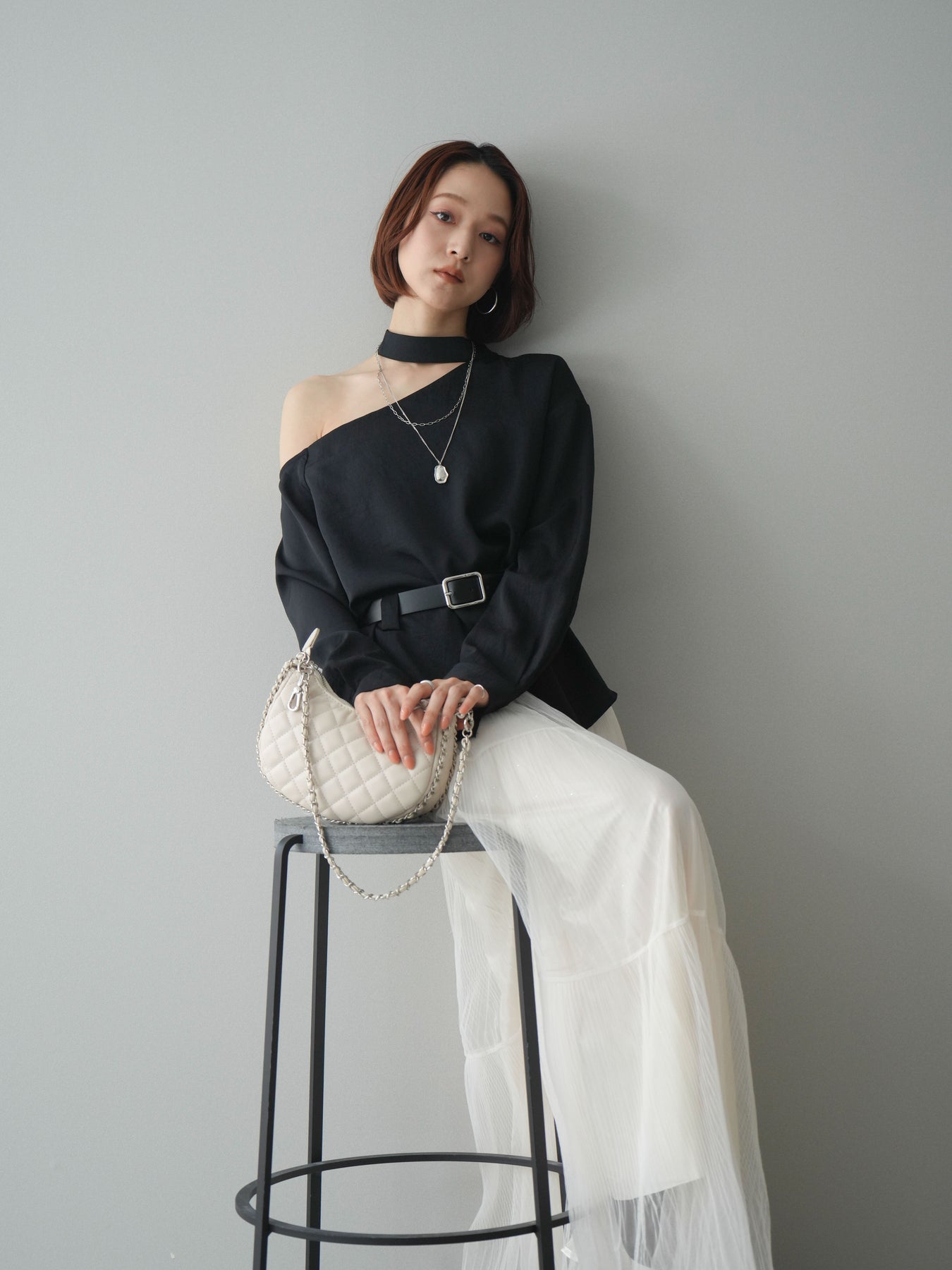 程よい肌見せが叶うワンショルダーデザインが印象的なブラウス。首元のストラップディテールがアクセントとなり、シンプルながらもモードな雰囲気を演出します。ウエストマークできるベルト付きで、シルエットにメリハリをプラス。裾のスリットが抜け感を与え、スカートにもパンツにもバランスよく合わせていただける一枚です。 ※ボトムス、キャミソール(インナー)以外の商品は一律でインナーは付属していません