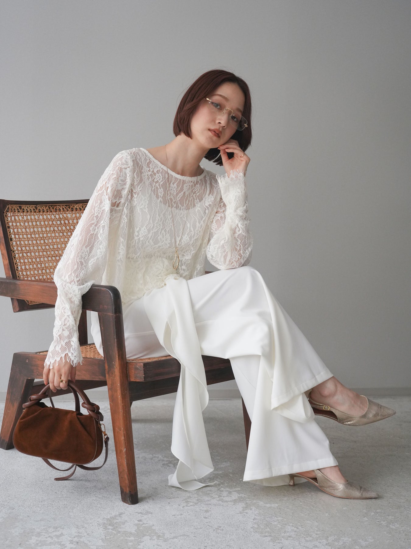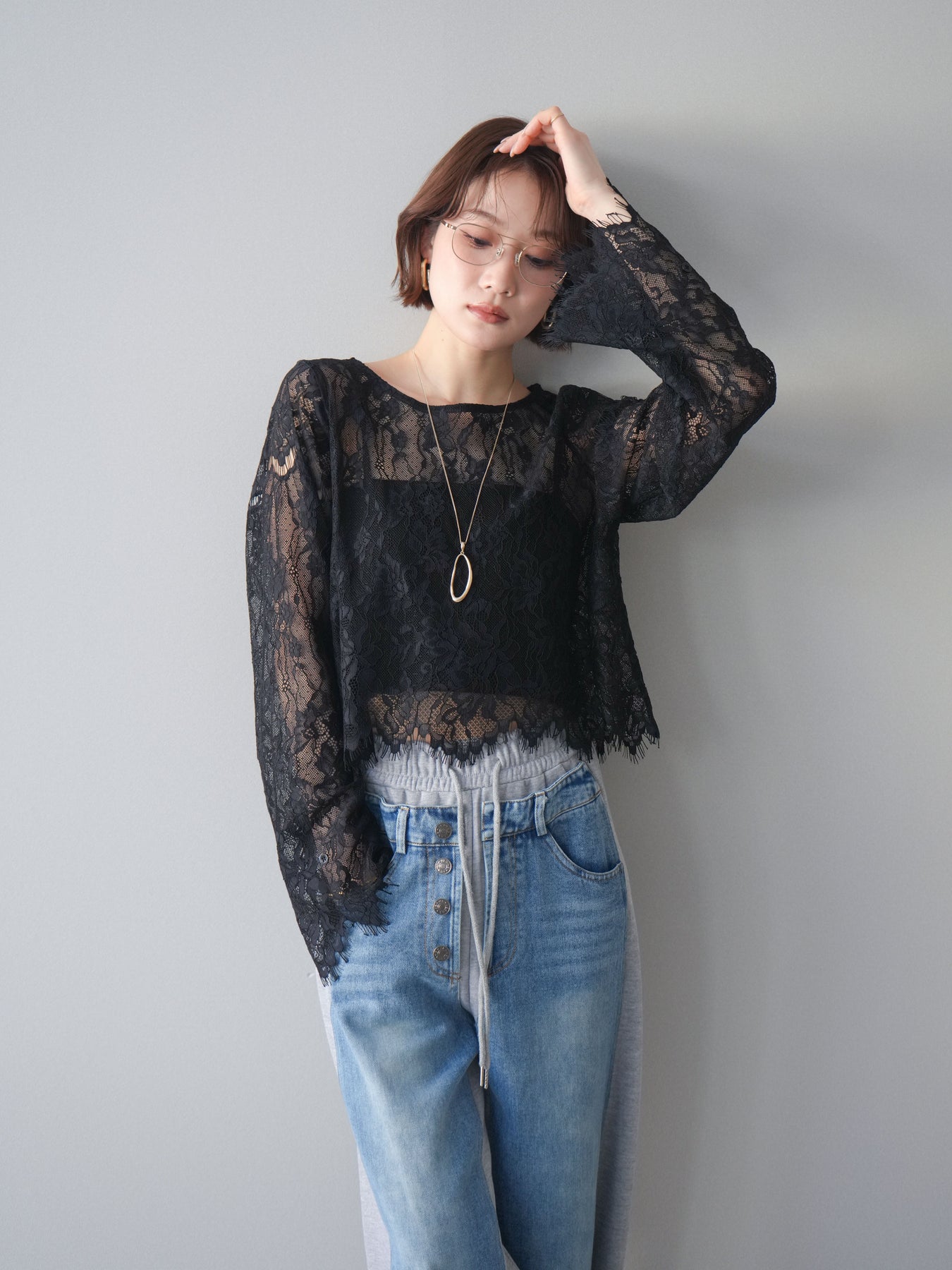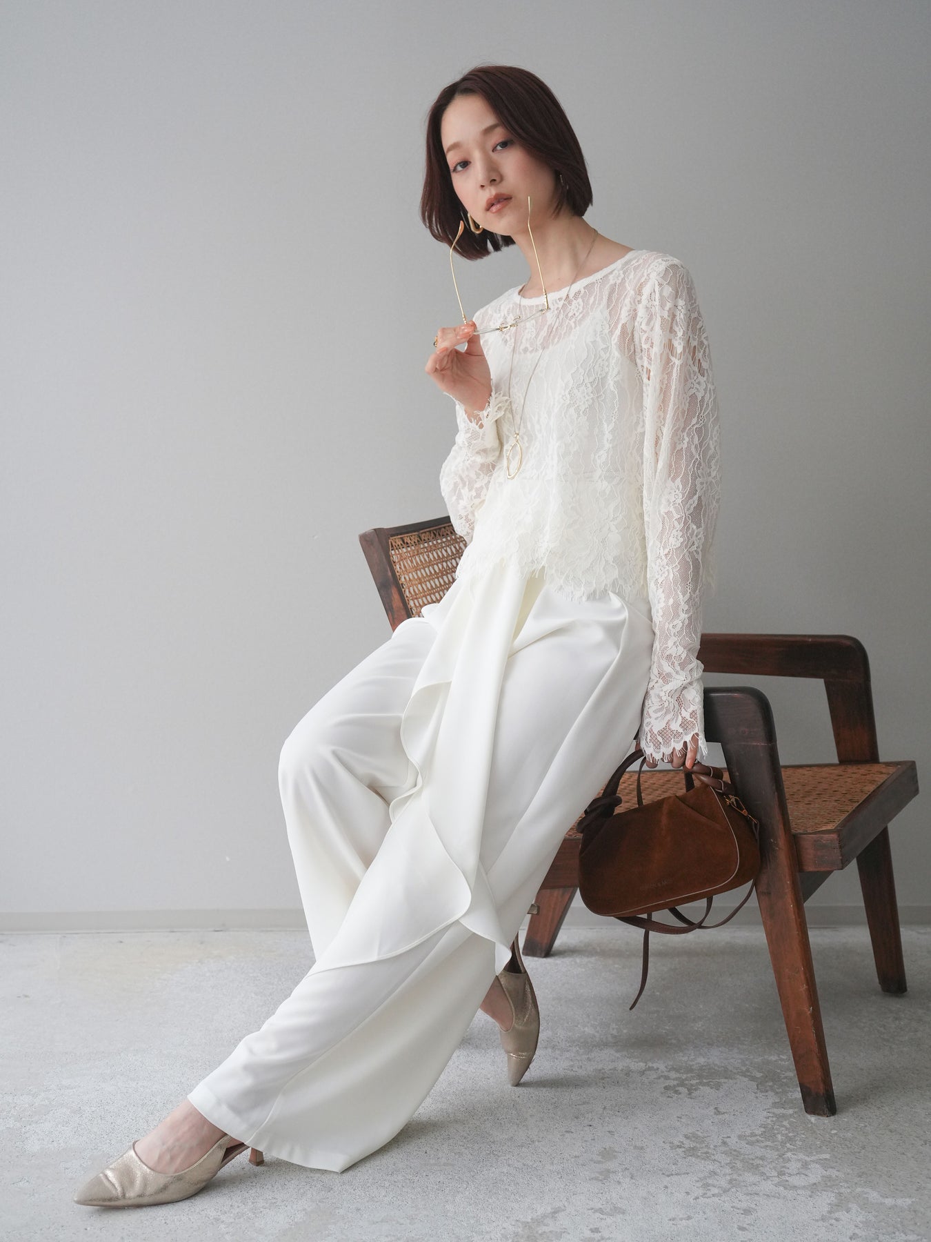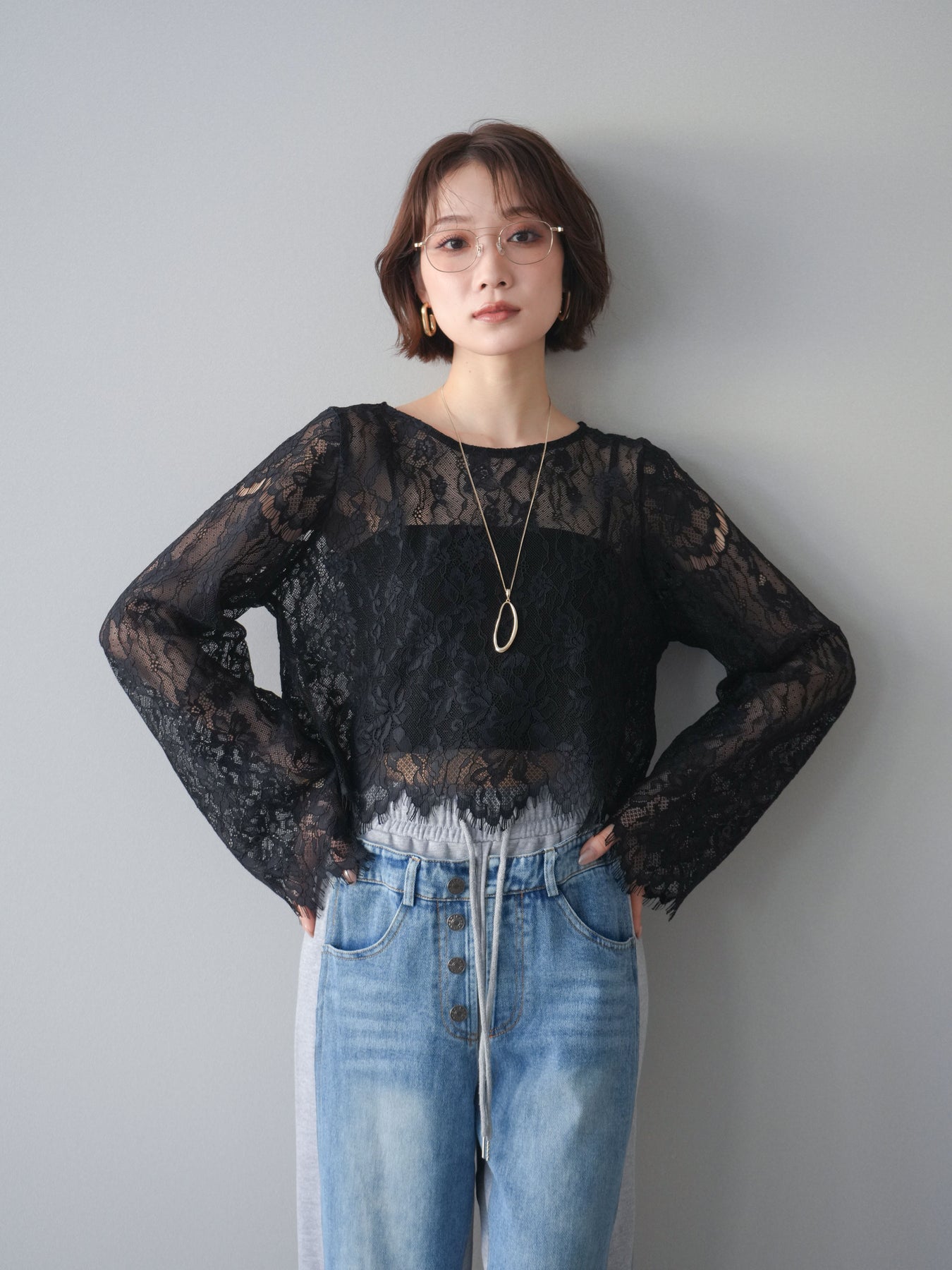 繊細な総レース素材が目を惹くロングスリーブトップス。透け感のある軽やかな風合いで、スタイリングに抜け感をプラスしてくれます。すっきりとしたシルエットでインナー使いにも重宝し、キャミソールやタンクトップを重ねてヘルシーに着こなすのもおすすめ。デニムやスラックス、ジャンパースカートのインナーなど、幅広いコーディネートに取り入れやすい一枚です。 ※ボトムス、キャミソール(インナー)以外の商品は一律でインナーは付属していません