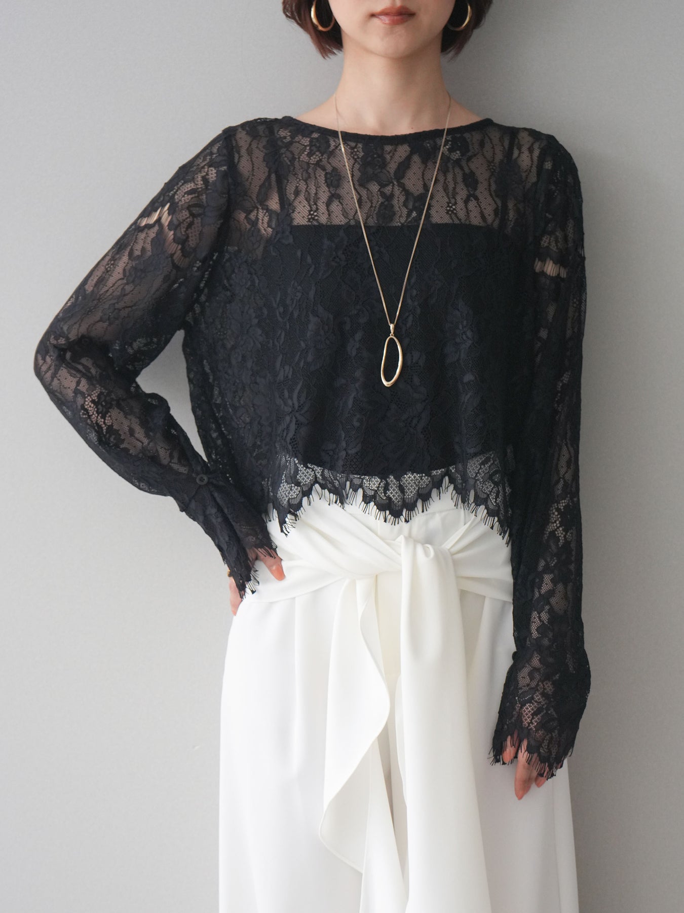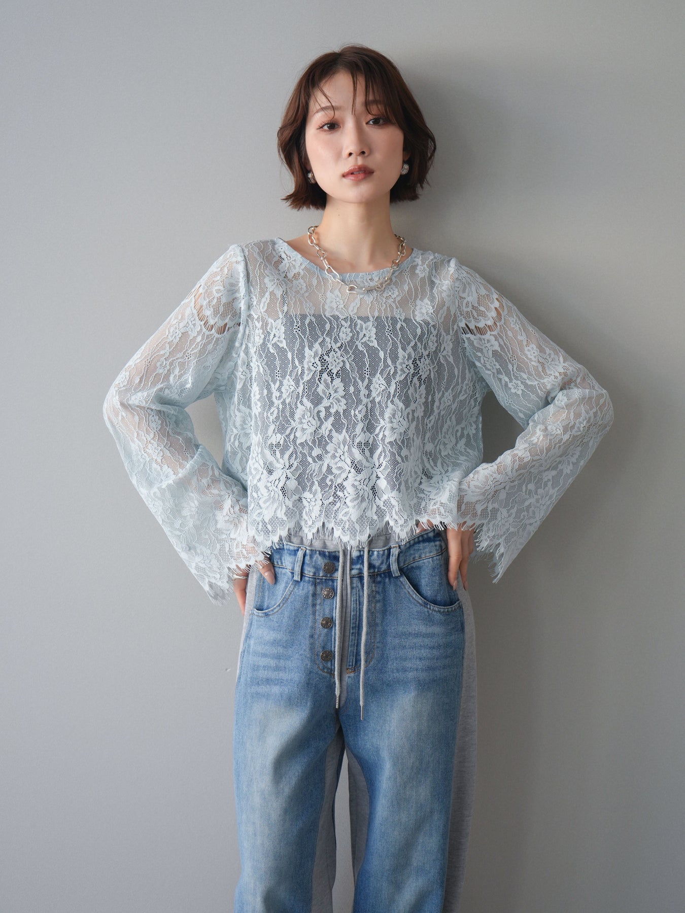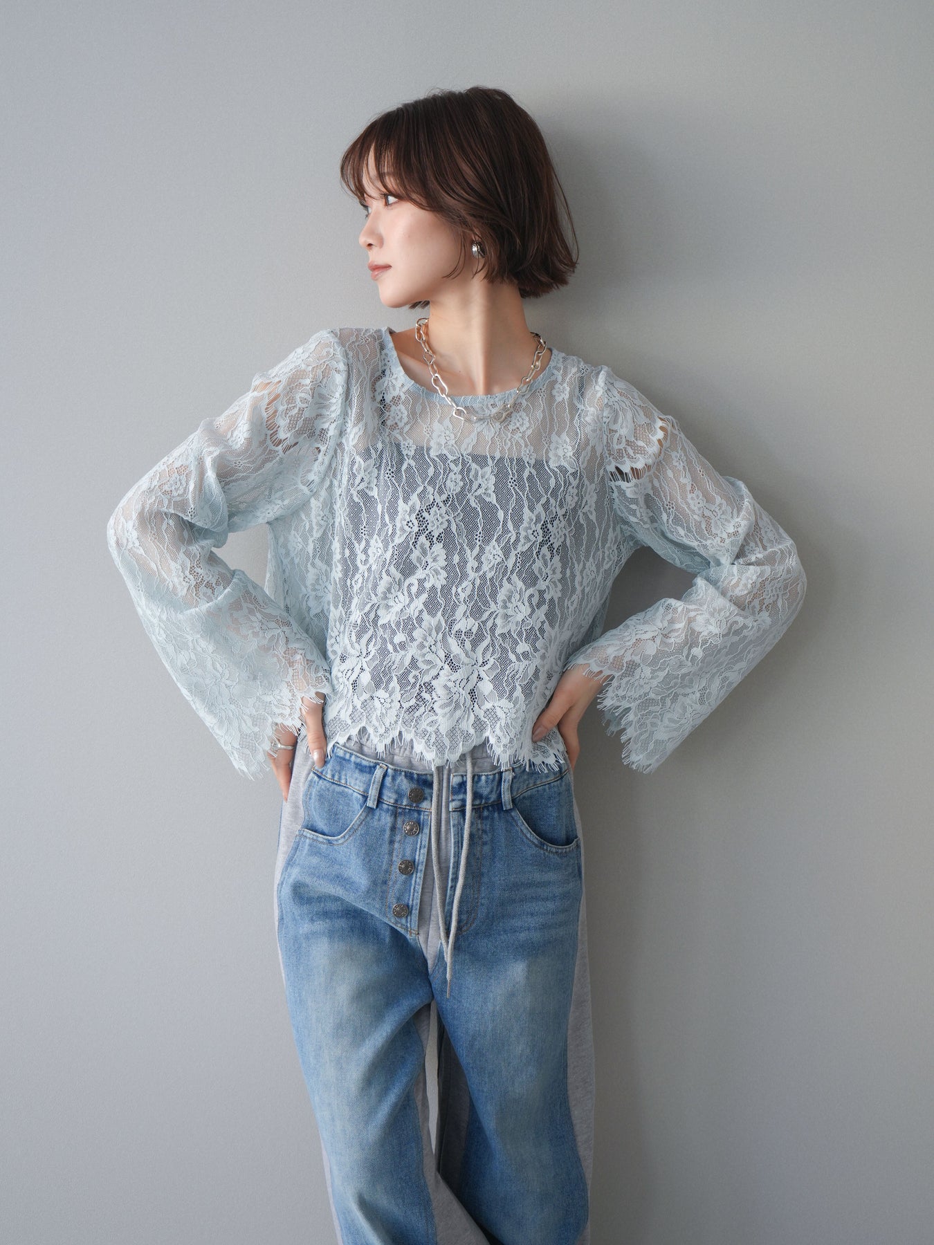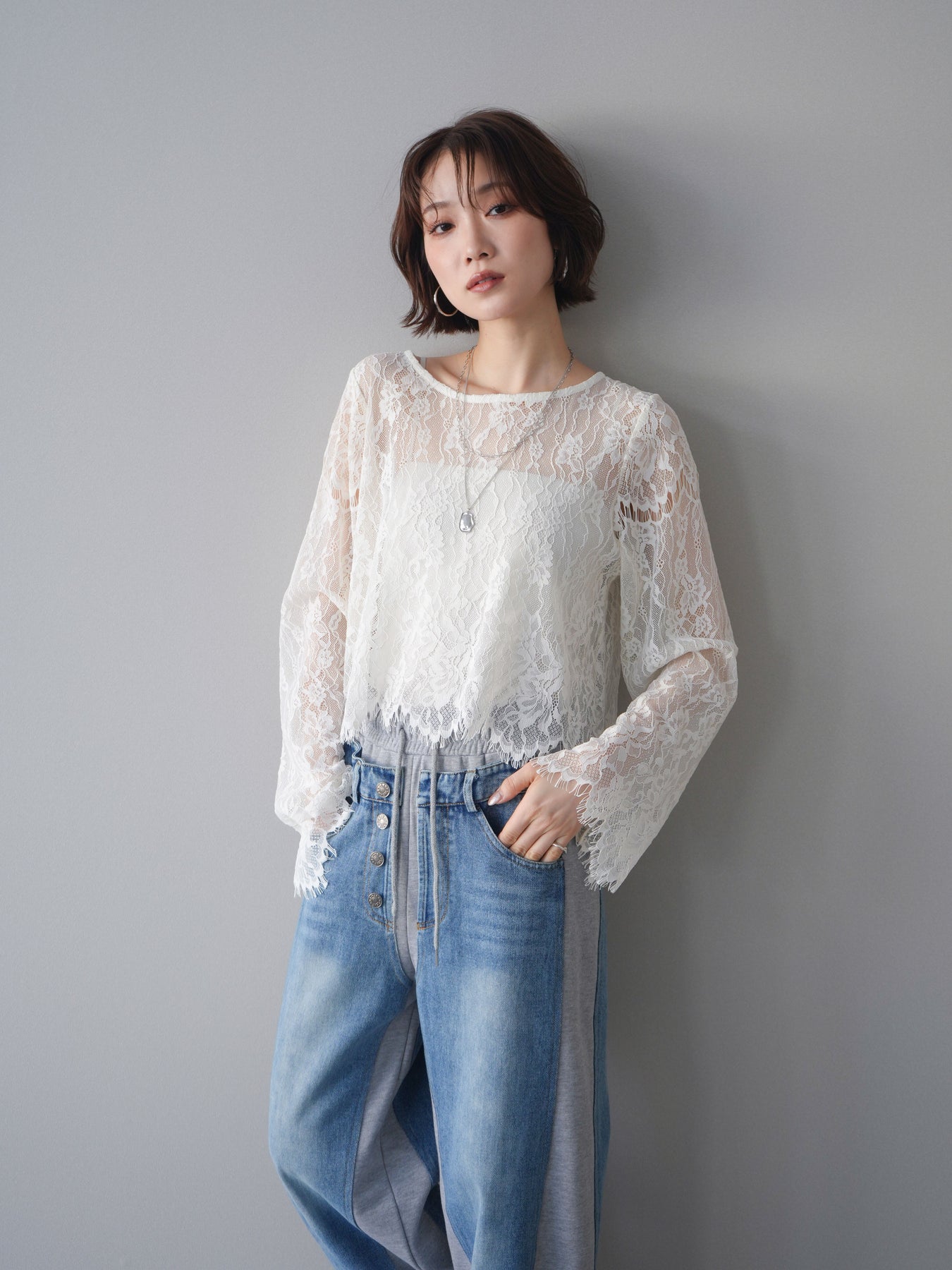 繊細な総レース素材が目を惹くロングスリーブトップス。透け感のある軽やかな風合いで、スタイリングに抜け感をプラスしてくれます。すっきりとしたシルエットでインナー使いにも重宝し、キャミソールやタンクトップを重ねてヘルシーに着こなすのもおすすめ。デニムやスラックス、ジャンパースカートのインナーなど、幅広いコーディネートに取り入れやすい一枚です。 ※ボトムス、キャミソール(インナー)以外の商品は一律でインナーは付属していません