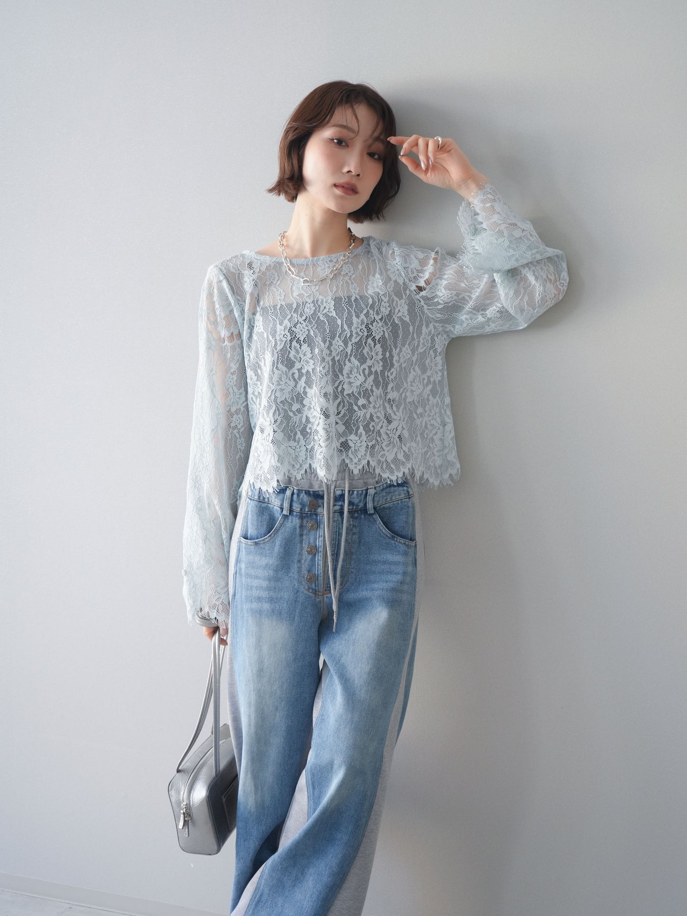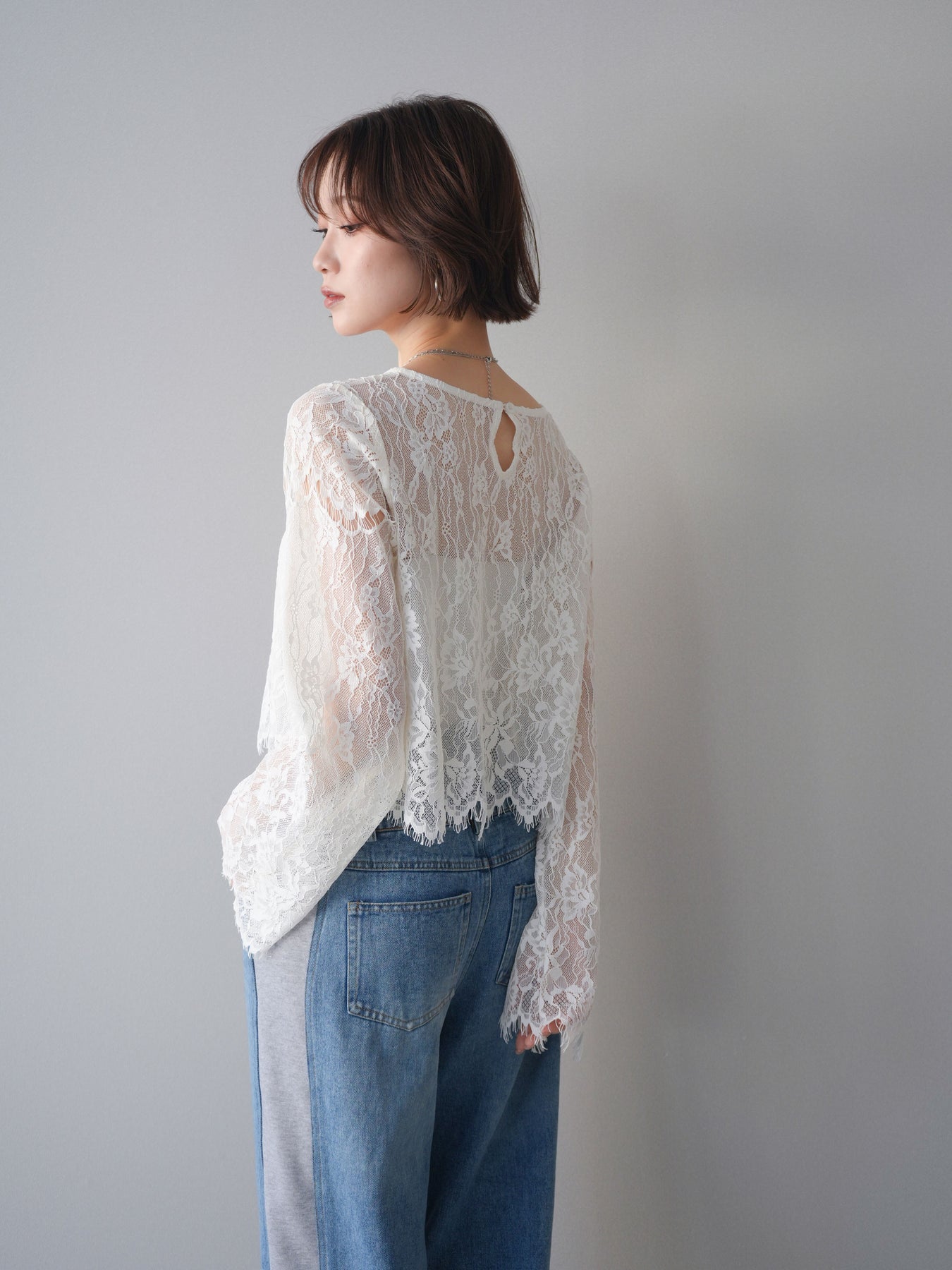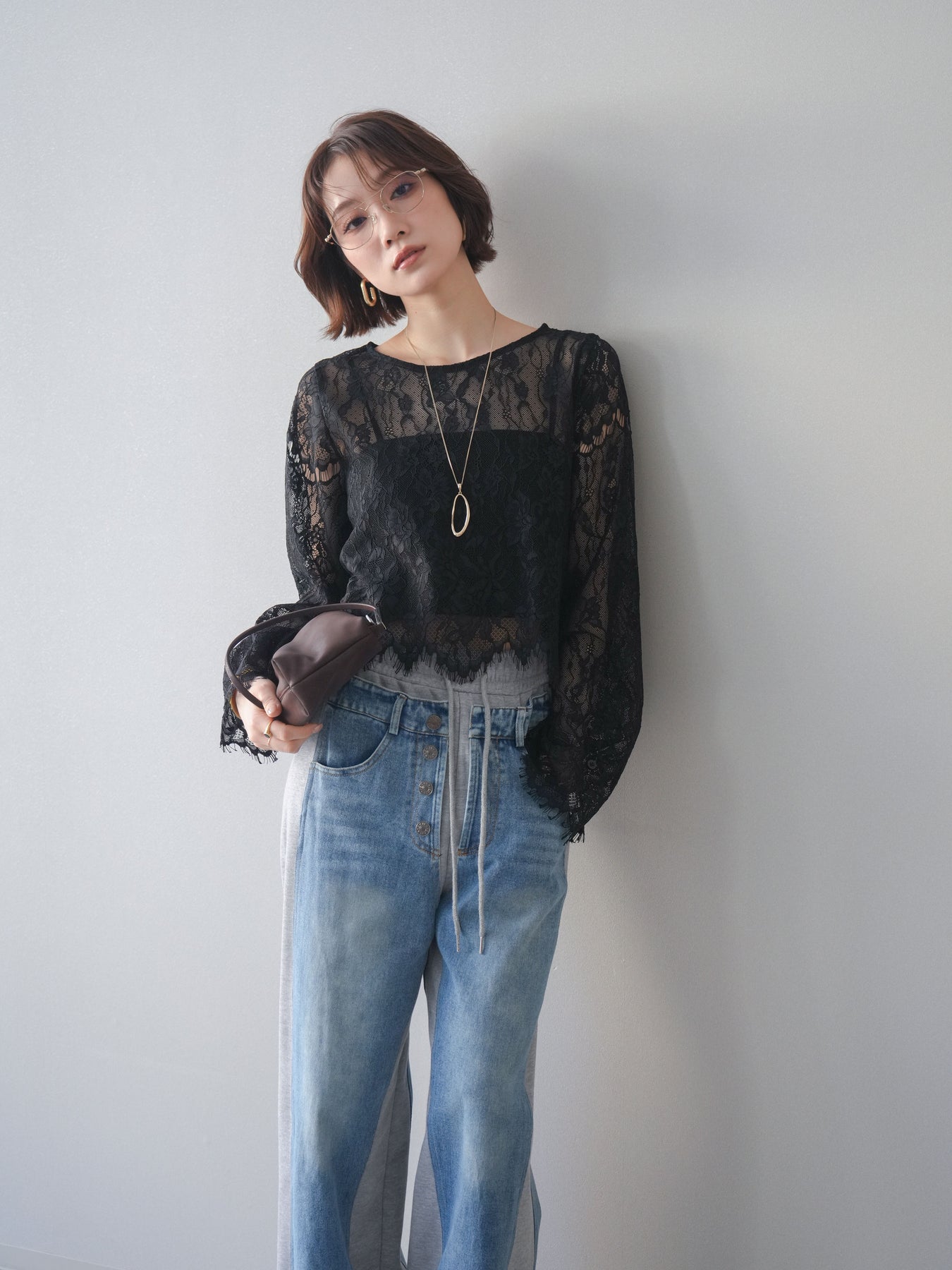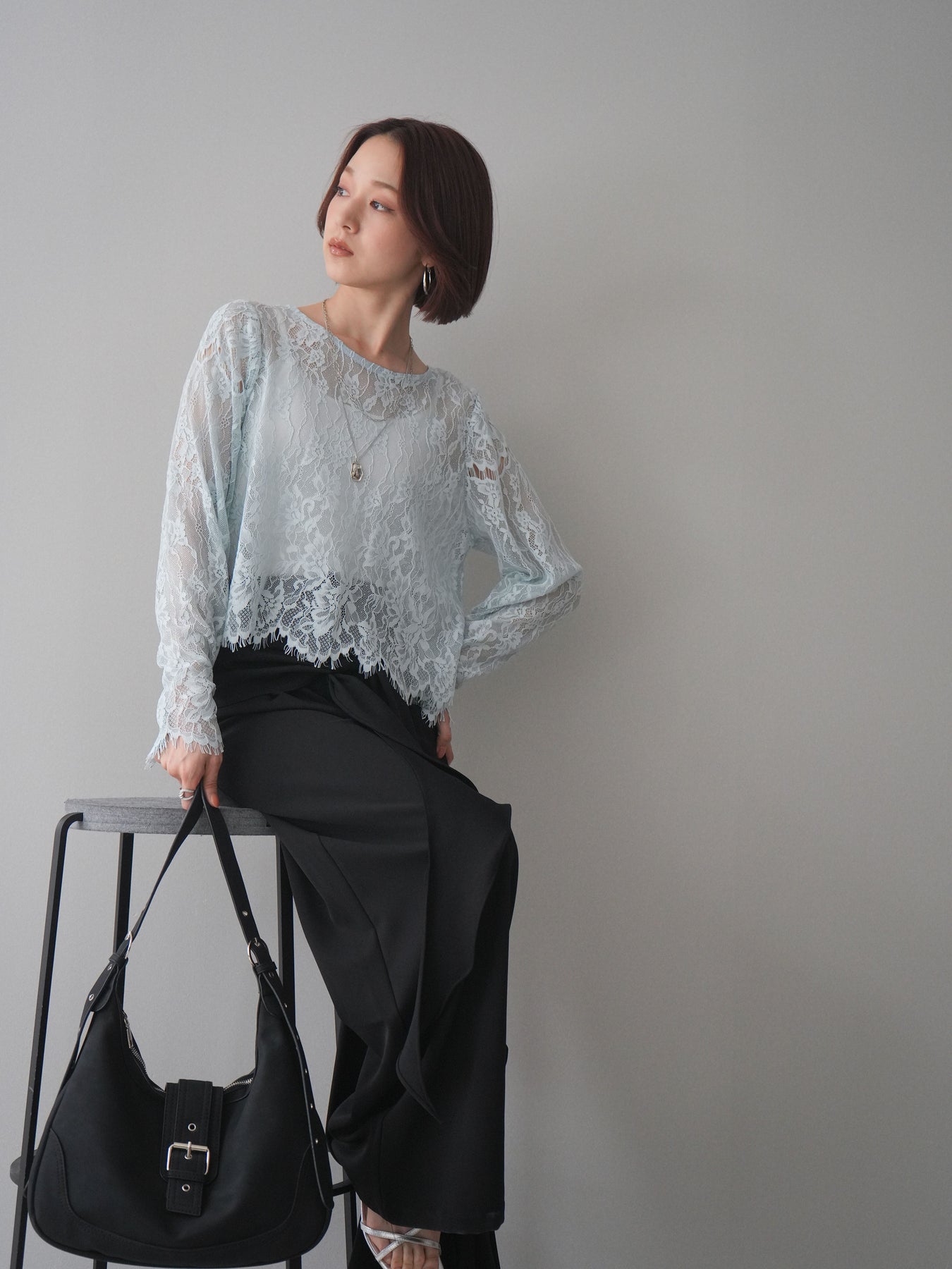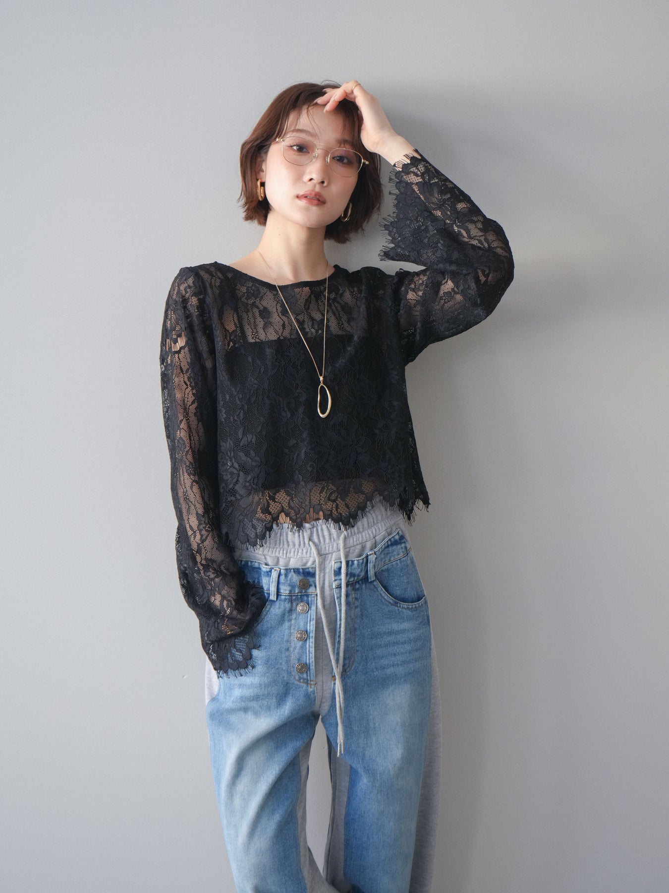 繊細な総レース素材が目を惹くロングスリーブトップス。透け感のある軽やかな風合いで、スタイリングに抜け感をプラスしてくれます。すっきりとしたシルエットでインナー使いにも重宝し、キャミソールやタンクトップを重ねてヘルシーに着こなすのもおすすめ。デニムやスラックス、ジャンパースカートのインナーなど、幅広いコーディネートに取り入れやすい一枚です。 ※ボトムス、キャミソール(インナー)以外の商品は一律でインナーは付属していません
