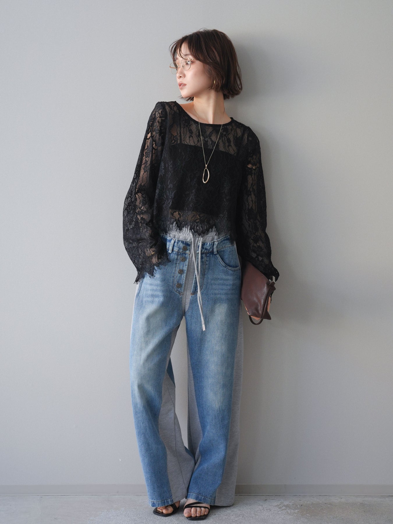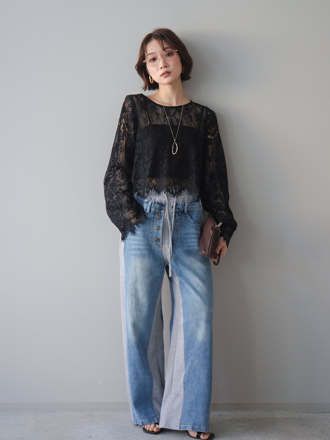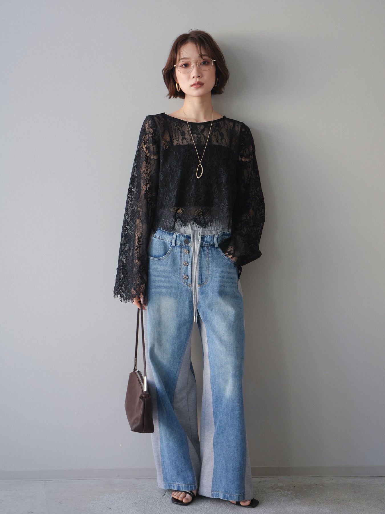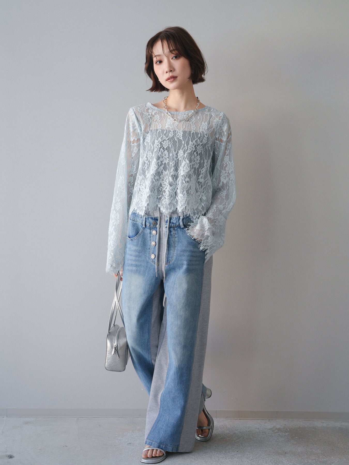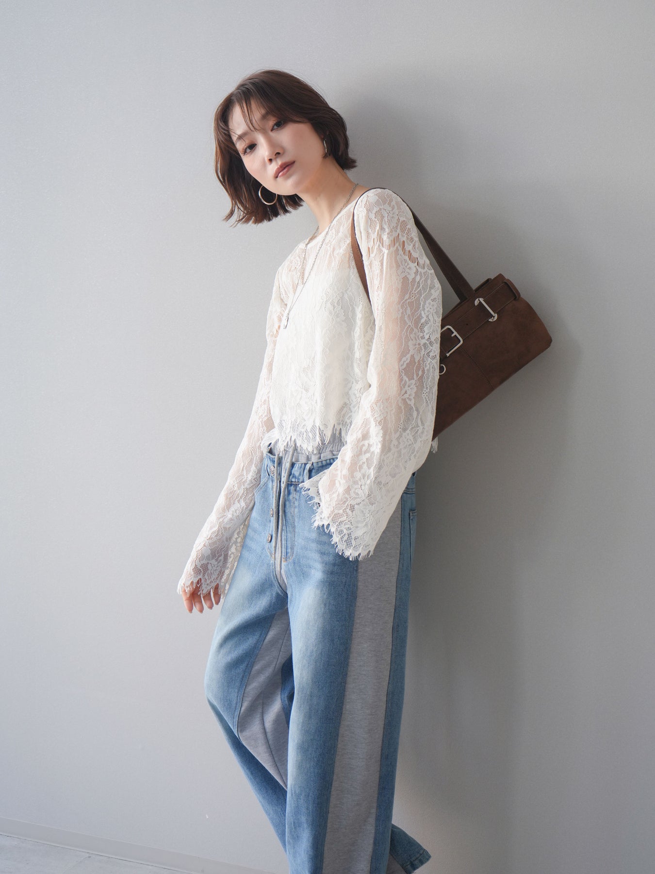 [SET]2WAYスリーブレーストップス+デニム切替スウェットパンツ(2set)